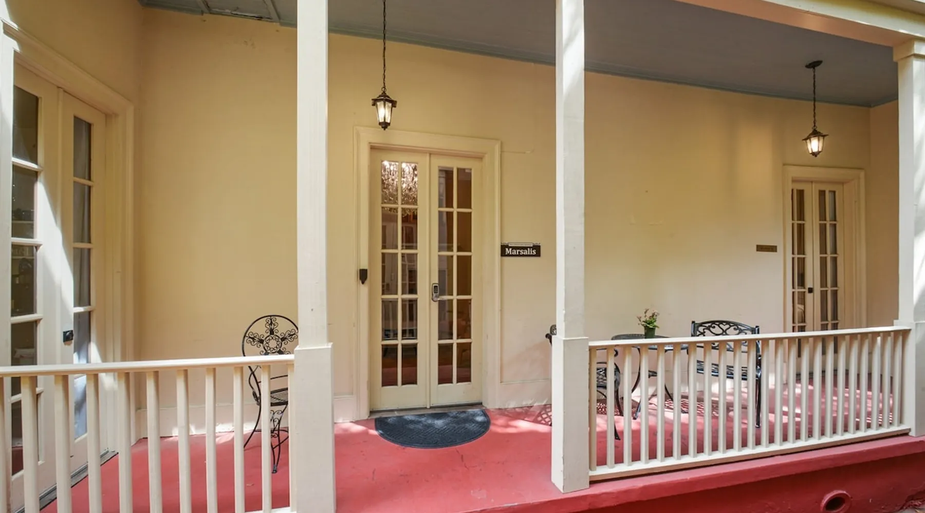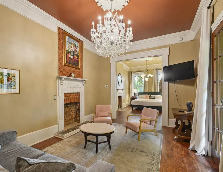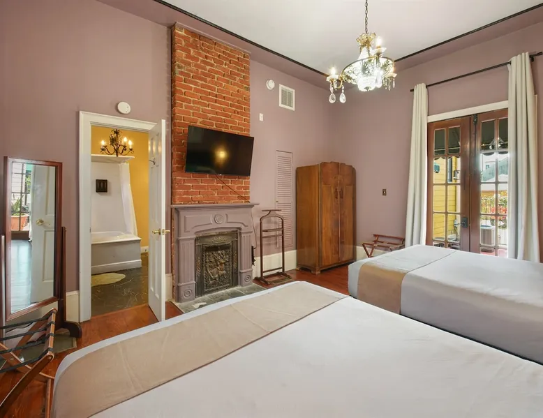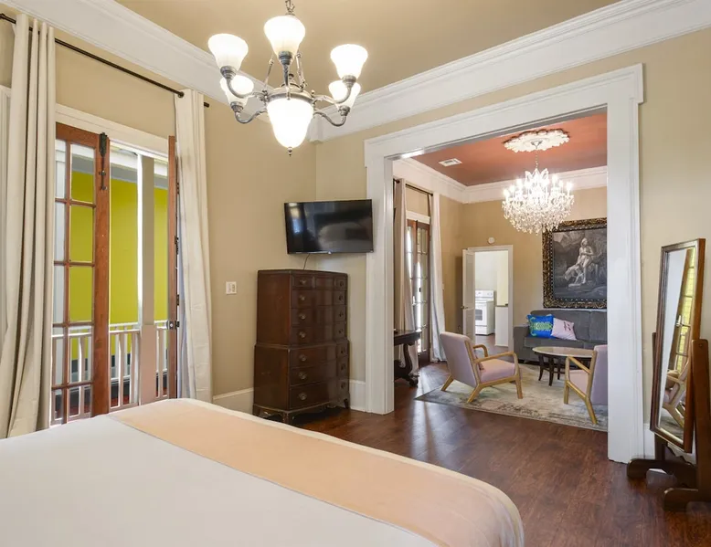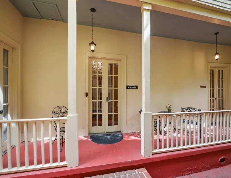 Welcome to the Marsalis Guest House, a grand tribute to jazz legend Wynton Marsalis. Located in the secure and tranquil Louis Park Hotel, just steps from the French Quarter, this elegant retreat features 11’ ceilings, intricate crown molding, and a chandelier-lit master bedroom with a king bed, private porch, and queen sleeper sofa. A second bedroom with two queen beds and a luxurious Jacuzzi-style tub ensures comfort for families or groups. Enjoy modern luxury in the heart of New Orleans. The space The Marsalis Guest House offers an elegant, two-bedroom retreat with grand 11’ ceilings, crown molding, and luxurious furnishings. The primary bedroom features a king bed, private gallery-style porch, and attached living room with a queen sleeper sofa. The second bedroom provides two queen beds, perfect for families or groups. The bathroom includes a chandelier-lit Jacuzzi-style tub, and the compact kitchen adds convenience. With direct access to a shared patio and located just steps from the French Quarter, the Marsalis Guest House combines historic charm with modern amenities. Guest access Guests have private access to the Marsalis Guest House, including both bedrooms, the private living room, bathroom, compact kitchen, and gallery-style porch. Guests have additional access to the landscaped courtyard and The Commons kitchen and lobby. Limited parking spaces within our secure lot are available for reservation at a cost of $20 per car per night. Free parking spaces can be found on St. Philip Street, and metered parking spots can be found along Rampart Street. Other things to note • Sleeping Arrangements: King bed, two queen beds, and a queen sleeper sofa in the living room. • Bathroom: Jacuzzi-style tub with chandelier and Nexxus shampoo for a spa-like experience. • Outdoor Access: Private gallery-style porch and shared patio for relaxation. • Elegant Design: Grand ceilings, crown molding, and luxurious details throughout. • Secure Compound: Located in a gated property for privacy and peace of mind. Registration Details 24-XSTR-18160