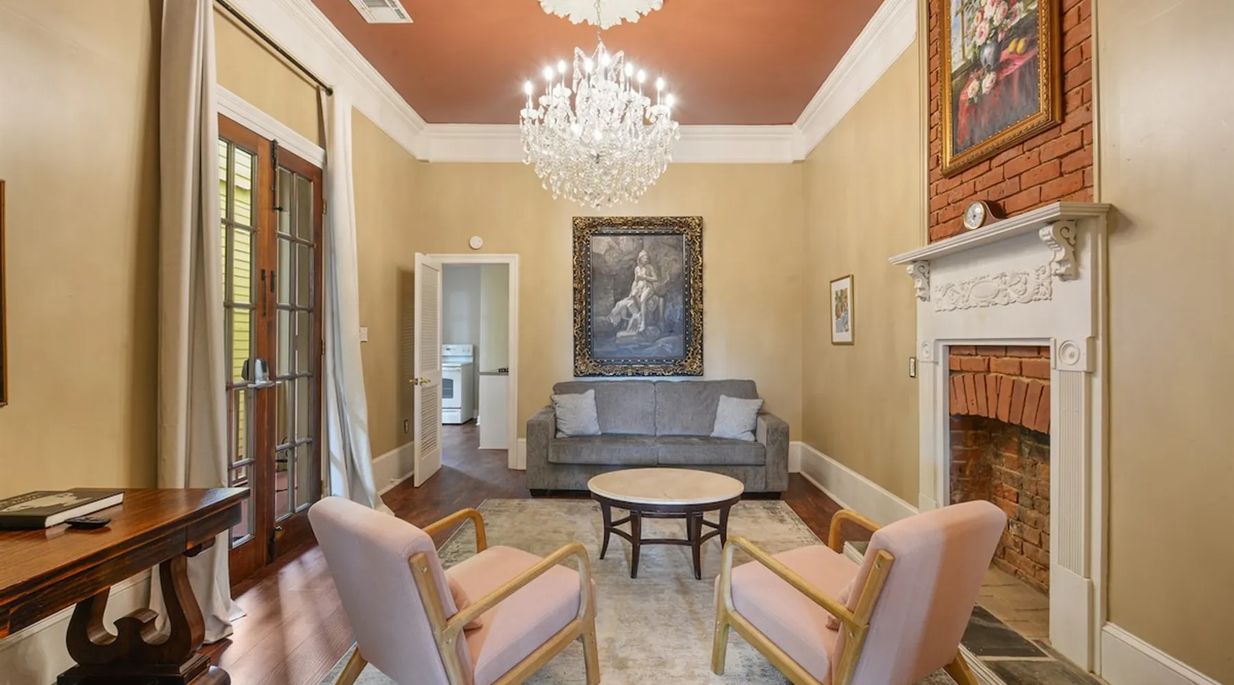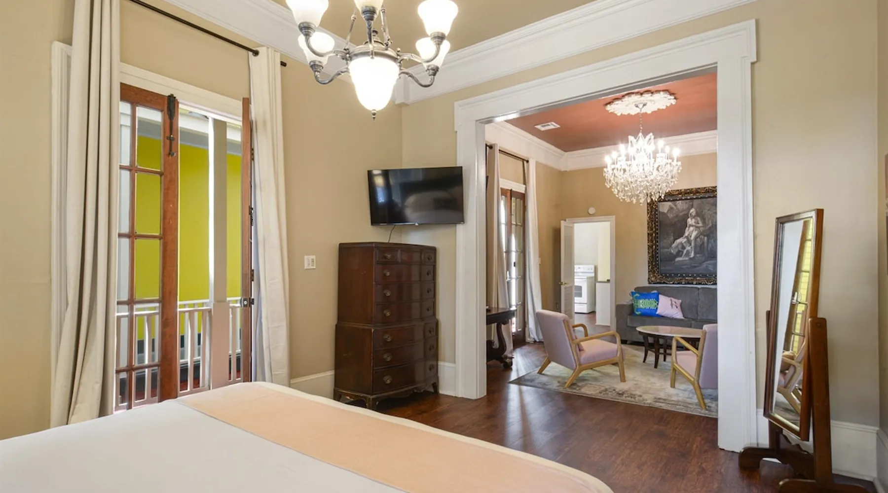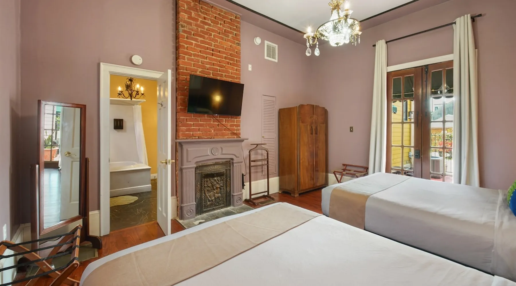 Welcome to the Marsalis Guest House, a grand tribute to jazz legend Wynton Marsalis. Located in the secure and tranquil Louis Park Hotel, just steps from the French Quarter, this elegant retreat features 11’ ceilings, intricate crown molding, and a chandelier-lit master bedroom with a king bed, private porch, and queen sleeper sofa. A second bedroom with two queen beds and a luxurious Jacuzzi-style tub ensures comfort for families or groups. Enjoy modern luxury in the heart of New Orleans. The space The Marsalis Guest House offers an elegant, two-bedroom retreat with grand 11’ ceilings, crown molding, and luxurious furnishings. The primary bedroom features a king bed, private gallery-style porch, and attached living room with a queen sleeper sofa. The second bedroom provides two queen beds, perfect for families or groups. The bathroom includes a chandelier-lit Jacuzzi-style tub, and the compact kitchen adds convenience. With direct access to a shared patio and located just steps from the French Quarter, the Marsalis Guest House combines historic charm with modern amenities. Guest access Guests have private access to the Marsalis Guest House, including both bedrooms, the private living room, bathroom, compact kitchen, and gallery-style porch. Guests have additional access to the landscaped courtyard and The Commons kitchen and lobby. Limited parking spaces within our secure lot are available for reservation at a cost of $20 per car per night. Free parking spaces can be found on St. Philip Street, and metered parking spots can be found along Rampart Street. Other things to note • Sleeping Arrangements: King bed, two queen beds, and a queen sleeper sofa in the living room. • Bathroom: Jacuzzi-style tub with chandelier and Nexxus shampoo for a spa-like experience. • Outdoor Access: Private gallery-style porch and shared patio for relaxation. • Elegant Design: Grand ceilings, crown molding, and luxurious details throughout. • Secure Compound: Located in a gated property for privacy and peace of mind. Registration Details 24-XSTR-18160