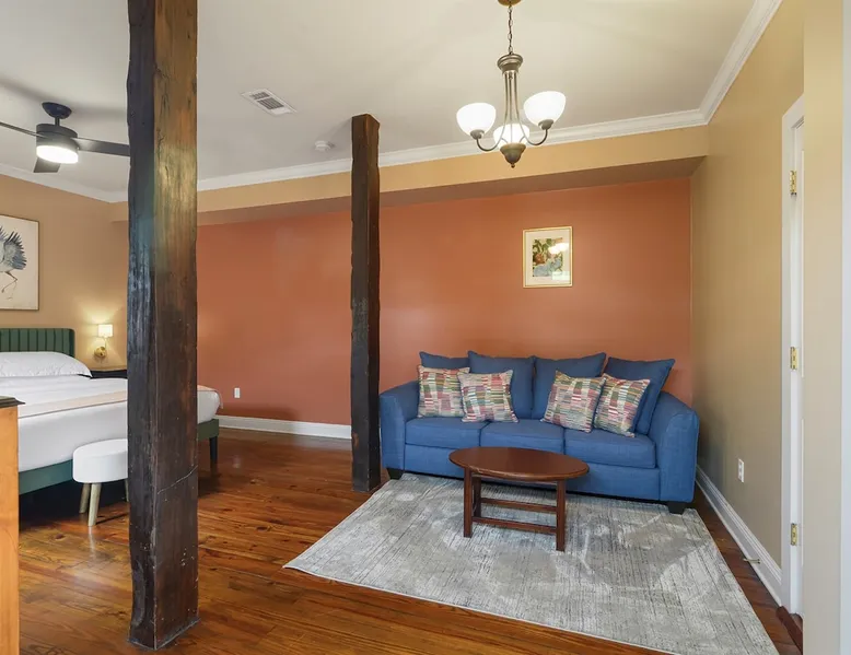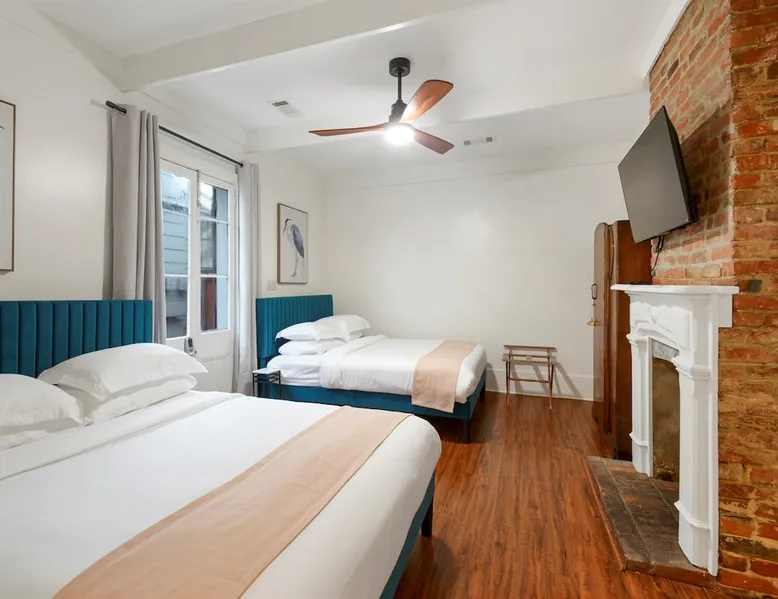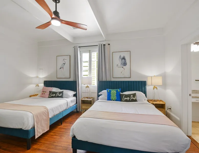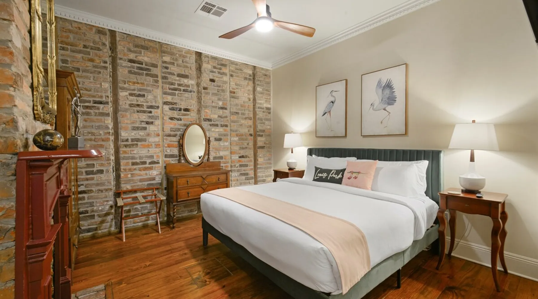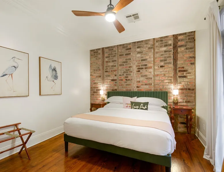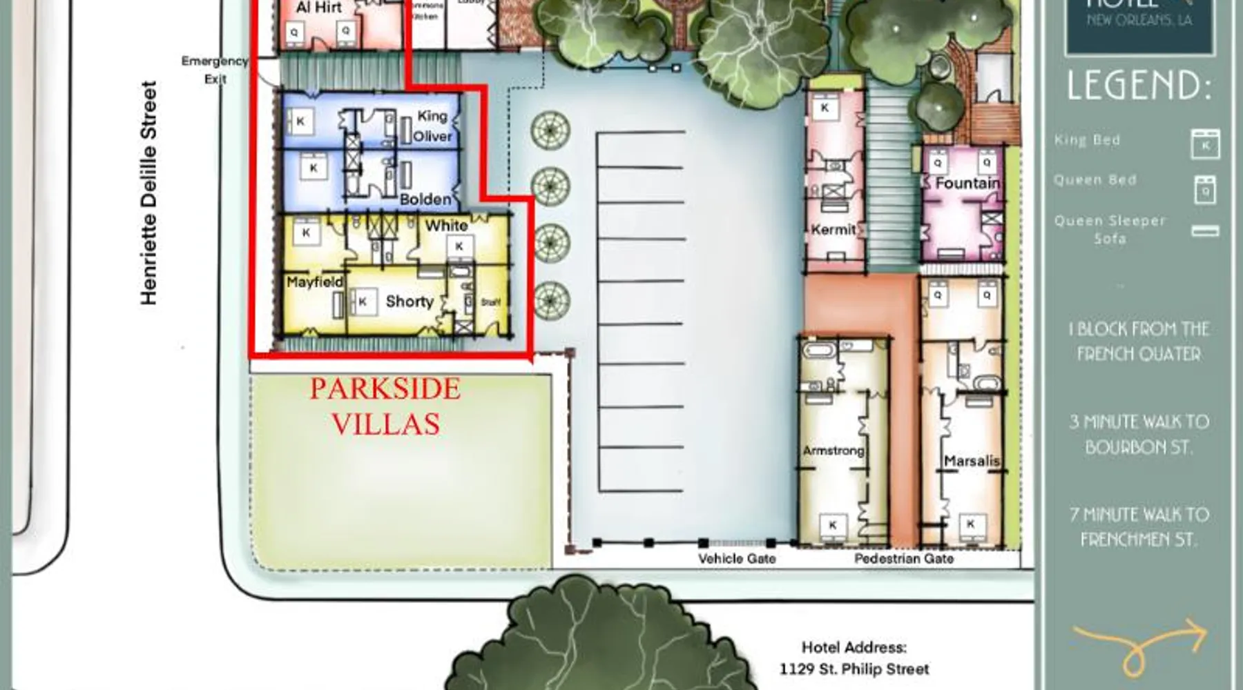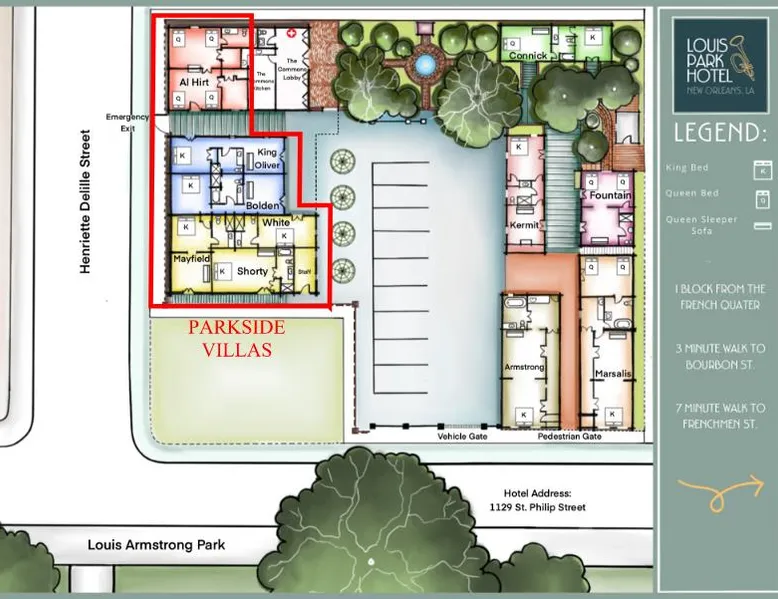 The Parkside Villas at Louis Park Hotel is a gated retreat steps from the French Quarter. With 6 guest houses, 7 bedrooms, 6 baths, and 9 real beds (plus 4 sleeper sofas) it sleeps up to 26 guests and is perfect for reunions, weddings, corporate and special events. Walk easily to New Orleans’ vibrant music, dining, and cultural landmarks, then return to lush courtyards, secure parking, and modern comfort infused with authentic charm. The space The Al Hirt Guest House sleeps up to eight guests in two bedrooms, each with two queen beds. A full bathroom with a bathtub is accessed through the second bedroom. Guests enjoy direct access to our full kitchen and lobby space, The Commons. The King Oliver Guest House accommodates up to four guests with one king bedroom and an attached living room featuring a queen sleeper sofa. Highlights include exposed brick walls and beams, a full bathroom with a walk-in shower, and direct access to the landscaped courtyard. The Bolden Guest House offers space for up to four guests with a king bedroom and an attached living room with a queen sleeper sofa. Its exposed brick construction, renovated bathroom with a tub and walk-in shower, and direct access to the landscaped courtyard. The White Guest House is a serene retreat for two guests, offering a king bedroom with blackout curtains, a cozy seating area, and a renovated bathroom with walk-in shower. Guests can relax in the landscaped courtyard just outside the door. The Mayfield Guest House is designed for up to four guests, featuring a king bedroom, an attached living room with a queen sleeper sofa, and a renovated bathroom with a modern shower. The Shorty Guest House sleeps four and includes a king bedroom and an attached living room with a queen sleeper sofa. The exposed historic beams, renovated bathroom with tub and separate walk-in shower make this guest house a cozy option. Guest access Guests have private access to the five guest houses included in the Parkside Villas, including all bedrooms, bathrooms, and living spaces. Guests have additional shared access to the landscaped courtyard and The Commons kitchen and lobby. Additional amenities include gated off street parking for 5 vehicles Other things to note Guests who have booked the Parkside Villas will enjoy private access to 6 of the guest houses at Louis Park Hotel and shared access to the landscaped courtyard. Five complimentary off street parking spaces are included in the reservation. Registration Details 24-XSTR-18160