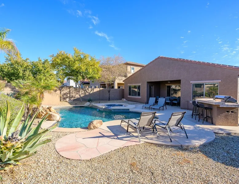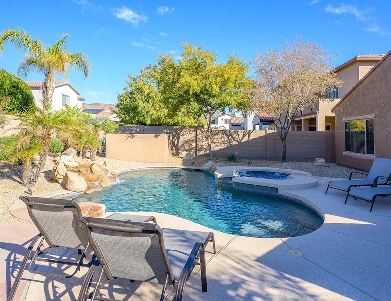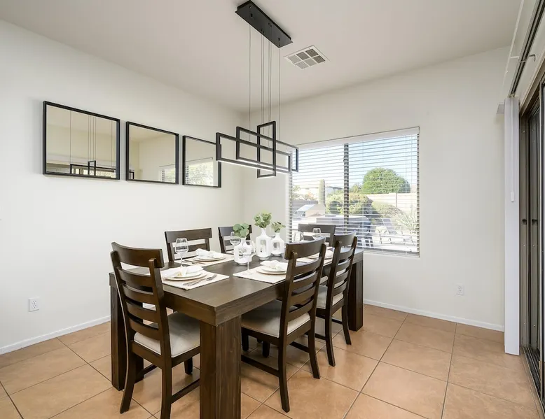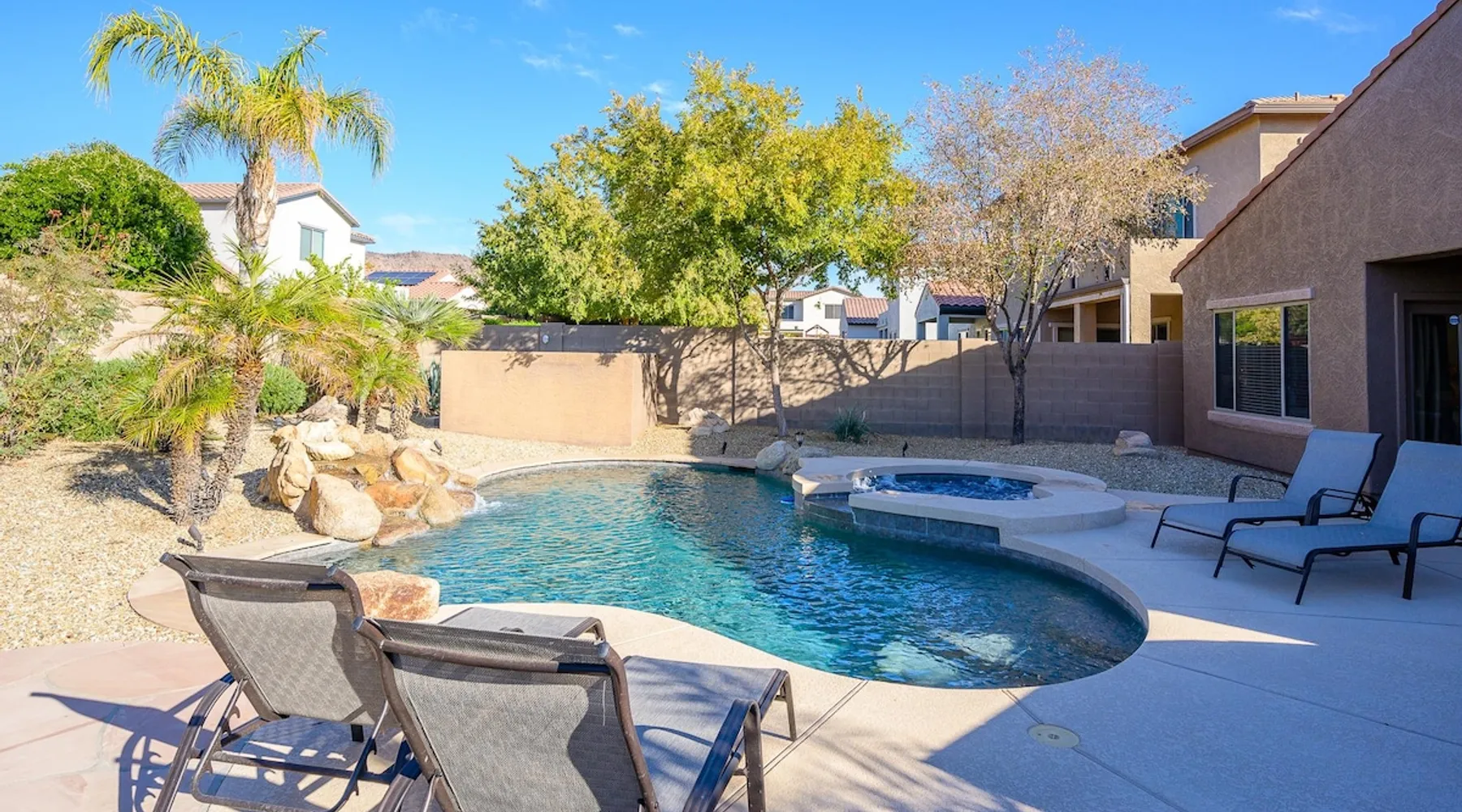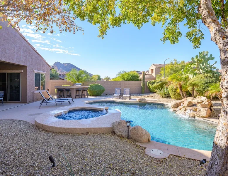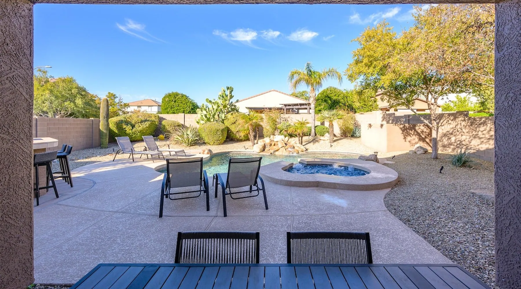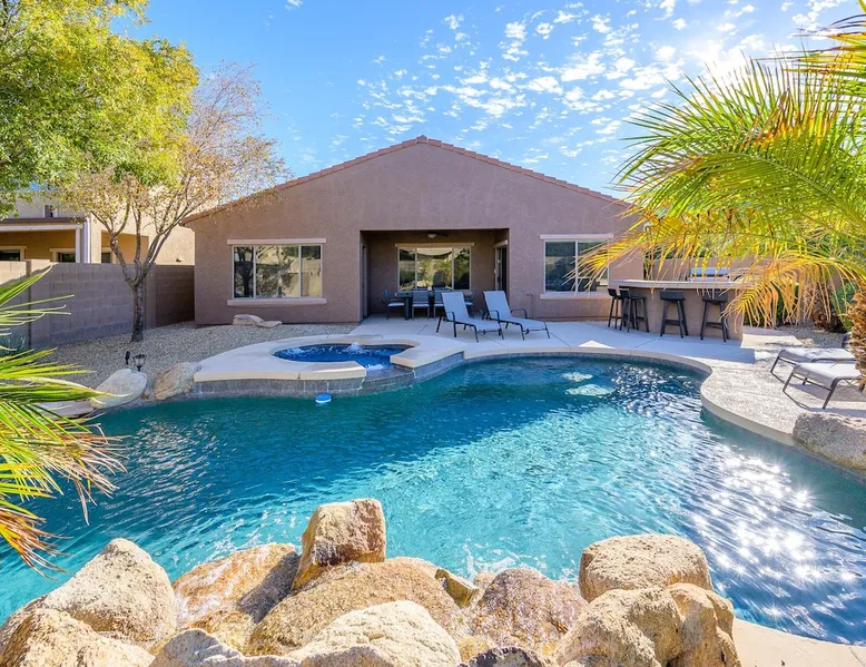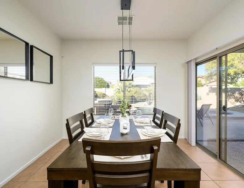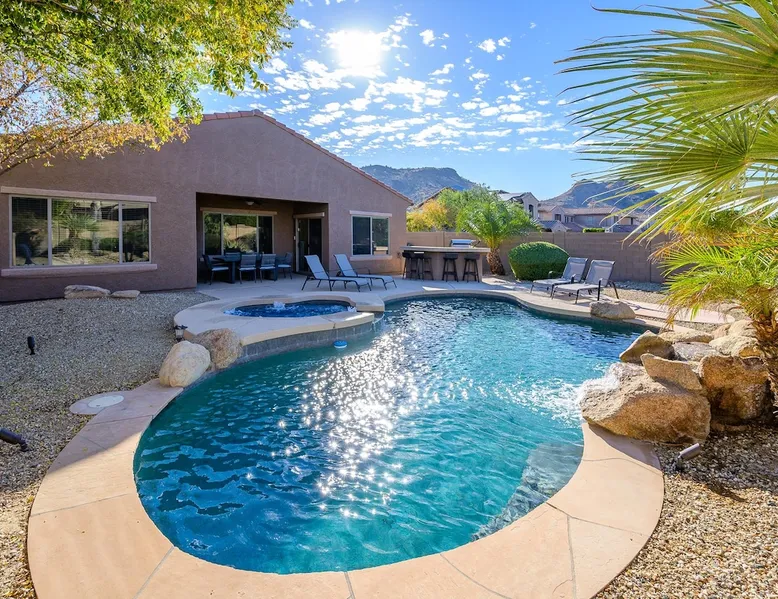 4 Bedroom, 2 bath sleeps 8. The space CASA STETSON - NEW to inventory. All new furnishings. ***Please read the description in its entirety. Please note that the calendar is always exact and up to date, so if it looks available, it is. Also, you can get an exact rate quote and even reserve the property online. Thanks, and I hope we can help with your upcoming visit! All linens, bath & pool towels provided; free WIFI. Casa Stetson is a private single family home all on one level with no stairs; located in a quiet neighborhood of north Phoenix, just off of highway 17. The great room offers a huge couch and TV (cable channels included) that opens up to the kitchen with breakfast bar and inside dining. You will also find a desk in the living room to send those necessary work emails. A sliding door leads you to outdoor dining overlooking the sparkling pool and hot tub. The pool can be heated for additional charge. The hot tub can be used at leisure at no cost. 4 chaise lounge chairs to get some AZ sun. Built in BBQ and outdoor bar to enjoy and cocktail while helping the cook. For bedrooms you will have 2 King bedrooms and 2 queen bedrooms. TV in the master bedroom. 2 car garage, parking available in driveway as well. Laundry room with full size washer/dryer. Fully gated yard. ***Please note $350/week ($1250/month) fee to heat the pool (to 85 degrees) in the winter if desired; upon request only. The heated spa can be used at your leisure. ***Dog allowed with approval only. A "Pet Fee" will be added to your booking when reserving online. Pet Fees are non-refundable and are not to cover any damages, extra cleaning or picking up your dogs poop. ***$400/month Electric Cap in the summer months (June through September). Guests agree to this policy upon booking and are liable for the overages. You can get an exact price quote and price breakdown as well as confirm a booking on this page. We accept Visa, MasterCard, Discover, American Express & Electronic Check at no additional costs. 50% of total due upon reservation confirmation 50% of total due 30 days from arrival If booking within 30 days of arrival, 100% due upon booking ***Guests are liable for any damages caused to the property Please note - OUR RATES & AVAILABILITY IS ALWAYS EXACT AND UP TO DATE ONLINE!
