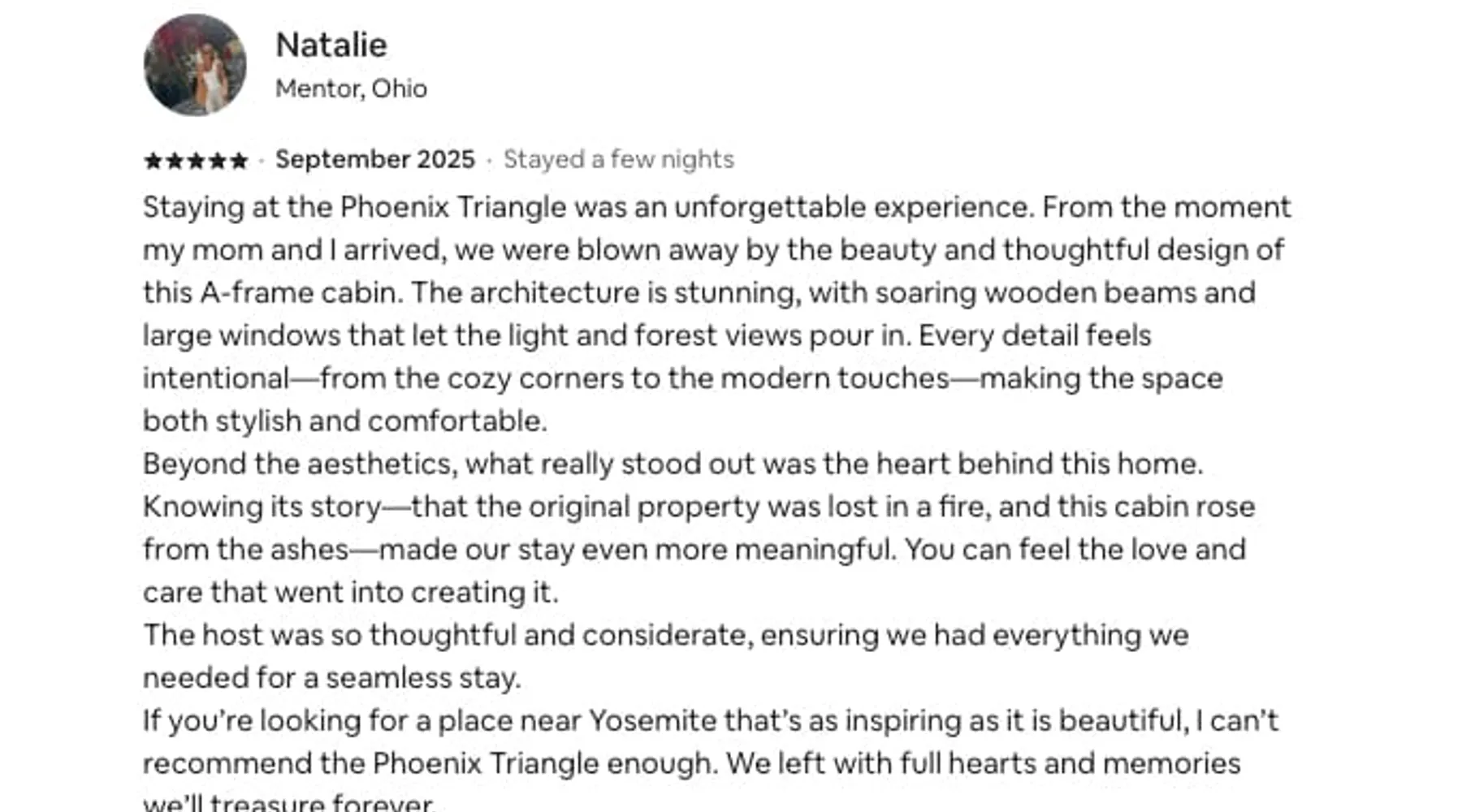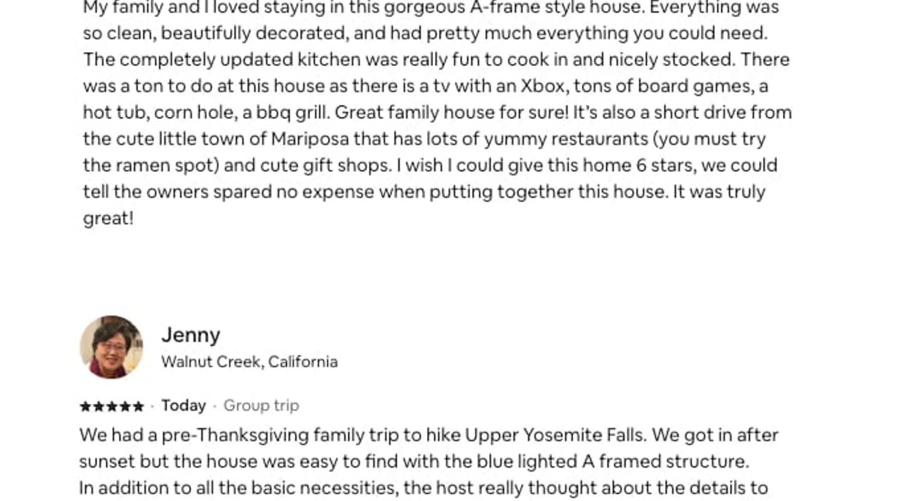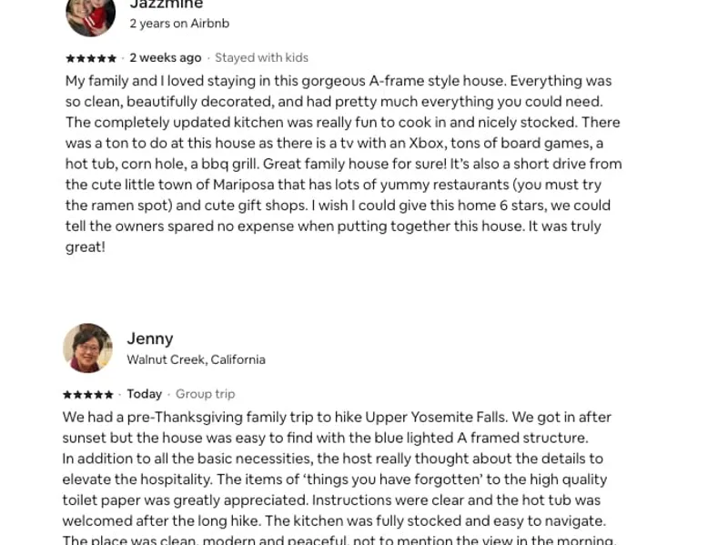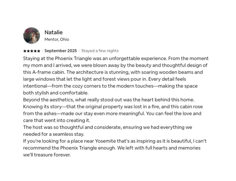 **NEW, PROFESSIONALLY DESIGNED** Wake up to panoramic mountain views in this brand new luxurious A-Frame built for relaxation. Why you’ll love it: • 6-person hot tub beneath the stars • Floor-to-ceiling windows • EV charger for juicing up • Fire Pit, BBQ grill and coffee • Sonos sound & board games Explore Yosemite by day, then soak in the spa, stream your playlist, or play Cornhole. Families? We’ve got a high chair, crib, and kid-friendly dinnerware. Dates fill quickly—Book your stay today! The space Welcome to Phoenix Triangle — a modern A-frame cabin where cozy luxury meets untamed adventure. Perched in the Sierra foothills with stunning long-range views, this brand-new build invites you to slow down, breathe deep, and savor every moment — whether you're stargazing from the hot tub or having fun with family and friends after a day at Yosemite. ☀️ Daytime Adventures Start your morning with coffee on the deck, the mountains greeting you through soaring floor-to-ceiling windows. Spend your days exploring the awe-inspiring granite cliffs and waterfalls of Yosemite National Park — just a scenic drive away — or wander the charming streets of nearby Mariposa, only 5 miles down the road. 🌅 Evening Magic As the sun dips, gather on the spacious deck for a round of Corn hole, fire up the Weber BBQ, get warm around our gas fire pit or relax under the stars in the six-person hot tub. If you're feeling playful, giant tumbling timbers and Connect 4 are ready for family fun. 🏡 Cozy Nights In Step inside to an airy, open-concept living space blending modern minimalism with mid-century touches. Spin a vinyl on the record player, stream your favorite shows on the 65" 4K Roku TV, or vibe out with a Sonos sound system filling the cabin with music. Prefer analog fun? We've stocked the cabin with classic board games, kids’ toys, and even an Xbox for gamers. 🛌 Dreamy Bedrooms Retreat upstairs to a private master suite with a plush king bed and a walk-in rainfall shower. Two charming bedrooms downstairs await: one with a queen bed, the other with a cozy bunk (queen base + twin XL top) — perfect for families or groups of friends. 🌟 Rebuilt With Heart Phoenix Triangle isn't just a name — it’s a story. After a devastating wildfire took our first home, we poured our hearts into rebuilding this sanctuary, rising stronger and more beautiful than before. Now, we're thrilled to share it with you. Highlights & Amenities: ☕ Stylish coffee bar for your morning cup of joe 🔥 Outdoor fire pit & Electric fireplace to enjoy cozy evenings 🎶 Sonos sound system + vinyl record player for the perfect vibe 📚 Loft library for book lovers ✨ 6-person Hot tub for unforgettable stargazing 🚗 Level 2 EV charger for eco-friendly road trippers (Guest pays for charging, Subject to local rates) 🌐 Starlink WiFi for fast, reliable internet 🎮 Xbox console, indoor games, outdoor games, and kids toys 🔥 Weber BBQ and alfresco seating 🛁 Outdoor rainfall shower for nature lovers 💻 Dedicated workspace for remote work warriors Whether you’re adventuring through Yosemite’s wonders or savoring slow mornings with coffee and mountain views, Phoenix Triangle is your modern cabin dream come true. We can't wait to host you! 🌲✨ 🐶 No pets please: To keep the cabin allergy-free and comfortable for all our guests, we kindly ask that you leave your furry friends at home. Thanks for understanding! There will be a $500 fee in case of a violation and you may be asked to find alternate accommodation. Guest access The cabin is reached via about 400 feet of gravel driveway from Triangle Road. Most vehicles have no trouble, but if you’re arriving after dark, we recommend driving slowly and following the driveway carefully so you can arrive smoothly without getting stuck. Entry is easy and seamless with our smart lock, located at the front door (on the right side of the A). You’ll receive your personalized access code two days prior to check-in for a smooth arrival. The entire home and outdoor spaces are yours to enjoy throughout your stay. Please note that the cleaners’ cabinet under the stairs and the outdoor shed, which stores supplies, will remain locked. Everything else is available for your use! Other things to note To abide by local legal requirements, you will be asked to complete a secure verification portal by providing a copy of your official government-issued photo ID, confirming your contact information and sharing the purpose of your stay. The information is collected for screening and verification only and is not stored or used for any other purposes. By making a reservation, you acknowledge that you may be required to provide a copy of a valid government-issued ID prior to check-in. You understand that your check-in instructions might be withheld until you have successfully completed verification steps in our guest portal.