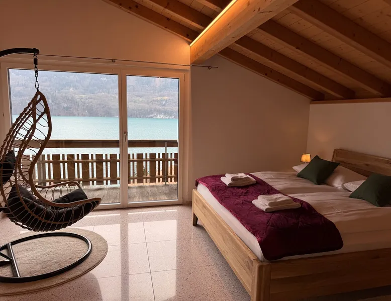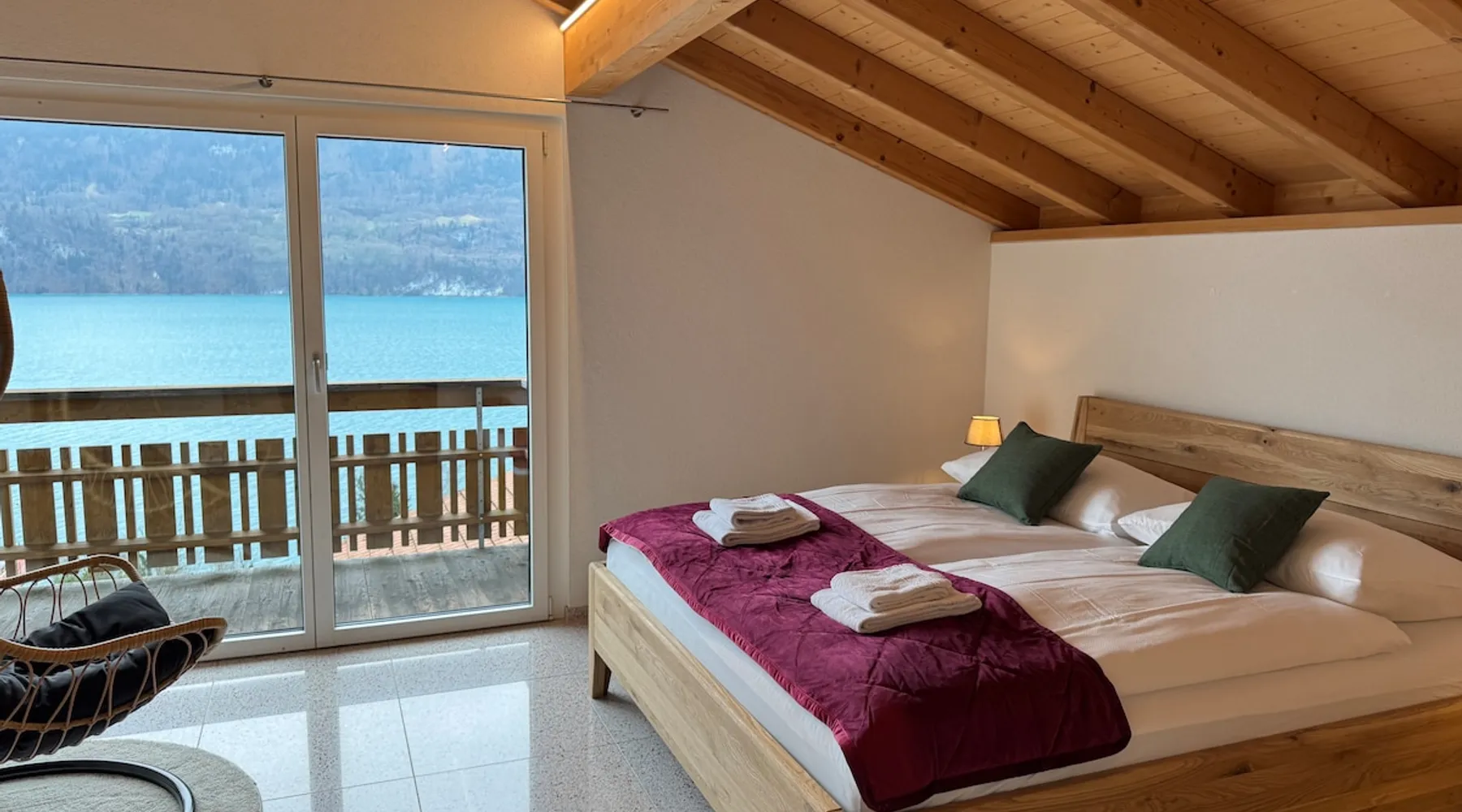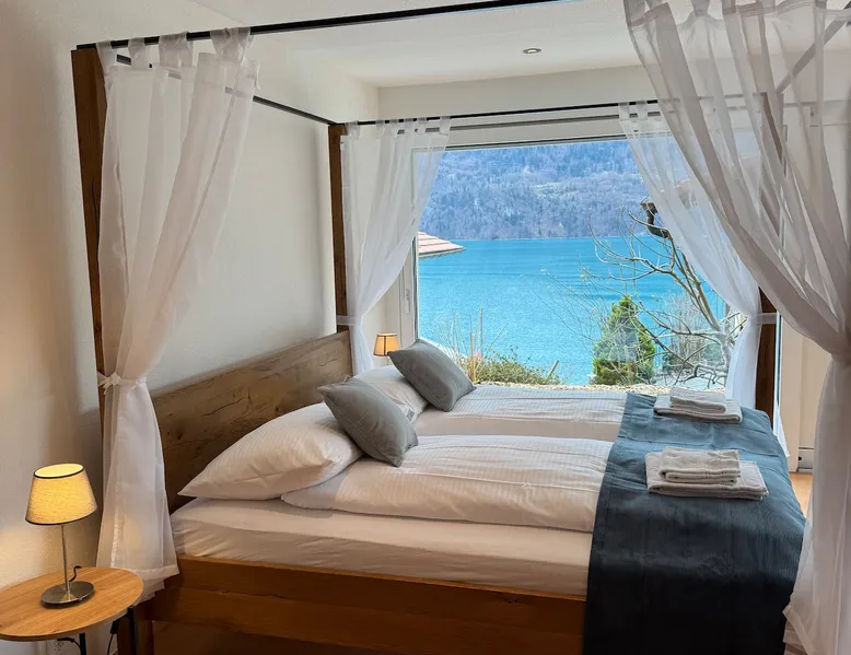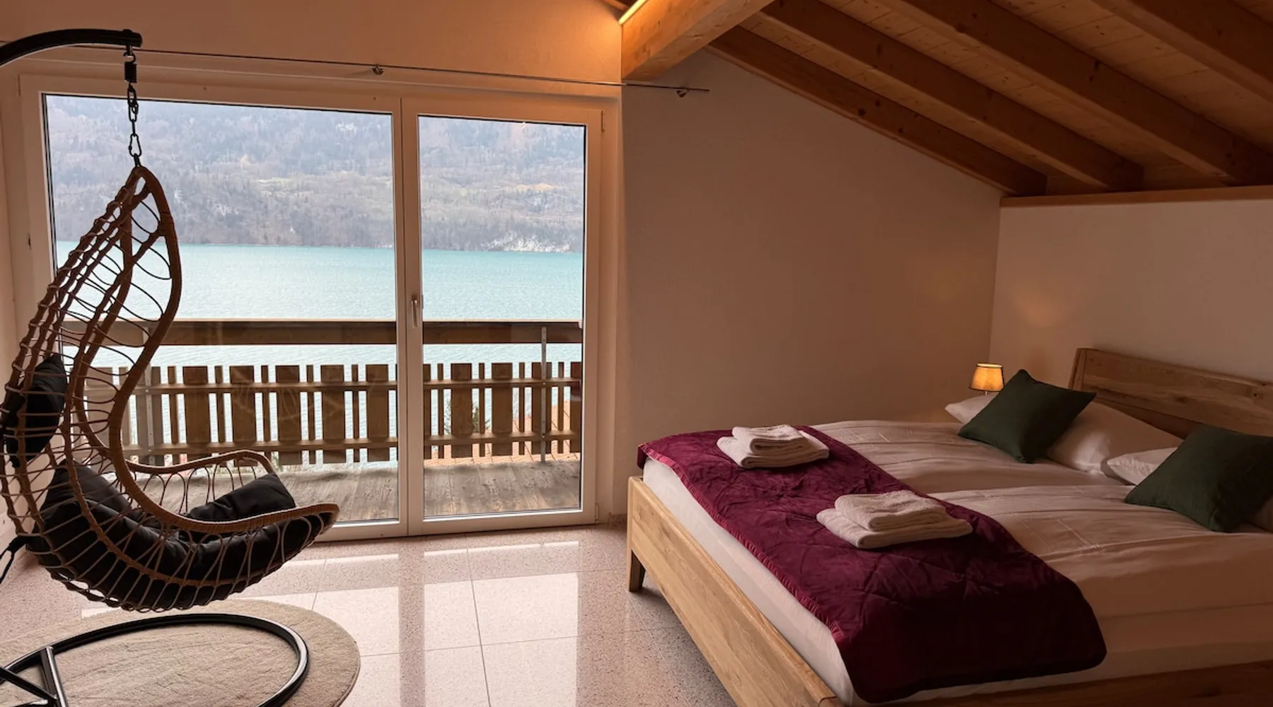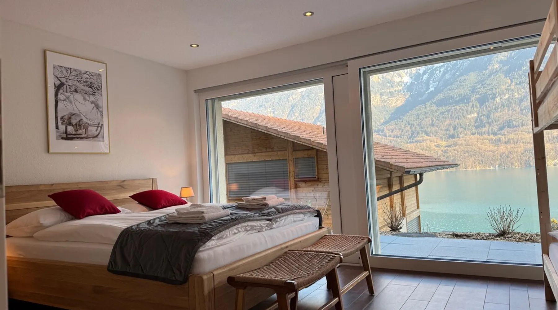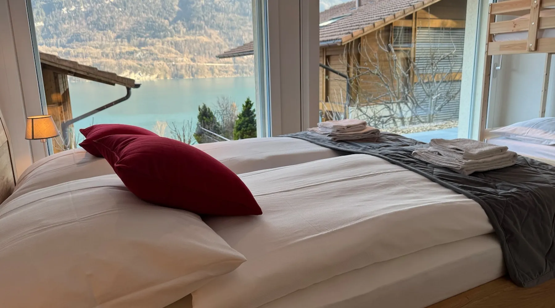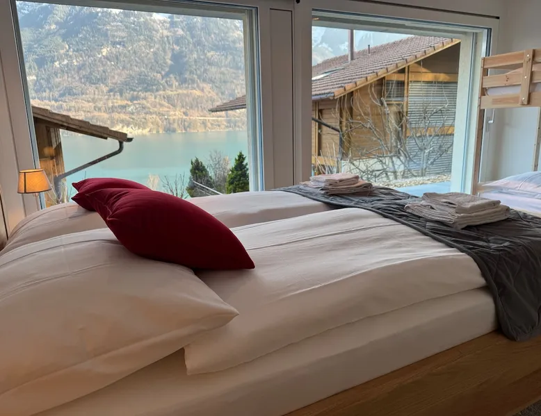 Escape to your private paradise for creating unforgettable memories with your family and friends. ❄️ Air Conditioning in Every Room for your best summer experience 🧖♀️ Private Finnish Sauna for Ultimate Relaxation 🏞️ Unrivalled Lake & Mountain Views from Every Room 🏠 Perfect for Families & Groups (Sleeps 12) ☀️ Expansive Terrace with BBQ & a Garden with Bio-Pond ✨ 5-Star Service: Pro management, a complimentary Interlaken transfer & lot of exclusive addons like private-chef The space Welcome to Chalet Swiss Dream, one of the few truly spacious and private lakeview villas in the Interlaken region. Designed to comfortably host up to 12 guests, our home is the ultimate backdrop for an unforgettable alpine escape. The Chalet: A Tour of Your Private Sanctuary Our chalet unfolds over multiple levels, designed to maximize both the breathtaking views and your personal comfort. THE HEART OF THE HOME: The spacious, open-plan living area is where everyone can gather, relax, and share stories. It flows seamlessly into a fully equipped kitchen, ready for everything from a quick breakfast to a gourmet dinner. We've included traditional Swiss fondue 🫕 & raclette 🧀 sets for an authentic and cozy alpine evening. OUTDOOR LIVING & VIEWS: Step outside onto one of the three expansive terraces. This is your front-row seat to the magnificent theatre of the Swiss Alps. Enjoy your morning coffee, dine alfresco, or host a spectacular evening BBQ on the covered patio while gazing at the stunning turquoise waters of Lake Brienz. REST & REJUVENATE: Four beautifully appointed bedrooms and a comfortable sofa bed ensure a restful night's sleep for your entire group. Bedroom 1: Queen-Size Bed 🛌+ Double Bunk Bed 🧸 Bedroom 2: King-Size Canopy Bed 🛌 Bedroom 3: Queen-Size Bed 🛏️ Bedroom 4: King-Size Bed 🛏️ Living Room: Comfortable Double Sofa Bed 🛋️ WELLNESS & COMFORT: 4 Bathrooms: No morning queues with 3 full bathrooms and a separate guest toilet. Two main bathrooms feature luxurious AcquaClean automatic toilets. Private Finnish Sauna: Your personal wellness retreat to unwind after a day of adventure. Modern Conveniences: A private washer & dryer 🧺, Smart TV, and high-speed Wi-Fi 📶 are all included. Curated Experiences & 5-Star Service As our guest, you receive more than just a key. We are managed by SwissHome to ensure a professional, seamless stay. Complimentary Transfer: To make your arrival effortless, we include a one-time free transfer from the Interlaken train station to the chalet. Elevate Your Stay: Let us enhance your vacation with our range of exclusive add-on services (extra fees apply, bookable via our guest portal): Private Chef Dinner: A gourmet experience in the comfort of your chalet. Fully Serviced BBQ: We handle the grilling so you can relax and enjoy the view. Adventure Bookings: From paragliding to boat trips, let us help you arrange the details. Other things to note An Unbeatable Location: Your Gateway to the Jungfrau Region Your private sanctuary at Chalet Swiss Dream is the perfect base for exploring the world-renowned beauty of the Interlaken area. Whether you seek thrilling adventure or charming alpine villages, you are just minutes away. ADVENTURE & THRILLS Paragliding Interlaken: 🚗 9 min – Soar like a bird over the turquoise lakes for a truly once-in-a-lifetime experience. Rope Park Interlaken (Seilpark): 🚗 13 min – A fun-filled challenge for all ages, navigating treetop courses with stunning views. CULTURE & TOWN CHARM Interlaken City Center: 🚗 9 min – Explore the vibrant heart of the region, home to luxury boutiques, wonderful cafes, and the beautiful Kursaal Park. Ballenberg Open-Air Museum: 🚗 21 min – A fascinating journey into Swiss history, with centuries-old buildings and traditional crafts. ICONIC MOUNTAIN ESCAPES World-Famous Resorts: 🚗 within 30 min – You are perfectly positioned to access the legendary ski and hiking areas of Grindelwald, Wengen, and Mürren. The gateways to iconic peaks like the Jungfrau, Schilthorn, and Männlichen are all within easy reach. Everyday Conveniences 🍓🍏🥂🥑🥐🧀 Stocking up on groceries, local cheeses, and fine wines is effortless. You will find a wide selection of major supermarkets, including Coop, Aldi, and Landi, all within a quick 7-9 minute drive from the chalet.