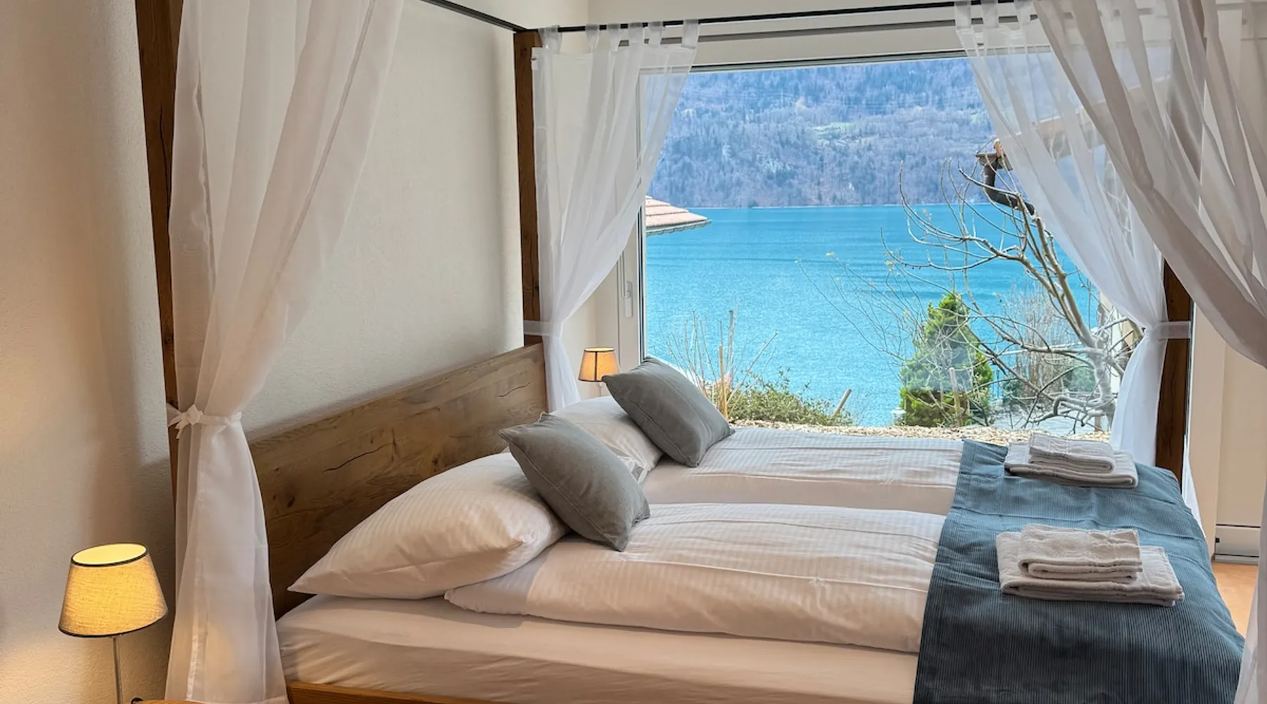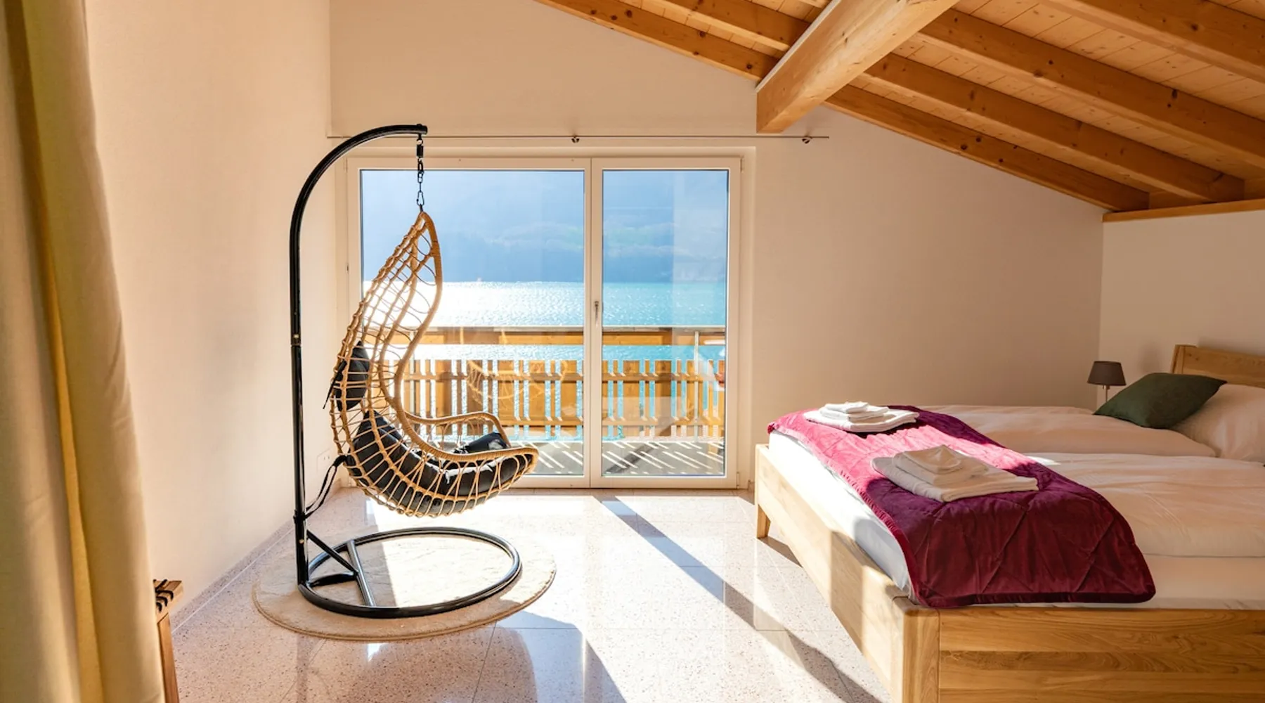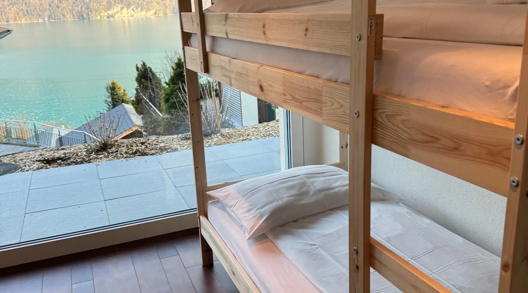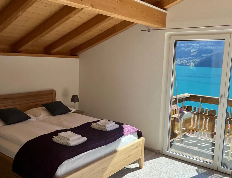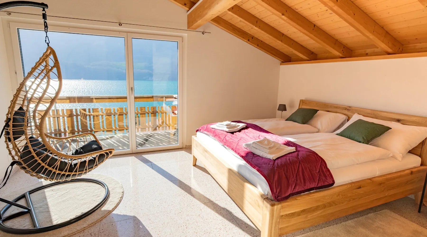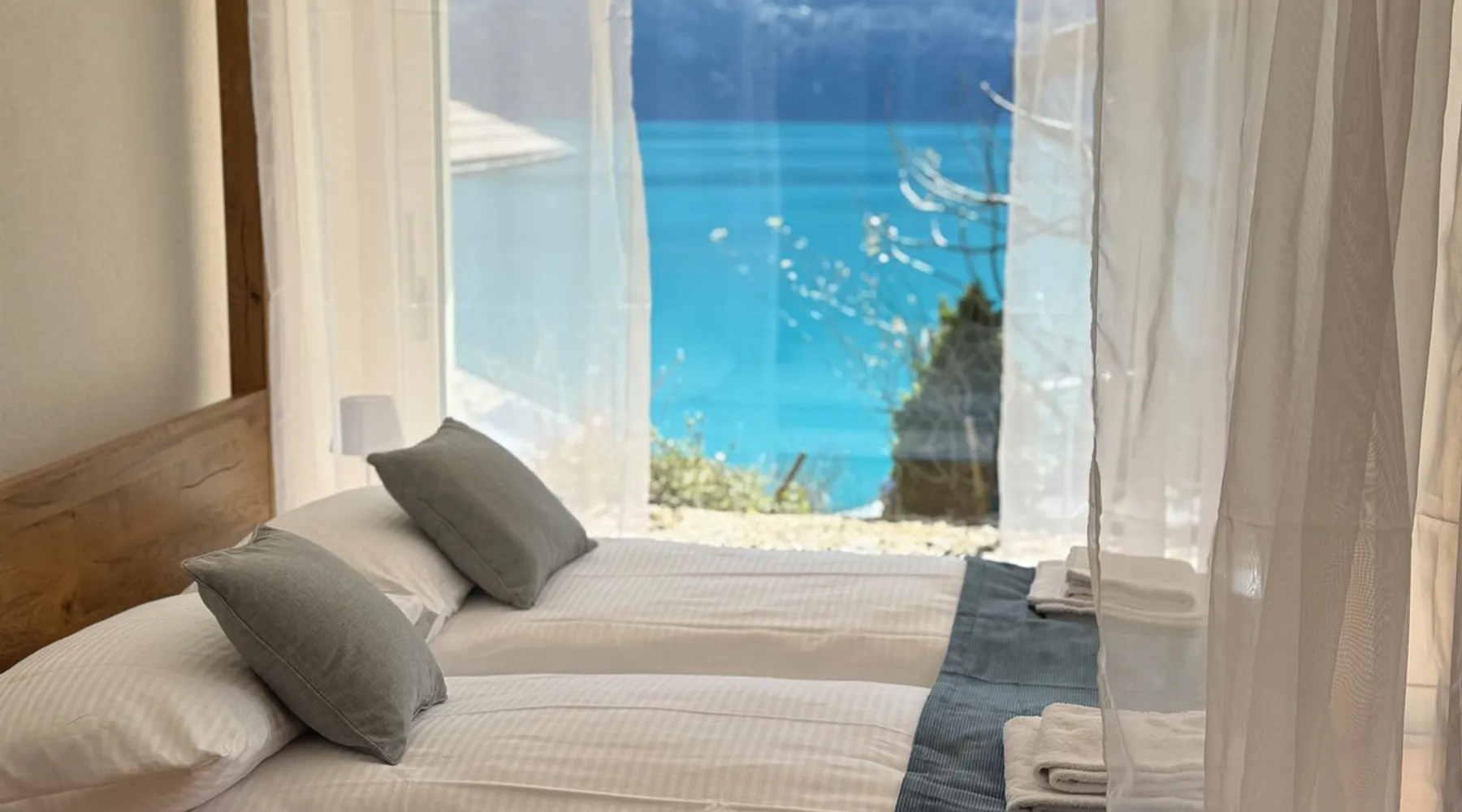 Escape to your private paradise for creating unforgettable memories with your family and friends. ❄️ Air Conditioning in Every Room for your best summer experience 🧖♀️ Private Finnish Sauna for Ultimate Relaxation 🏞️ Unrivalled Lake & Mountain Views from Every Room 🏠 Perfect for Families & Groups (Sleeps 12) ☀️ Expansive Terrace with BBQ & a Garden with Bio-Pond ✨ 5-Star Service: Pro management, a complimentary Interlaken transfer & lot of exclusive addons like private-chef The space Welcome to Chalet Swiss Dream, one of the few truly spacious and private lakeview villas in the Interlaken region. Designed to comfortably host up to 12 guests, our home is the ultimate backdrop for an unforgettable alpine escape. The Chalet: A Tour of Your Private Sanctuary Our chalet unfolds over multiple levels, designed to maximize both the breathtaking views and your personal comfort. THE HEART OF THE HOME: The spacious, open-plan living area is where everyone can gather, relax, and share stories. It flows seamlessly into a fully equipped kitchen, ready for everything from a quick breakfast to a gourmet dinner. We've included traditional Swiss fondue 🫕 & raclette 🧀 sets for an authentic and cozy alpine evening. OUTDOOR LIVING & VIEWS: Step outside onto one of the three expansive terraces. This is your front-row seat to the magnificent theatre of the Swiss Alps. Enjoy your morning coffee, dine alfresco, or host a spectacular evening BBQ on the covered patio while gazing at the stunning turquoise waters of Lake Brienz. REST & REJUVENATE: Four beautifully appointed bedrooms and a comfortable sofa bed ensure a restful night's sleep for your entire group. Bedroom 1: Queen-Size Bed 🛌+ Double Bunk Bed 🧸 Bedroom 2: King-Size Canopy Bed 🛌 Bedroom 3: Queen-Size Bed 🛏️ Bedroom 4: King-Size Bed 🛏️ Living Room: Comfortable Double Sofa Bed 🛋️ WELLNESS & COMFORT: 4 Bathrooms: No morning queues with 3 full bathrooms and a separate guest toilet. Two main bathrooms feature luxurious AcquaClean automatic toilets. Private Finnish Sauna: Your personal wellness retreat to unwind after a day of adventure. Modern Conveniences: A private washer & dryer 🧺, Smart TV, and high-speed Wi-Fi 📶 are all included. Curated Experiences & 5-Star Service As our guest, you receive more than just a key. We are managed by SwissHome to ensure a professional, seamless stay. Complimentary Transfer: To make your arrival effortless, we include a one-time free transfer from the Interlaken train station to the chalet. Elevate Your Stay: Let us enhance your vacation with our range of exclusive add-on services (extra fees apply, bookable via our guest portal): Private Chef Dinner: A gourmet experience in the comfort of your chalet. Fully Serviced BBQ: We handle the grilling so you can relax and enjoy the view. Adventure Bookings: From paragliding to boat trips, let us help you arrange the details. Other things to note An Unbeatable Location: Your Gateway to the Jungfrau Region Your private sanctuary at Chalet Swiss Dream is the perfect base for exploring the world-renowned beauty of the Interlaken area. Whether you seek thrilling adventure or charming alpine villages, you are just minutes away. ADVENTURE & THRILLS Paragliding Interlaken: 🚗 9 min – Soar like a bird over the turquoise lakes for a truly once-in-a-lifetime experience. Rope Park Interlaken (Seilpark): 🚗 13 min – A fun-filled challenge for all ages, navigating treetop courses with stunning views. CULTURE & TOWN CHARM Interlaken City Center: 🚗 9 min – Explore the vibrant heart of the region, home to luxury boutiques, wonderful cafes, and the beautiful Kursaal Park. Ballenberg Open-Air Museum: 🚗 21 min – A fascinating journey into Swiss history, with centuries-old buildings and traditional crafts. ICONIC MOUNTAIN ESCAPES World-Famous Resorts: 🚗 within 30 min – You are perfectly positioned to access the legendary ski and hiking areas of Grindelwald, Wengen, and Mürren. The gateways to iconic peaks like the Jungfrau, Schilthorn, and Männlichen are all within easy reach. Everyday Conveniences 🍓🍏🥂🥑🥐🧀 Stocking up on groceries, local cheeses, and fine wines is effortless. You will find a wide selection of major supermarkets, including Coop, Aldi, and Landi, all within a quick 7-9 minute drive from the chalet.