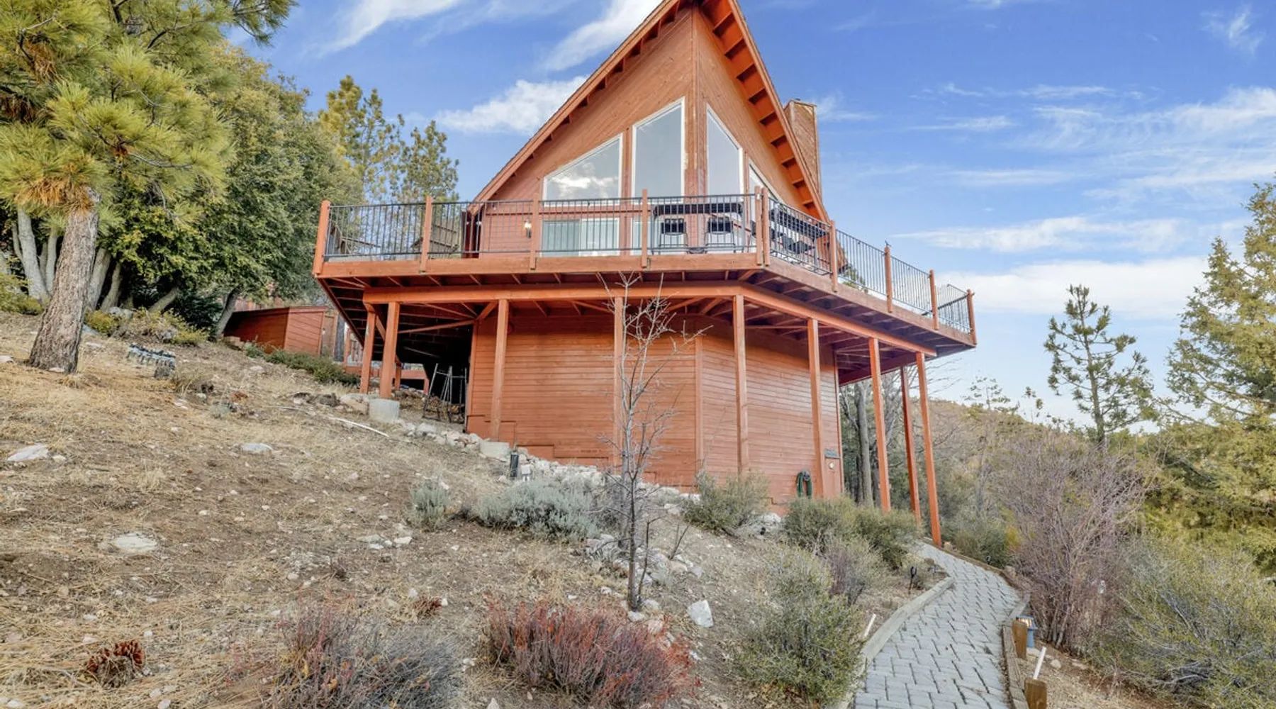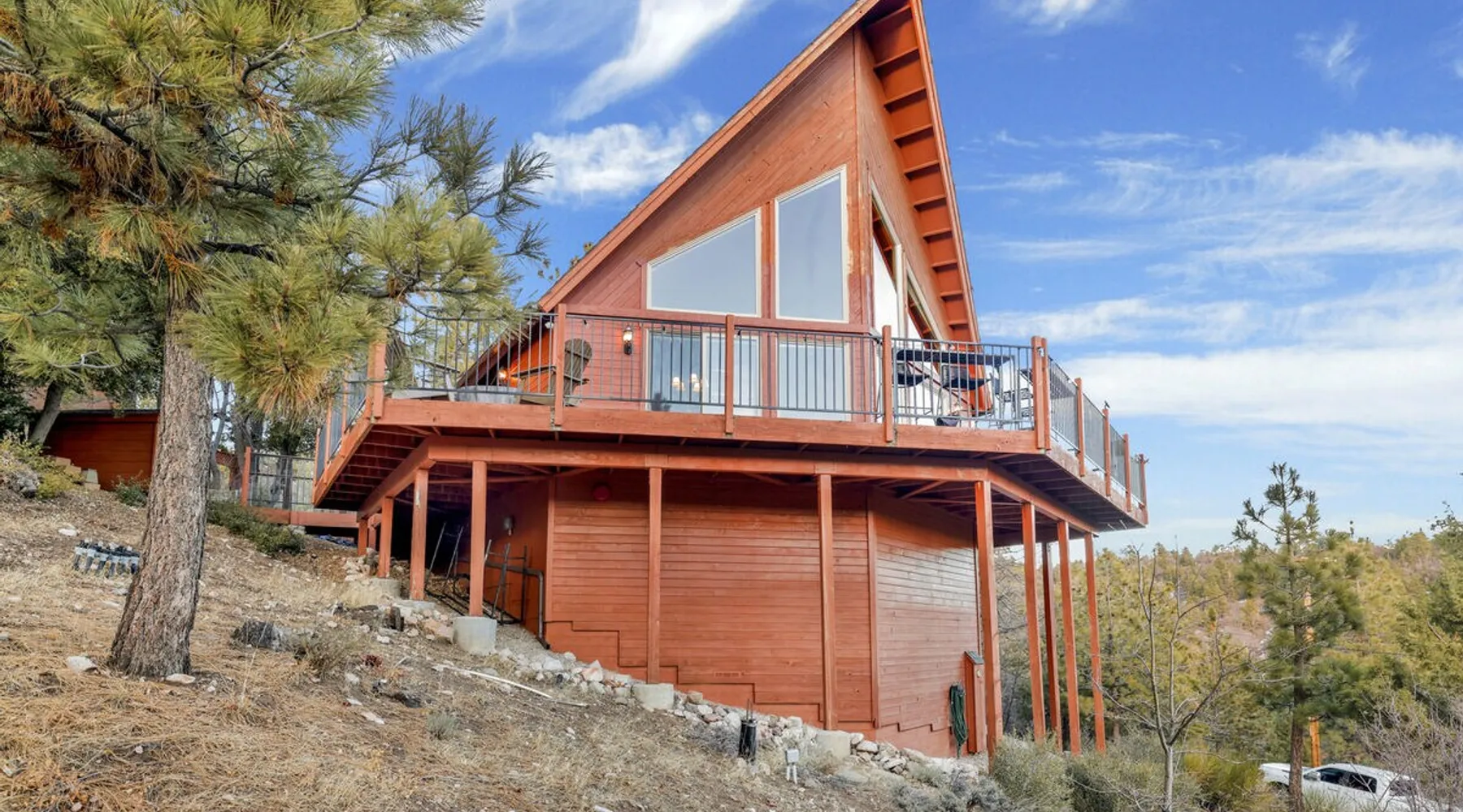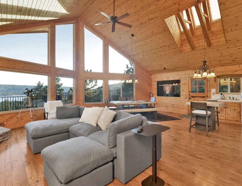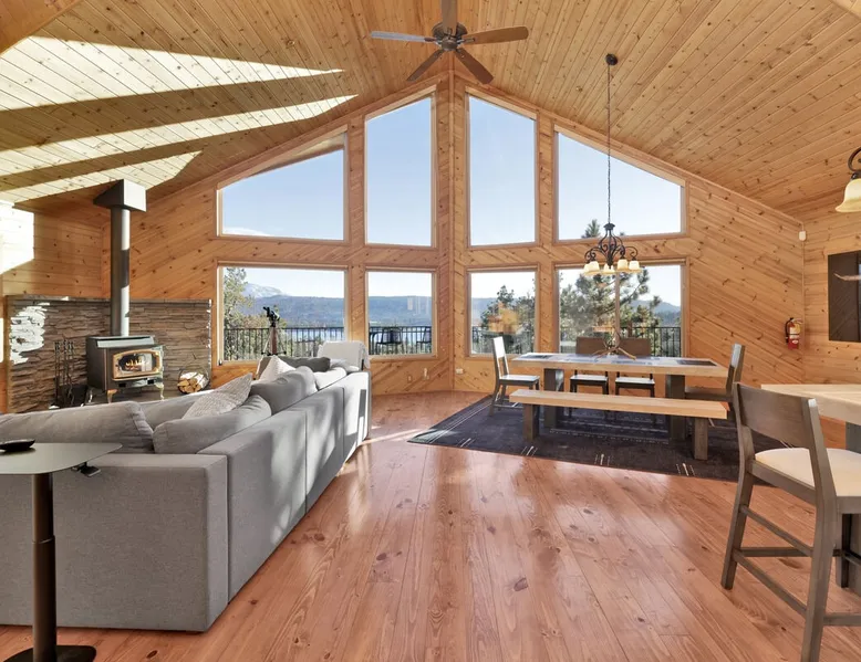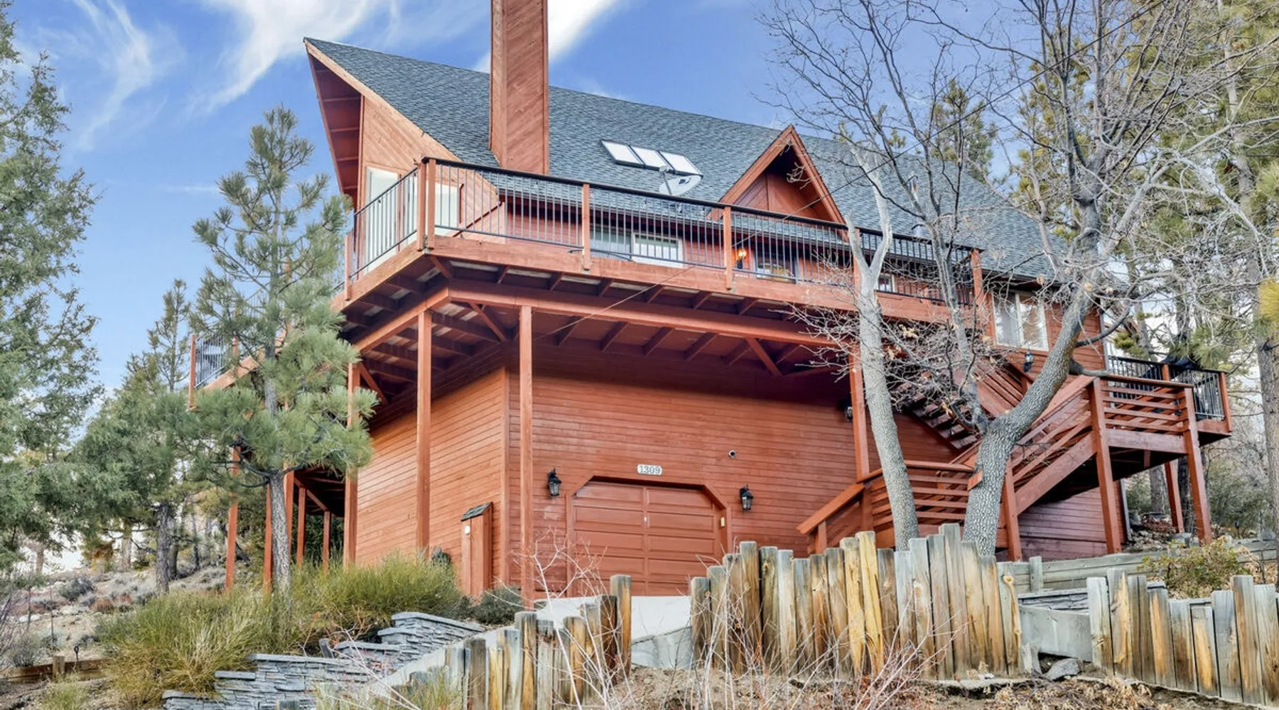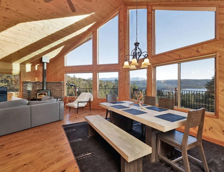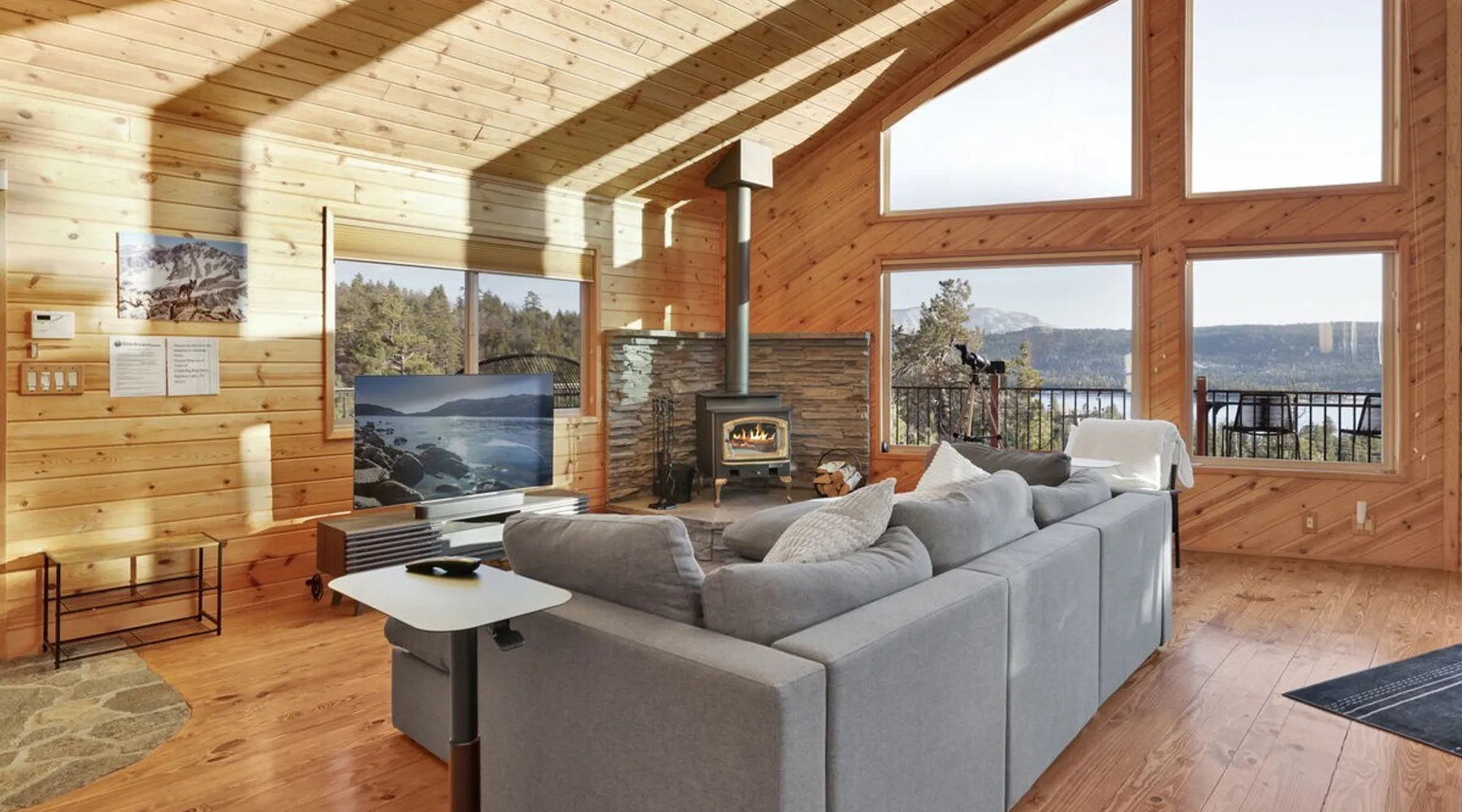 High-Top Lakeview Chateau | Relaxing Modern Fawnskin Retreat Welcome to High-Top Lakeview Chateau, your mountain getaway nestled in the pines above Big Bear Lake on the serene North Shore. This charming cabin is the perfect spot for a family vacation or a getaway with friends, offering a relaxing retreat any time of the year. With everything you need to create lifelong memories, this is the ideal destination for your next mountain escape. The space Step inside and take in breathtaking panoramic views of the lake, forest, and valley through floor-to-ceiling windows that fill the open living space with natural light. Cozy up by the wood-burning fireplace, cook in the modern kitchen equipped with a microwave, air fryer, and electric stovetop, or unwind surrounded by artisan furnishings and warm, inviting décor. Please note- NO OVEN- Each bedroom offers private deck access leading to a soothing outdoor spa, ideal for soaking under the stars after a day of exploring Big Bear’s scenic trails or slopes. Step outside to the wrap-around sun deck where high-top seating, solar lighting, and panoramic lake views create the perfect backdrop for morning coffee, sunset drinks, or al fresco dining. Just 10 minutes from The Village, ski resorts, and marinas, this peaceful Fawnskin retreat offers easy access to all of Big Bear’s best attractions while maintaining the serenity of a secluded mountain escape. Whether you’re visiting for a family adventure, romantic weekend, or a peaceful recharge, High-Top Lakeview Chateau offers the ultimate blend of luxury, nature, and comfort. Book your stay today and experience the best of Big Bear, where relaxation meets adventure! Sleeping Arrangements: Bedroom 1: Queen Bed, Deck Access — Single Level Bedroom 2: Queen Bed + Twin Bed, Deck Access — Single Level Bathroom Arrangements: Hallway Full Bath — Single Level Hallway 3/4 Bath (Shower Only) — Single Level Sleeps 5 2-Car Driveway Parking (Garage not accessible to guests) 2 Pets Welcome w/ Additional Fee 1,260 Square Feet County Permit #: CESTRP-2025-00067 Guest access Once checked in, guests can enjoy sole access to their private property for the duration of their booked dates. Registration Details CESTRP-2025-00067