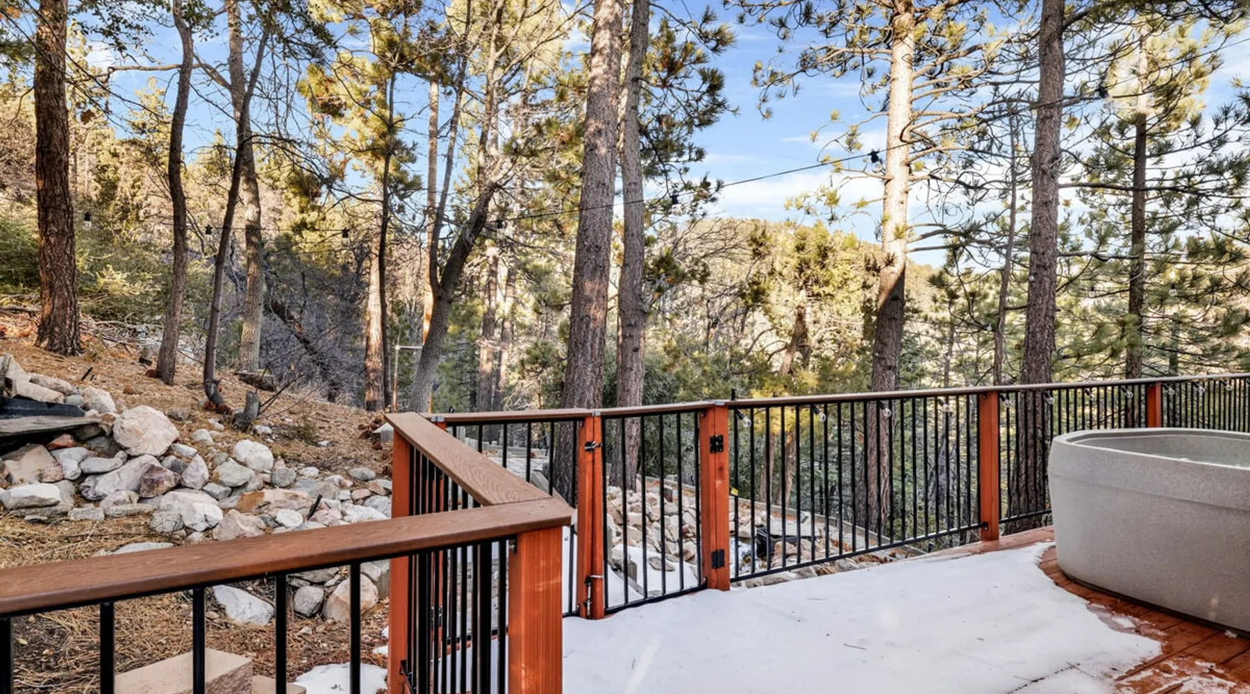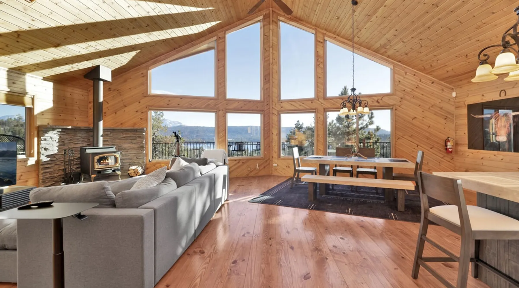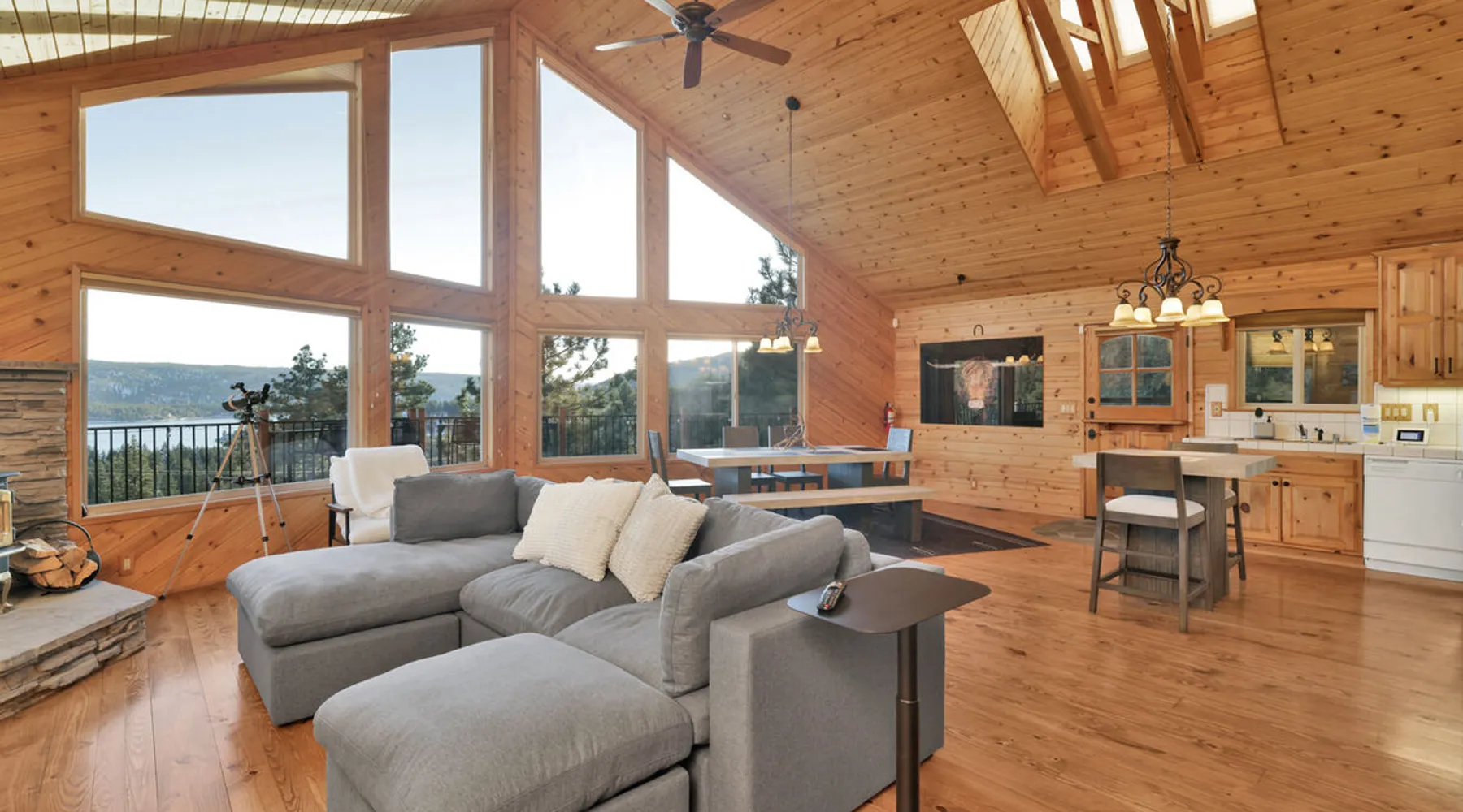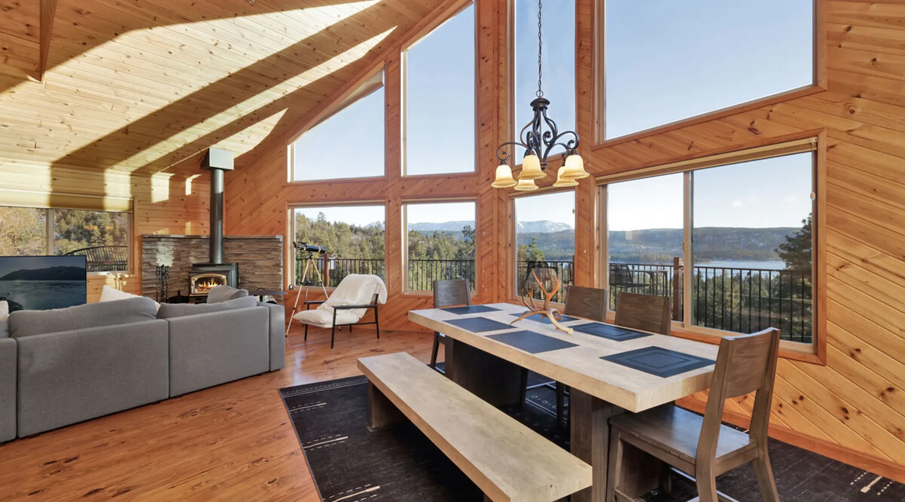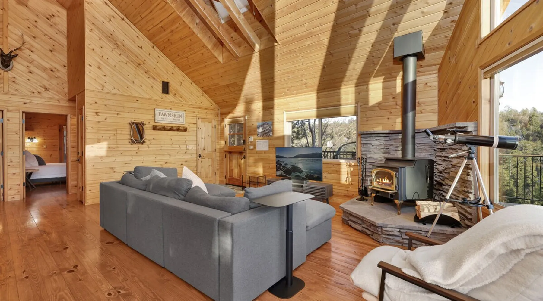 High-Top Lakeview Chateau | Relaxing Modern Fawnskin Retreat Welcome to High-Top Lakeview Chateau, your mountain getaway nestled in the pines above Big Bear Lake on the serene North Shore. This charming cabin is the perfect spot for a family vacation or a getaway with friends, offering a relaxing retreat any time of the year. With everything you need to create lifelong memories, this is the ideal destination for your next mountain escape. The space Step inside and take in breathtaking panoramic views of the lake, forest, and valley through floor-to-ceiling windows that fill the open living space with natural light. Cozy up by the wood-burning fireplace, cook in the modern kitchen equipped with a microwave, air fryer, and electric stovetop, or unwind surrounded by artisan furnishings and warm, inviting décor. Please note- NO OVEN- Each bedroom offers private deck access leading to a soothing outdoor spa, ideal for soaking under the stars after a day of exploring Big Bear’s scenic trails or slopes. Step outside to the wrap-around sun deck where high-top seating, solar lighting, and panoramic lake views create the perfect backdrop for morning coffee, sunset drinks, or al fresco dining. Just 10 minutes from The Village, ski resorts, and marinas, this peaceful Fawnskin retreat offers easy access to all of Big Bear’s best attractions while maintaining the serenity of a secluded mountain escape. Whether you’re visiting for a family adventure, romantic weekend, or a peaceful recharge, High-Top Lakeview Chateau offers the ultimate blend of luxury, nature, and comfort. Book your stay today and experience the best of Big Bear, where relaxation meets adventure! Sleeping Arrangements: Bedroom 1: Queen Bed, Deck Access — Single Level Bedroom 2: Queen Bed + Twin Bed, Deck Access — Single Level Bathroom Arrangements: Hallway Full Bath — Single Level Hallway 3/4 Bath (Shower Only) — Single Level Sleeps 5 2-Car Driveway Parking (Garage not accessible to guests) 2 Pets Welcome w/ Additional Fee 1,260 Square Feet County Permit #: CESTRP-2025-00067 Guest access Once checked in, guests can enjoy sole access to their private property for the duration of their booked dates. Registration Details CESTRP-2025-00067