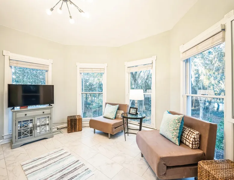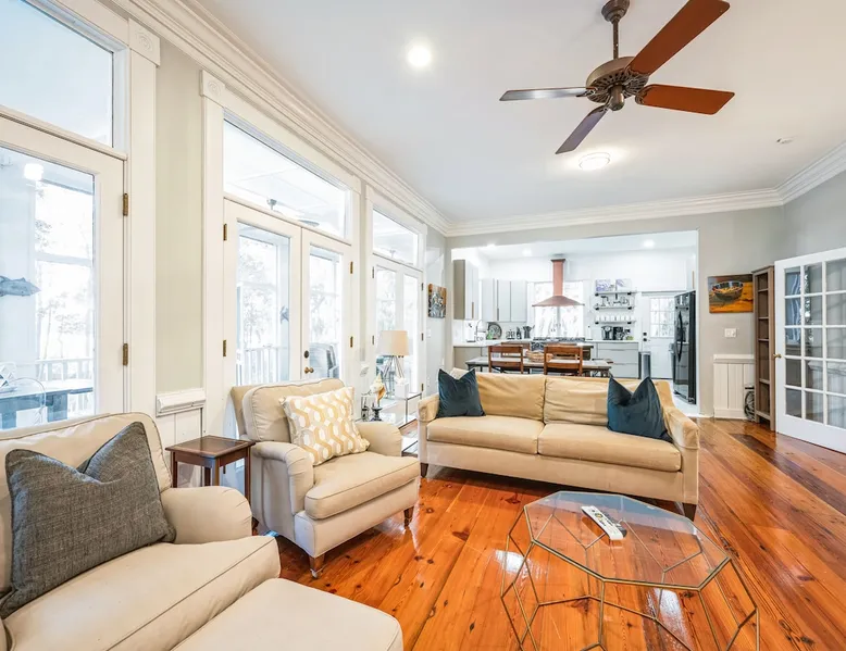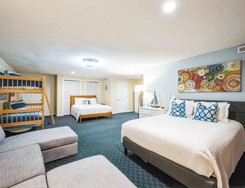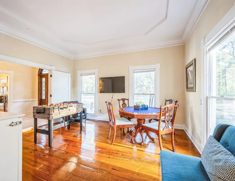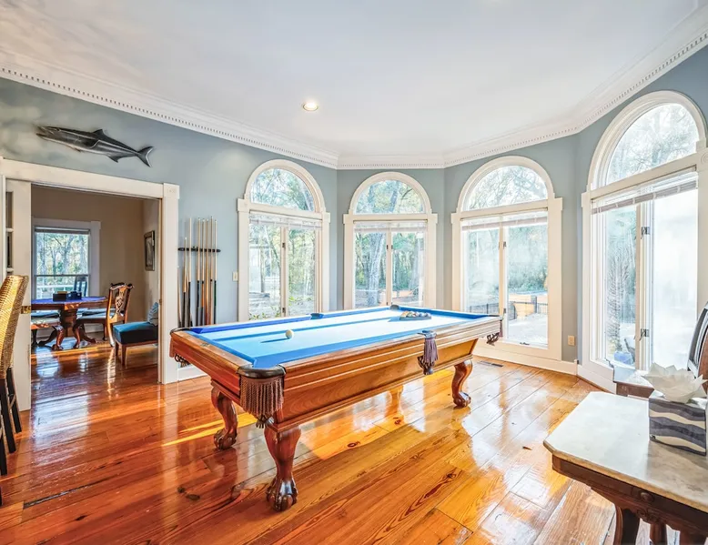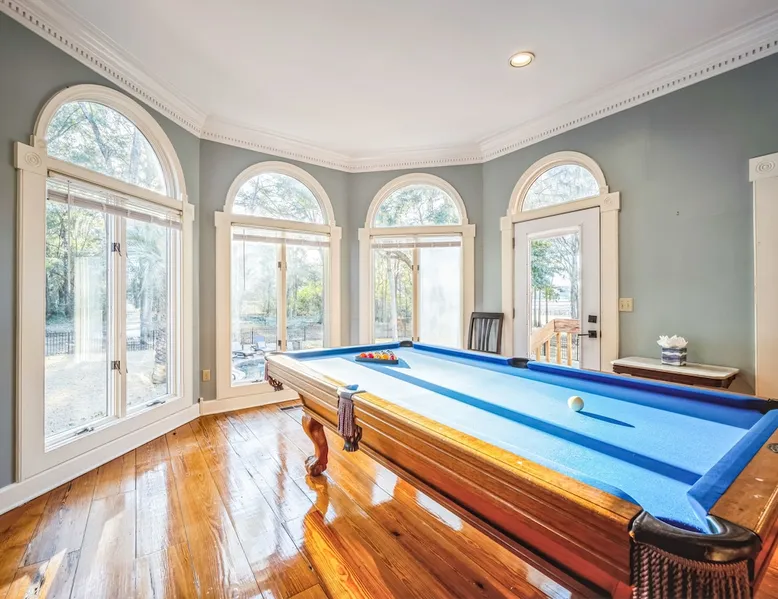 Discover the ultimate escape at Bay Breeze Manor, a luxurious waterfront haven on Bohicket Rd. This expansive property offers 360° water views, Private Pool and Hot Tub, Ultimate game room with a pool table, foosball, poker table and lounge with fireplace, Outdoor Firepit and screened porch. Ideal for families or groups-featuring flexible sleeping arrangements including king suite with attached nursery area and a basement w/ bunk beds. Enjoy the on-site basketball hoop or a relaxing kayak ride! The space Living Spaces • Ultimate Game Room: Equipped with a Pool Table, Foosball, Poker table and Lounge area with Fireplace • Large Living Room: Bright area with ample seating. Flat-screen TV and breathtaking water views. • Fully Equipped Kitchen: Generous counter space ideal for meal preparation. • Screened-In Porch: Offers outdoor beauty with comfortable seating for relaxation or dining. Outdoor Amenities • Private Pool & Hot Tub: Perfect for unwinding amidst peaceful surroundings. • Fire Pit Area: Cozy evenings under the stars with ample seating available. • Basketball Hoop & Kayaks: Engage in friendly competition or explore nearby waters at your leisure. Sleeping Arrangements Main King Suite (Upstairs): Spacious king bedroom with trundle bed under the king bed. Also includes attached Nursery area with a crib and two fold-out futon chairs. Jack and Jill Shared Bathroom: Connects a bedroom with two double-sized beds to an additional king bedroom. Queen Bedroom (Upstairs): Cozy queen-sized bed with easy access to home amenities. King Bedroom (Downstairs): Conveniently located on the main floor. Includes an attached washer and dryer room. Downstairs Basement: Bunk beds, two full-sized beds, sofa, and TV for entertainment. A Perfect Getaway Set on a sprawling private lot on Bohicket Rd., Bay Breeze Manor is designed to offer endless opportunities for both relaxation and adventure. Whether you're lounging by the pool or enjoying a kayak ride, this retreat caters to all preferences. Book your stay today to experience unparalleled luxury on John's Island, just minutes from the beach! Other things to note House Rules: No smoking allowed Pet friendly with a fee No Parties or Events