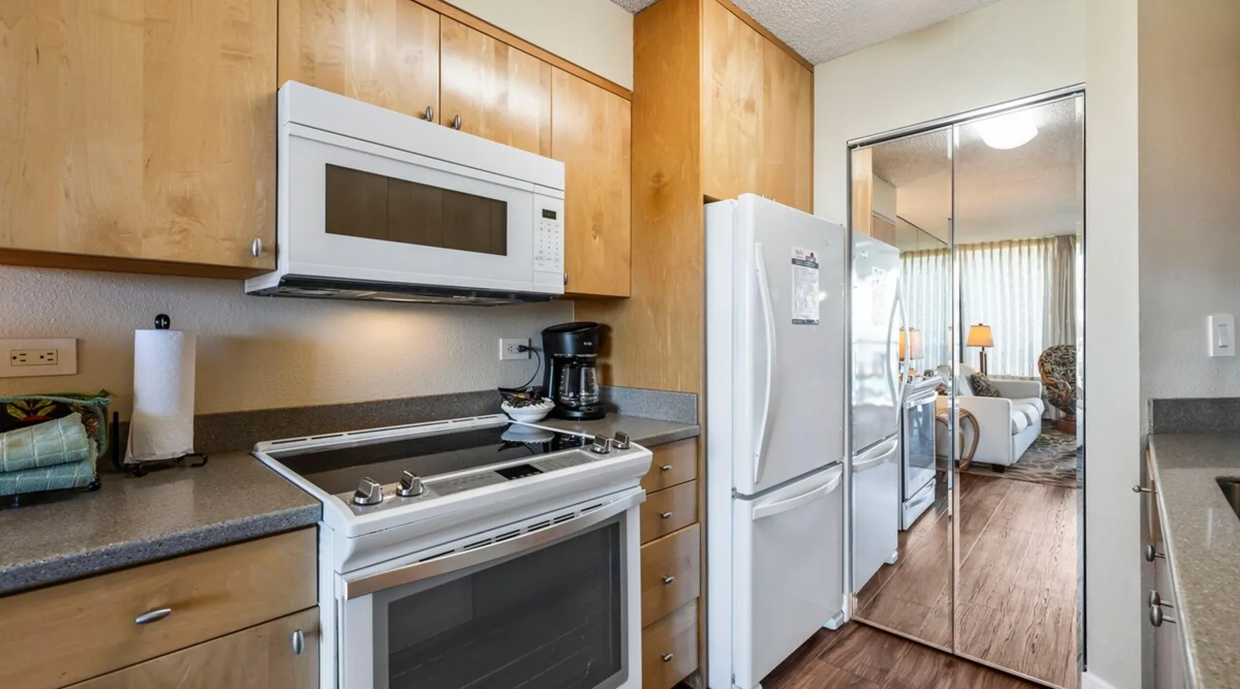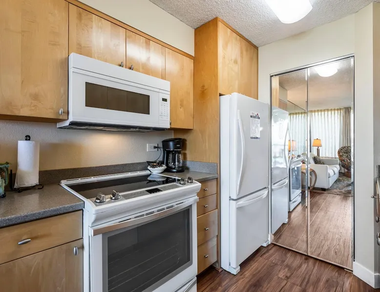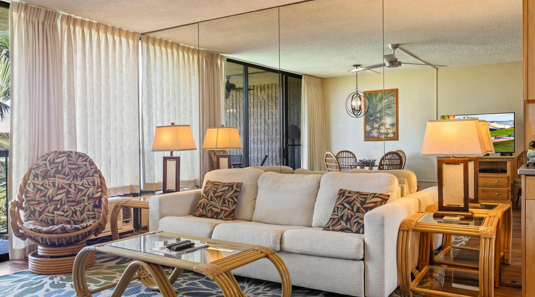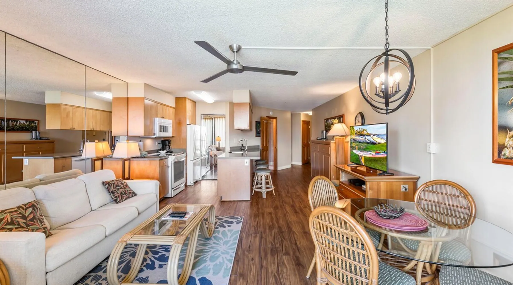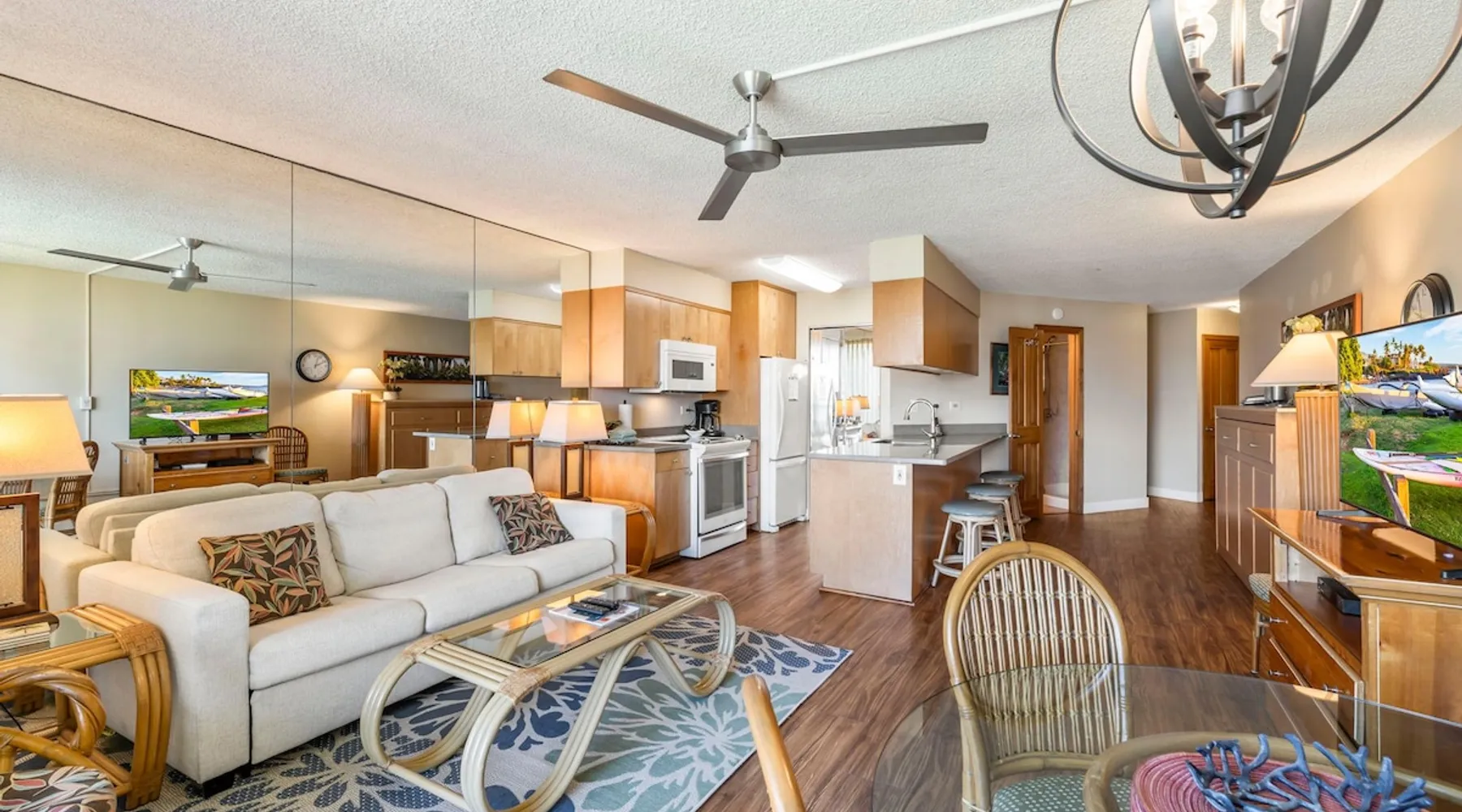 Upper floor lanai features privacy and views of gardens and partial ocean views. The space Watch the life of Maui unfold from the morning till evening from your private 114 sq foot private view deck. Premium condo suite located near the pool area. Quiet location features large private view deck and renovated interior. Large private condominium apartment at the resort condominium complex on the beach in sunny Kihei, Maui, Hawaii. 1 bedroom with private attached bathroom. 2nd bathroom down the hall with shower, large living area, dining area, kitchen with breakfast bar. PLUS, large private view deck looking out towards ocean. Beach chairs, pool towels, full size appliances including air conditioning and washer dryer. Really, just hit the grocery store and you are set for the week! General Info: The Maui Sunset is located on over 5 acres of oceanfront at Kihei which is considered one of the best locations on the Valley Isle. Kihei is noted for its year-round sunshine, balmy trade winds, and soothing evening air. It is one of the driest and sunniest areas on the entire island, averaging only 10 inches a year! World famous swimming and snorkeling beaches are minutes away at one of the many sandy safe beaches at Kihei and nearby Wailea. Just a short distance (6 miles) from five championship 18-hole resort golf courses at Wailea and Makena. The two buildings frame and protect a large recreational area that is carefully attended and landscaped. The 60-foot swimming pool with its broad decks and abundance of pool furniture invites you to improve on your tan. Keywords: Condo, ocean front resort, 1 Bedroom 2 Bath, ocean front view, timeshare, updated, maui sunset, kihei, vacation rental TA -045-807-4112-01 Registration Details Exempt