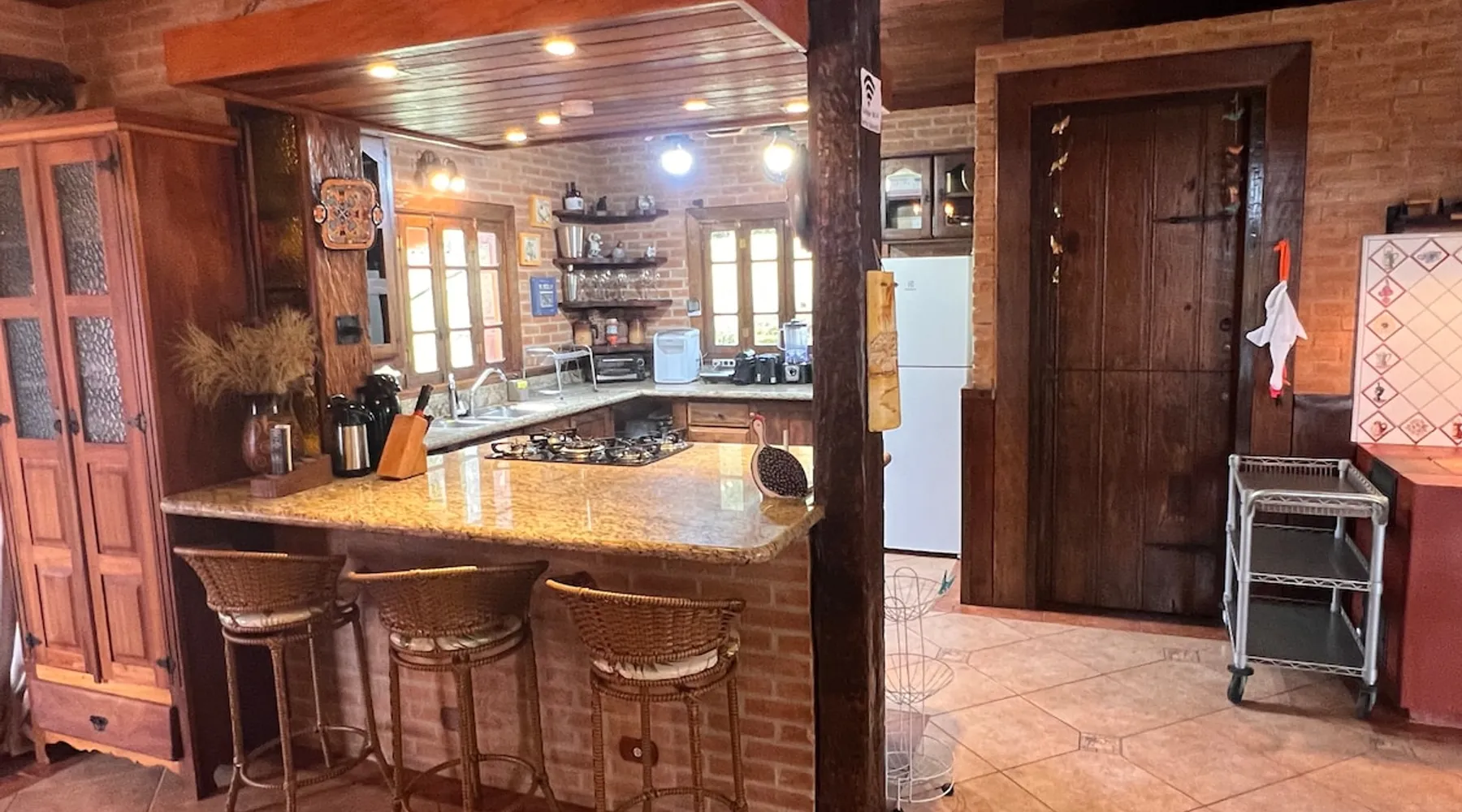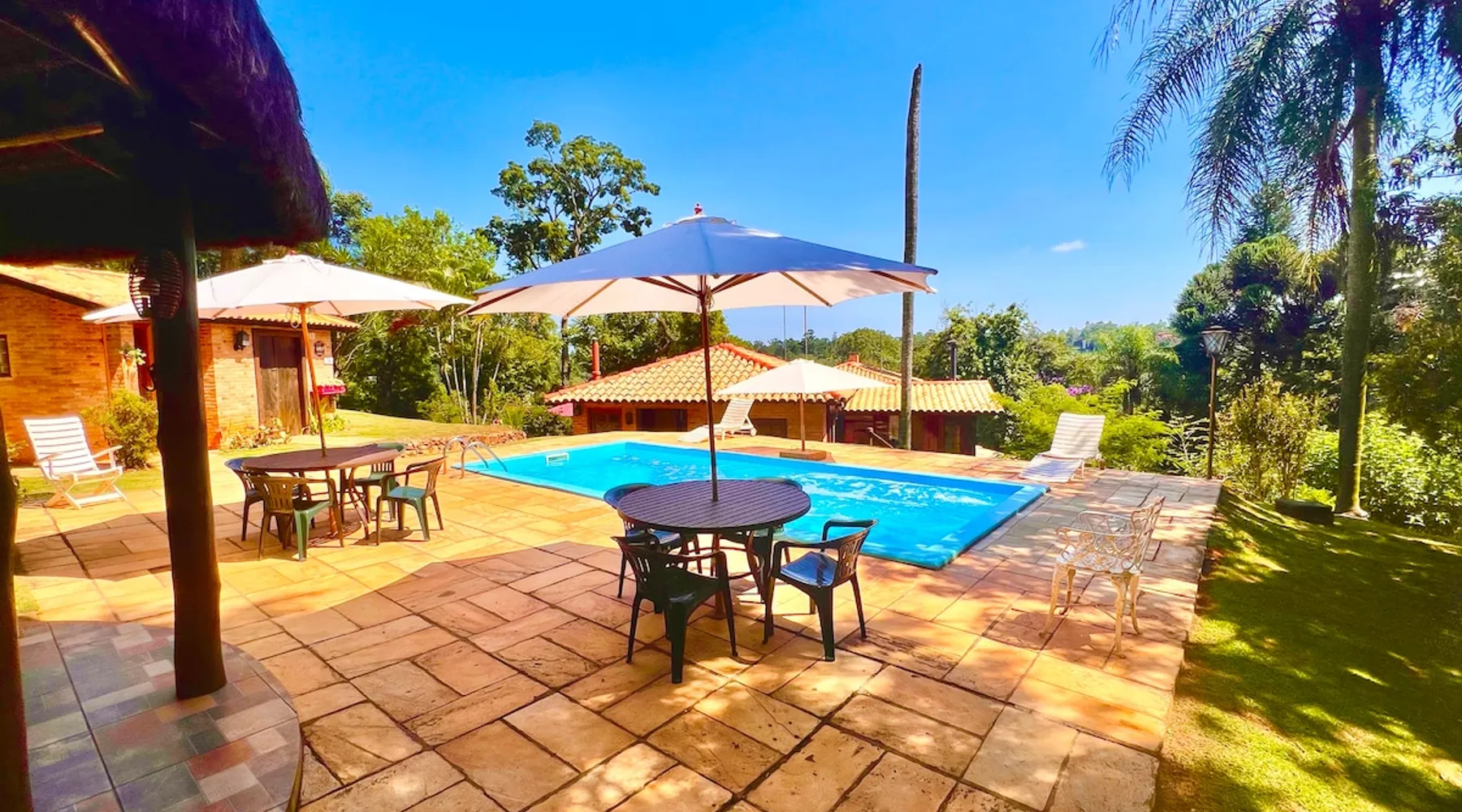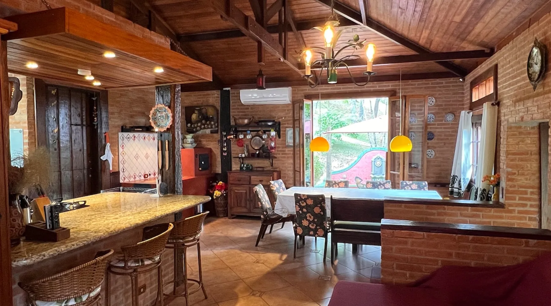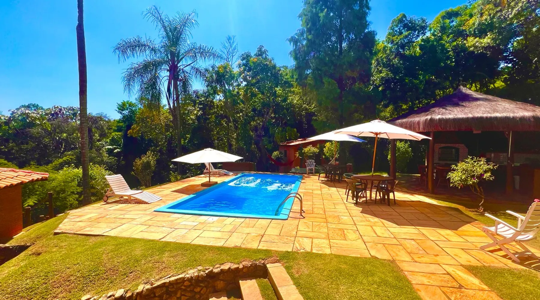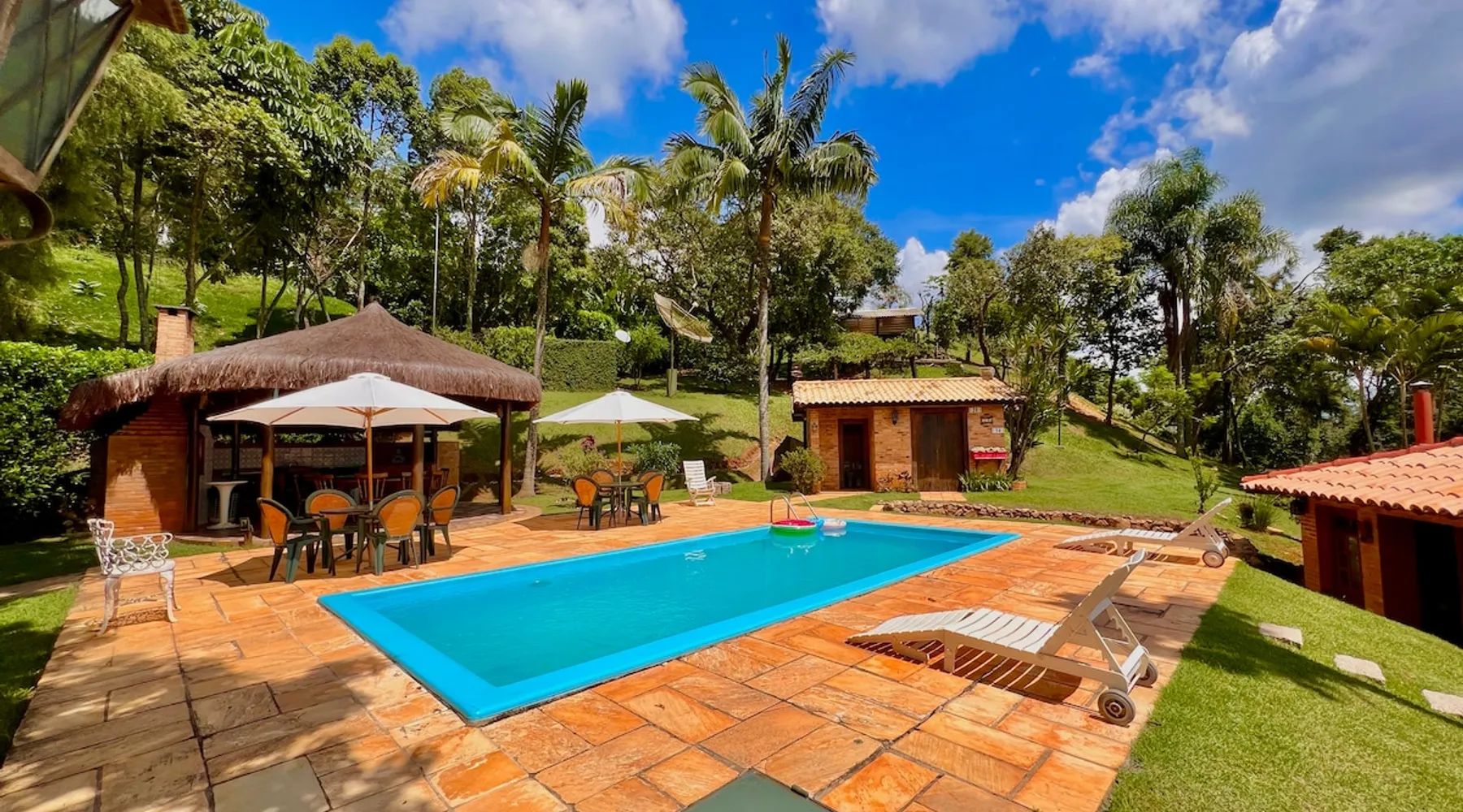 Place for unforgettable moments 45min from SP! Gated and secure condominium. 400Mbps Internet. Capacity 17 people in 5 bedrooms (3 suites), 7 bathrooms. Bed/bath linen. Gourmet kitchen and wood stove. Fireplaces. Heated and illuminated pool. Kiosk. w/ barbecue. ice mach., TV, freezer, stove, refrigerator and stereo. Illuminated ATP standard tennis court. Professional gym. Complete games room. Air cond. in all environments. Max. cleanliness. Everything in the house works perfectly. All fenced. The space Ideal place for integration with family and friends. Capacity 17 people at night and 25 during the day. Get out of the gray of the city and come have fun and rest in a beautiful farm with a farmhouse, surrounded by green and peace. As an exclusivity, we offer bed and bath linen (face and bath towels, bottom and top sheets, pillows, blankets and blankets, all very clean and sanitized), 400Mbps internet, Netflix, SkyHDTV, toilet paper, cleaning products for the house, liquid soaps in the bathroom sinks, heated pool and court lighting. For FAMILIES, FRIENDS OR EVENTS (up to 50 people and price not included on accomodation rate), it is a space with 6,500m2 (70,000ft2) encrusted in the middle of a forest reserve, all fenced and inside a very safe gated condominium, it is the ideal place to enjoy nature with family, friends, small events or even a romantic weekend. Maximum 2 medium pets up to 15kg (more pets or higher, on request). - It has all the elements of an excellent house of 420m2 (4,520ft2) of floor space with a high standard, but with the beauty of the fine rustic style. Quiet place, neighbors 100m away, give the perfect privacy for rest. - Large rooms, all with beautiful views of nature. There are 2 bedrooms with super king bed (6ft8"x6ft6") plus a bunk bed (2ft11"x6ft6") and 3 with queen bed (5ft7"x6ft6"), one of them with a bunk bed. Of the 5 bedrooms, 3 are suites, one with a 600-liter Jacuzzi whirlpool. - Kitchen with all the utensils of a good modern kitchen (plates, glasses, cups, cutlery, trays, molds, pans, pressure cookers, sandwich maker, toaster, orange juicer, thermoses, Nespresso coffee maker, Italian coffee maker, Japanese rice cooker, blender, dishwasher, mixer, electric oven, ice water filter, duplex refrigerator, 5-burner cooktop, 2 gas ovens, microwave, airfryer, complete fondue rechaud, sukiyaki pan, bread maker, etc.). - We have a crib and bathtub for babies. - The games room has ambient sound, table tennis, snooker, foosball, chess, dart and a beautiful fireplace room. - The gym is professional and complete, has a bathroom with shower, large Queen's electronic treadmill, digital exercise bike and elliptical, Queen's weight station with 3 towers, electronic shaker, smartTV with Sky and internet, ambient sound, plates, weights, mats, drinking fountain and air conditioning. - The tennis court is ATP standard, 10,000W metallic steam lighting (does not dazzle), fast floor with rubber cushioning, with 2 tables, 4 chairs and 2 umbrellas. We provide new tennis rackets and we have ball tubes for sale. Both the gym and the court are inside the house All TVs are HD SmartTV's with SkyHDTV, Netflix, Youtube etc. - The water that supplies the farm is artezian well mineral and tri-filtered. This water supplies the pool, which is heated between 27-28C (80-83F) all year round. For emergencies there is a power generator. - The entrance gate is automatic. Video security with 10 external HD and infrared cameras 50 meters, via satellite and 4G. Direct intrusion alarm system with the police. Although we are in the middle of a forest reserve, we make a point of keeping the entire house and other amenities absolutely clean, sanitized and fumigated. - The land is large, 6,500m2, all fenced and has two houses, the one in this ad, with 420m2 and the old guest house where I live with my wife. The two are distant from each other and completely independent in everything. We are always available to help with any need of our guests. Guest access The location is great, access is via the Castello Branco Highway, near km 58. From Alphaville/Barueri it is 39km or 35min and from São Paulo, 60km or 45 min. The entrance is on a paved road and from the entrance to the inside the streets are dirt, but well maintained. From the entrance to the house it is 700m, any car can get here without problems. The option not to pave is for ecological reasons. The farm is all well fenced, preventing the intrusion of low wild animals or the exit of pets. Other things to note A place of special energy for those who enjoy contact with nature and a lot of comfort, exclusivity and privacy. For COMPANIES, ideal place for events up to 50 people (price to be quoted from 20 people). Maximum 2 medium pets up to 15kg per stay (more pets or larger, on request) Due to the topology, the place is NOT the most suitable for people with mobility limitations.