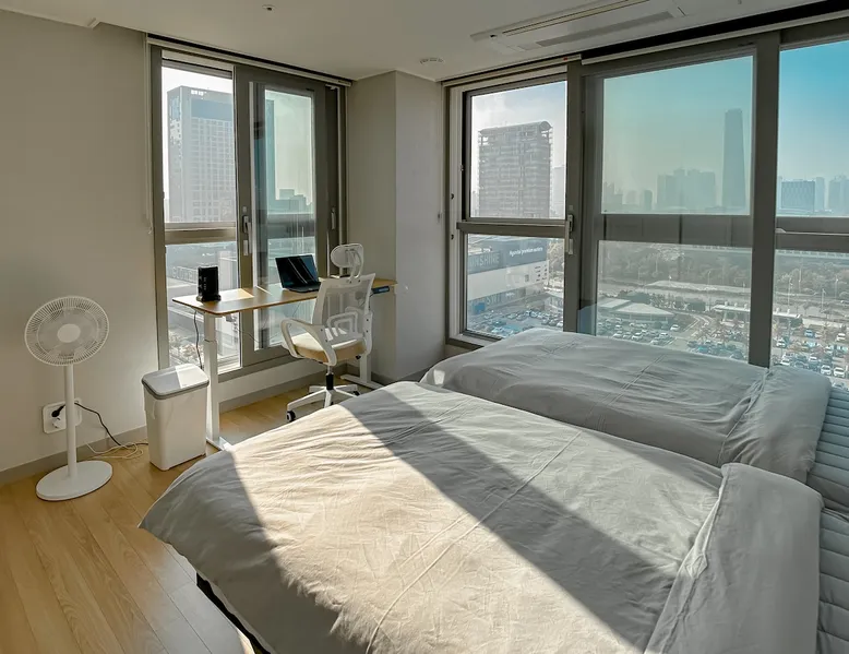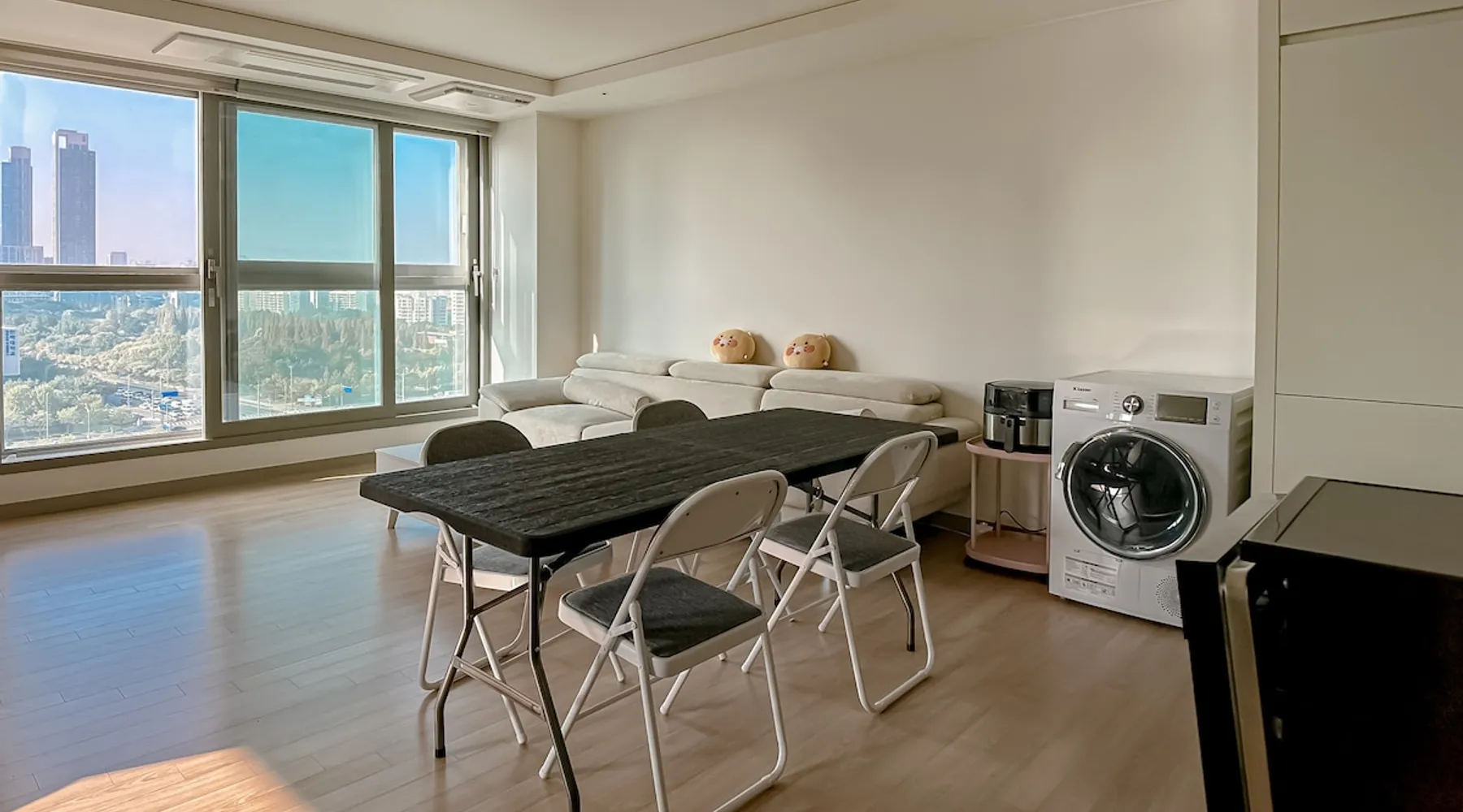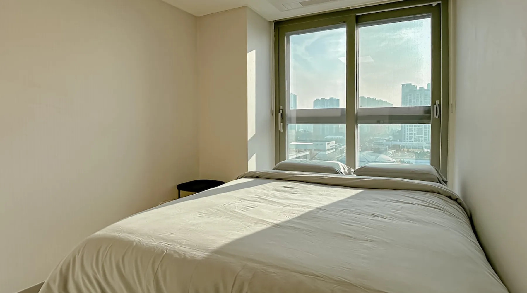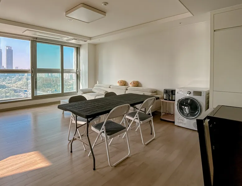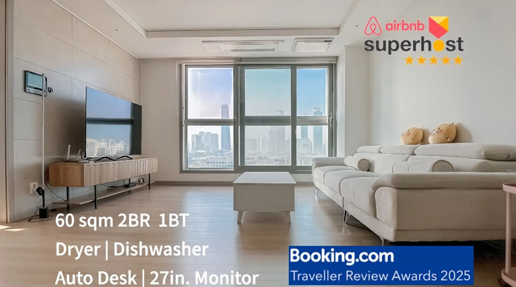 Another place to stay, run by the ✪ top 5% hosts (Top Review on Booking.com), and why more than 80% of guests are staying longer than 10 days! I recommend it to 🌟these people. Those who are sensitive to noise and want a quiet break Who cares about high-quality mattresses (ensures a good night's sleep) Those who need to take care of their work + rest at the same time 📍 House instructions 60m ² new high floor apartment (10 + F): 2 bedrooms + living room + kitchen + toilet 2 mins walk to Songdo Hyundai Premium Outlet & Triple Street Free early check-in & late check-out (if there is no check-in on the same day) Two free parking spaces available upon pre-registration 🏙️ Key highlights Quiet interior with double windows: Perfectly block out the outside noise for a comfortable rest! Fully equipped with smart life: At the same time, work and relaxation at home with convenient appliances such as dishwasher and electric desk! Comfortable sleeping environment: All mattresses ensure a fluffy night's sleep with high-quality memory foam! The space Introducing 🛋️ the composition and furniture Our house consists of 2 bedrooms, 1 bathroom, kitchen, balcony and living room. Room 1: King Bed (Zinus Cloud Lux Memory Foam Mattress) Room 2: 2 super-single beds (Zinus Cloud Lux Memory Foam mattress) * Extra guests provide a folding mattress (15cm thick) You can enjoy YouTube, Netflix, Disney +, and more on the 65-inch smart TV. Guest access 📍 Special amenities (located on the 3rd floor) Large Coin-operated Washer & Gas Dryer: Laundry fee: 4,000 KRW/Drying fee: 500 KRW (based on 5 minutes) Communal garden: Sit on a bench and spend some time relaxing and chatting with family and friends. Gym: You can work out using the private access key (red) (~ 10pm).
