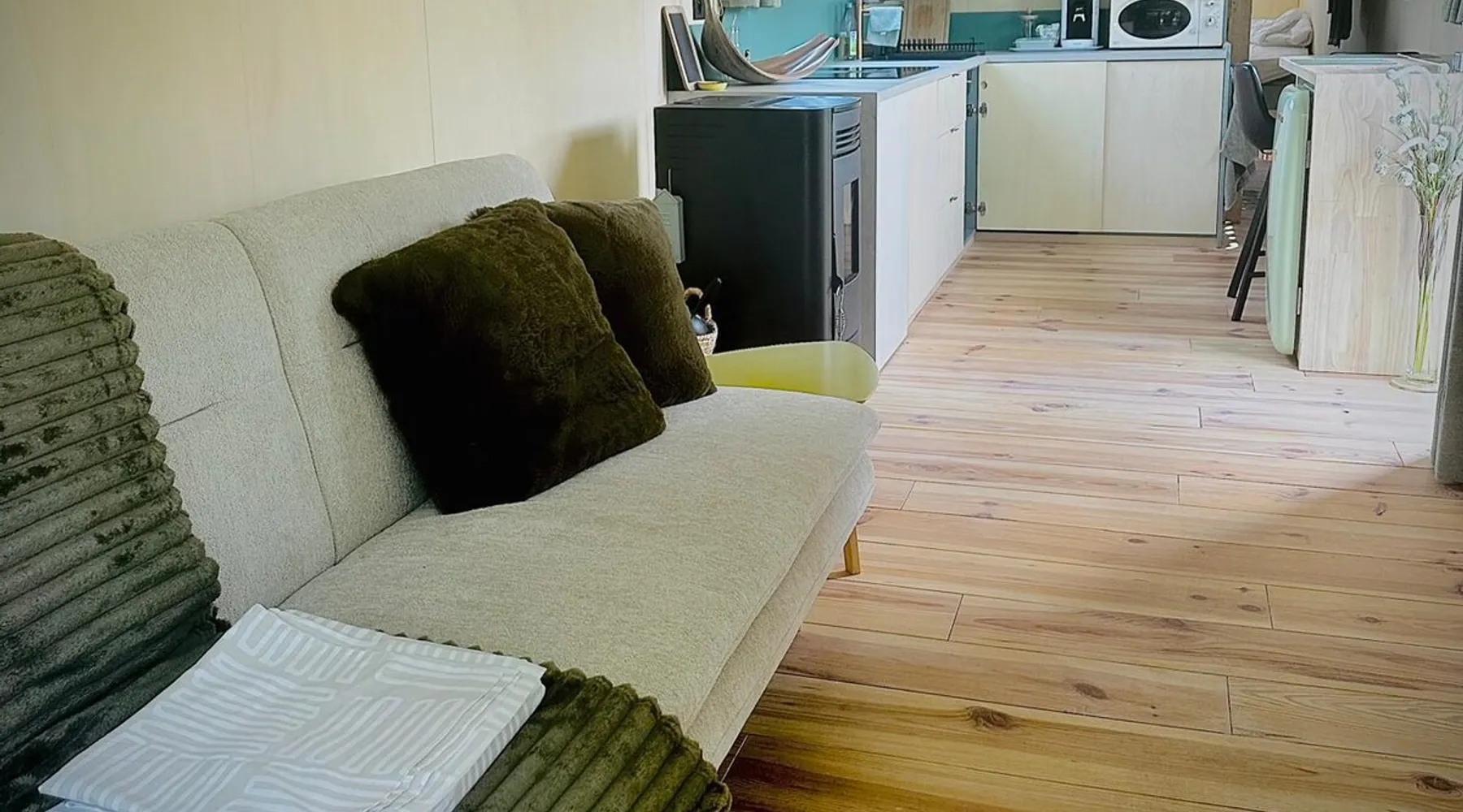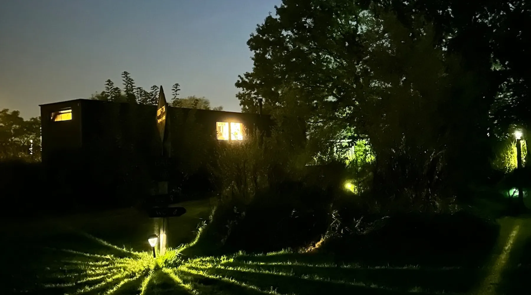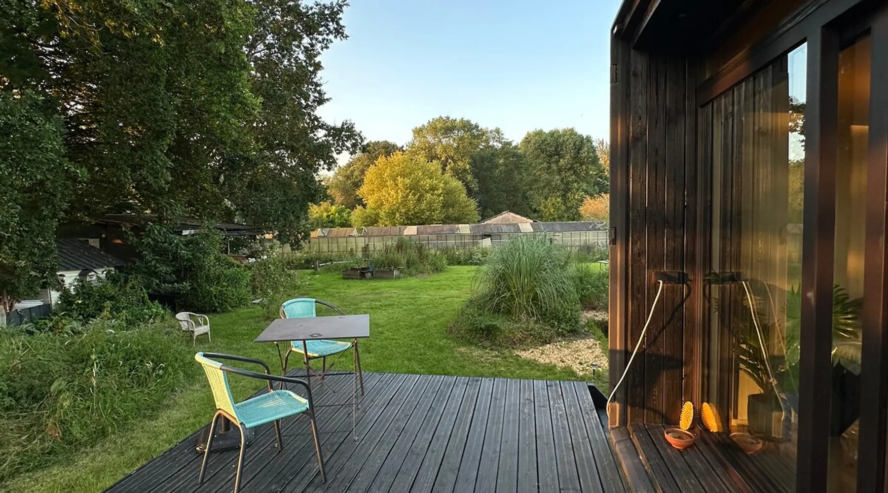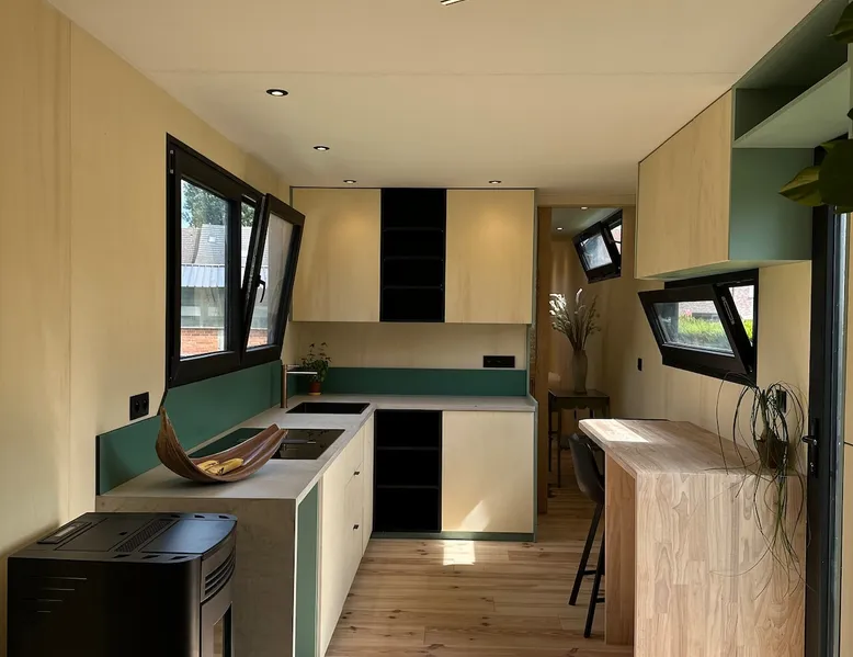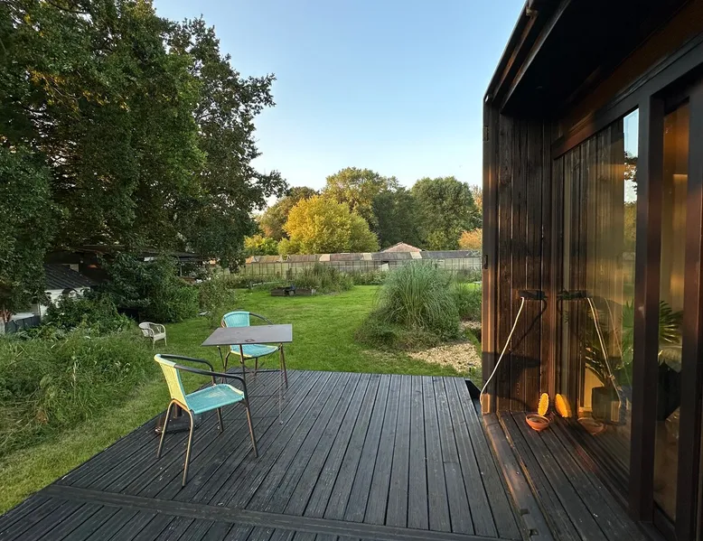 Not Tiny at all. Enjoy a romantic evening out in a natural environment in a very spacious "tinyhouse" with all the comforts. Slide by the campfire, enjoy a BBQ in the outdoor courtyard or take a refreshing dip in the pool. You are also welcome to come with children. We also have a small separate tiny house for them in the garden that can also be booked on request. Right at the station, but if you prefer not to take the train, there is plenty of parking space on the property. The space The not so tiny house can accommodate 4 people, there is a large 2 person bed and a sofa bed for 2 extra people (children) there is also an extra room in the garden 30 meters from the tiny house where 2 extra people can sleep. For this room, an extra cost of €25 per night will be charged (since there are 2 extra people). In the tiny house, all amenities are available, bathroom with shower and dry toilet, kitchen with fridge, freezer, cooking fire with integrated hood, Senseo coffee machine, etc. WiFi and TV are available. The extra room is sober and includes only a double bed and a table with chairs. In the garden, there are several resting places and loungers, a hammock, a fire bowl and a BBQ. Two ponds and a swimming pool complete the atmosphere. Guest access The entire accommodation is at your disposal Other things to note On the premises, there are 2 super sweet dogs, Ona and Odiel, who are happy to welcome you. They are super child-friendly and like to play if you want to We have an eco dry toilet in the tiny house of the brand Trobolo. A dry toilet is a compost toilet that uses no water and no chemicals. We use wood shavings instead. It is odorless and is emptied by us in time for a longer visit and after each guest.