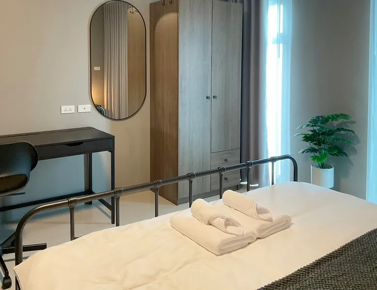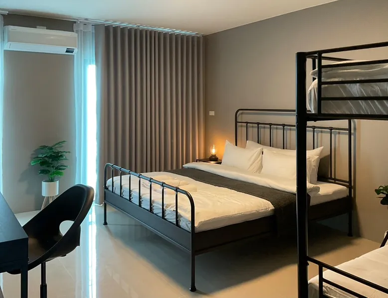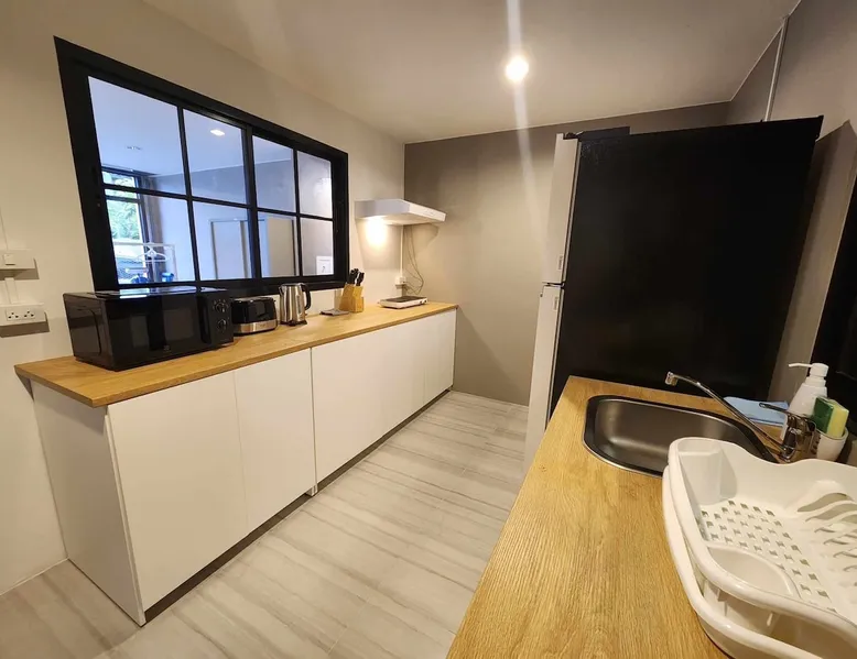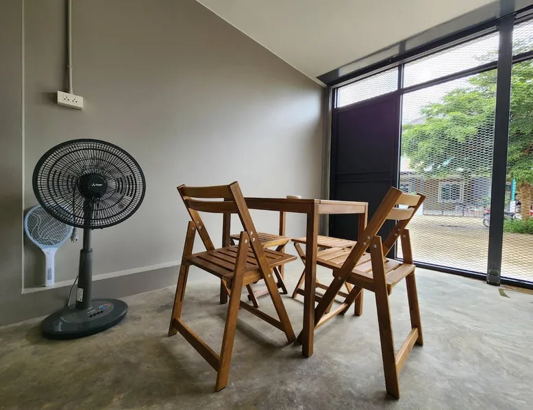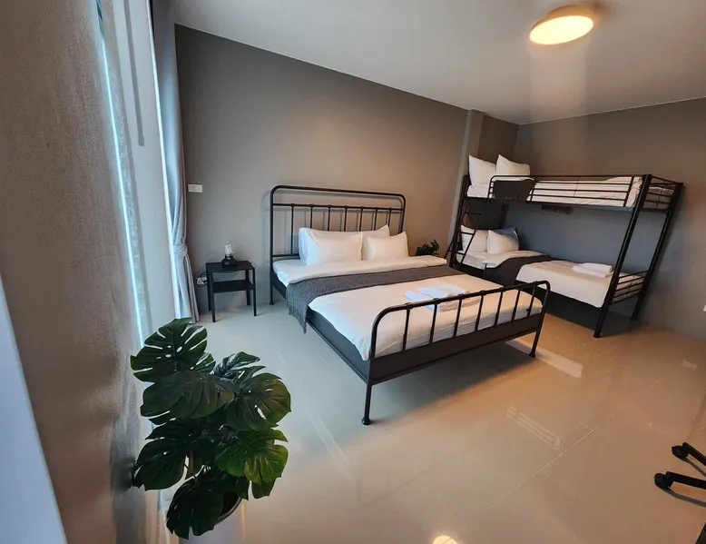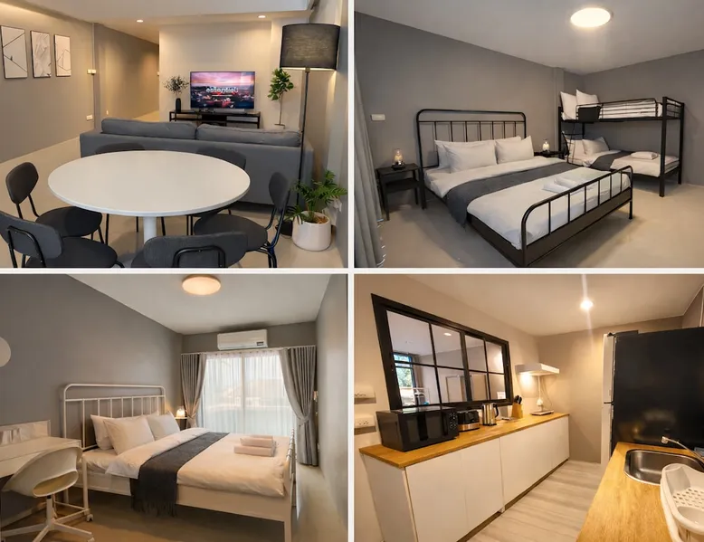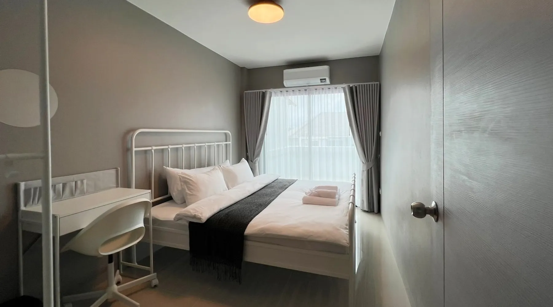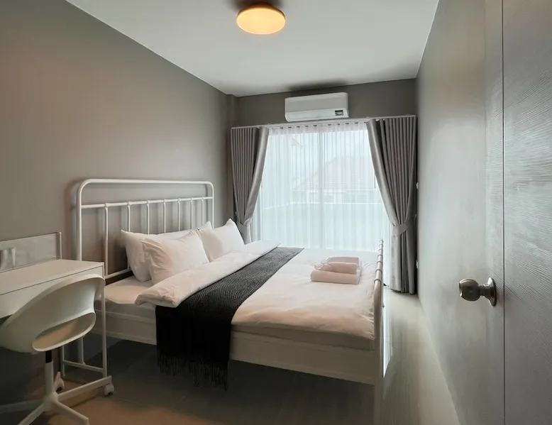* Updated on April 20, 2025: Installed a concealed polycarbonate sheet over the window glass to reduce external noise * The house is located in a location next to the airport and there is a convenience store, all kinds of food, drinks and supplies 24 hours open right next door. The house is furnished with quality furniture and design, feeling comfortable and homely. Prioritize privacy, cleanliness, and all amenities for groups of 4-6 or as a family group. You can only get to the airport or arrive from the airport to the house in 5 minutes. The distance is about 500 meters. The space The area for parking is both in front of the house and behind the house. The ground floor is an area for activities together. The dining table for 6 people and has a living room as an open space to spend time together with the whole family. The big screen smart TV connects to the internet, creating entertainment for everyone. There is a kitchen on the floor with all cooking utensils. You can cook for all members to experience the dining atmosphere like home. Behind the house is a semi open space with a set of tables and chairs for lounging. There is a breeze and natural light. The second floor area is an open space for relaxing, a display of art, and there is a bathroom, as well as a shower room, soap, shampoo, brushes, toothpaste for everyone. On the 3rd floor, 2 bedrooms are furnished with good bedding for everyone to sleep happily. 1 large room with 1 6-foot bed and 1 bunk bed with wardrobe and desk for work and makeup. In the room, 1 bedroom has 1 6-foot bed with wardrobe and desk. Both bedrooms have a balcony for fresh air and a bathroom, shower room with various appliances, hair dryer, table and iron, towels for everyone. Guest access Everything is fine in the house.