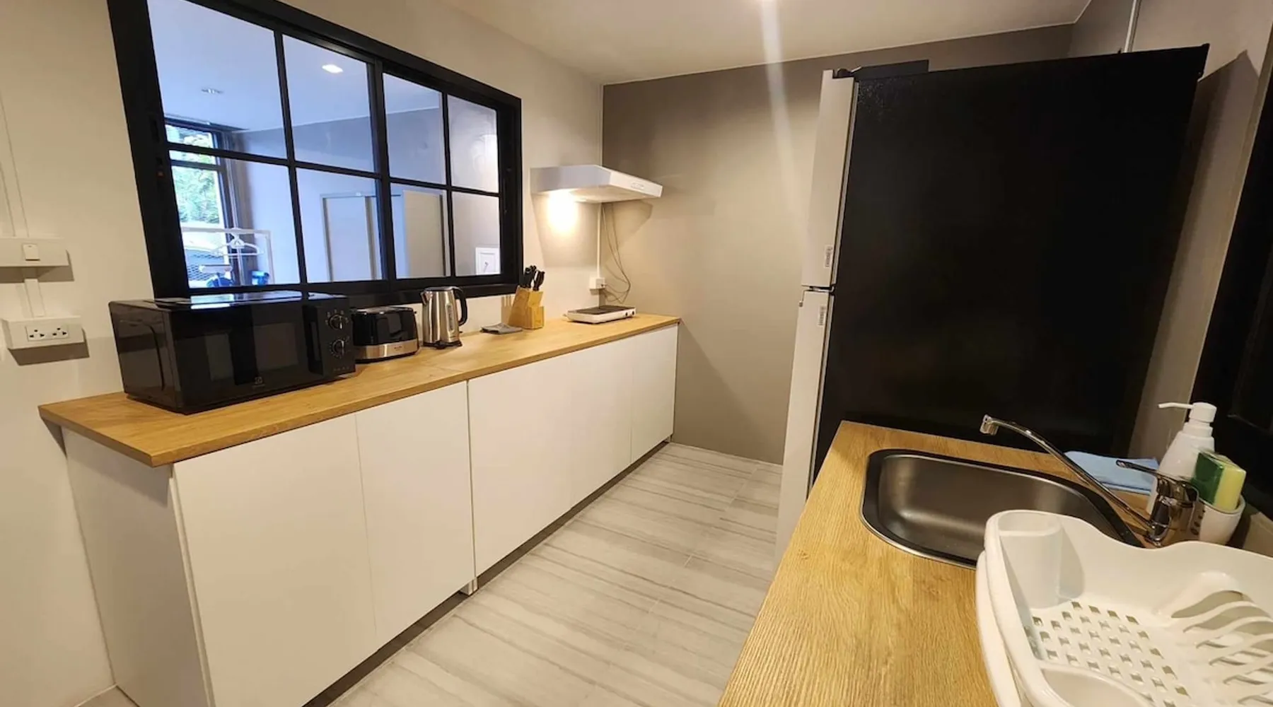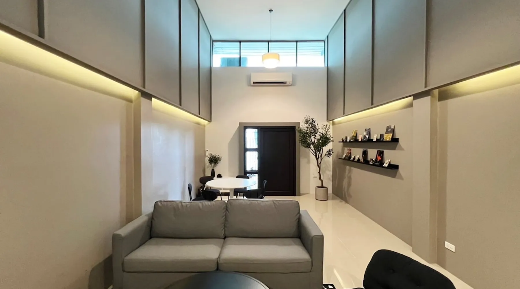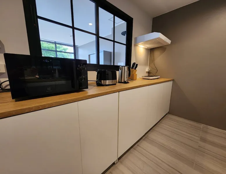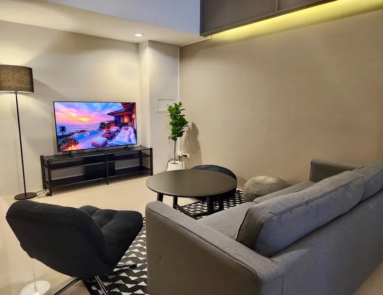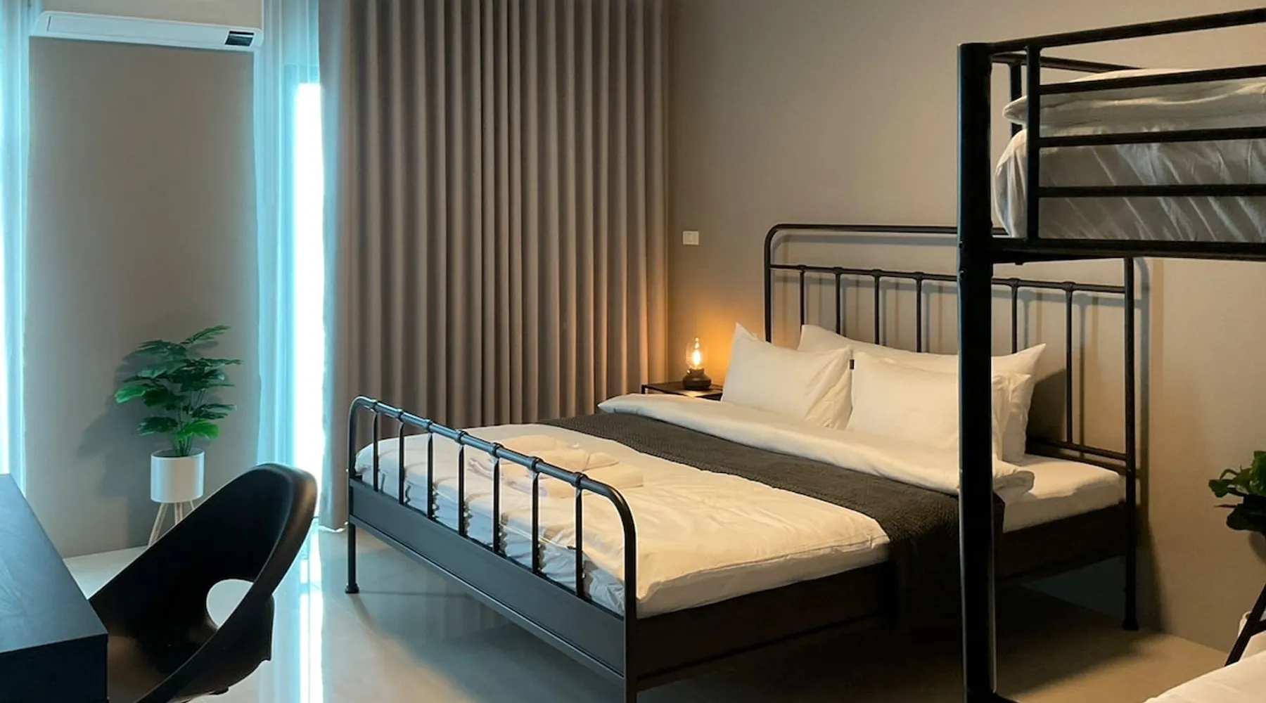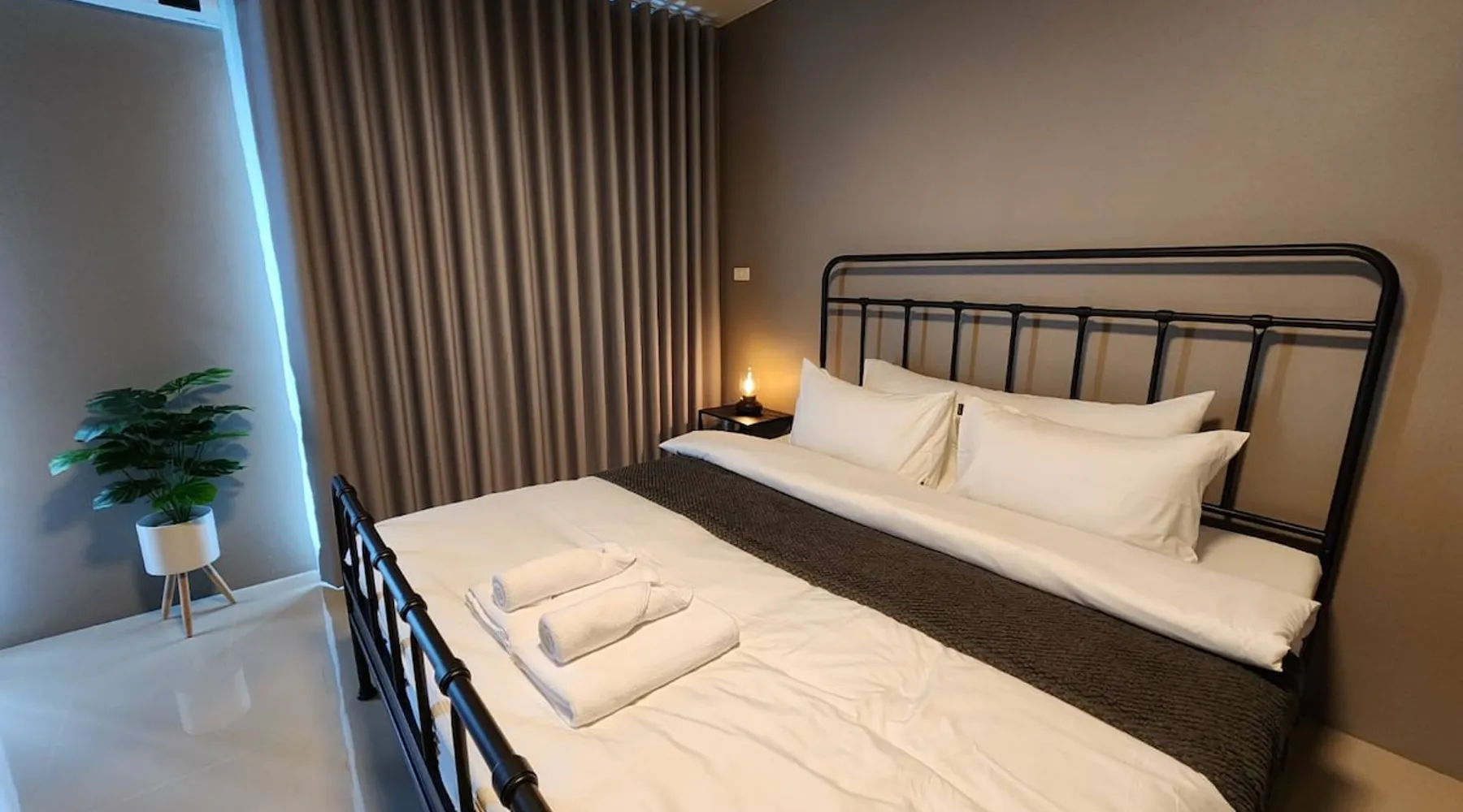 * Updated on April 20, 2025: Installed a concealed polycarbonate sheet over the window glass to reduce external noise * The house is located in a location next to the airport and there is a convenience store, all kinds of food, drinks and supplies 24 hours open right next door. The house is furnished with quality furniture and design, feeling comfortable and homely. Prioritize privacy, cleanliness, and all amenities for groups of 4-6 or as a family group. You can only get to the airport or arrive from the airport to the house in 5 minutes. The distance is about 500 meters. The space The area for parking is both in front of the house and behind the house. The ground floor is an area for activities together. The dining table for 6 people and has a living room as an open space to spend time together with the whole family. The big screen smart TV connects to the internet, creating entertainment for everyone. There is a kitchen on the floor with all cooking utensils. You can cook for all members to experience the dining atmosphere like home. Behind the house is a semi open space with a set of tables and chairs for lounging. There is a breeze and natural light. The second floor area is an open space for relaxing, a display of art, and there is a bathroom, as well as a shower room, soap, shampoo, brushes, toothpaste for everyone. On the 3rd floor, 2 bedrooms are furnished with good bedding for everyone to sleep happily. 1 large room with 1 6-foot bed and 1 bunk bed with wardrobe and desk for work and makeup. In the room, 1 bedroom has 1 6-foot bed with wardrobe and desk. Both bedrooms have a balcony for fresh air and a bathroom, shower room with various appliances, hair dryer, table and iron, towels for everyone. Guest access Everything is fine in the house.