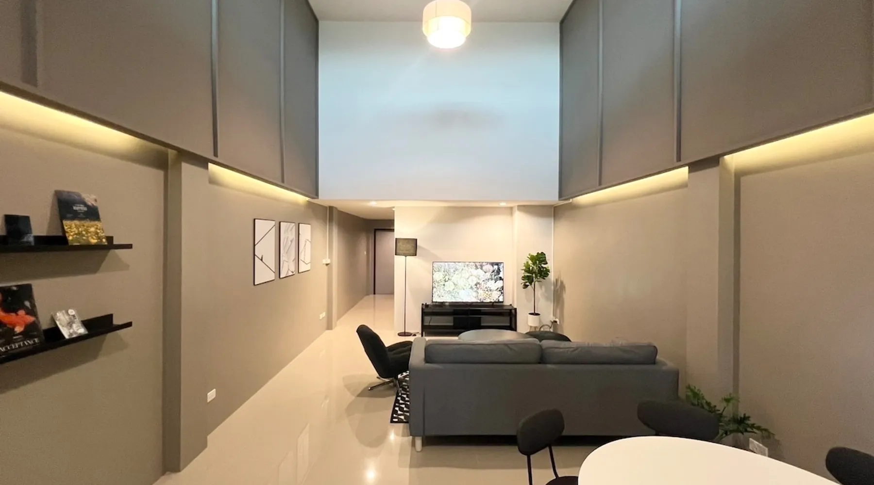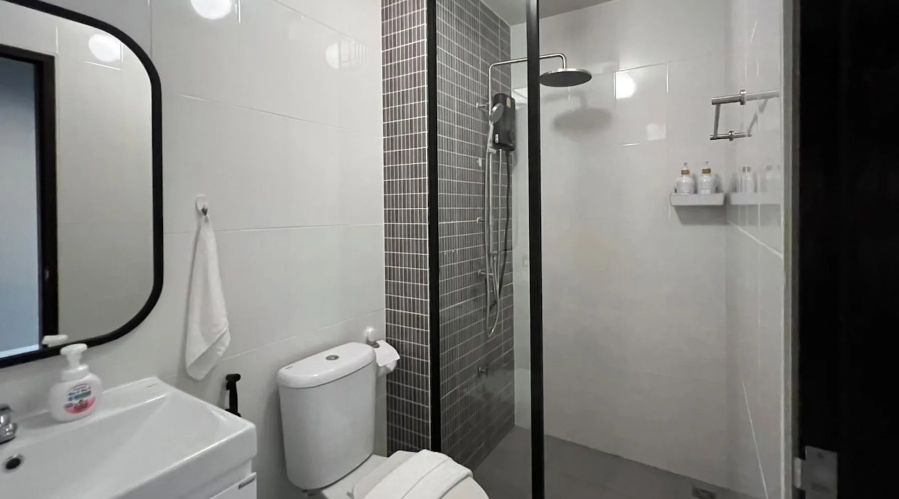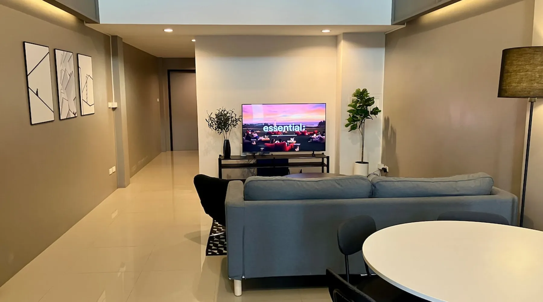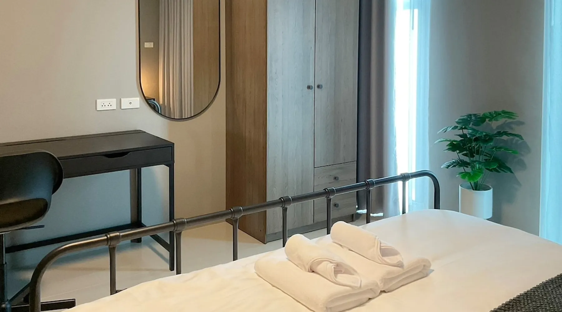 * Updated on April 20, 2025: Installed a concealed polycarbonate sheet over the window glass to reduce external noise * The house is located in a location next to the airport and there is a convenience store, all kinds of food, drinks and supplies 24 hours open right next door. The house is furnished with quality furniture and design, feeling comfortable and homely. Prioritize privacy, cleanliness, and all amenities for groups of 4-6 or as a family group. You can only get to the airport or arrive from the airport to the house in 5 minutes. The distance is about 500 meters. The space The area for parking is both in front of the house and behind the house. The ground floor is an area for activities together. The dining table for 6 people and has a living room as an open space to spend time together with the whole family. The big screen smart TV connects to the internet, creating entertainment for everyone. There is a kitchen on the floor with all cooking utensils. You can cook for all members to experience the dining atmosphere like home. Behind the house is a semi open space with a set of tables and chairs for lounging. There is a breeze and natural light. The second floor area is an open space for relaxing, a display of art, and there is a bathroom, as well as a shower room, soap, shampoo, brushes, toothpaste for everyone. On the 3rd floor, 2 bedrooms are furnished with good bedding for everyone to sleep happily. 1 large room with 1 6-foot bed and 1 bunk bed with wardrobe and desk for work and makeup. In the room, 1 bedroom has 1 6-foot bed with wardrobe and desk. Both bedrooms have a balcony for fresh air and a bathroom, shower room with various appliances, hair dryer, table and iron, towels for everyone. Guest access Everything is fine in the house.