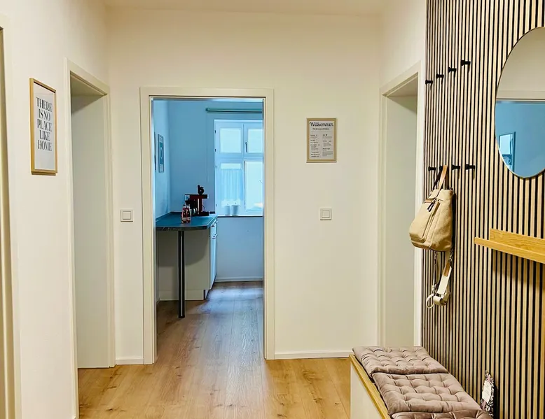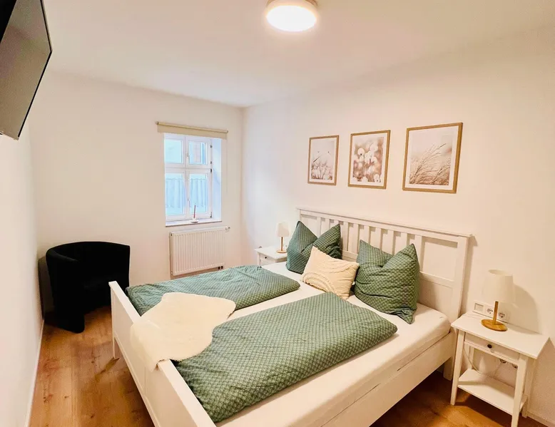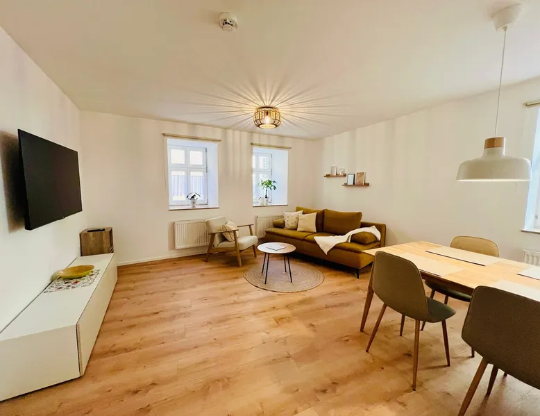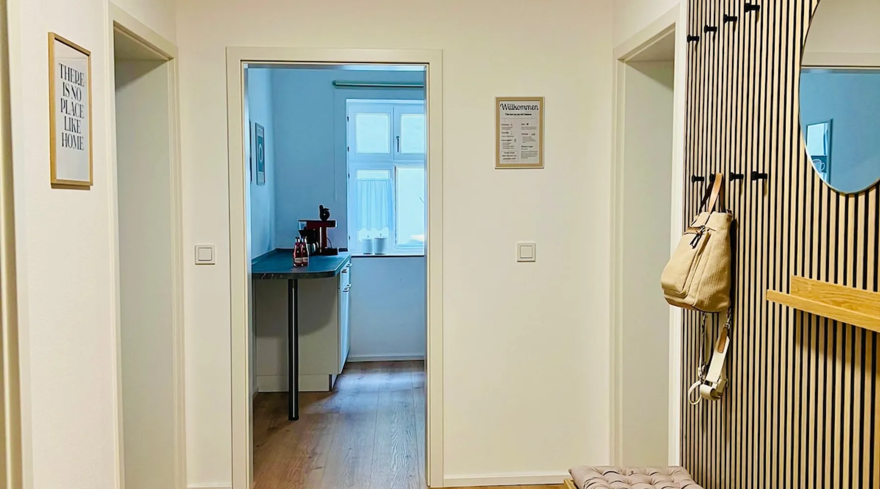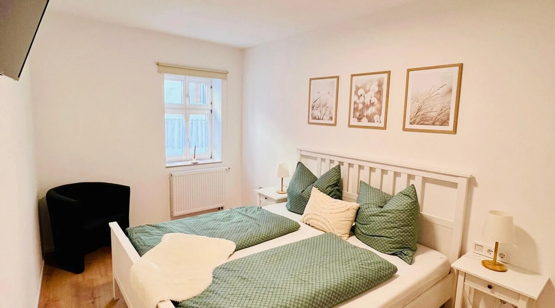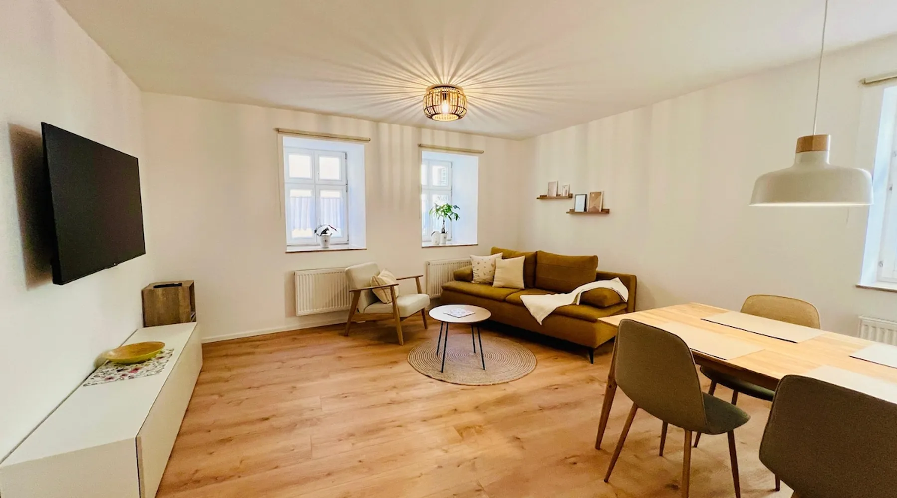 The newly renovated old town apartment is located on the first floor of an approx. 500-year-old house. You will be close to everything when you stay at this centrally-located place. The space The apartment consists of 2 bedrooms each with a double bed, a living and dining room, kitchen and bathroom. The pull-out sofa bed in the living room can accommodate another person. Thus, the apartment offers sleeping possibilities for a total of 5 people. In the wardrobes and in the cloakroom you will find plenty of storage space for your luggage. The kitchen is fully equipped with a hot plate, oven, dishwasher, fridge-freezer, kettle, toaster, coffee maker (pod and filter) and dishes. We will be happy to supply you with a high chair and cot on request.