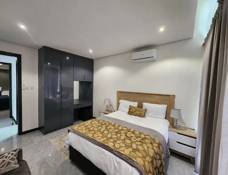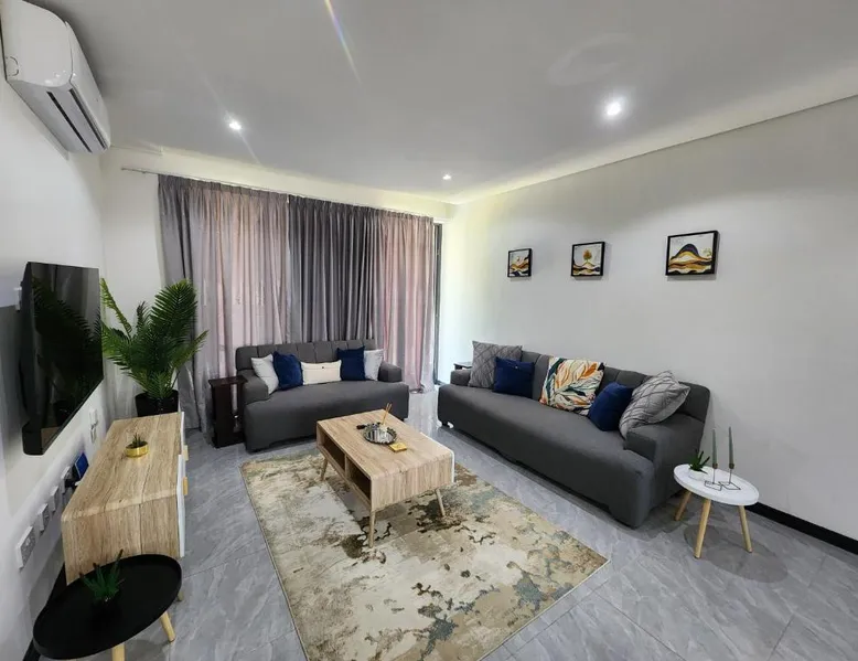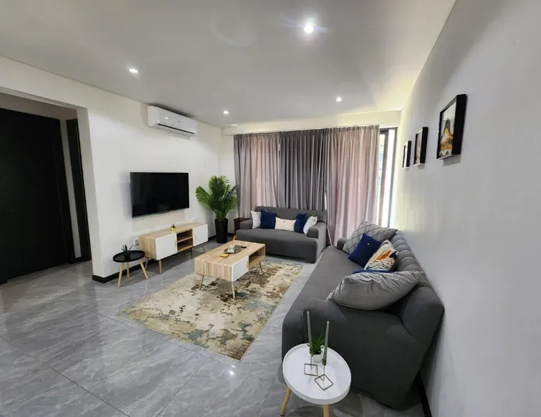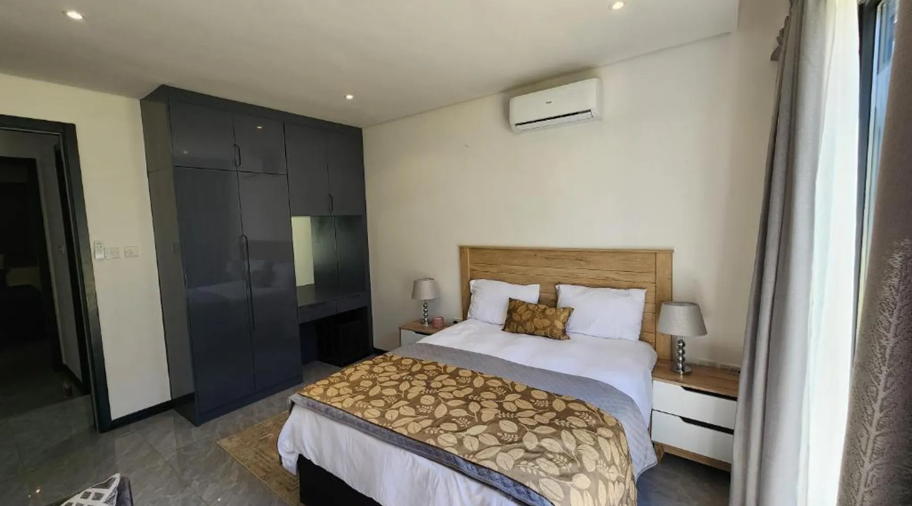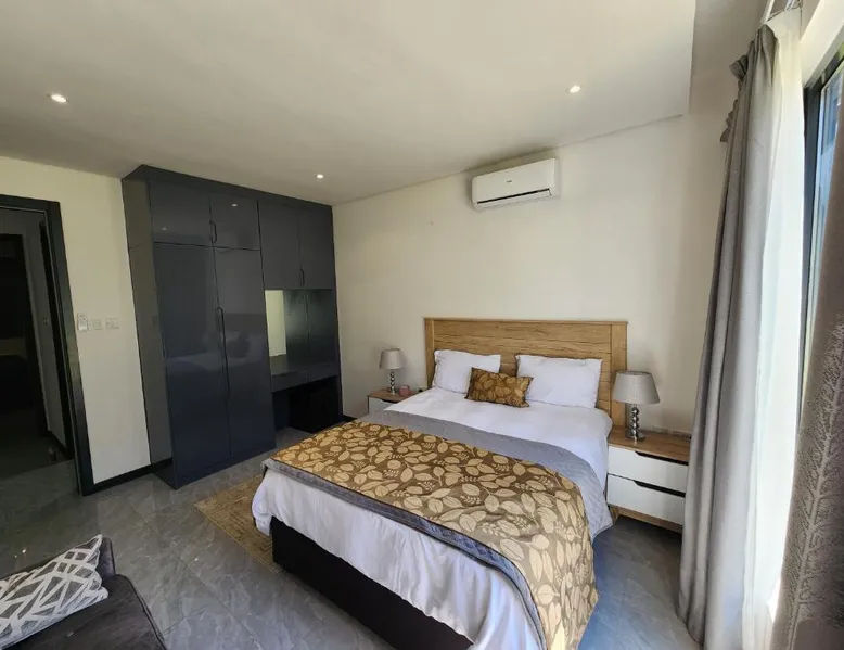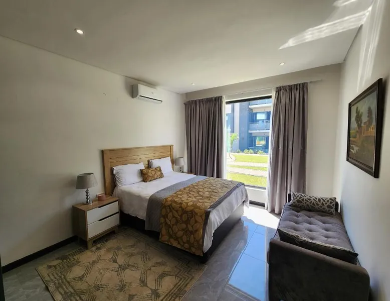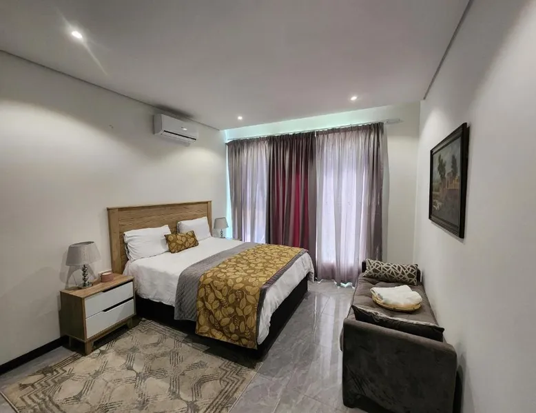 Spacious Accommodations: Starlight Haven in Gaborone offers a spacious apartment with two bedrooms and one bathroom. The ground-floor unit features a terrace, balcony, and garden views. Outdoor Amenities: Guests can enjoy a year-round outdoor swimming pool, a lush garden, and a terrace. Free WiFi is available throughout the property. Convenient Facilities: The apartment includes air-conditioning, a fully equipped kitchen, and a private pool. Additional amenities include a children's playground, outdoor play area, and free on-site private parking. Nearby Attractions: Sir Seretse Khama International Airport is 4.3 mi away. Points of interest such as Phakalane Golf Club and the National Museum and Art Gallery are within 6.2 mi. The private pool is a top feature of this apartment. The fully equipped kitchen has a stovetop, a refrigerator, kitchenware and an oven. The spacious air-conditioned apartment features a flat-screen TV with streaming services, a tea and coffee maker, a seating area, a dining area as well as garden views. The unit has 3 beds.