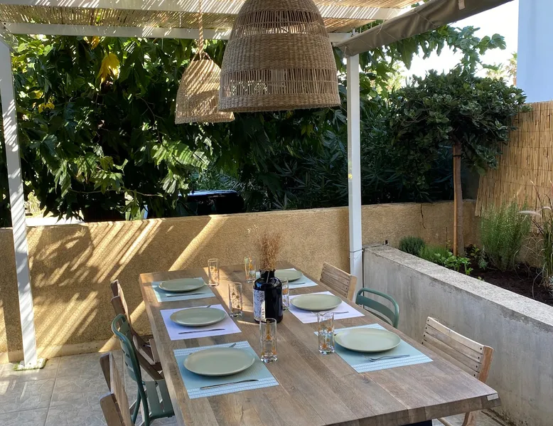 Air-conditioned apartment on the ground floor - 75 m2 private residence with secure parking (1 reserved space) 30 minutes from the airport, 4 km from Bastia and 100 m from the beach. Close to shops (bakery, pharmacy, grocery, restaurant) and bus stop 2 min. 2 terraces (60 m² and 15 m²), living room, equipped kitchen, bathroom, 2 bedrooms (3 beds), laundry room. Bed linen as well as towels are provided . Baby equipment available. The space Every room has a 160x200 bed The largest room has a 1-person click-clack chair in addition to the double bed Guest access Self check-in possible Other things to note Someone on site is available if you need anything