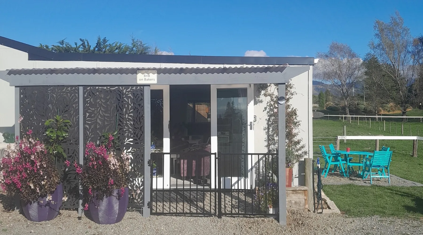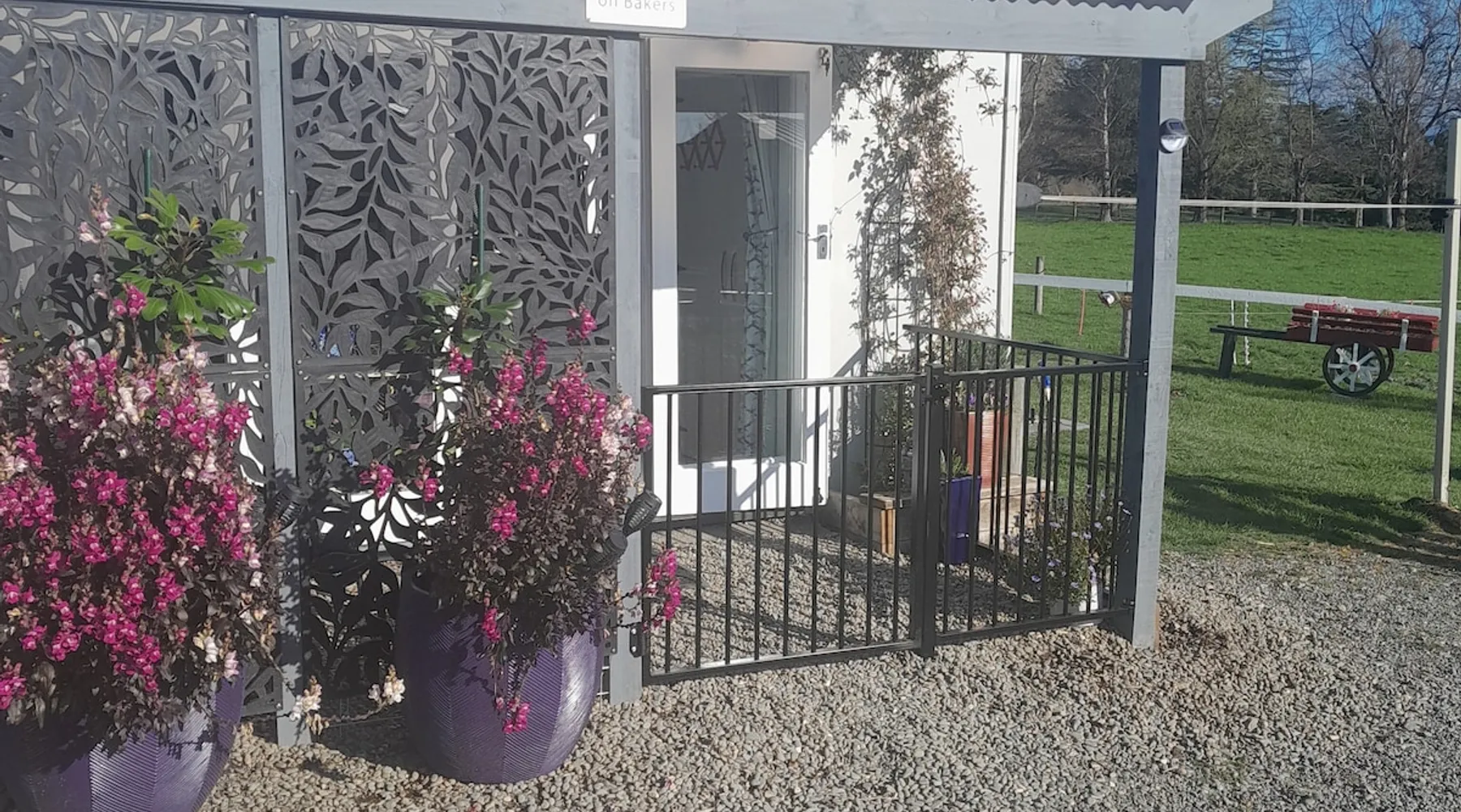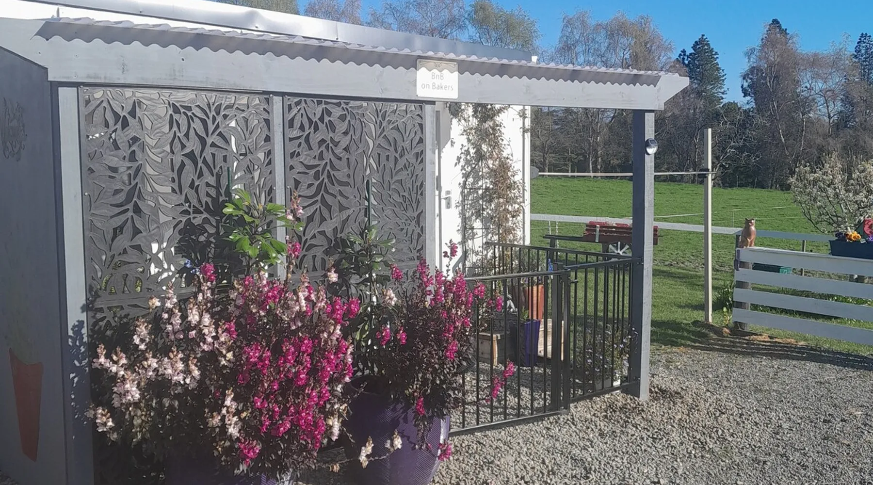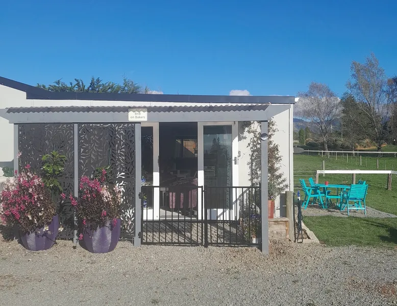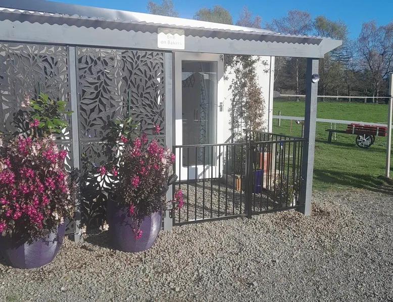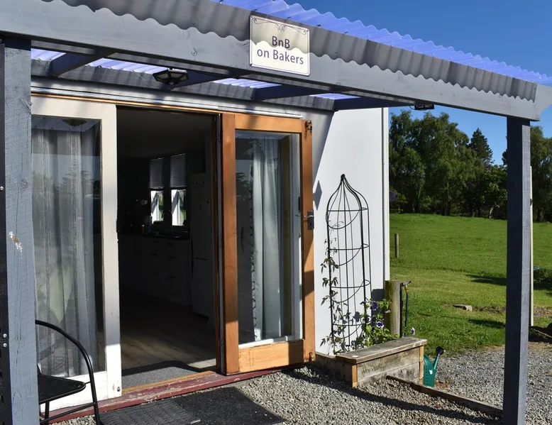 BnB on Bakers proudly offer you our fully self contained Unit, tastefully decorated. With Guests commenting that they feel "at home" the moment they walk in the door. Offering a spacious Living Kitchen Dining Area, a very large Master Bedroom and ensuite. Continental Breakfast included along with tea coffee and also a few treats. Everything you need to enjoy your stay is provided. A place where you can relax. Wonderful friendly Waimate where everywhere you go you will be greeted with a Smile. The space We have 4 acres adjoining The Waimate Golf Course, therefore we have no direct neighbours, creating a peaceful rural setting. Yet only a 3 minute drive to the centre of our wonderful little town. Wake up to Birdsong and amazing sun rises. We also live on the property but the large parking area creates space and privacy between the BnB and our home. Amble parking and turning space Guest access Clearly defined areas. We have 2 small dogs on the property who are in a fenced off area. We also have 2 cows and many electric fences. Other things to note We can provide undercover parking for Motorbikes if required. We also have a paddock available that can be used for horses. Other pets please message us first.