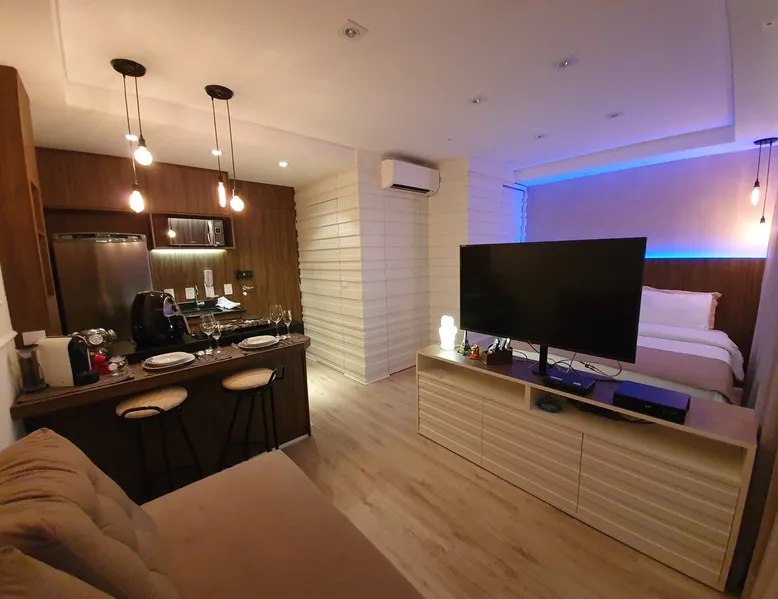 High Floor (15th), facing shade, amazing view of JK Avenue. 33 m² flat, with 1 bedroom, 1 living room, 1 bathroom, 1 kitchen, 1 balcony. Living room, bedroom and kitchen are combined with a separate area for the bathroom. Large glazed balcony with curtain. 2-seat table, Home Office space for the day and bar for the night, with a privileged view of the city. It has the virtual assistant Alexa for basic and music. Designed and planned to accommodate up to 2 people comfortably in a Queen Size bed. The space - 250 Mega Wifi Internet with exclusive router and wired for TV; - 43" LED Smart TV available Spotify, NetFlix, Amazon Prime, Globo Play (You will need to have your own password for access); - Basic TV Programming (Open Channels Only) - Climatized Cellar *(Does not provide Beverages)* - Alexa for ambient sound included Amazon Unlimited plan (unlimited access to a variety of styles without advertising) - Nespresso coffee maker with capsules (Limited quantity per person/daily of 1 capsule); - Aeroccino (Milk Frother) - Nespresso Accessory - Teas (Limited quantity per person/day); - Electric kettle - Air-Conditioning Inverter 18,000 Thousand Btu, Cold Only - Silent. - Complete Kitchen (Mini Oven and 2-burner stove, both electric and countertop/Blender/Fridge with Freezer /Microwave/AirFryer oil-free fryer) and Natural Water Purifier - Sandwich maker - Electric Fondue Set - Kitchenware (Cutlery/Pots/Dishes/Glasses/Cups/Wine Glasses/Wine Opener and Ice Bucket/Wine Decanter) - 5-piece cookware set with preparation utensils; - Basic seasonings (Oil, Salt, Pepper, Sugar and Olive Oil) - American towel set; - **Queen Size** bed with pocket springs; - 200-thread count percale bed linens; - Queen Size Duvet - King-size Microfiber Blanket; - Face and Body Towels - 100% BlackOut Curtains - Clothes Iron - Hair dryer - Floor clothesline - Vertical Vacuum Cleaner - First-aid basics - Personal Hygiene Basics (Liquid soap, mouthwash and dental floss) Guest access The complex on the ground floor offers a food mall with a Cafeteria, Japanese Restaurant, Italian Cantina and SteakHouse. It has a free covered parking space, 24-hour Concierge, Security Cameras, 4 Elevators, Lobby, 24-hour Community Laundry. Visits/access by third parties to the property will be **PROHIBITED**. Other things to note - Temporary guests **CANNOT** use the common areas, such as the swimming pool, sauna, Jacuzzi, barbecue area, fitness center, and the like. These areas are for the exclusive use of residents. - Not recommended for those with height problems. The property is located on the 15th floor. - We do not accept pets in the apartment as a rule, but the complex allows the circulation of PETS in the social areas by other guests or residents (pet friendly).