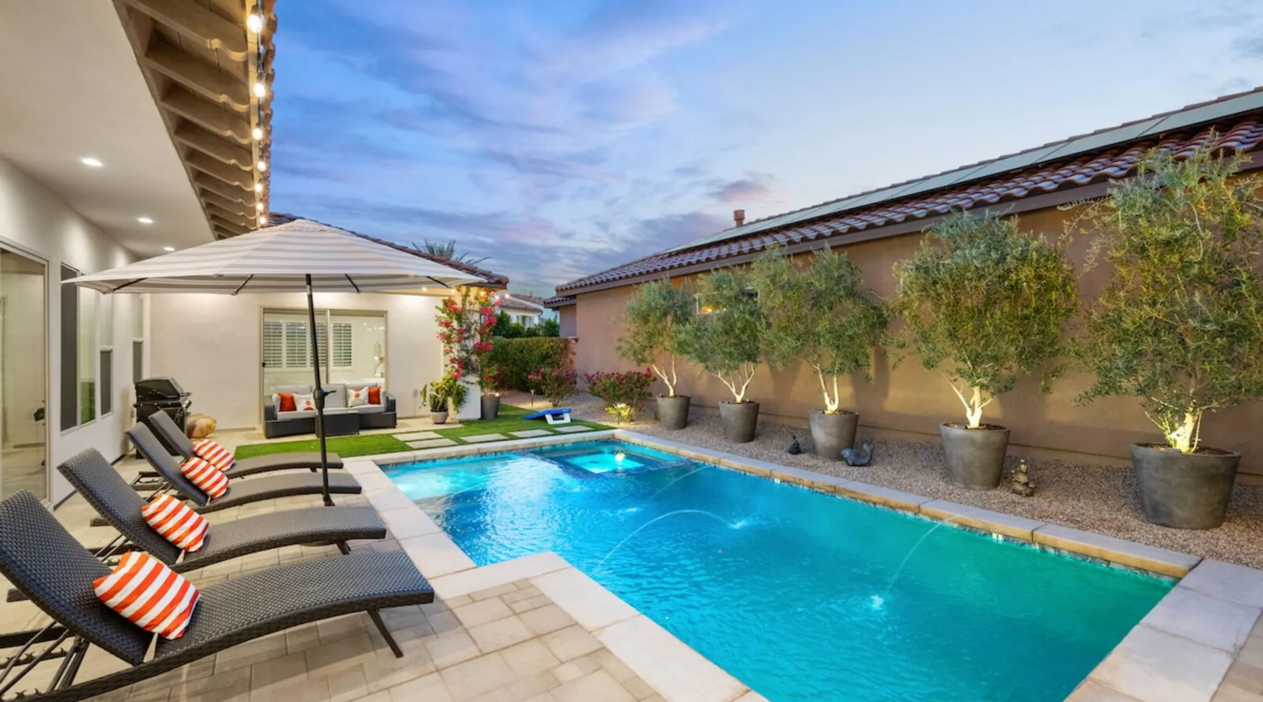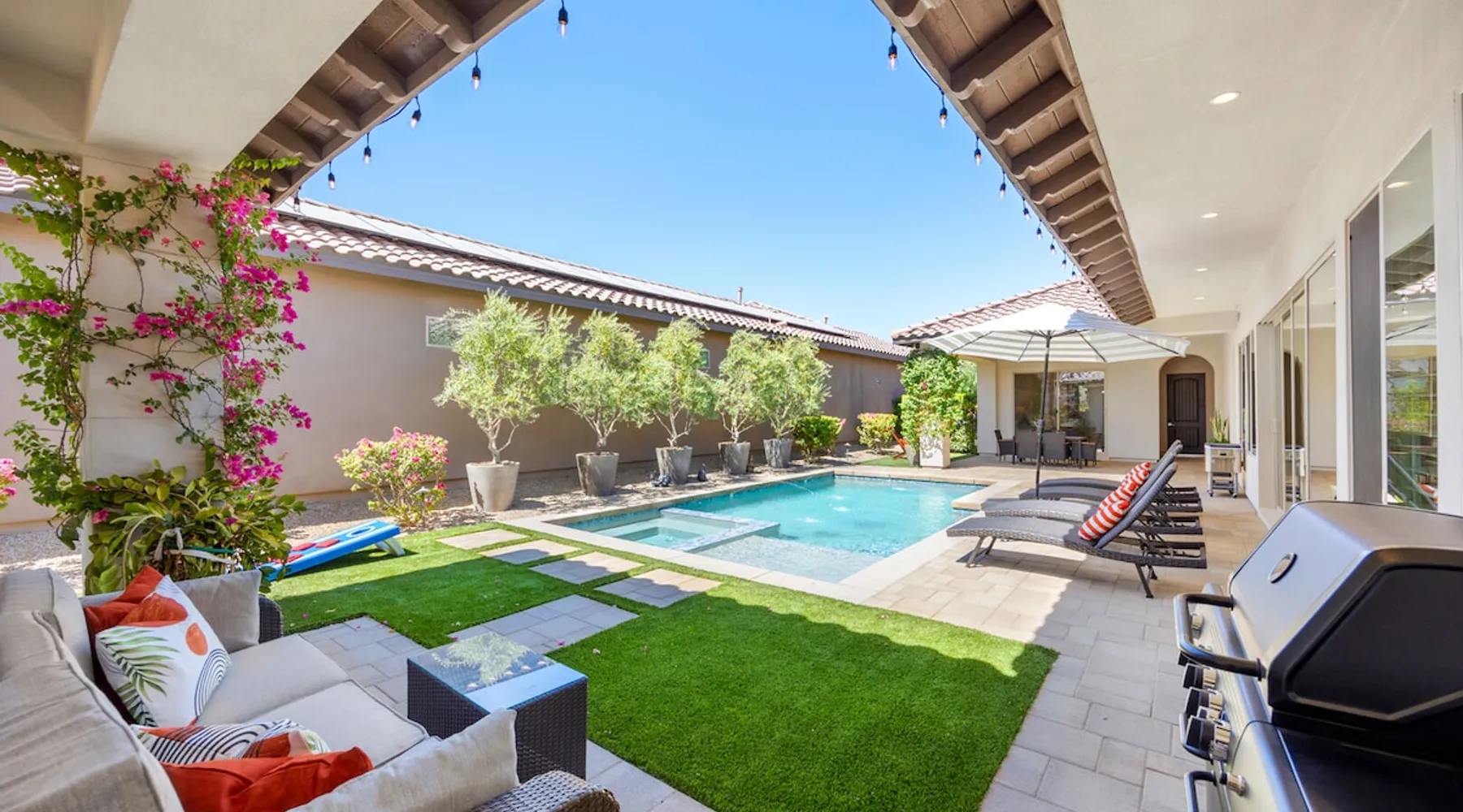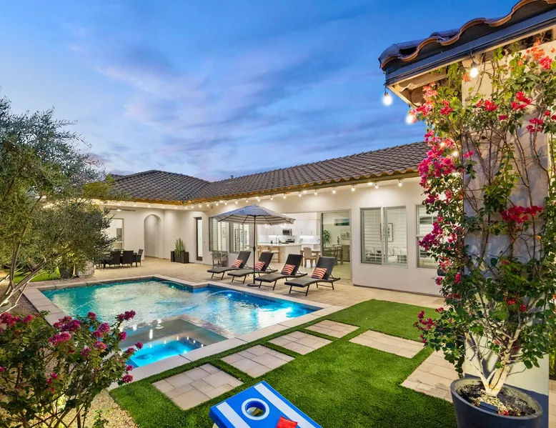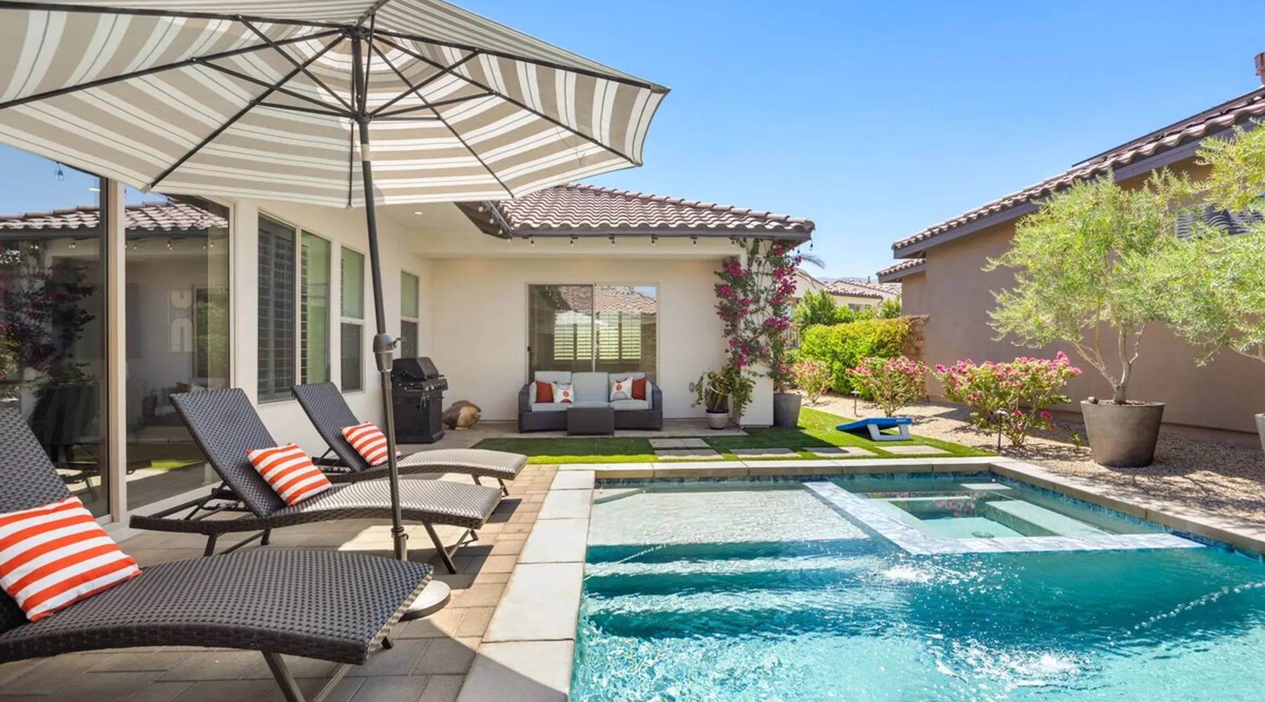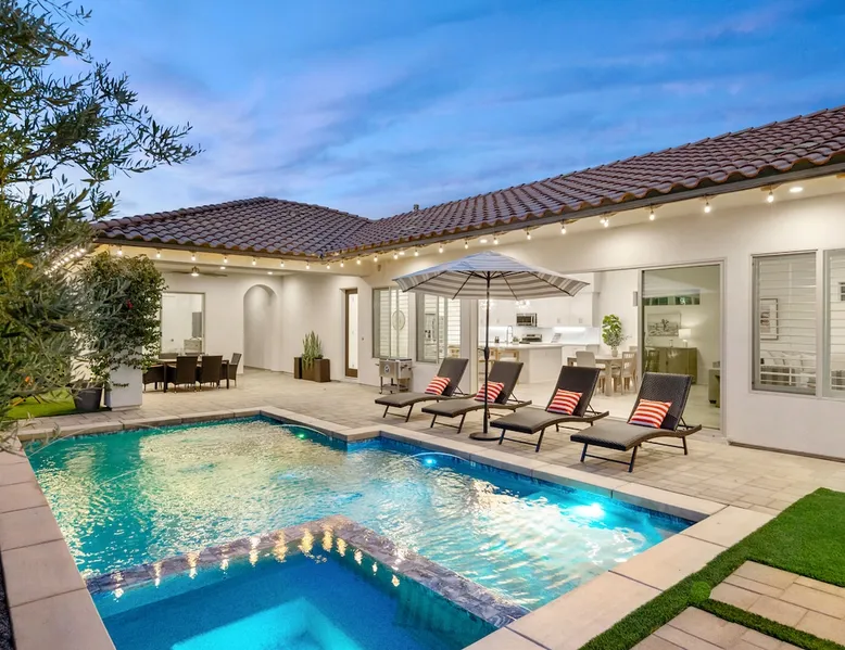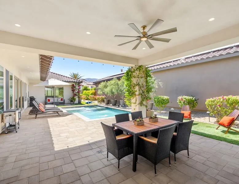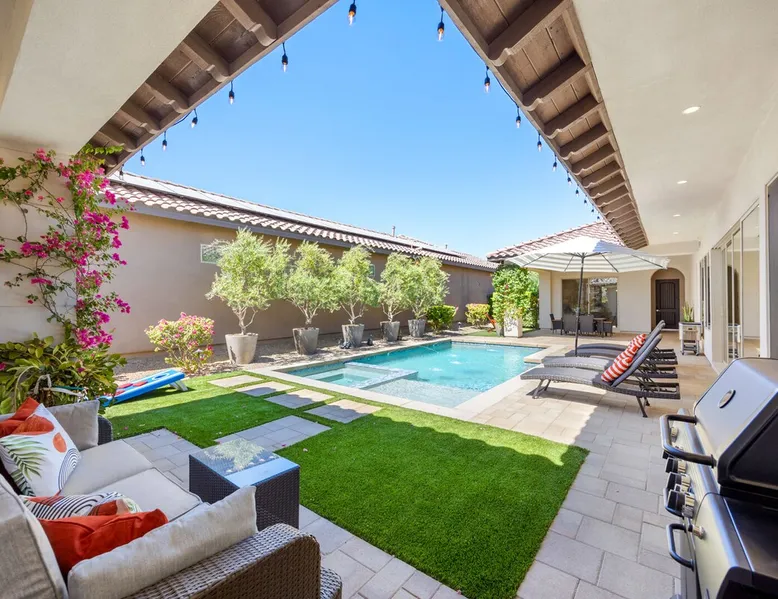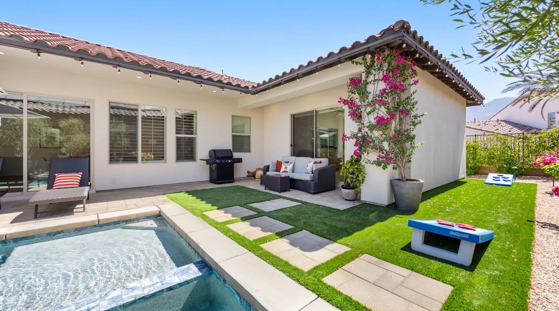 - Welcome to your luxurious 2,260 sq. ft. retreat located in the privately guarded Signature at PGA West community! - Each of the three spacious bedrooms (including casita) comes with its own full bath, offering privacy and comfort for every guest. - Enjoy a private oasis with a pool, spa, and loungers with cabana-style pillows. - Enjoy al fresco dining with BBQ and seating under party lights. - Book now and experience this luxury retreat with your family! The space Book your stay at this incredible Signature PGA West vacation home today and experience the ultimate in relaxation, luxury, and outdoor living…. VARE style. BEDROOMS/SLEEPING ARRANGEMENTS: ✔ Master Suite: King Bed, 65" 4K Smart TV, Ceiling Fan, Large Walk-In Closet, Ensuite Bathroom & Backyard Access ✔ Suite 2: Queen bed, 70" 4K Smart TV, Ceiling Fan, Ensuite Bathroom ✔ Casita Suite 3: King Bed, 65" 4K Smart TV, Ensuite Bathroom * Queen Air Mattress (available upon request) LIVING ROOM: ✔ 75" 4K Smart TV ✔ Comfortable Sofas ✔ Natural Light ✔ Spacious & Modern ✔ Glass Sliding Doors directly to pool KITCHEN & DINING: ✔ Keurig Coffee Maker ✔ High-End Stainless Steel Appliances ✔ Indoor Dining Table for 8 ✔ Bar-Height Seating for 4 POOL & BACKYARD: ✔ Private Pool & Hot Tub ✔ Tanning Shelf ✔ Natural Gas BBQ Grill ✔ Sun Loungers (4) + Large Umbrella ✔ Outdoor Party Lights ✔ Outdoor Dining Table for 6 ✔ Patio Seating area ✔ Cornhole Game ✔ 8-blade Ceiling Fan Under Cover Patio ✔ Tommy Bahama Rolling Party Cooler ** Hot tub is complimentary; optional pool heating is $65/day to 84°F (Oct–May), with summer temps naturally 85–95°F (no heating required)** OTHER AMENITIES: ✔ Free high-speed Wi-Fi ✔ Pack & Play (available upon request) ✔ Full-sized washer/dryer PARKING: ✔ 2 car garage with up to 4 cars total between the driveway/garage ✔ EV Charger Inside Garage COMMUNITY SPACE: ✔ Gym ✔ Heated Pool ✔ Jacuzzi ✔ Shuffleboard ✔ Bocce Ball ✔ Sun Loungers ✔ BBQ Grill ✔ Outdoor dining area ✔ Dog park INCLUDED WITH YOUR VACATION HOME: The property will be stocked with an initial supply of trash bags, paper towels, kitchen sponges, hand soap, dish soap, and toilet paper. The property is equipped with a specific quantity of bath and pool towels to accommodate the max occupancy of the home. The bathrooms are stocked with shampoo and conditioner. There are also fully equipped laundry rooms with a washer, dryer, and iron. THE FOLLOWING IS NOT INCLUDED: cooking oil, sprays, foil, plastic wrap or other cooking ingredients. Signature at PGA WEST is a guarded gated community, and your group will be provided access for your stay. Located a few minutes from the private residence is access to the community clubhouse, which includes a resort-style pool, hot tub, outdoor living/BBQ area, gym fitness center, and shuffleboard. The community pool & hot tub are heated from October to May. ✔ Shuffleboard ✔ Shared Gym ✔ Shared Pool We are minutes from PGA West with five public courses to choose from, as well as SilverRock Resort, an Arnold Palmer Classic Course, another terrific local option. In January, you can walk to the Stadium course to watch the pros play in The American Express Golf Tournament. Tennis fans - in March, you'll be minutes away from the 5th largest tennis tournament in the world, the BNP Paribas Open in Indian Wells, which draws the top-rated men and women tennis players in the world. Tennis and pickleball players - the Fritz Burns park is 10 minutes away with 6 tennis courts and 8 pickleball courts lit and open from Dawn until 10 pm. Coachella and Stagecoach Music Festivals are the main attractions in April, both taking place at the famous Empire Polo Grounds. Close by is the famous El Paseo and Old Town La Quinta areas with excellent dining and shopping options. Ralph’s is the closest supermarket, about 5 minutes away, and Trader Joe's is also nearby. Highway 111 is the home to Costco, Target, Coffee Bean, and Starbucks, among many local favorite restaurants and shopping. Less than 10 minutes from the I-10, you can quickly head to Palm Springs, nearby casinos, Joshua Tree National Park, and other Coachella Valley destinations. ESTIMATED DISTANCES FROM PGA WEST - Jack Nicholas & Stadium PGA West golf courses: 1 min - Ernie’s Bar & Grill (PGA West 19th hole): 1 min - Old Town La Quinta: 5-7 mins - PGA West Greg Norman Course: 10 mins - SilverRock Resort Golf Course: 10 mins - Empire Polo Fields (home to Coachella & Stagecoach music festivals): 10 mins - BNP Paribas Open / Indian Wells Tennis Garden: 10-15 mins - PGA West Dunes Course: 15 mins - PGA West Pete Dye Mountain Course: 15 mins - Palm Desert/El Paseo: 15-20 mins - Acrisure Arena: 25 mins - Downtown Palm Springs/Airport: 35 mins - Joshua Tree National Park: 45 mins - LA/OC/SD: Roughly 2 hours without traffic - FREQUENTLY ASKED QUESTIONS - WHAT TIME IS CHECK-IN AND CHECK-OUT? Check-in time is 4 p.m. and check-out is at 11 a.m. Early check-in and late check-out may be available for your reservation. WILL I NEED TO MEET THE PROPERTY MANAGER TO GET A KEY? Our homes are keyless entry, we issue a “code” rather than a physical key. The code changes for every reservation so it is an incredibly safe alternative. Issuing the code before arrival makes the check-in process much easier. WHAT ARE THE COMMUNITY CLUB & POOL HOURS? ARE THEY HEATED? Clubhouse hours: 5:30 am – 10 pm. The community pool & hot tub are heated from October to May. DO YOU ALLOW PETS? Certain non-shedding hypoallergenic dogs will be considered at an additional fee. Service animals are permitted, and the fee is waived for such situations (however the animal is never permitted to be in the unit alone if it is a service animal). Please note we do not allow any pets other than dogs. Signature PGA West Community Rules: 1) The City of La Quinta & Signature PGA West has a quiet hour ordinance (10 pm – 8 am). 2) No more than 2 vehicles per h