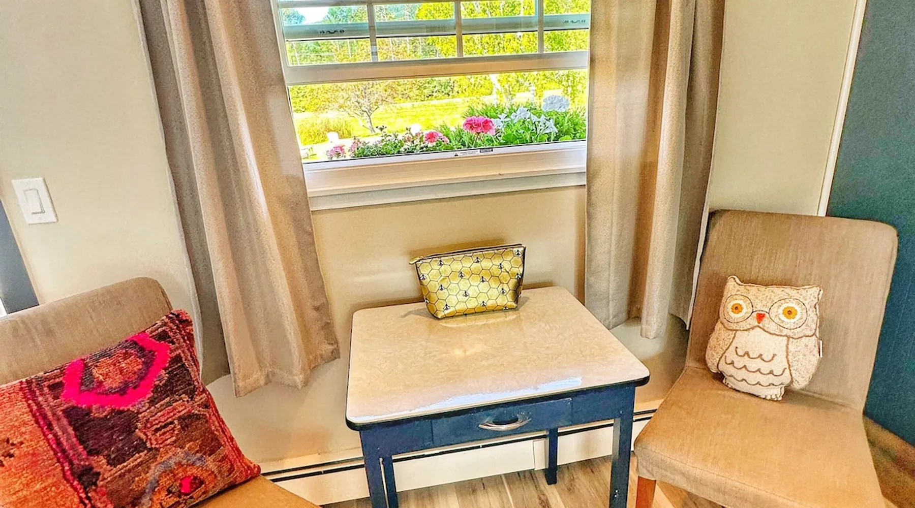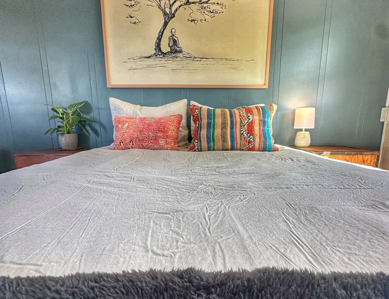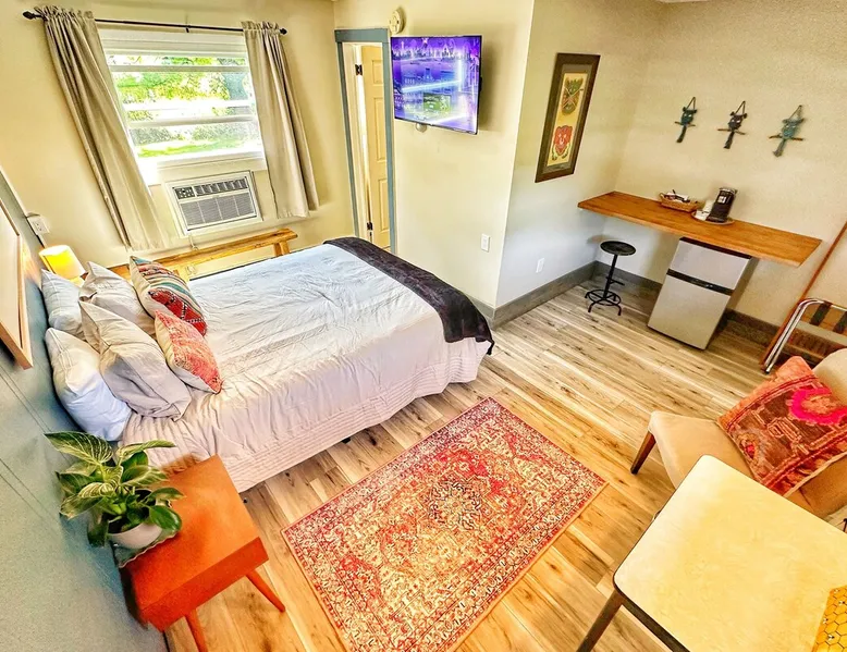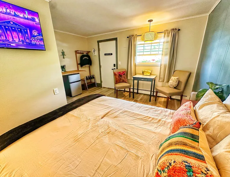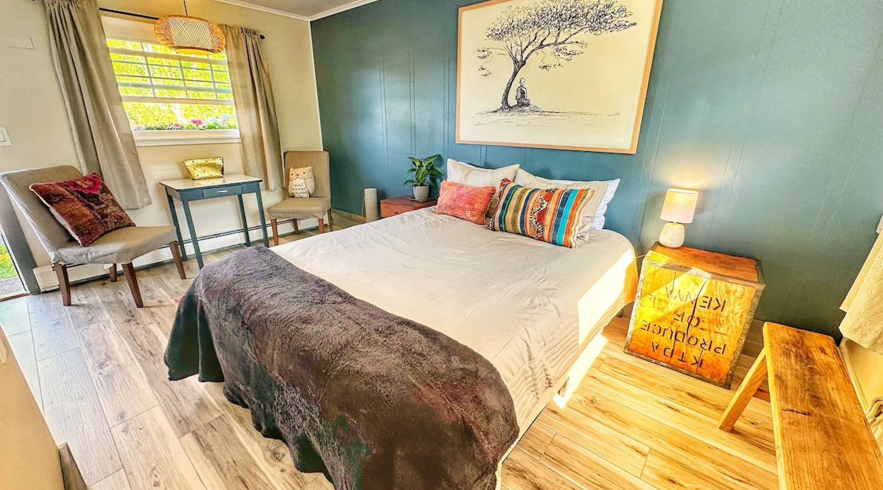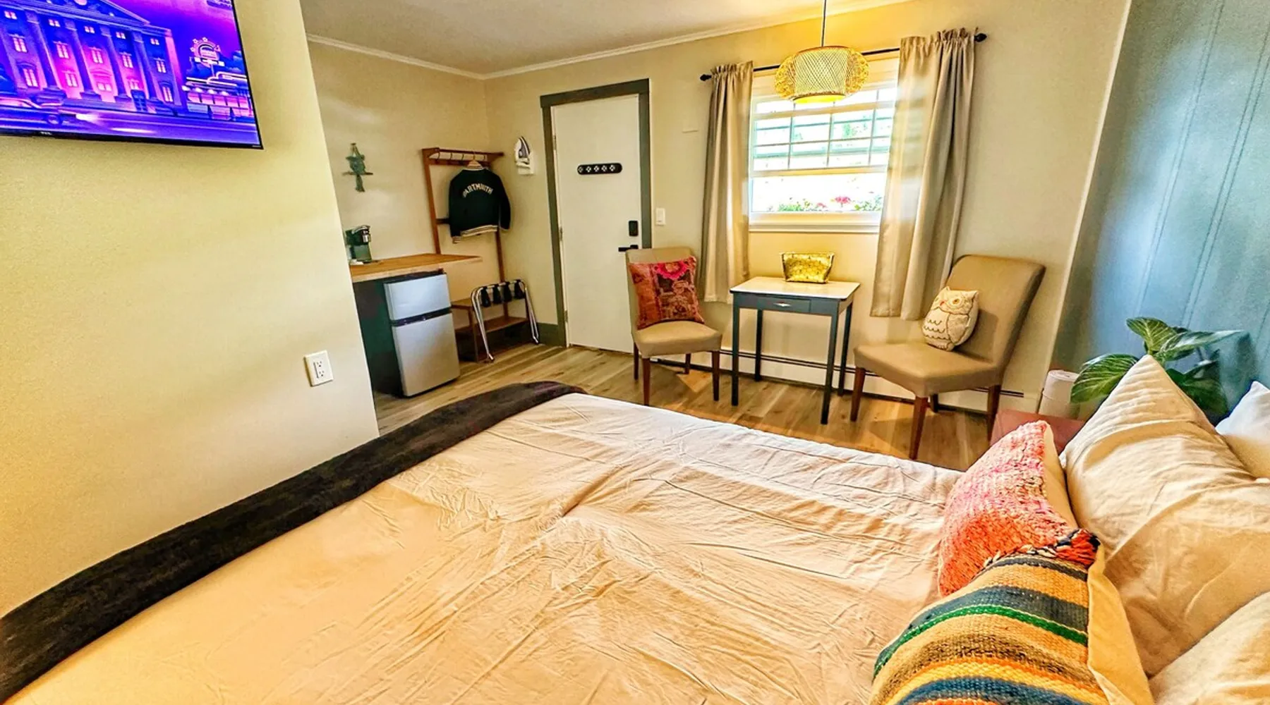 Zen 10 is your relaxing retreat in the heart of Vermont, with a cozy queen bed. The room decor is Vermont vintage, sourced locally with a story to tell. The room features a small kitchenette area with a coffee maker, mini-fridge, and a workspace. It's the perfect spot to unwind and find inner peace on your next Green Mountain State adventure! Zen 10 is located at our solar-powered property, just 15 minutes to Bromley, 30 minutes to Magic Mountain and 45 minutes to Stratton Mountain.