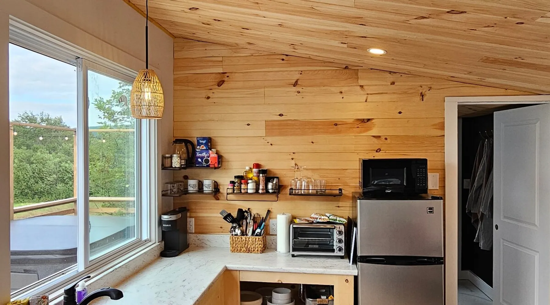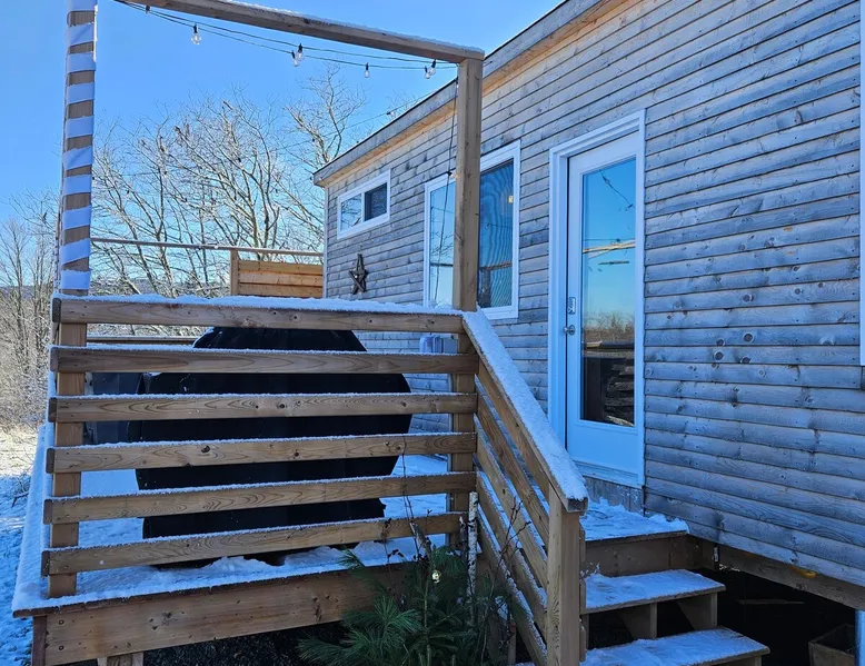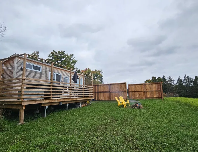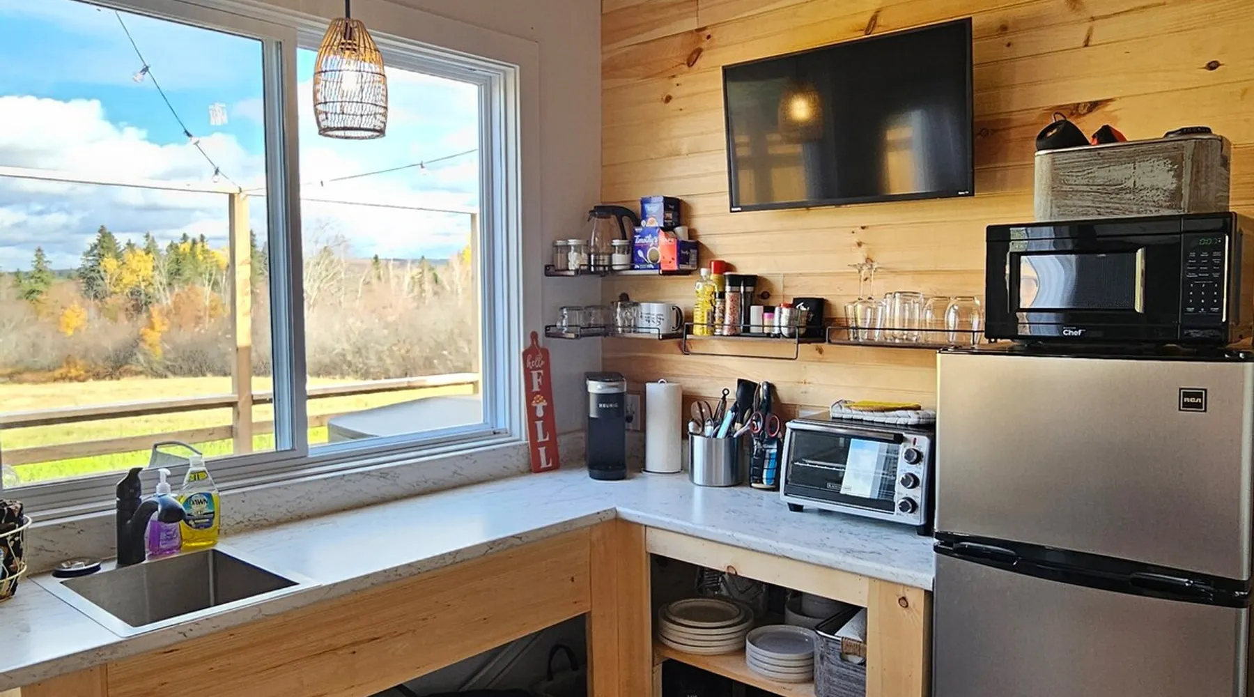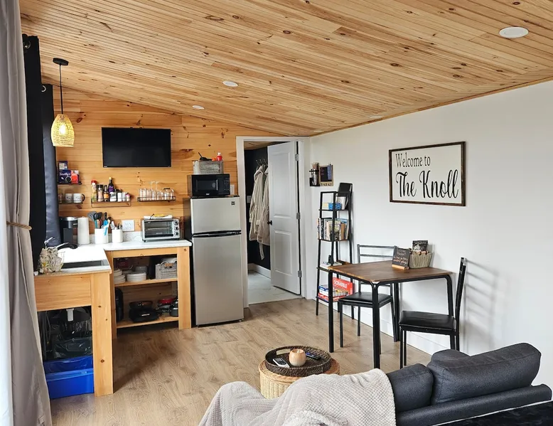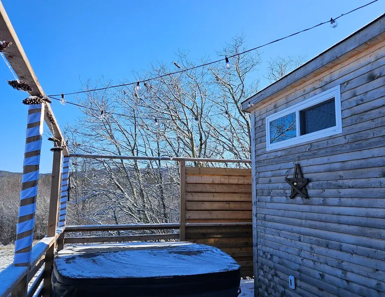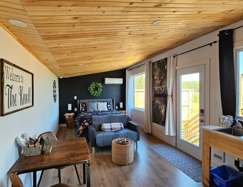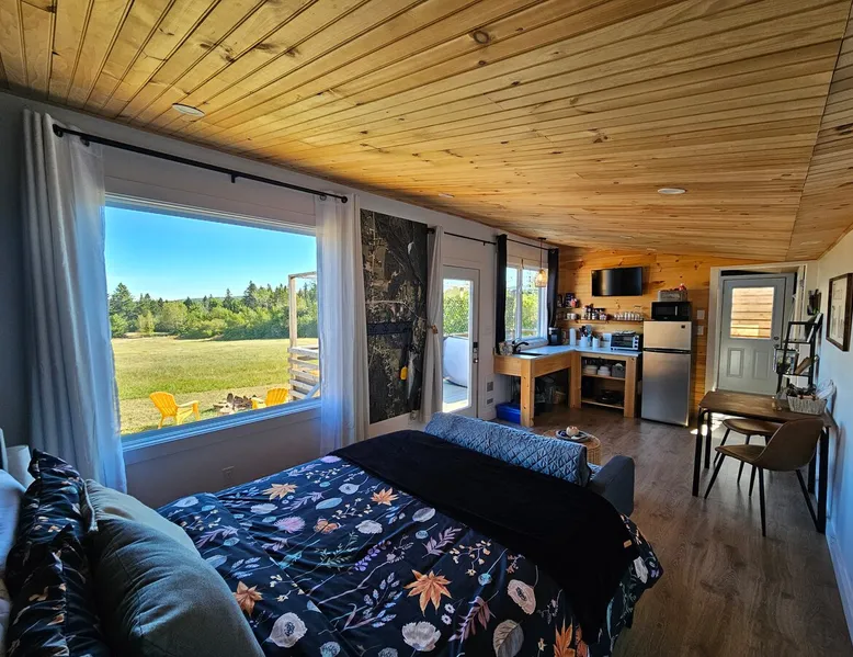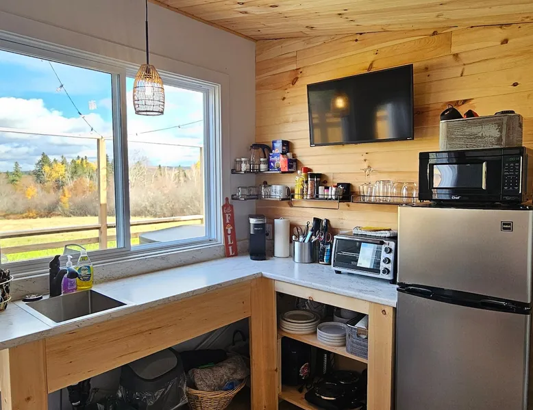 Welcome to The Knoll Bunkie at Hoxly Hideaway! It is one of two shed-style tiny homes with its own hot tub, located in the heart of Elgin, NB. Open year-round, enjoy peace and privacy only steps from the Elgin Eco Park, hiking & cycling trails, ATV and snowmobiling trails, the Pollett River, and much much more. Relax and unwind in this cozy & quaint space, whether you've spent the day on the trails or are looking for a unique getaway. The space The property consists of two 10x30 unique tiny homes situated on 5 acres of land right off the main road in the heart of Elgin. This unit has beautiful field & tree views with lots of wildlife sightings, small & large, and is the more favourable unit for pets with the expansive field out front. Outside on the deck just steps from the door, there is a hot tub to unwind in, a seating area, BBQ, and three seasons outdoor shower (not operating in the winter). Completing the outdoor space is a firepit area (wood provided). Inside this studio style lay-out, you will find a well equipped kitchenette complete with an apartment sized fridge (with freezer), double cooktop burner, microwave, toaster oven, air fryer, kettle, and Keurig (complimentary coffee & tea pods, tea bags, sugar, hot chocolate, and milk & cream are provided). Everything else needed for cooking is right at your fingertips! There is a small dining table for two, complete with a cozy seating area with love seat. This is a great space for board games, cards, a movie night, or to put your feet up and relax. Have a great night's sleep in the luxurious and cozy bed, with beautiful views from the big picture window overlooking the field. Enjoy the three piece bath during your stay with all the amenities provided as well as heated porcelain floors for comfort. You can also access the outside shower & hot tub through the bathroom. If you are not a fan of full sun, this bunkie is East facing and offers more shade than "The Grove bunkie". Guest access Guests have full access to the tiny home. We ask that you stay to the section of the field directly in front of the bunkie if out with your dog so as not to disturb guests in the other bunkie. (In "Exterior" photos, there is an aerial picture showing you the boundaries). Other things to note Please let us know if your pet will be with you. The property is on the main road in Elgin. Cleaning fee: In order to keep our rate reasonable we do not charge a cleaning fee but do ask for general tidying. Please no cooking of shellfish or fish in the bunkie as a staff member is very allergic. Thank you! Fires: From April to November there can be fire bans. Please check the NB Forest Fire Watch (GNB website) for daily restrictions. Their website updates daily at 2pm. Fireworks: Not permitted. Exploring: Please be cautious of your GPS if coming to or from Fundy National Park/Alma. It may take you on back roads that are only meant for 4x4 vehicles and areas where there is no cell service. Pets: Please clean up after your furry friend, it would be much appreciated! The property is an old family homestead so there may be small shards of glass around. We are doing our best to remove what we can. Extras: If you would like to celebrate/set up something special, please send us a message so we can help accommodate your requests!