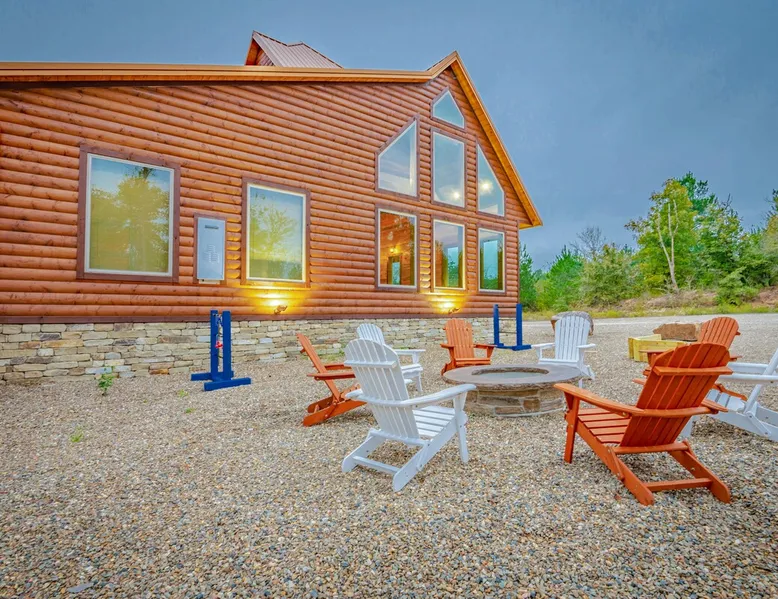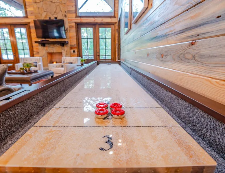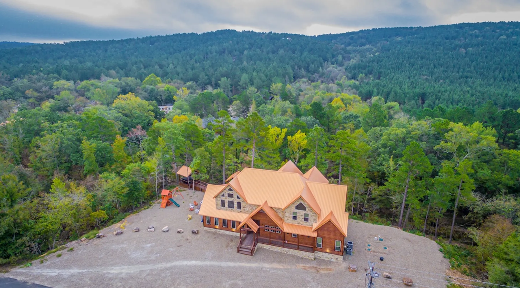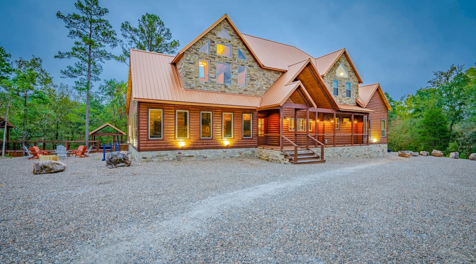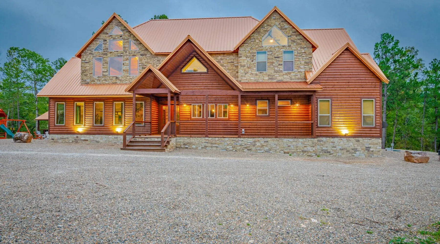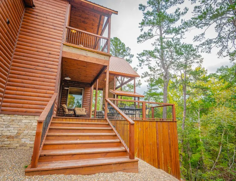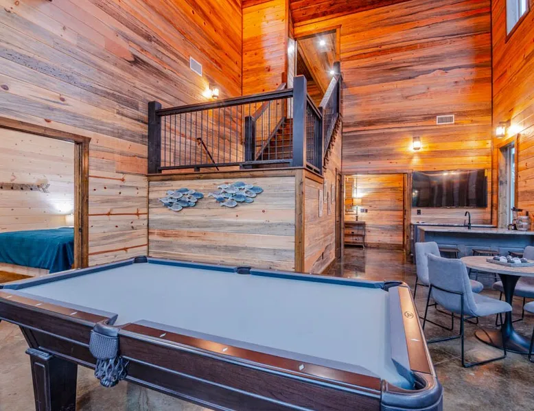 Welcome to Over the Top, a luxurious 6-bedroom, 8-bathroom cabin that sleeps up to 28 guests. Perfect for large families or group getaways, this spacious retreat features a fully stocked chef’s kitchen, a game room with pool and poker tables, two hot tubs, multiple master suites, and a circular drive. Enjoy outdoor dining, a built-in grill, fire pit, playset, and a cozy patio with fireplace and TV. Every detail is designed for comfort, fun, and unforgettable memories in the heart of Hochatown. The space **PET FRIENDLY** - 2 dogs under 50lbs each - $125 per pet - The fee will be bundled into the nightly total Main Living Area Step into a warm and inviting open-concept living room with plush seating for 10, a cozy recliner, a gas fireplace, and a large-screen TV—perfect for movie nights or morning coffee chats. The adjacent dining area comfortably seats 12, while the fully stocked chef’s kitchen boasts everything you need, including a double oven and an industrial-sized refrigerator to keep everyone fed and happy. Bedrooms & Bathrooms Main Level: • Master Suite 1: King bed + twin trundle, patio access, ensuite with double vanity, a spacious walk-in shower, and a deep soaking tub. • Master Suite 2: King bed, suitcase stand, ensuite with double vanity and large walk-in shower. • Bunk/Game Suite: King bed + stacked twin bunks + twin trundle, couch, TV, and ensuite with single vanity and walk-in shower. Upstairs: • Master Suite 3: King bed, ensuite with double vanity and walk-in shower. • Master Suite 4: King bed + twin trundle, ensuite with single vanity and a shower/tub combo. • Master Suite 5: King bed + twin trundle, private patio access, ensuite with double vanity and walk-in shower. All bedrooms come with fresh linens, and every bathroom includes shampoo, conditioner, and body wash. Entertainment Central The game room is an entertainer’s dream: • A wet bar • Ice maker • Pool table • Poker table • Foosball table • Half bathroom for added convenience Perfect for unwinding after a day of outdoor adventure. Outdoor Oasis Step onto the spacious back patio and enjoy: • Three separate dining tables (seating for 6–8 each) • Lounge area with fireplace and TV (seating for 4) • Built-in grill and mini-fridge, hard-lined to the house’s main propane tank • Two hot tubs for ultimate relaxation • A playset for the kiddos • A cozy fire pit with seating for 8—ideal for late-night s’mores under the stars Whether you’re planning a family reunion, friends' getaway, or a corporate retreat, Over the Top lives up to its name—offering over-the-top luxury and fun for everyone. Ready to book your unforgettable stay? Reach out to Bravo Cabin Rentals today! **Firewood Provided** **PET FRIENDLY** - 2 dogs under 50lbs each - $125 per pet General Information – A full-size washer and dryer are available in the laundry closet. Gas fireplaces are seasonally available (October – May 15th). Wi-Fi can be spotty if you are in a rural area. Maximum occupancy for this cabin is 28 guests, with NO EXCEPTIONS. Guest access Entire Cabin Other things to note It is located near all the best restaurants, activities, and park amenities. It is just a short drive to Broken Bow Lake, Beavers Bend State Park, popular hiking trails, restaurants, breweries, wineries, and downtown Hochatown, and access to all the outdoors activities you want – boating, hiking, fly-fishing, kayaking, zip-lining, ATV trails, horseback riding, Cedar Creek Golf Course, Choctaw Landing Casino, mini-golf, helicopter rides, mining for gold, train rides, go-carts, and a great petting zoo. Don’t forget these items when you come to visit: • Rain gear and light jackets (Our average rainfall is 55″-60″ each year). • We have beautiful scenic trails; good hiking boots are a must. • Water shoes for our vast shorelines and streams. • Insect repellent, sunblock, and other first-aid supplies. • Coffee and filters – enjoy this while sitting on the deck in the early morning. • Condiments - A starter supply of coffee/filters, paper towels, toilet paper, bath soap, dish soap, dishwasher tablets, trash bags, and laundry soap is provided. Still, guests may need to bring additional supplies. For your convenience, we can help you arrange: • Special requests (i.e., flowers, wine, etc.) • In-cabin chef recommendations • In-cabin massages recommendations If we are missing something or you have a question we haven't answered, please feel free to reach out to us directly at Bravo Cabin Rentals and we will personally respond as soon as possible. We look forward to making your next vacation in Broken Bow/Hochatown one you won’t forget!
