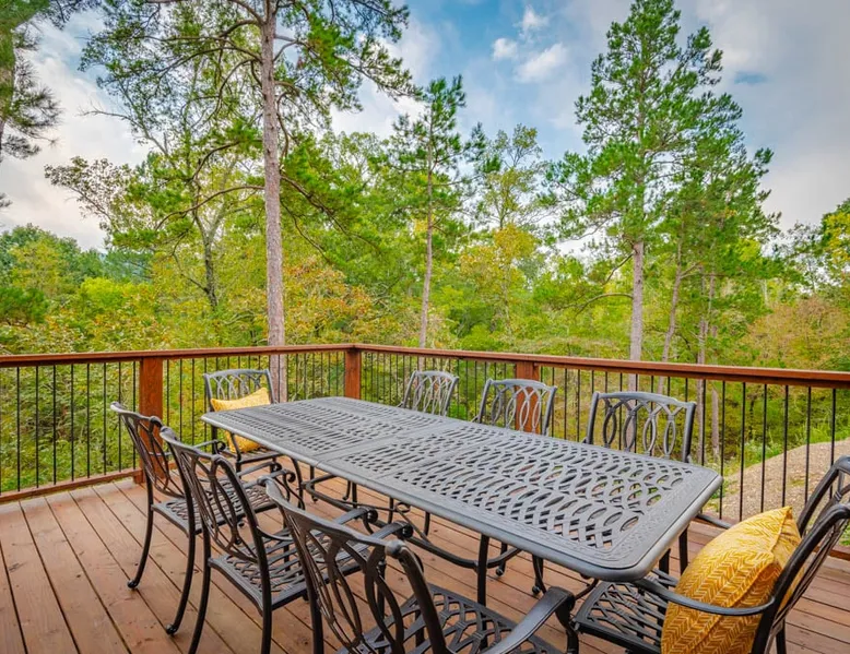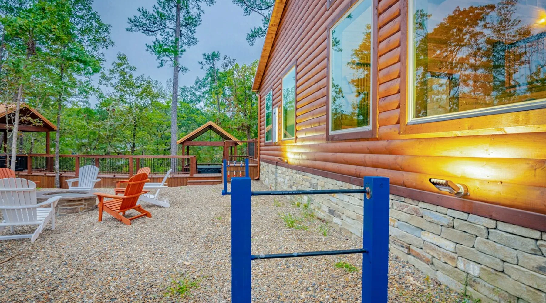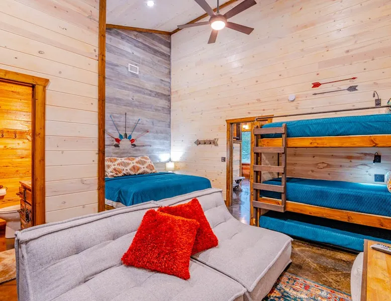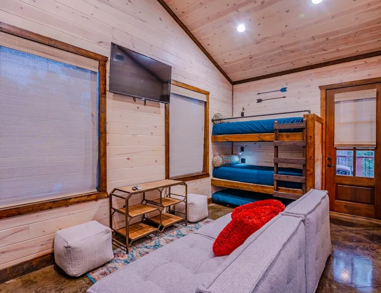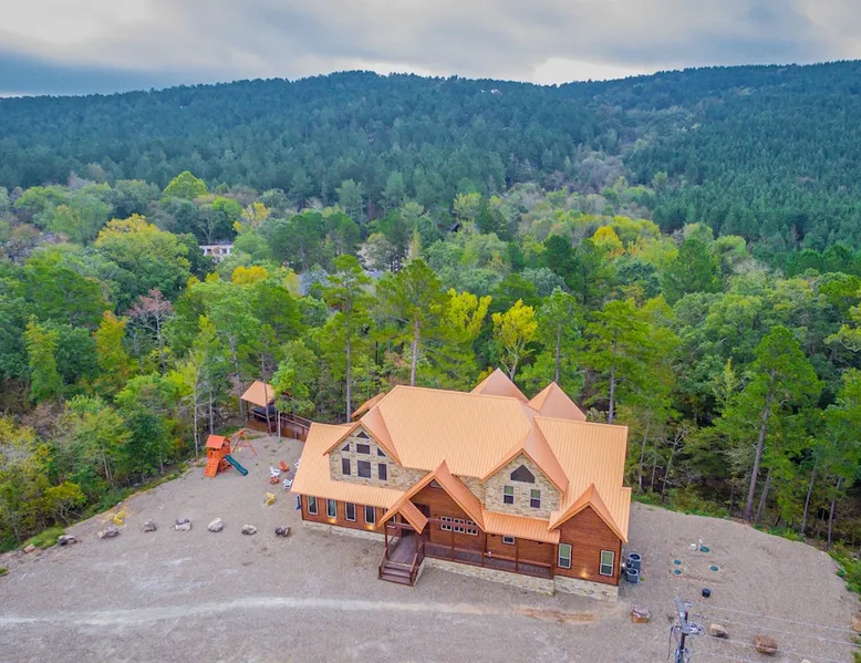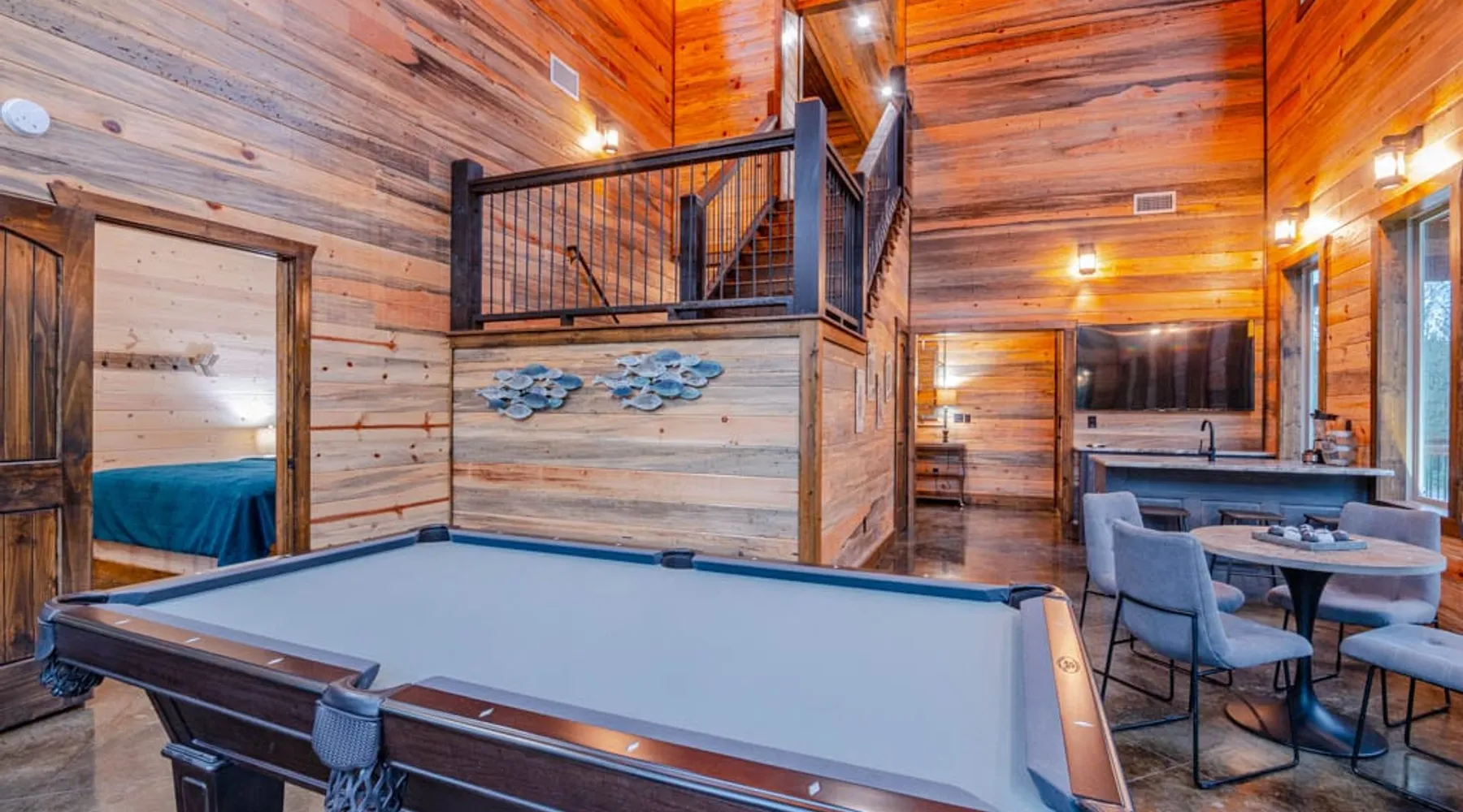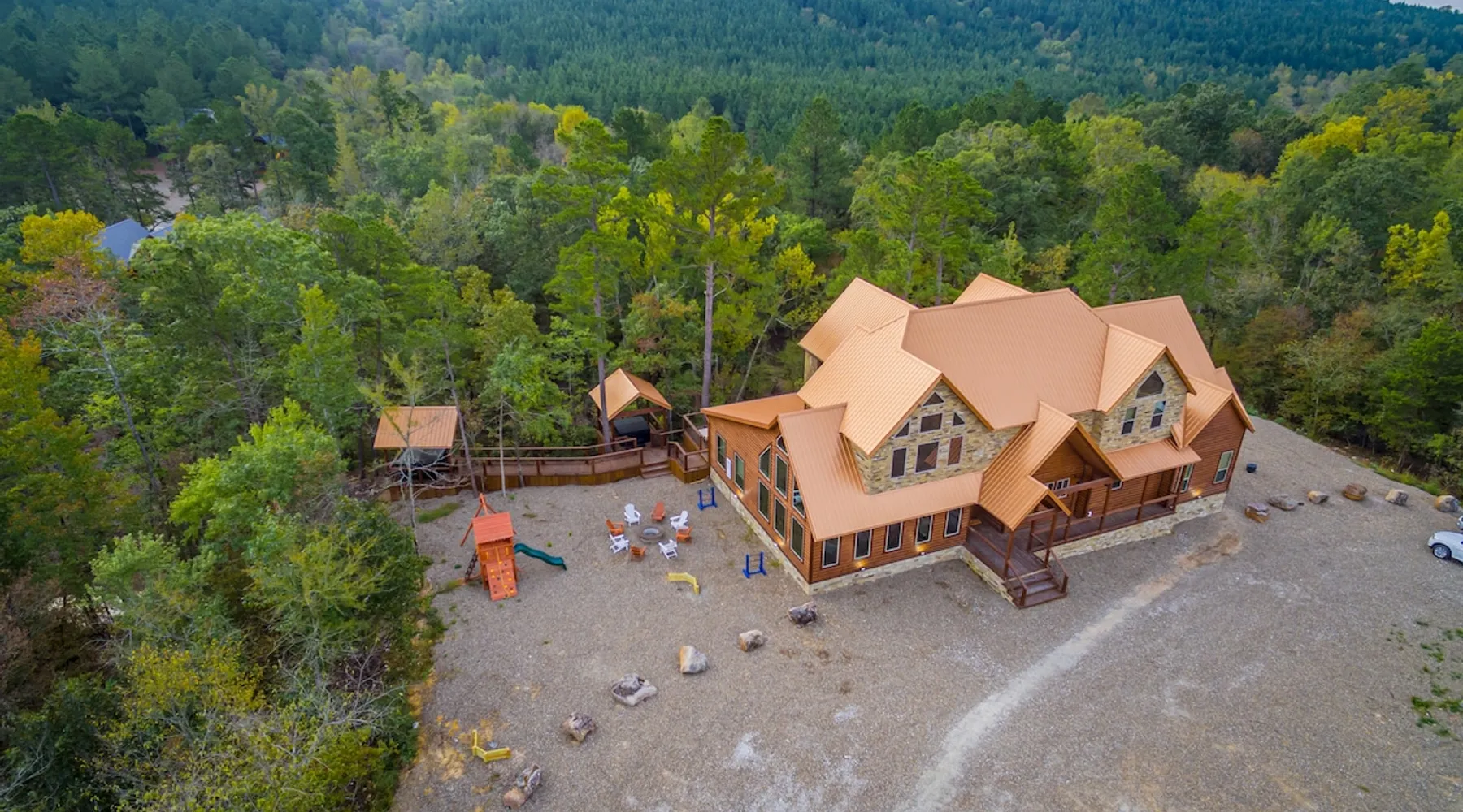 Welcome to Over the Top, a luxurious 6-bedroom, 8-bathroom cabin that sleeps up to 28 guests. Perfect for large families or group getaways, this spacious retreat features a fully stocked chef’s kitchen, a game room with pool and poker tables, two hot tubs, multiple master suites, and a circular drive. Enjoy outdoor dining, a built-in grill, fire pit, playset, and a cozy patio with fireplace and TV. Every detail is designed for comfort, fun, and unforgettable memories in the heart of Hochatown. The space **PET FRIENDLY** - 2 dogs under 50lbs each - $125 per pet - The fee will be bundled into the nightly total Main Living Area Step into a warm and inviting open-concept living room with plush seating for 10, a cozy recliner, a gas fireplace, and a large-screen TV—perfect for movie nights or morning coffee chats. The adjacent dining area comfortably seats 12, while the fully stocked chef’s kitchen boasts everything you need, including a double oven and an industrial-sized refrigerator to keep everyone fed and happy. Bedrooms & Bathrooms Main Level: • Master Suite 1: King bed + twin trundle, patio access, ensuite with double vanity, a spacious walk-in shower, and a deep soaking tub. • Master Suite 2: King bed, suitcase stand, ensuite with double vanity and large walk-in shower. • Bunk/Game Suite: King bed + stacked twin bunks + twin trundle, couch, TV, and ensuite with single vanity and walk-in shower. Upstairs: • Master Suite 3: King bed, ensuite with double vanity and walk-in shower. • Master Suite 4: King bed + twin trundle, ensuite with single vanity and a shower/tub combo. • Master Suite 5: King bed + twin trundle, private patio access, ensuite with double vanity and walk-in shower. All bedrooms come with fresh linens, and every bathroom includes shampoo, conditioner, and body wash. Entertainment Central The game room is an entertainer’s dream: • A wet bar • Ice maker • Pool table • Poker table • Foosball table • Half bathroom for added convenience Perfect for unwinding after a day of outdoor adventure. Outdoor Oasis Step onto the spacious back patio and enjoy: • Three separate dining tables (seating for 6–8 each) • Lounge area with fireplace and TV (seating for 4) • Built-in grill and mini-fridge, hard-lined to the house’s main propane tank • Two hot tubs for ultimate relaxation • A playset for the kiddos • A cozy fire pit with seating for 8—ideal for late-night s’mores under the stars Whether you’re planning a family reunion, friends' getaway, or a corporate retreat, Over the Top lives up to its name—offering over-the-top luxury and fun for everyone. Ready to book your unforgettable stay? Reach out to Bravo Cabin Rentals today! **Firewood Provided** **PET FRIENDLY** - 2 dogs under 50lbs each - $125 per pet General Information – A full-size washer and dryer are available in the laundry closet. Gas fireplaces are seasonally available (October – May 15th). Wi-Fi can be spotty if you are in a rural area. Maximum occupancy for this cabin is 28 guests, with NO EXCEPTIONS. Guest access Entire Cabin Other things to note It is located near all the best restaurants, activities, and park amenities. It is just a short drive to Broken Bow Lake, Beavers Bend State Park, popular hiking trails, restaurants, breweries, wineries, and downtown Hochatown, and access to all the outdoors activities you want – boating, hiking, fly-fishing, kayaking, zip-lining, ATV trails, horseback riding, Cedar Creek Golf Course, Choctaw Landing Casino, mini-golf, helicopter rides, mining for gold, train rides, go-carts, and a great petting zoo. Don’t forget these items when you come to visit: • Rain gear and light jackets (Our average rainfall is 55″-60″ each year). • We have beautiful scenic trails; good hiking boots are a must. • Water shoes for our vast shorelines and streams. • Insect repellent, sunblock, and other first-aid supplies. • Coffee and filters – enjoy this while sitting on the deck in the early morning. • Condiments - A starter supply of coffee/filters, paper towels, toilet paper, bath soap, dish soap, dishwasher tablets, trash bags, and laundry soap is provided. Still, guests may need to bring additional supplies. For your convenience, we can help you arrange: • Special requests (i.e., flowers, wine, etc.) • In-cabin chef recommendations • In-cabin massages recommendations If we are missing something or you have a question we haven't answered, please feel free to reach out to us directly at Bravo Cabin Rentals and we will personally respond as soon as possible. We look forward to making your next vacation in Broken Bow/Hochatown one you won’t forget!