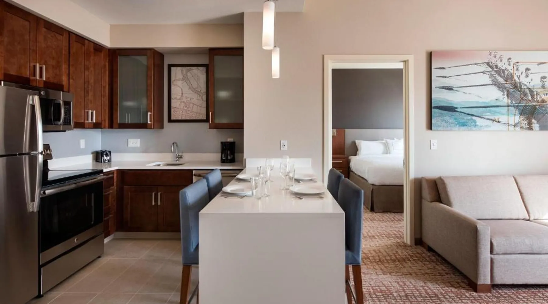 Located 25 minutes’ drive away from major high tech corporations in California’s Silicon Valley, Residence Inn by Marriott Redwood City San Carlos serves a daily American breakfast and offers accommodations with fully equipped kitchens. Offering train service to San Francisco and San Jose, San Carlos Caltrain Station is just 5 minutes’ walk from this hotel. Offering free WiFi, each air-conditioned studio and suite at this hotel includes a work space with a large desk. All rooms also include a flat-screen TV, a sofa bed and a seating area. Guests can unwind in the unique outdoor living space, which features a pool, a fire pit, a BBQ area and a sports court. Free shuttle services to downtown San Carlos are also available. Guests can enjoy dinning and shopping in downtown San Carlos, just 5 minutes’ walk from Residence Inn by Marriott Redwood City San Carlos. Stanford University is 25 minutes’ drive away. Emerald Hills Golf Course is 5 mi away. San Francisco International Airport is 11 mi away from this extended stay hotel. The unit offers 3 beds.