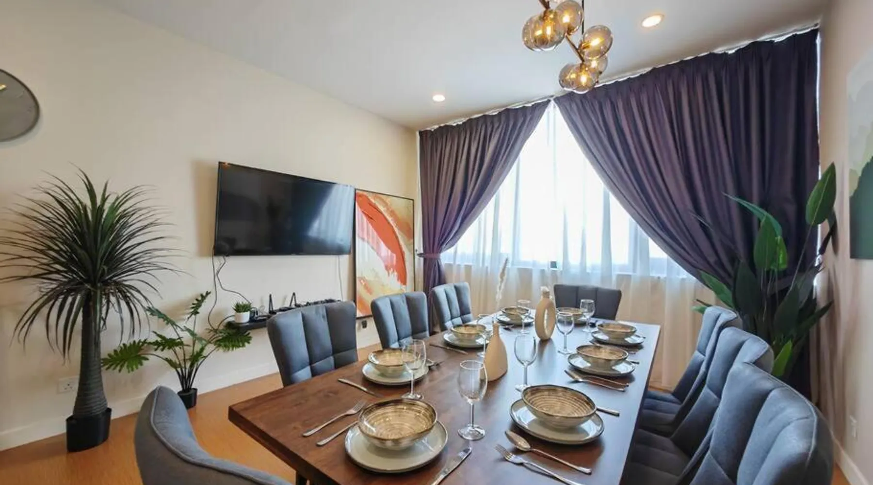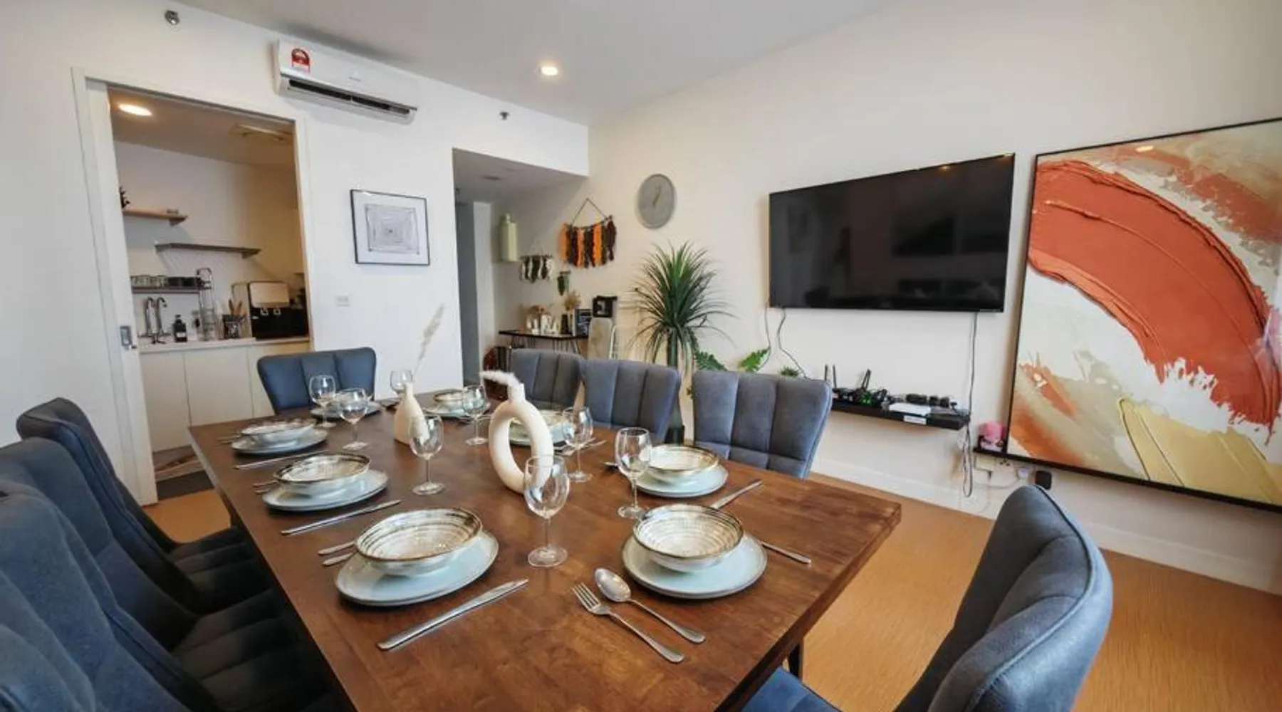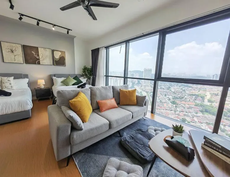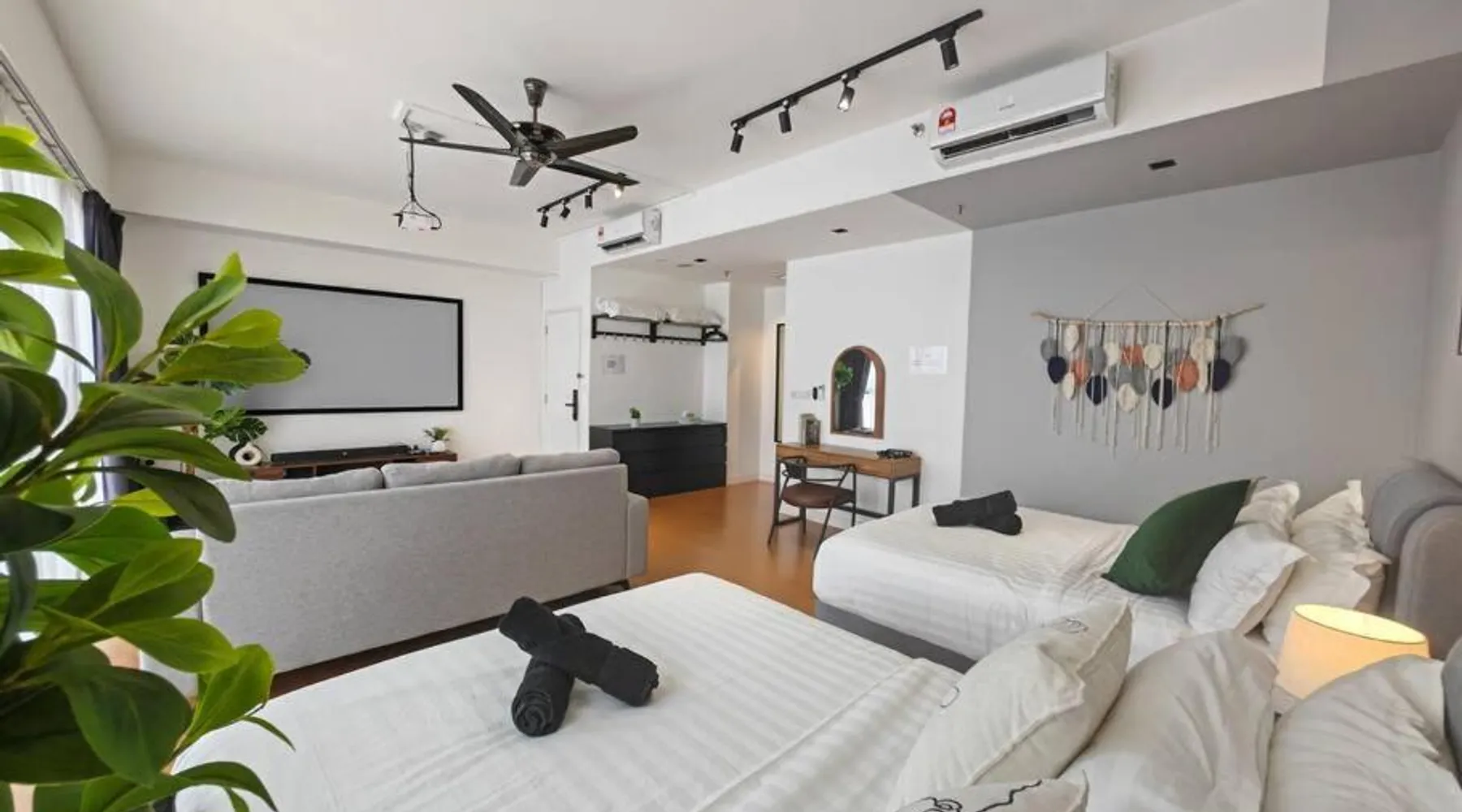 Essential Facilities: Harmonee Homes at The Hub SS2 in Petaling Jaya offers a rooftop swimming pool, fitness center, and lush garden. Complimentary WiFi is available throughout the apartment. Comfortable Living: Each apartment features air-conditioning, a private bathroom with a walk-in shower, and a city view. Additional amenities include a washing machine, kitchen, and sofa bed. Convenient Location: Located 6.8 mi from Sultan Abdul Aziz Shah Airport, the property is close to Evolve Concept Mall (3.7 mi) and Mid Valley Megamall (5 mi). Free on-site private parking is provided. Guests will have a special experience as this apartment offers a pool with a view. This spacious apartment consists of 1 living room, 2 separate bedrooms and 2 bathrooms with a walk-in shower and free toiletries. The well-equipped kitchen features a stovetop, a refrigerator, kitchenware and a microwave. The air-conditioned apartment provides a flat-screen TV with streaming services, a washing machine, a private entrance, a dining area as well as city views. The unit offers 3 beds and 4 futons.