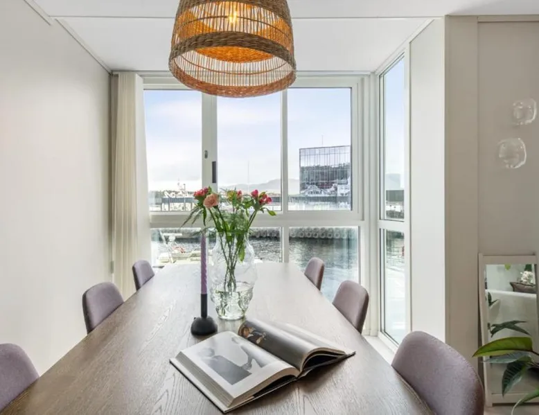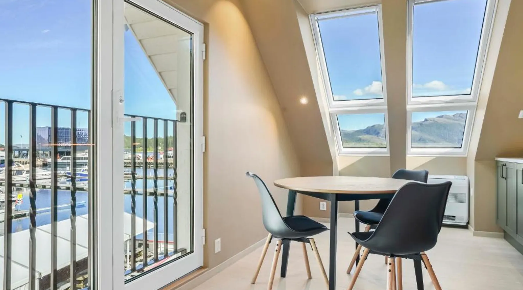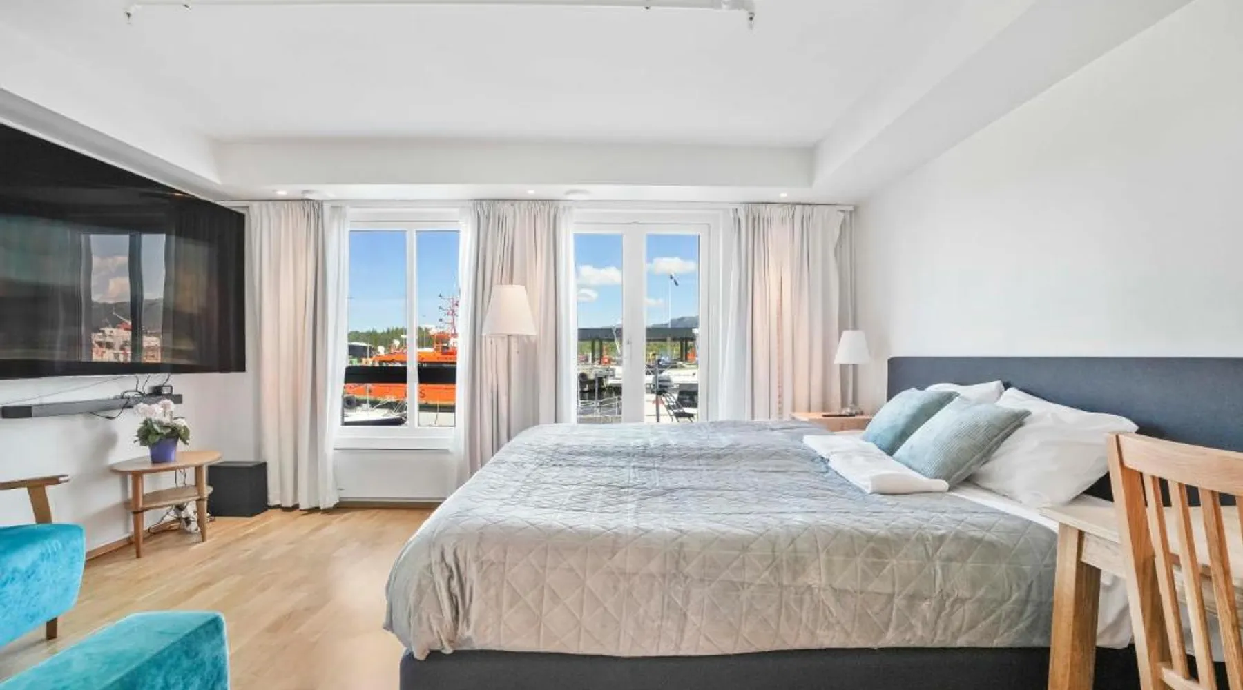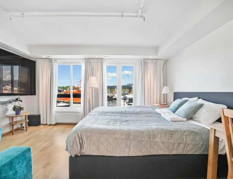 Comfortable Accommodations: Florø Apartments Hotell in Florø offers family rooms with private bathrooms. Each unit features air-conditioning, a kitchenette, and a balcony or terrace with sea views. Modern Amenities: Guests enjoy free WiFi, a washing machine, and a fully equipped kitchen with a refrigerator, microwave, and stovetop. Additional amenities include a dining area, TV, and free toiletries. Convenient Location: Located 1.2 mi from Florø Airport, the aparthotel is highly rated for its convenient location. Guests appreciate its central position for city trips. The unit offers 4 beds.