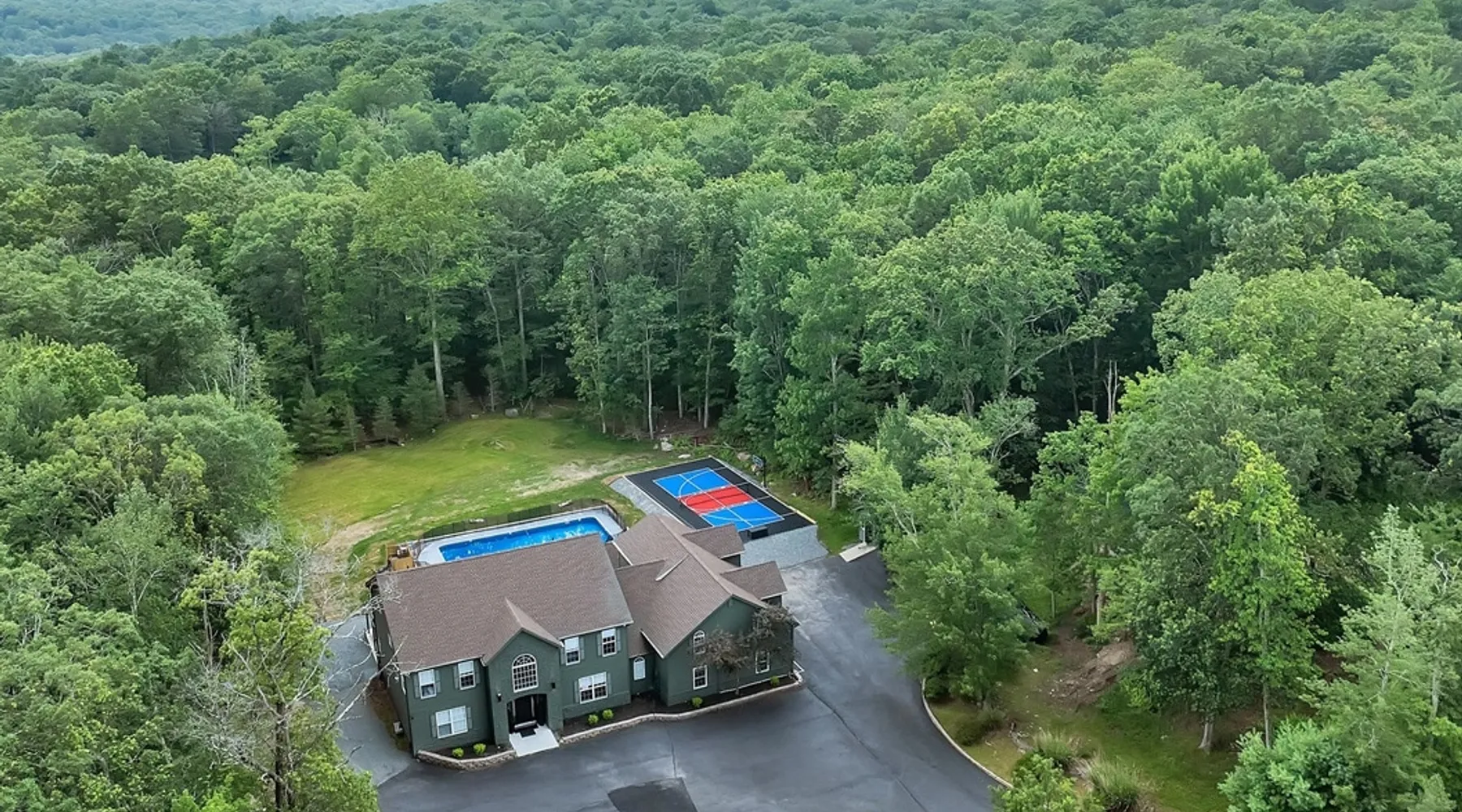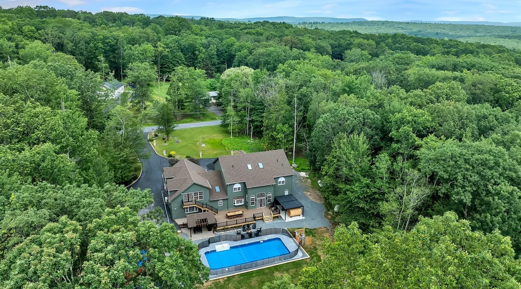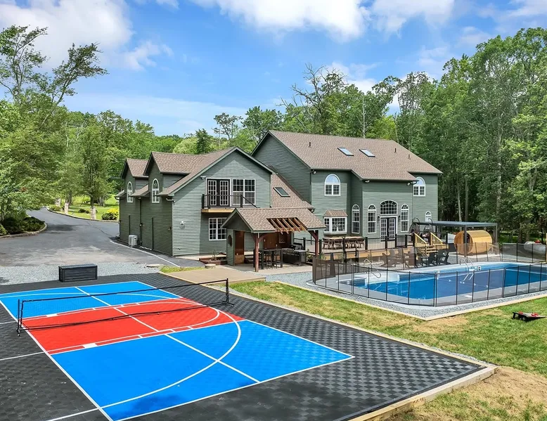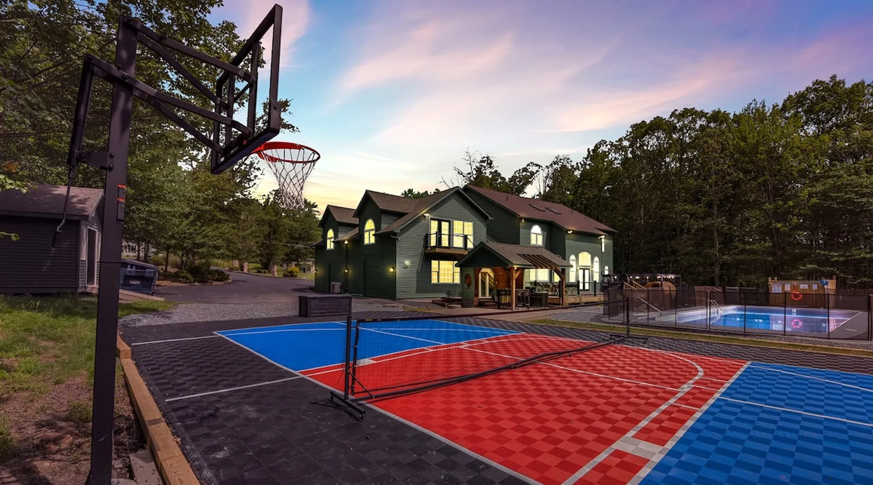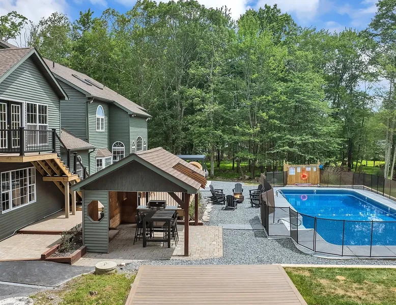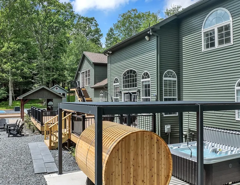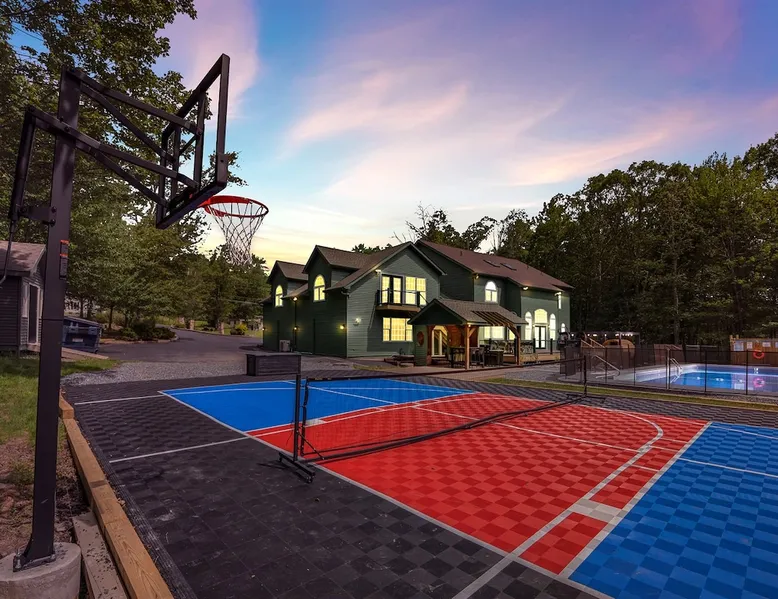 Your perfect retreat awaits! This newly designed 8-bedroom, 5-bath estate is the ultimate getaway for large groups, blending luxury with fun-packed amenities. Dive into the 45’ saltwater pool & relax in the private hot tub and sauna, and unleash your competitive side in our epic game room. We're minutes from indoor thrills at Kalahari and fall hiking trails, making it the perfect base for your Poconos adventure. Book your unforgettable vacation & start making lasting memories! The space Escape to the Pocono Mountains and stay in this stunning 8-bedroom, 5-bath estate in the highly sought-after location! Located just minutes from water parks, shopping, hiking, and top attractions like Camelback ski resort, Mount Airy Casino, and the Delaware Water Gap all while enjoying a peaceful mountain retreat with incredible amenities. 🏡 Estate Highlights ✅ Sleeps 22 Comfortably – Perfect for mutligenerational families & groups ✅ Private Pool ✅ Private Hot Tub and Sauna – Relax under the stars after a day of adventure ✅ Pickleball and basketball 1/2 court ✅ Game Room Fun – 3 arcade machines, foosball, air hockey, basketball and a kids climbing gym ✅ Upstairs Loft with pool table, jukebox, poker table and bar ✅ Fully Equipped Kitchen – Everything you need to cook delicious meals. Includes a gas range, premium appliances, coffee bar (K cups included), and seating for 17. ✅ Cozy Living Room – Fireplace, plush seating & 75" Smart TV for movie nights ✅ Fast WiFi + Smart TVs – Stay connected & entertained ✅ Outdoor Space-private yard, fireplace, tiki bar, pool, sauna, hot tub and yard games ✅EV charger 🛏 Sleeping Arrangements 💤 Master Bedroom (Main Level) – King bed, premium luxury linens, 43” Smart TV, en-suite bath 💤 Bedroom 2 (Main Level) – King bed, premium luxury linens, 43” Smart TV 💤 Bedroom 3 (main Level) – 2 Queen beds, premium luxury linens, 💤 Bedroom 4 (Main Level) – 2 Bunk beds (Full over Queen), premium luxury linens, 43” Smart TV 💤 Bedroom 5 (Upper Level) – King bed, premium luxury linens, 43” Smart TV, jack-n-jill bath 💤 Bedroom 6 (Upper Level) – King bed, premium luxury linens, 43” Smart TV, jack-n-jill bath 💤 Bedroom 7 (Upper Level) – King bed, premium luxury linens, 43” Smart TV 💤 Bedroom 8 (Upper Level) – King bed, premium luxury linens, 43” Smart TV 🎯 Ultimate Kids Game Room Challenge your friends and family in the fully loaded game room, featuring: 🎮 3 Arcade Machines – Classic & modern games Nintendo Switch 🏒 Air Hockey Table – Fast-paced excitement Pop-a-shot BB game Foosball Table Indoor Gym Ultimate Game room for older kids and Adults 🎱 Pool Table – Fun for all skill levels Poker Table Jukebox- greatest hits Karaoke Machine Large seating area with 75" TV for Movie Night 🍳 Kitchen & Living Space The open-plan kitchen and living area is the heart of the home, featuring: Gourmet Kitchen: Gas range, Instant Pot, blender, griddle and spices. Coffee Bar: K-Cups, and supplies included. Dining Space: Seating for 17 for casual meals. Living Area: 85” Smart TV, gas fireplace and cozy seating 🌲Large Private Yard 🏊 45' Pool with enclosure for year-round enjoyment coming this winter 🛁 Private Hot Tub – The perfect way to unwind under the stars 🔥Barrel Sauna -- Detox and destress in your private sauna with a view 🔥 Grill & Outdoor Seating – Enjoy BBQs with breathtaking views 🚗 Perfect Location – Minutes from Top Attractions! 🔑 Guest Access Guests have full access to: entire house, pool, hot tub, sauna, private yard, EV charger, Private driveway parking. High-speed internet, keyless entry, and smart home features. 📋 Things to Note Pool, Sauna and Hot Tub Usage: Follow provided guidelines for safe use. Pets must be approved and require a fee Kid-Friendly Features: Full game room designed for kids! Arcade games, climbing structure, bb game, foosball and more! Book Now & Experience the Best of The Poconos! Whether you’re planning a family vacation, couples' retreat, or a fun getaway with friends, this estate has everything you need for an unforgettable stay. Don’t wait—book today! Guest access When you stay in this home, you have the whole space to yourself. You can park in the private driveway and will be given a code to enter the home. During winter months, 4 wheel drive vehicles are recommended. The driveway will be plowed, however, fresh snow during your stay can make travel difficult. Feel free and make use of the full-size washer and dryer, high-speed WiFi, pool, hot tub, and sauna. From this luxury home, you’re just minutes from some of the nation’s most beautiful natural landmarks, restaurants, retail shops, ski resorts and waterparks. A video cameras is on site near the front door with a view of the driveway to the back to ensure the safety and security of those accessing the property. Other things to note 🏡 Estate Highlights ✅ Sleeps 22 Comfortably – Perfect for mutligenerational families & groups ✅ Private Heated Pool ✅ Private Hot Tub and Sauna – Relax under the stars after a day of adventure ✅ Pickleball and basketball court ✅ Game Room Fun – 3 arcade machines, foosball, air hockey, basketball and a kids climbing gym ✅ Upstairs Loft with pool table, jukebox, poker table and bar ✅ Fully Equipped Kitchen – Everything you need to cook delicious meals. Includes a gas range, premium appliances, coffee bar (K cups included), and seating for 17. ✅ Cozy Living Room – Fireplace, plush seating & 75" Smart TV for movie nights ✅ Fast WiFi + Smart TVs – Stay connected & entertained ✅ Outdoor Space-private yard, fireplace, tiki bar, pool, sauna, hot tub and yard games ✅EV charger