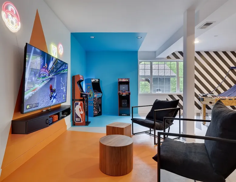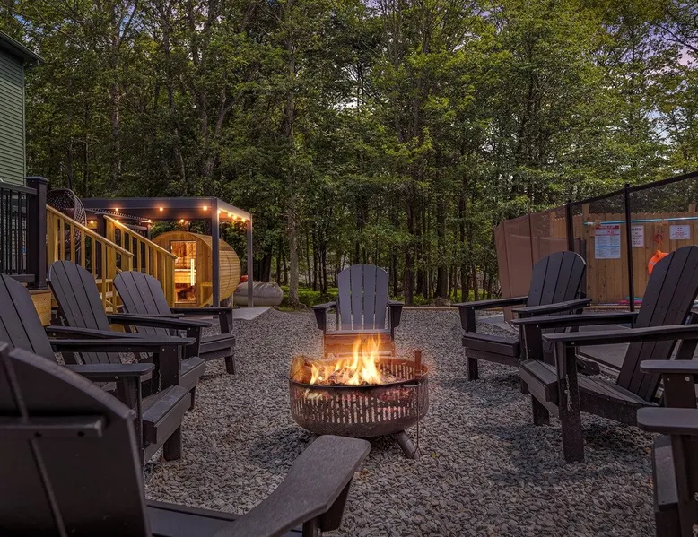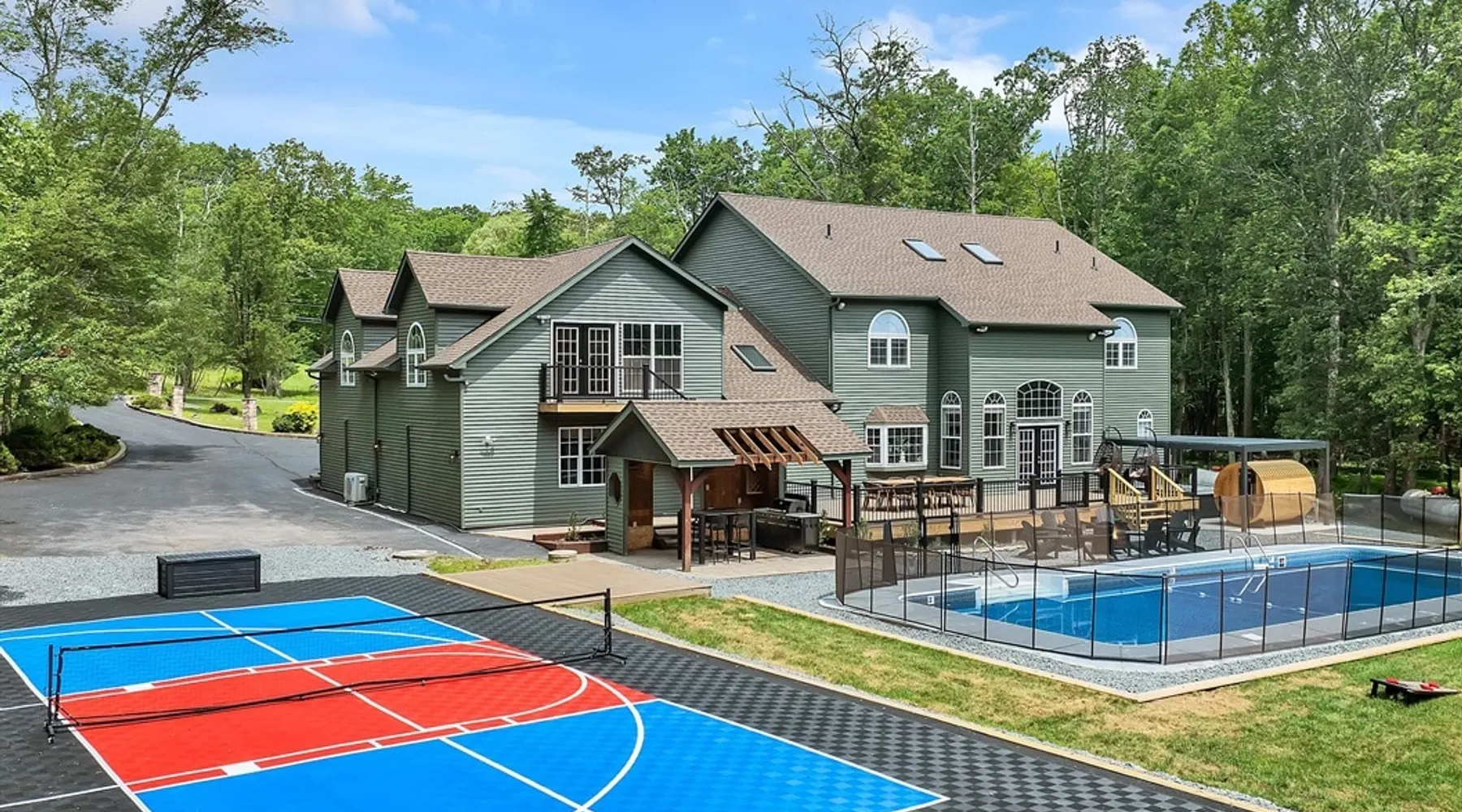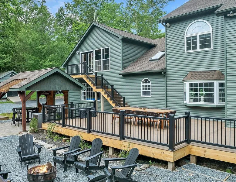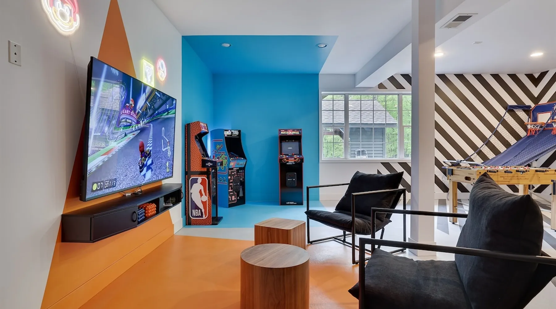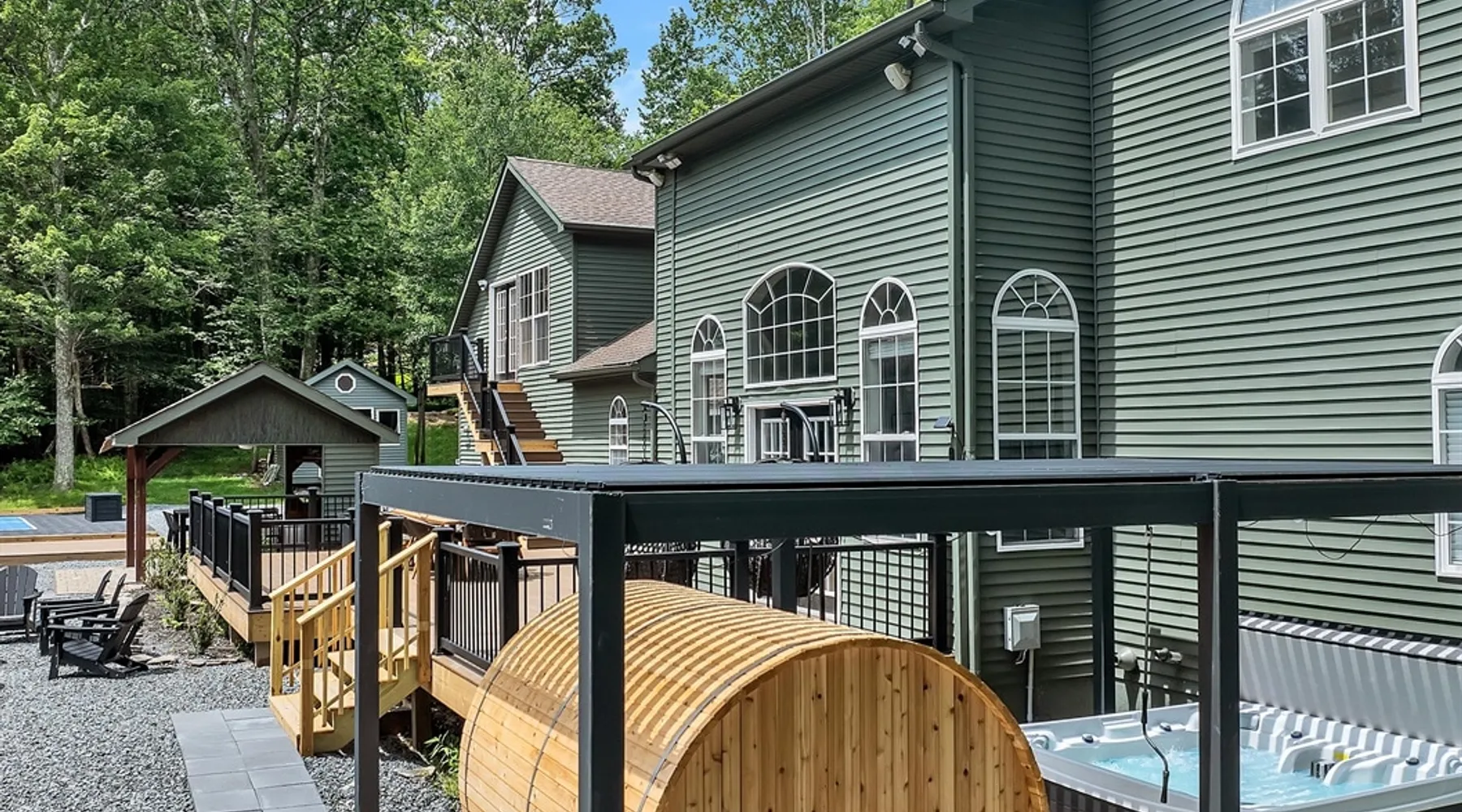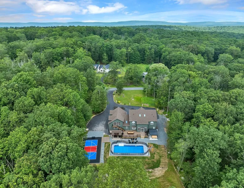 Your perfect retreat awaits! This newly designed 8-bedroom, 5-bath estate is the ultimate getaway for large groups, blending luxury with fun-packed amenities. Dive into the 45’ saltwater pool & relax in the private hot tub and sauna, and unleash your competitive side in our epic game room. We're minutes from indoor thrills at Kalahari and fall hiking trails, making it the perfect base for your Poconos adventure. Book your unforgettable vacation & start making lasting memories! The space Escape to the Pocono Mountains and stay in this stunning 8-bedroom, 5-bath estate in the highly sought-after location! Located just minutes from water parks, shopping, hiking, and top attractions like Camelback ski resort, Mount Airy Casino, and the Delaware Water Gap all while enjoying a peaceful mountain retreat with incredible amenities. 🏡 Estate Highlights ✅ Sleeps 22 Comfortably – Perfect for mutligenerational families & groups ✅ Private Pool ✅ Private Hot Tub and Sauna – Relax under the stars after a day of adventure ✅ Pickleball and basketball 1/2 court ✅ Game Room Fun – 3 arcade machines, foosball, air hockey, basketball and a kids climbing gym ✅ Upstairs Loft with pool table, jukebox, poker table and bar ✅ Fully Equipped Kitchen – Everything you need to cook delicious meals. Includes a gas range, premium appliances, coffee bar (K cups included), and seating for 17. ✅ Cozy Living Room – Fireplace, plush seating & 75" Smart TV for movie nights ✅ Fast WiFi + Smart TVs – Stay connected & entertained ✅ Outdoor Space-private yard, fireplace, tiki bar, pool, sauna, hot tub and yard games ✅EV charger 🛏 Sleeping Arrangements 💤 Master Bedroom (Main Level) – King bed, premium luxury linens, 43” Smart TV, en-suite bath 💤 Bedroom 2 (Main Level) – King bed, premium luxury linens, 43” Smart TV 💤 Bedroom 3 (main Level) – 2 Queen beds, premium luxury linens, 💤 Bedroom 4 (Main Level) – 2 Bunk beds (Full over Queen), premium luxury linens, 43” Smart TV 💤 Bedroom 5 (Upper Level) – King bed, premium luxury linens, 43” Smart TV, jack-n-jill bath 💤 Bedroom 6 (Upper Level) – King bed, premium luxury linens, 43” Smart TV, jack-n-jill bath 💤 Bedroom 7 (Upper Level) – King bed, premium luxury linens, 43” Smart TV 💤 Bedroom 8 (Upper Level) – King bed, premium luxury linens, 43” Smart TV 🎯 Ultimate Kids Game Room Challenge your friends and family in the fully loaded game room, featuring: 🎮 3 Arcade Machines – Classic & modern games Nintendo Switch 🏒 Air Hockey Table – Fast-paced excitement Pop-a-shot BB game Foosball Table Indoor Gym Ultimate Game room for older kids and Adults 🎱 Pool Table – Fun for all skill levels Poker Table Jukebox- greatest hits Karaoke Machine Large seating area with 75" TV for Movie Night 🍳 Kitchen & Living Space The open-plan kitchen and living area is the heart of the home, featuring: Gourmet Kitchen: Gas range, Instant Pot, blender, griddle and spices. Coffee Bar: K-Cups, and supplies included. Dining Space: Seating for 17 for casual meals. Living Area: 85” Smart TV, gas fireplace and cozy seating 🌲Large Private Yard 🏊 45' Pool with enclosure for year-round enjoyment coming this winter 🛁 Private Hot Tub – The perfect way to unwind under the stars 🔥Barrel Sauna -- Detox and destress in your private sauna with a view 🔥 Grill & Outdoor Seating – Enjoy BBQs with breathtaking views 🚗 Perfect Location – Minutes from Top Attractions! 🔑 Guest Access Guests have full access to: entire house, pool, hot tub, sauna, private yard, EV charger, Private driveway parking. High-speed internet, keyless entry, and smart home features. 📋 Things to Note Pool, Sauna and Hot Tub Usage: Follow provided guidelines for safe use. Pets must be approved and require a fee Kid-Friendly Features: Full game room designed for kids! Arcade games, climbing structure, bb game, foosball and more! Book Now & Experience the Best of The Poconos! Whether you’re planning a family vacation, couples' retreat, or a fun getaway with friends, this estate has everything you need for an unforgettable stay. Don’t wait—book today! Guest access When you stay in this home, you have the whole space to yourself. You can park in the private driveway and will be given a code to enter the home. During winter months, 4 wheel drive vehicles are recommended. The driveway will be plowed, however, fresh snow during your stay can make travel difficult. Feel free and make use of the full-size washer and dryer, high-speed WiFi, pool, hot tub, and sauna. From this luxury home, you’re just minutes from some of the nation’s most beautiful natural landmarks, restaurants, retail shops, ski resorts and waterparks. A video cameras is on site near the front door with a view of the driveway to the back to ensure the safety and security of those accessing the property. Other things to note 🏡 Estate Highlights ✅ Sleeps 22 Comfortably – Perfect for mutligenerational families & groups ✅ Private Heated Pool ✅ Private Hot Tub and Sauna – Relax under the stars after a day of adventure ✅ Pickleball and basketball court ✅ Game Room Fun – 3 arcade machines, foosball, air hockey, basketball and a kids climbing gym ✅ Upstairs Loft with pool table, jukebox, poker table and bar ✅ Fully Equipped Kitchen – Everything you need to cook delicious meals. Includes a gas range, premium appliances, coffee bar (K cups included), and seating for 17. ✅ Cozy Living Room – Fireplace, plush seating & 75" Smart TV for movie nights ✅ Fast WiFi + Smart TVs – Stay connected & entertained ✅ Outdoor Space-private yard, fireplace, tiki bar, pool, sauna, hot tub and yard games ✅EV charger