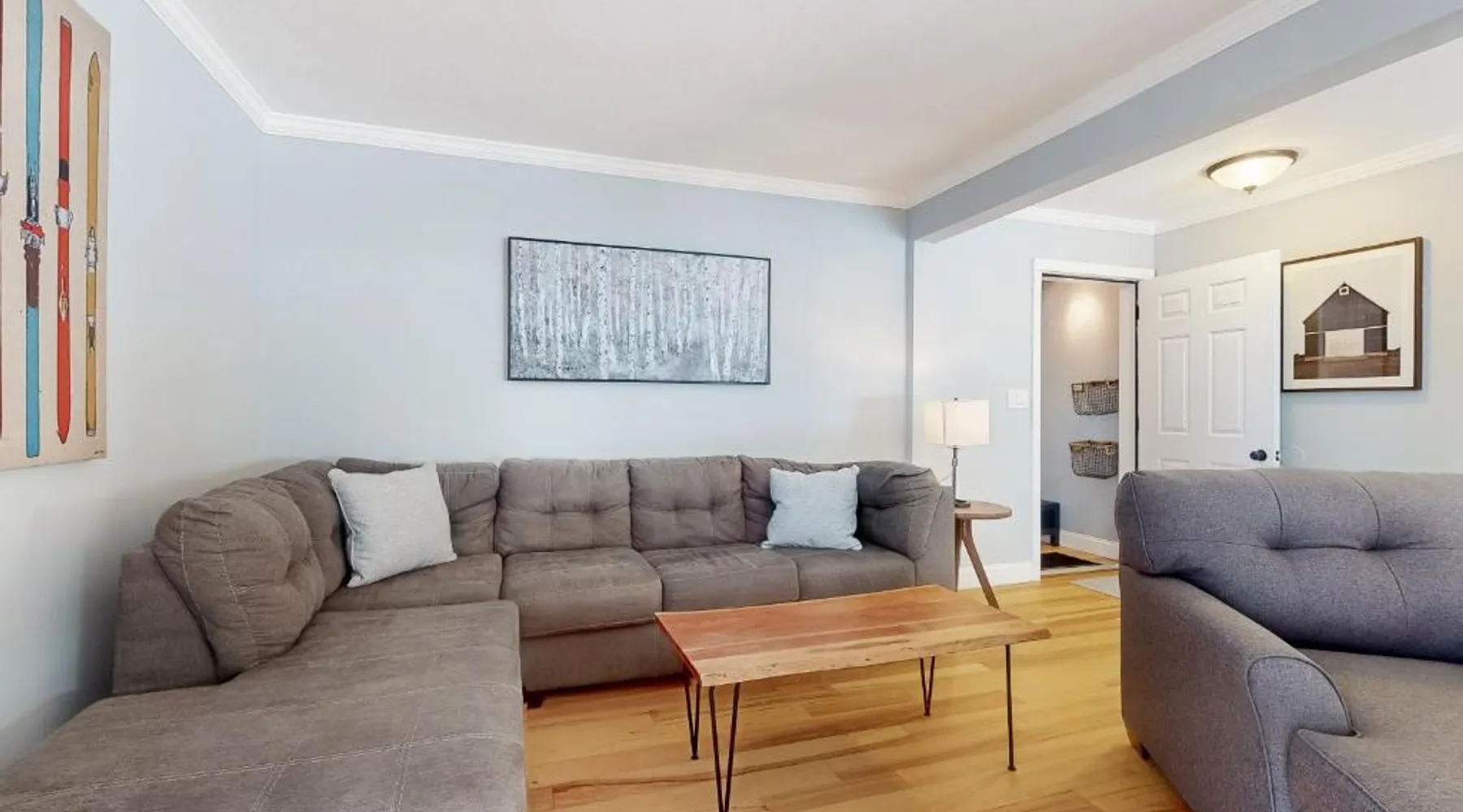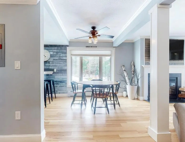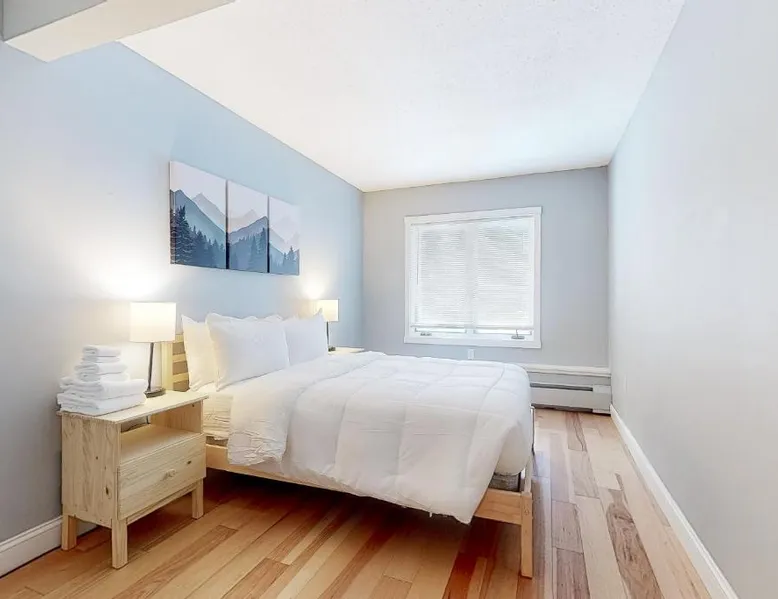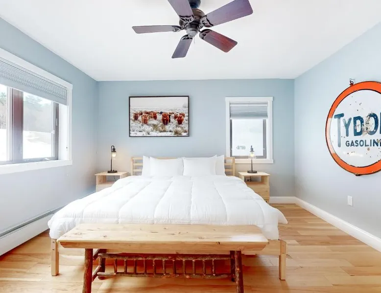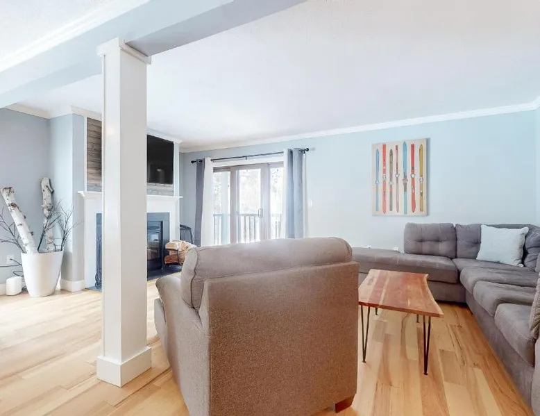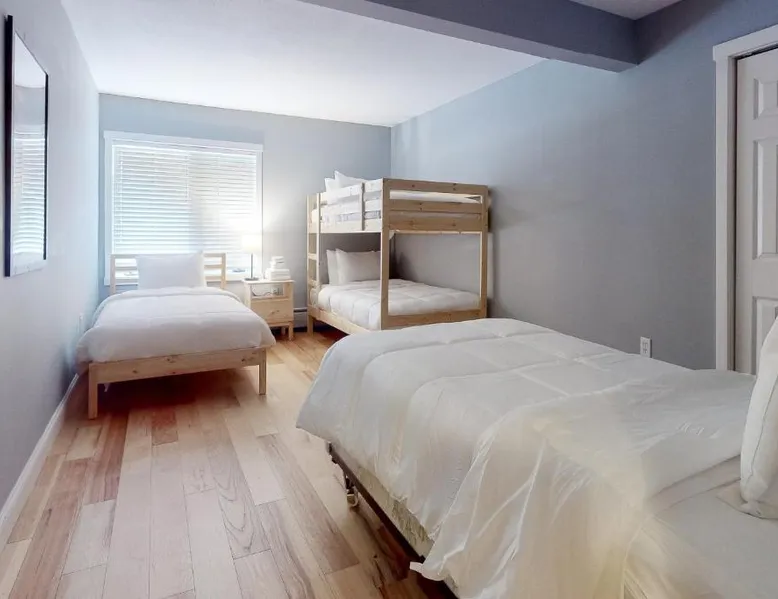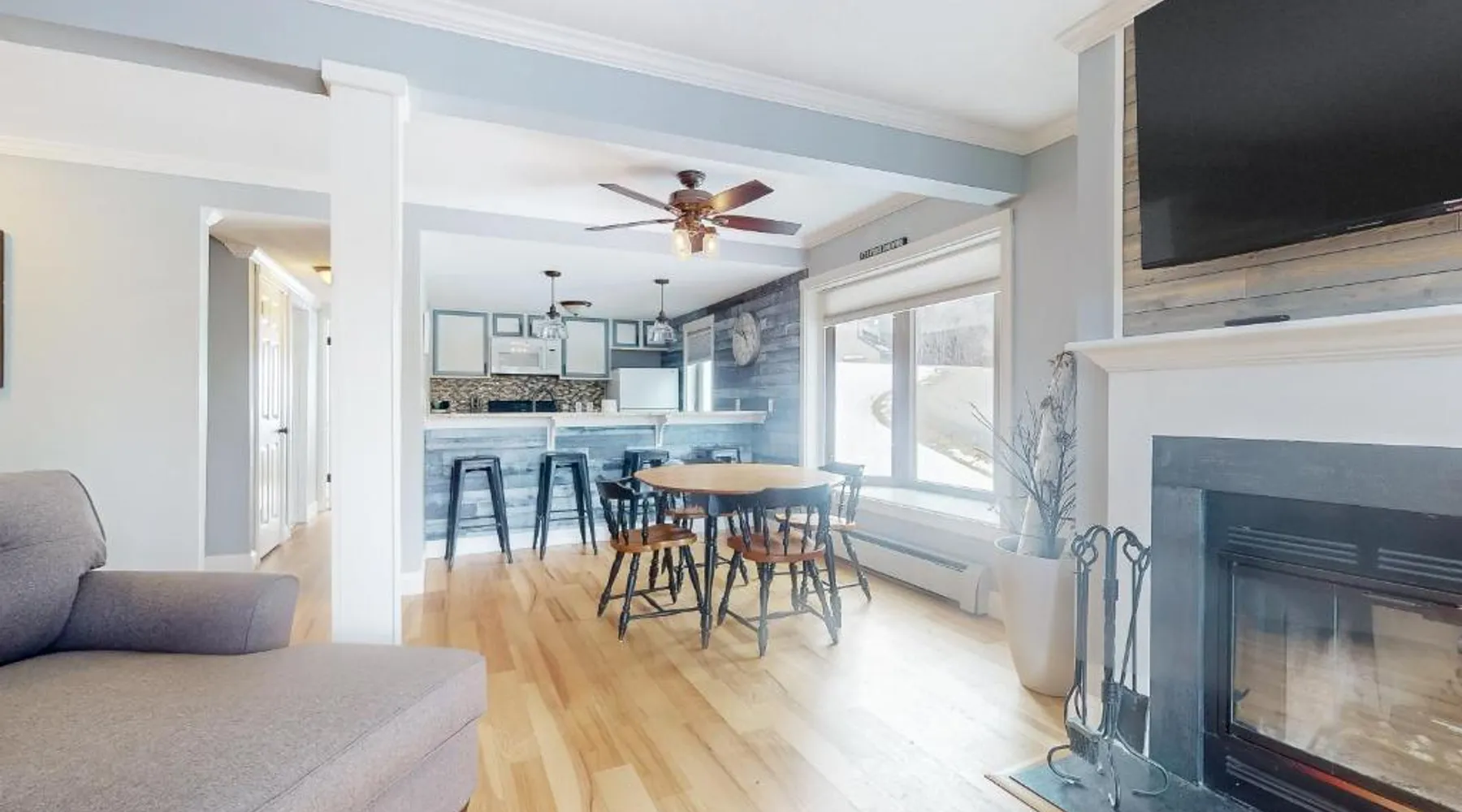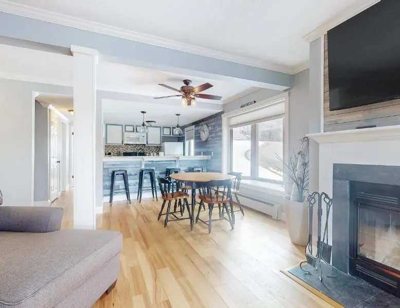Spacious Accommodations: Ascutney Retreat in Brownsville offers a spacious apartment with three bedrooms and two bathrooms. The living room features a dining area and a comfortable seating space. Modern Amenities: Guests enjoy a fully equipped kitchen with a coffee machine, dishwasher, and microwave. The apartment includes a washing machine, streaming services, and free toiletries. Convenient Facilities: The property provides ski-to-door access and a restaurant. Additional amenities include a work desk, dining table, and a private entrance. Local Attractions: Mount Ascutney is 8.1 mi away, Quechee Gorge 11 mi, and Dartmouth College 25 mi from the apartment. Lebanon Municipal Airport is 19 mi distant. This spacious apartment comes with 1 living room, 3 separate bedrooms and 2 bathrooms with a hairdryer and free toiletries. In the fully equipped kitchen, guests will find a stovetop, a refrigerator, a dishwasher and kitchenware. The apartment features a flat-screen TV with streaming services, a washing machine, a private entrance, a tea and coffee maker as well as mountain views. The unit has 7 beds.