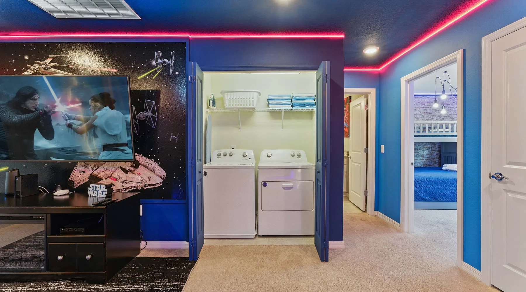 Step into a world of fantasy and fun in this 5-bedroom Windsor Island home! Enjoy a Mickey-themed living room, Star Wars family room, and bedrooms inspired by Frozen, Mario Bros, and Avengers. With a private pool, spacious layout, and full resort amenities, comfort and entertainment await the whole family. A perfect escape to create magical memories! The Space: Step into a world of magic and imagination in this stunning 5-bedroom vacation home, where every room is a new adventure. From the Mickey-themed living room to the castle-inspired dining area, fantasy fills every corner. Kids and adults alike will love the Frozen, Avengers, and Mario Bros bedrooms, while the upstairs Star Wars family room offers an out-of-this-world movie night experience. The open-plan layout features a fully equipped kitchen and spacious living areas perfect for relaxing after a day of fun. Step outside to your private heatable pool with lounge chairs and a half bathroom nearby — your personal oasis under the Florida sun. On the first floor, enjoy a cozy queen suite with private bathroom. Upstairs, you'll find a luxurious king master suite, a Frozen bedroom with two single beds, an Avengers room with a bunk bed (double + single), sharing a full bath and a Mario Bros queen suite. Extras include a laundry room with washer and dryer, free WiFi, complimentary parking, and a starter welcome kit with essential bathroom and kitchen amenities. Your family’s magical dream vacation begins here — with space, comfort, and fantasy at every turn. (Note: Replenishment of amenities is the guest's responsibility. Pool heating and BBQ grill usage are available for an additional fee.) The Neighborhood: Discover the idyllic haven of Windsor Island Resort, situated in Orlando, Florida – an enchanting haven tailor-made for families seeking relaxation and exploration amidst the world-class theme parks and attractions of Orlando. Escape to the newest gem in the realm of vacation rental resorts, a place that will undoubtedly beckon you back, year after year, with unrivaled resort amenities. The breathtaking clubhouse stands as a centerpiece, boasting a resort-style community pool adorned with dual water slides that cascade with pure exhilaration. Drift lazily along the lazy river, rejuvenate within the hot tub's soothing embrace, and let your little ones revel in the splash pad's gleeful merriment. The 24-hour manned security entrance ensures peace of mind throughout your stay. An inviting firepit area kindles the warmth of camaraderie, while the poolside miniature golf course and the basketball court invite friendly competition. For sports enthusiasts, a soccer field awaits to channel your inner athlete. At the heart of it all, the clubhouse offers an outdoor bar and dining area, promising hours of laughter and relaxation. At Windsor Island Resort, every moment is crafted to infuse your stay with wonder and cherished memories.