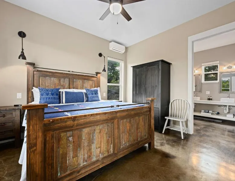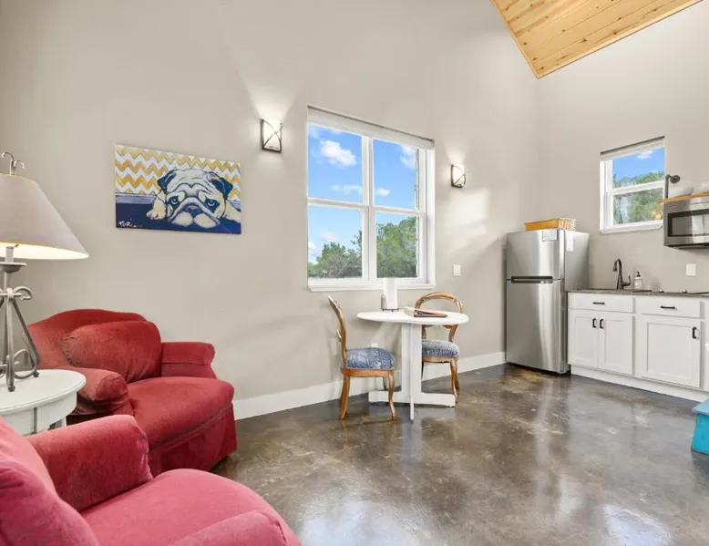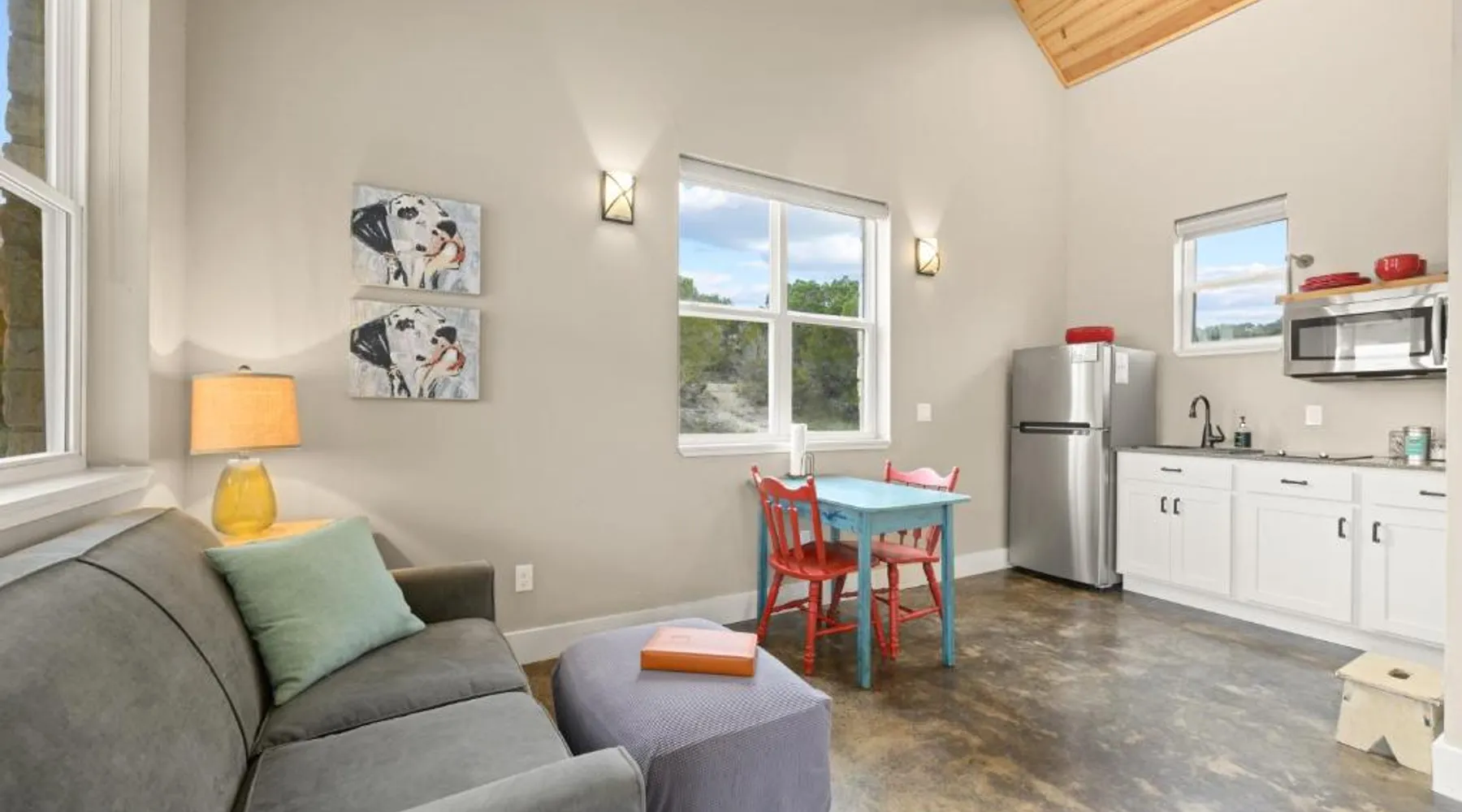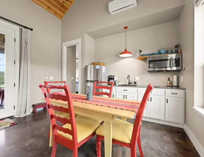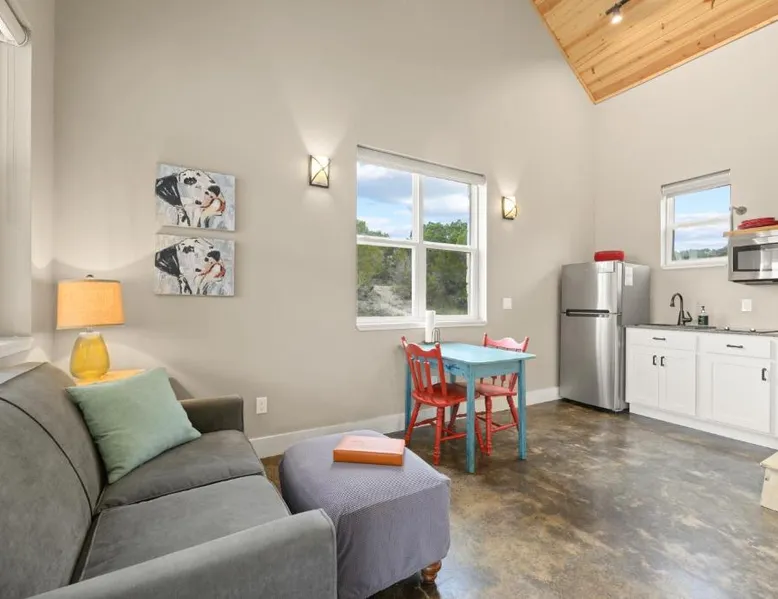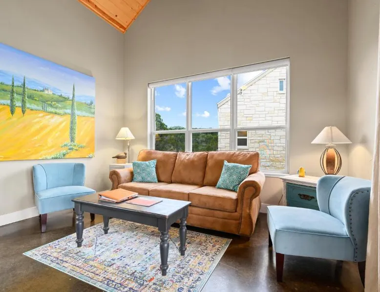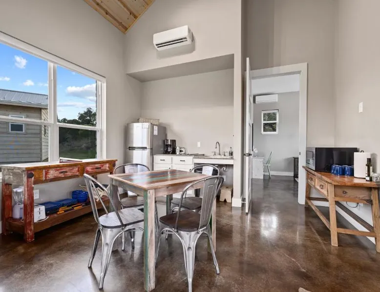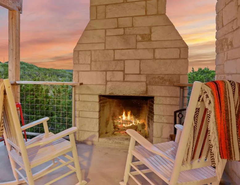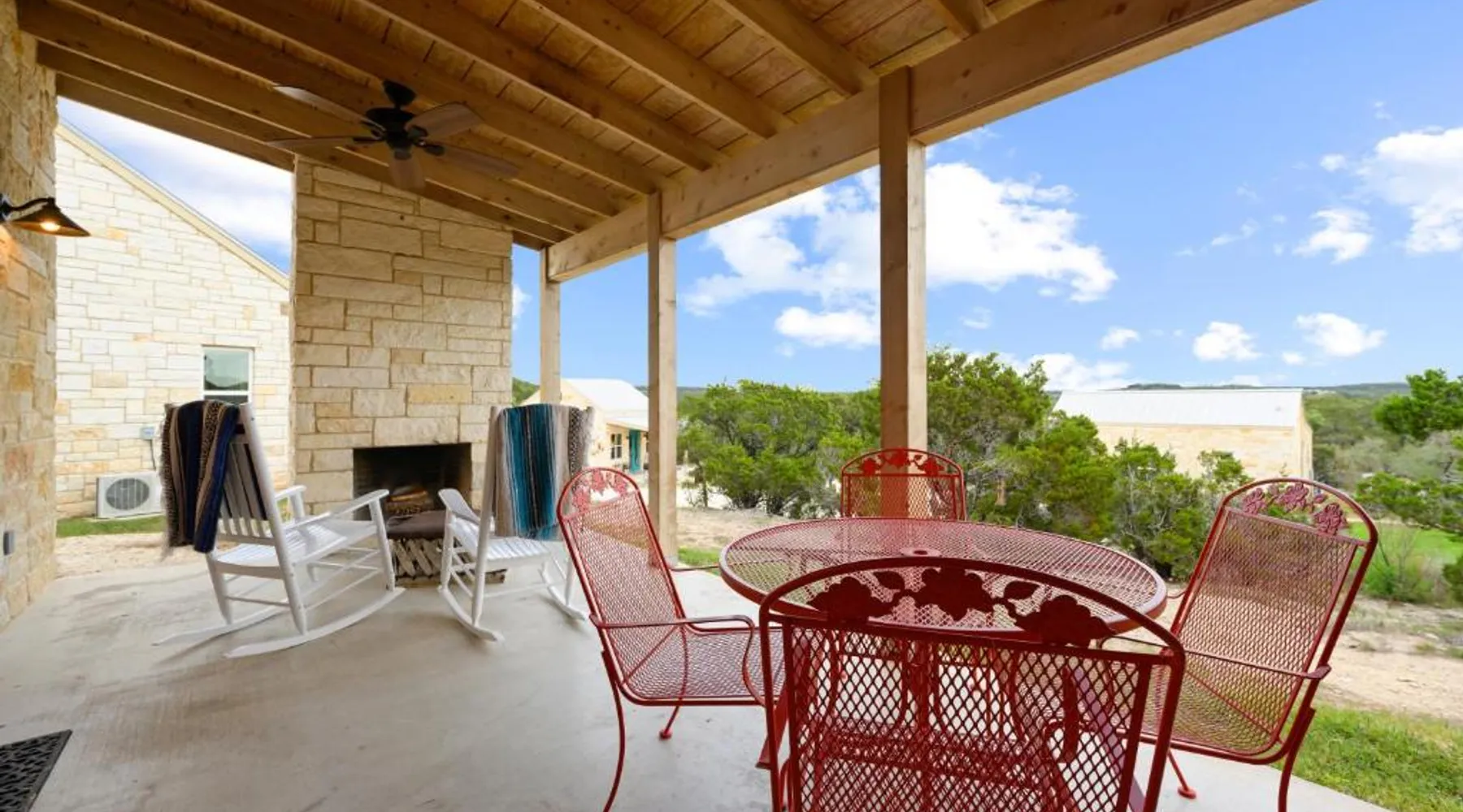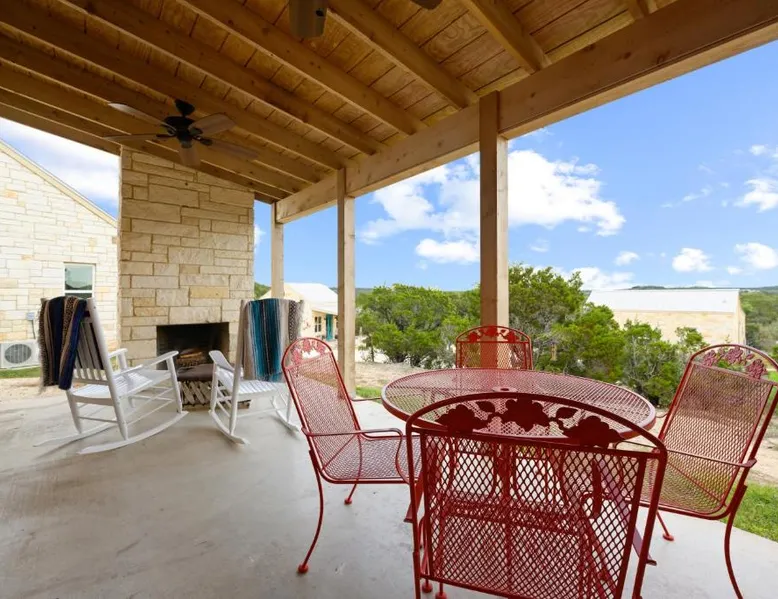 Hill Country Casitas provides accommodations with indoor and outdoor seating areas, gas grills and iconic hill country views in Dripping Springs. All units include a dining area and/or a patio. Guests can go hiking or relax in front of the fireplace. An outdoor pavilion with a chef's kitchen and a BBQ grill is available for use by guests. This property is located near local wineries, distilleries and wedding venues. Austin is 26 mi from Hill Country Casitas, while Cedar Park is 25 mi from the property. Austin-Bergstrom International Airport is 31 mi away. This holiday home features a covered porch with a fireplace and a bathroom with a double vanity and dual shower head.