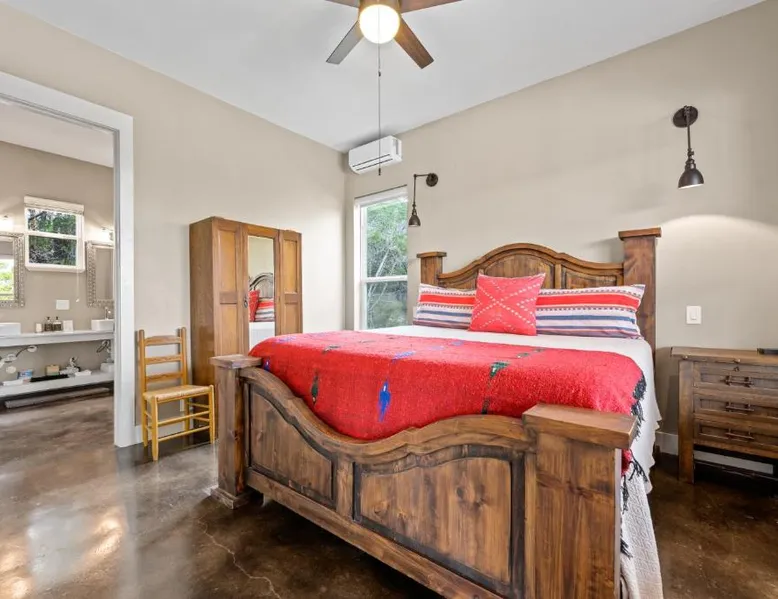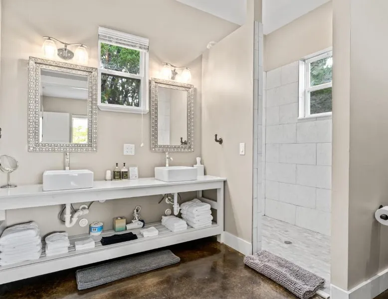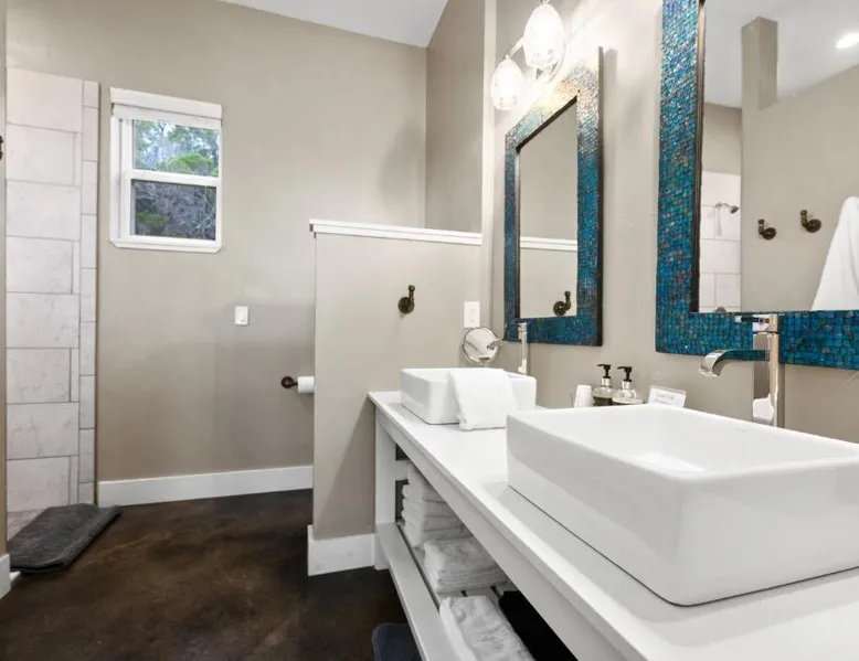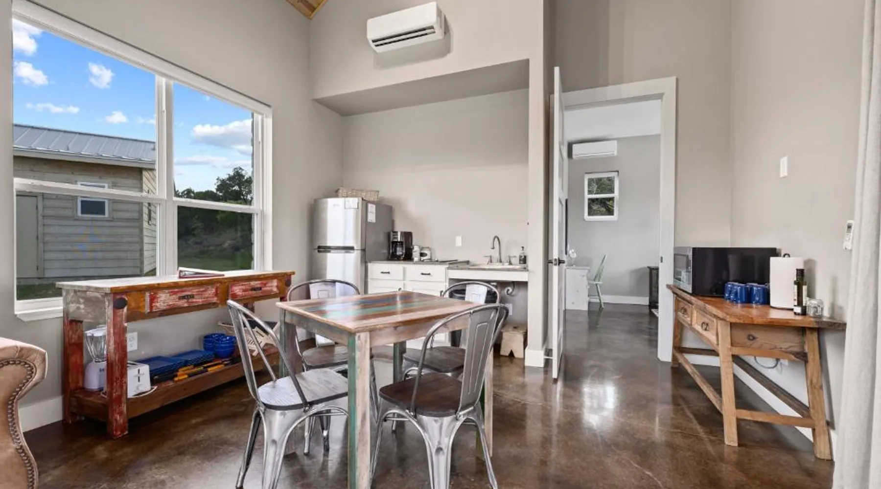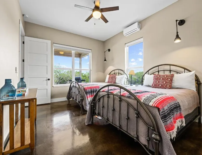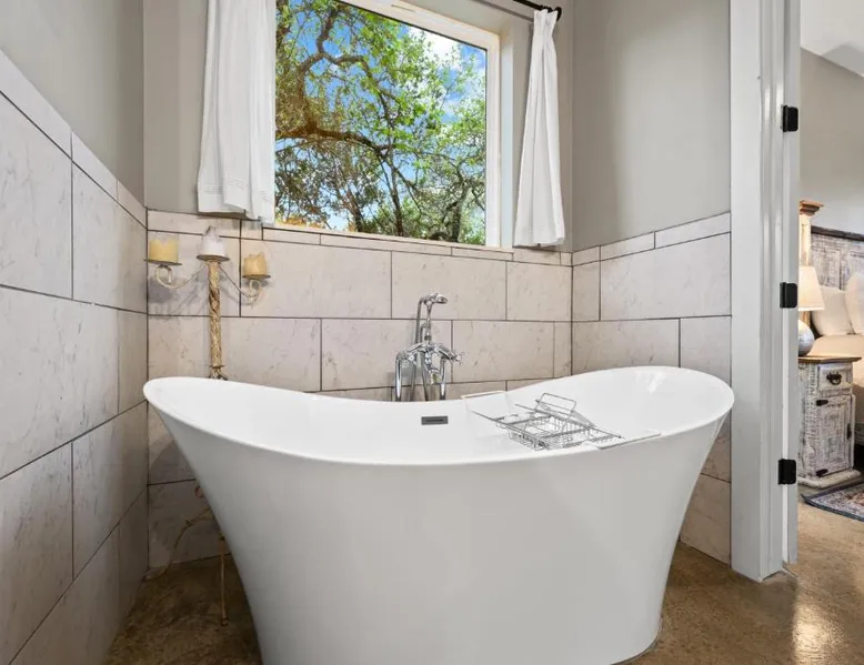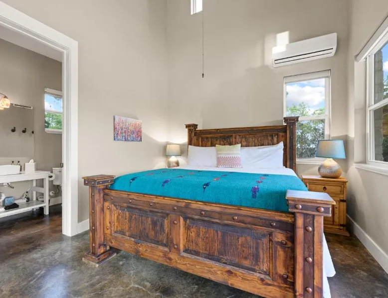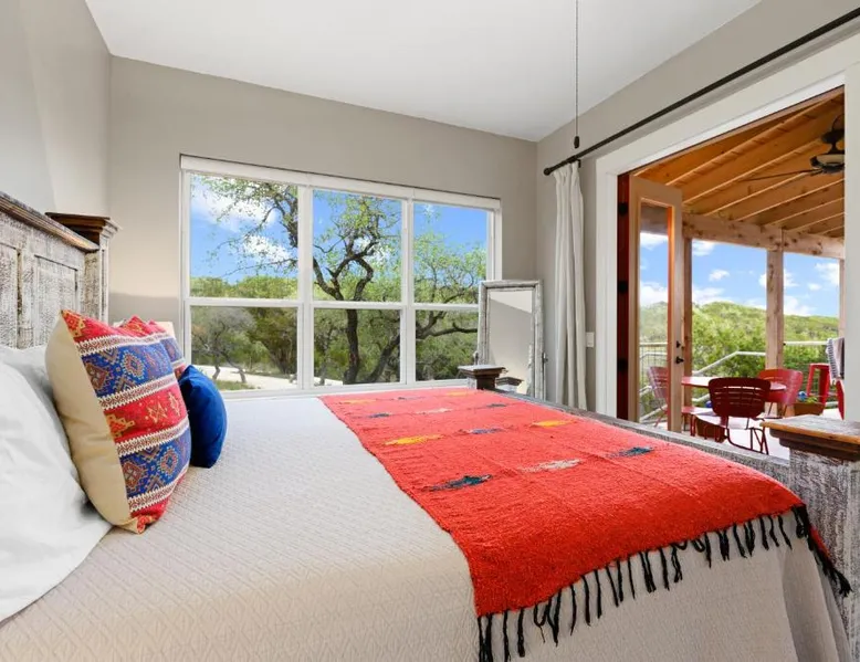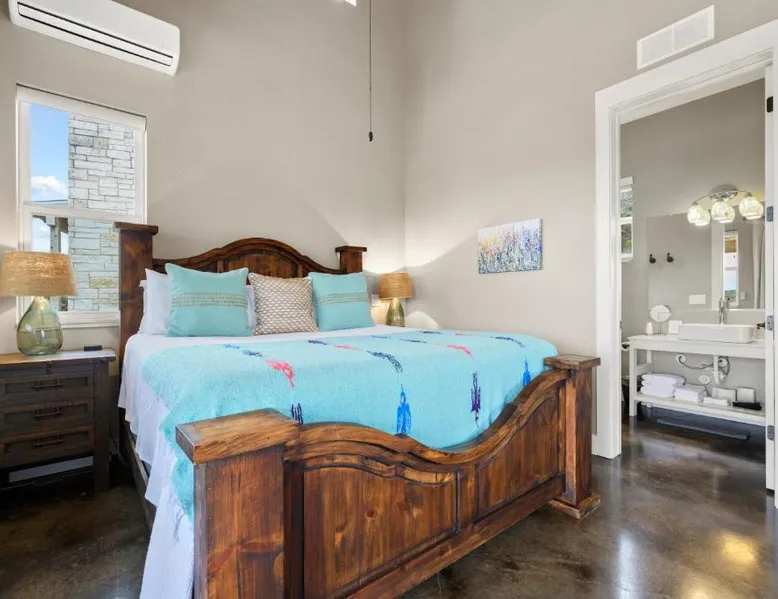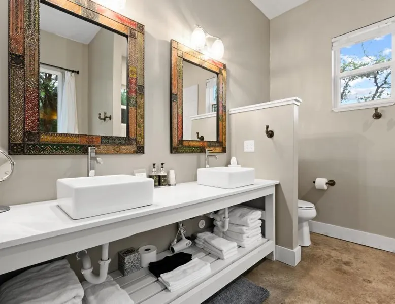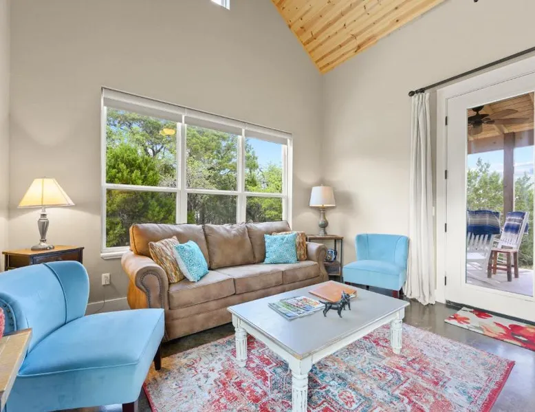 Hill Country Casitas provides accommodations with indoor and outdoor seating areas, gas grills and iconic hill country views in Dripping Springs. All units include a dining area and/or a patio. Guests can go hiking or relax in front of the fireplace. An outdoor pavilion with a chef's kitchen and a BBQ grill is available for use by guests. This property is located near local wineries, distilleries and wedding venues. Austin is 26 mi from Hill Country Casitas, while Cedar Park is 25 mi from the property. Austin-Bergstrom International Airport is 31 mi away. This holiday home features a covered porch with a fireplace and a bathroom with a double vanity and dual shower head.