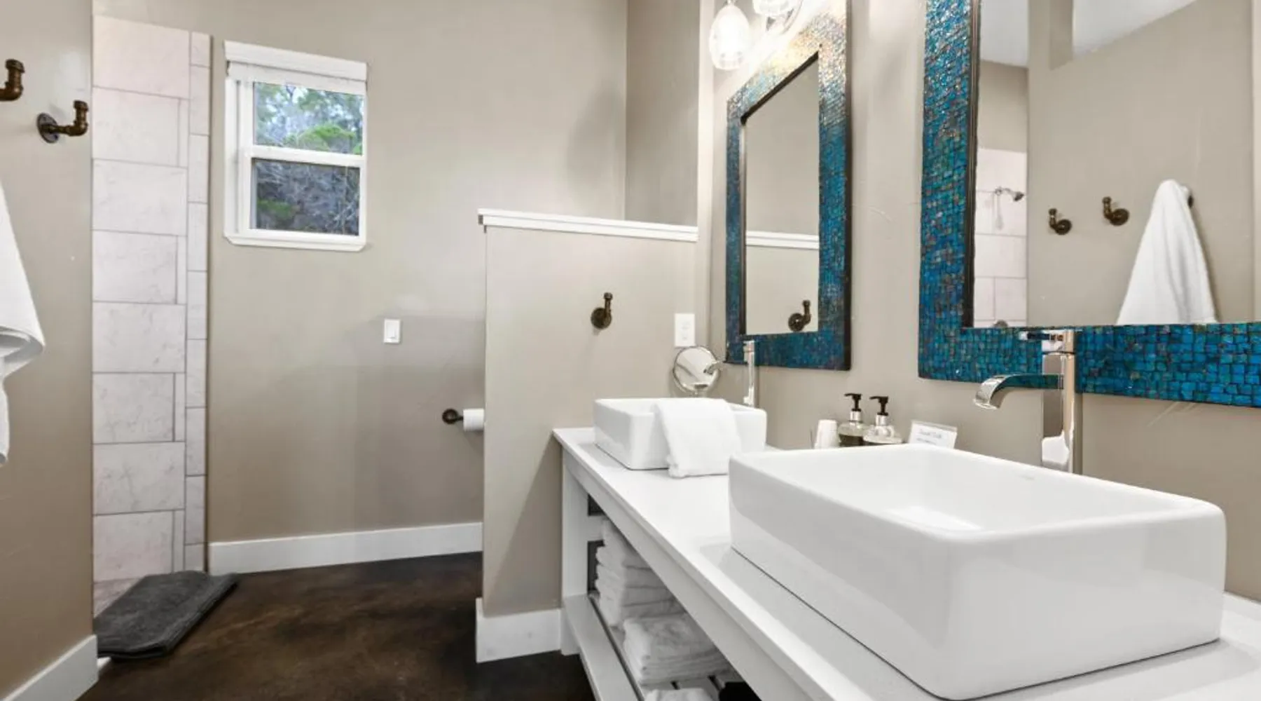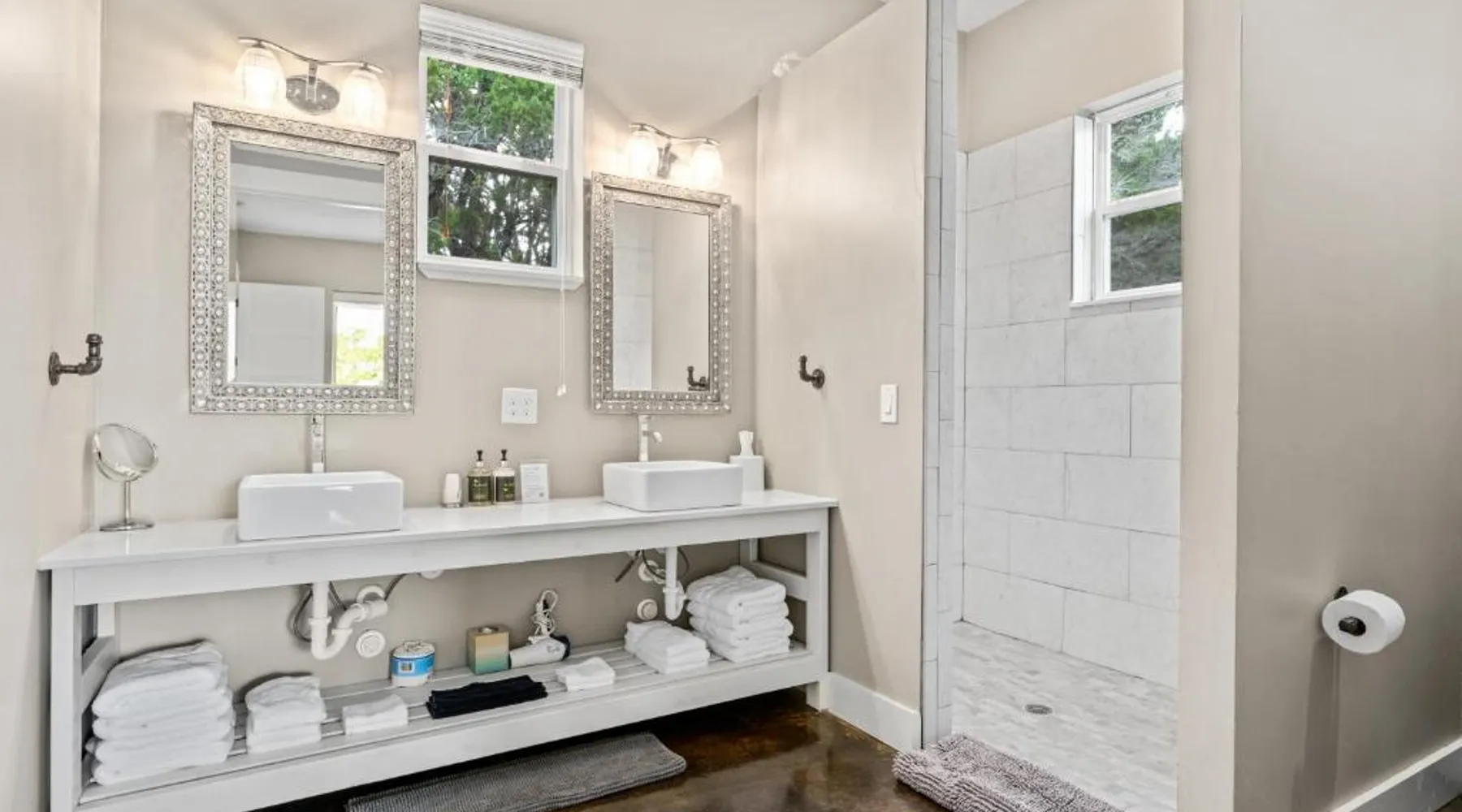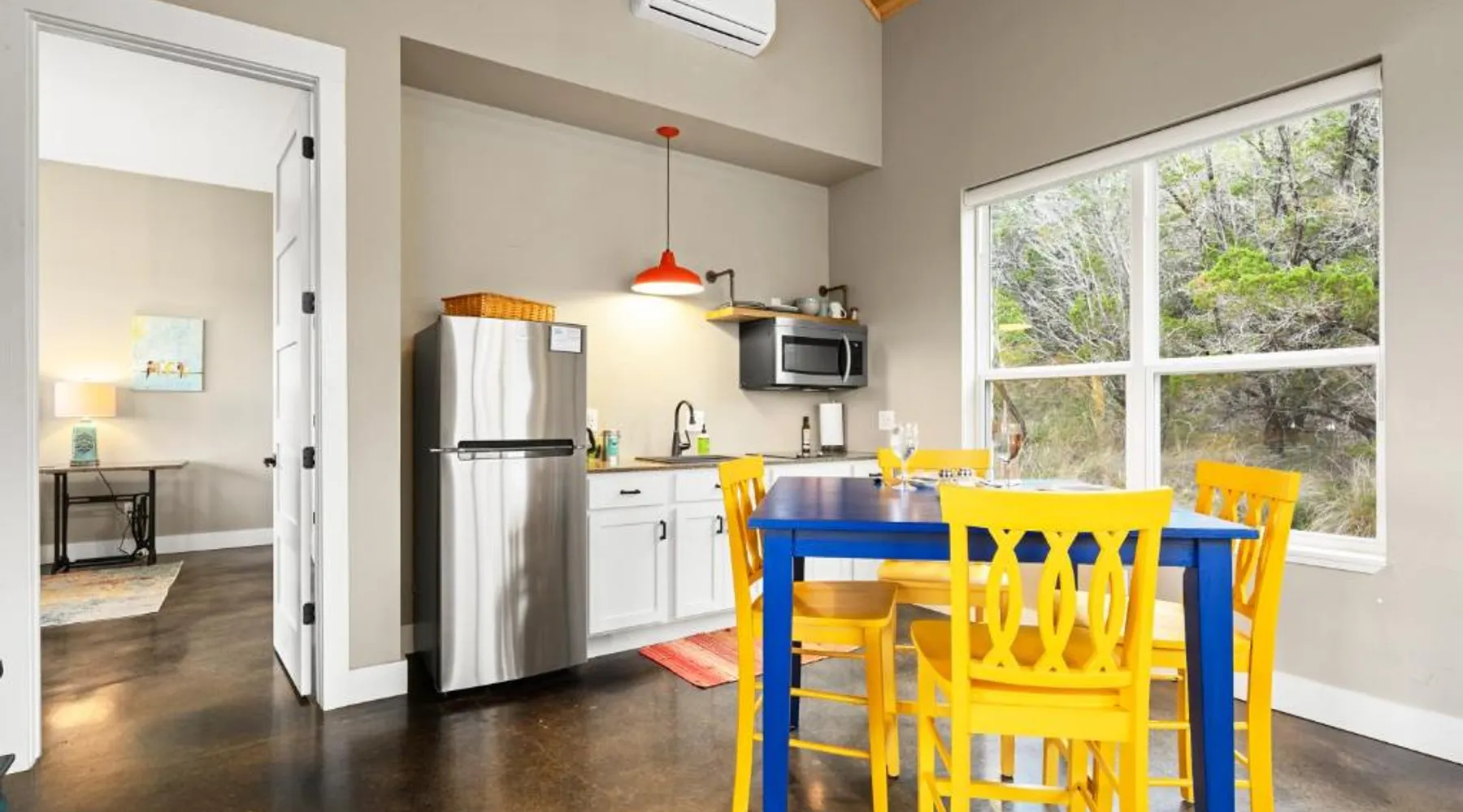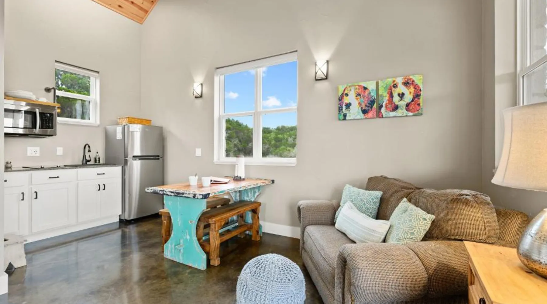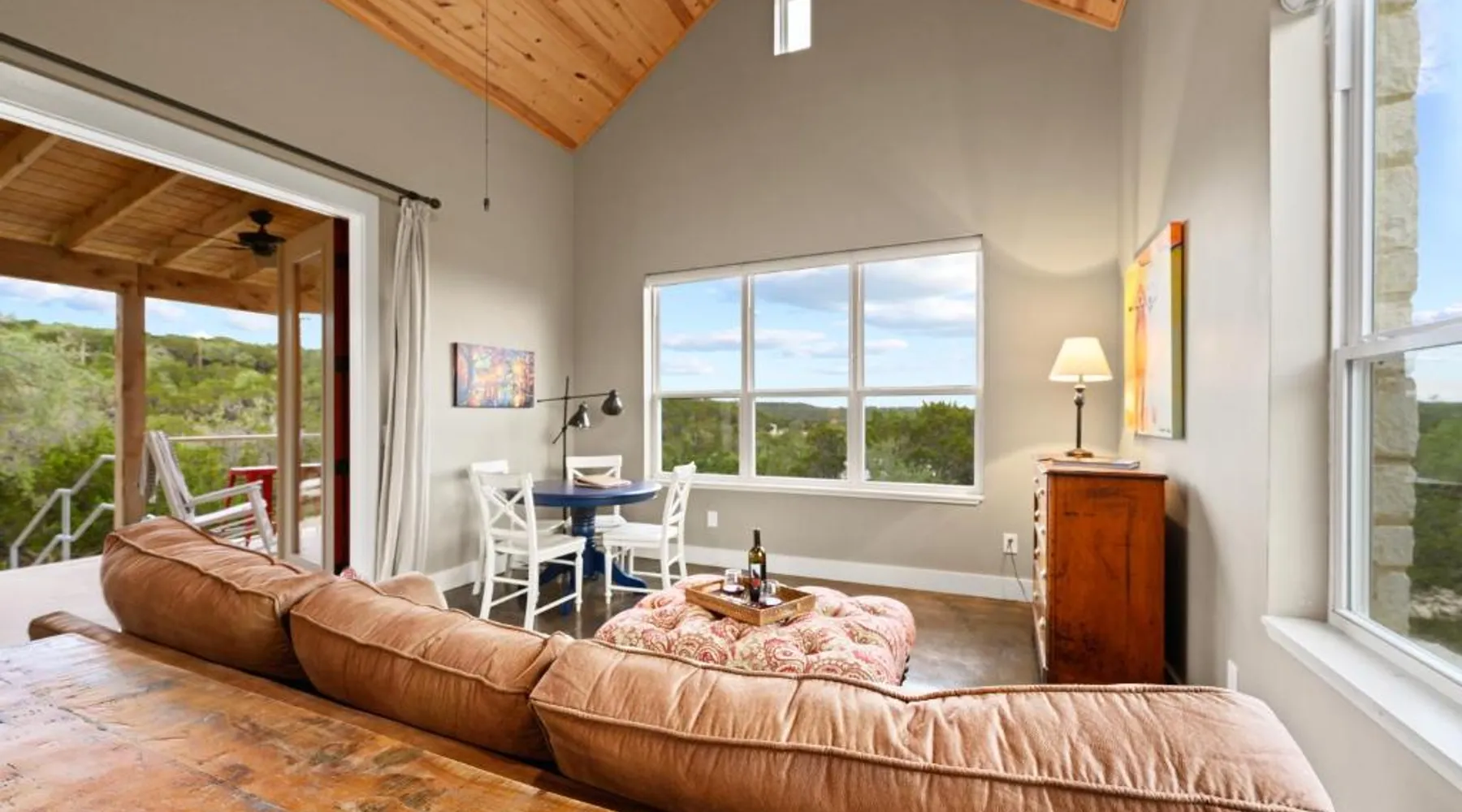 Hill Country Casitas provides accommodations with indoor and outdoor seating areas, gas grills and iconic hill country views in Dripping Springs. All units include a dining area and/or a patio. Guests can go hiking or relax in front of the fireplace. An outdoor pavilion with a chef's kitchen and a BBQ grill is available for use by guests. This property is located near local wineries, distilleries and wedding venues. Austin is 26 mi from Hill Country Casitas, while Cedar Park is 25 mi from the property. Austin-Bergstrom International Airport is 31 mi away. This holiday home features a covered porch with a fireplace and a bathroom with a double vanity and dual shower head.