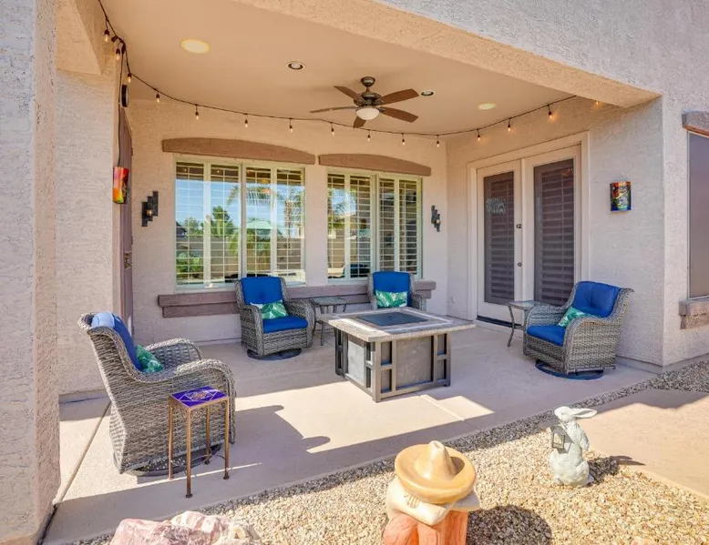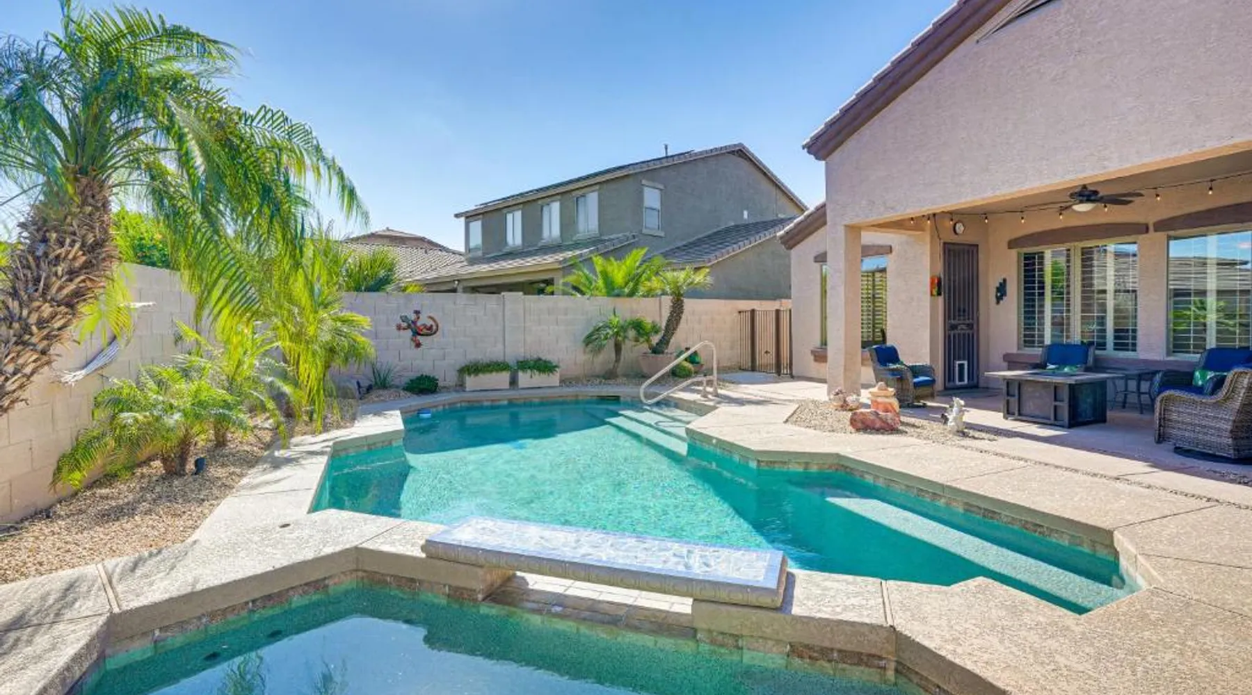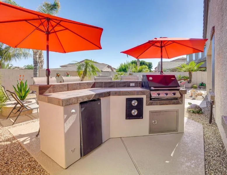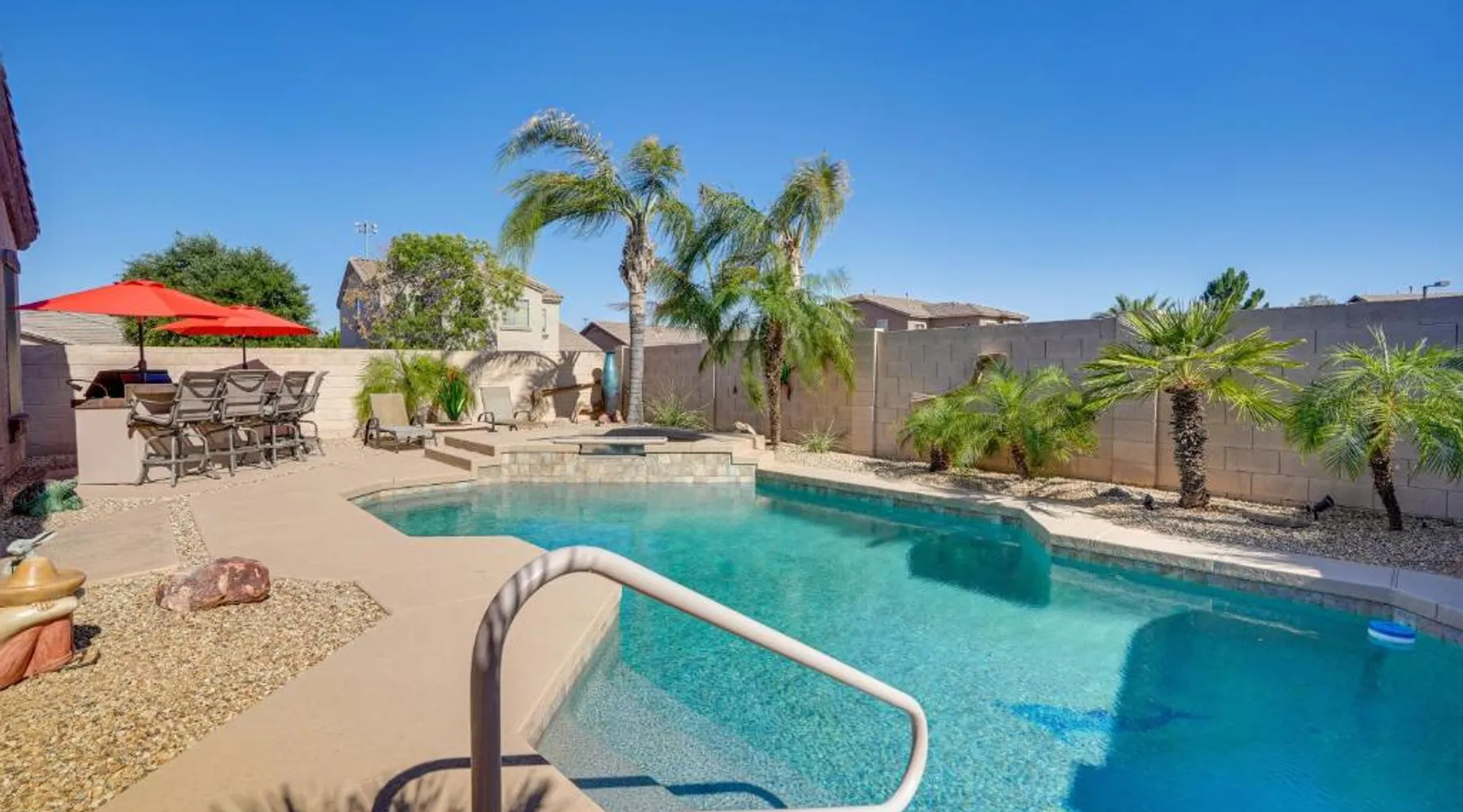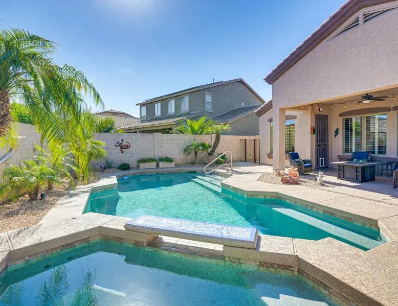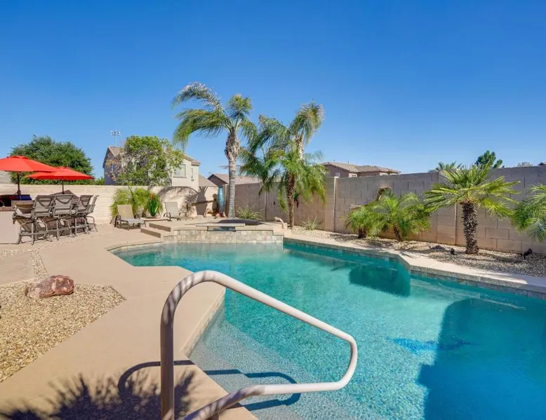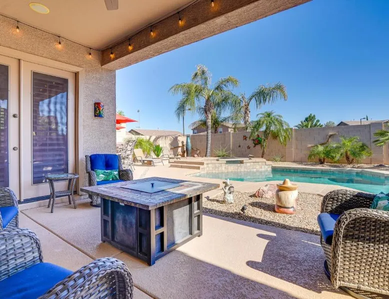 Spacious Accommodations: Walk to Parks Home with Pool in Surprise offers a spacious holiday home with three bedrooms and two bathrooms. The living room provides ample space for relaxation. Outdoor Amenities: Guests can enjoy an outdoor swimming pool and a hot tub. The property features a patio and an outdoor dining area, perfect for outdoor activities. Modern Facilities: The home includes free WiFi, air-conditioning, and a fully equipped kitchen with a coffee machine and dishwasher. Additional amenities include a washing machine, work desk, and TV. Convenient Location: Located 35 mi from Scottsdale Airport, the property is close to attractions such as State Farm Stadium (17 mi), Castles and Coasters (22 mi), and Deer Valley Rock Art Center (22 mi). Guests will have a special experience as this holiday home offers a private pool and a hot tub. Featuring a private entrance, this air-conditioned holiday home consists of 1 living room, 3 separate bedrooms and 2 bathrooms with a bath and a shower. Guests can make meals in the kitchen that is equipped with a stovetop, a refrigerator, a dishwasher and kitchenware. The spacious holiday home provides a washing machine, a coffee machine, a wardrobe, tumble dryer, as well as a flat-screen TV with cable channels. The unit offers 3 beds.