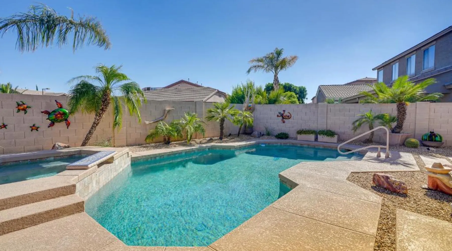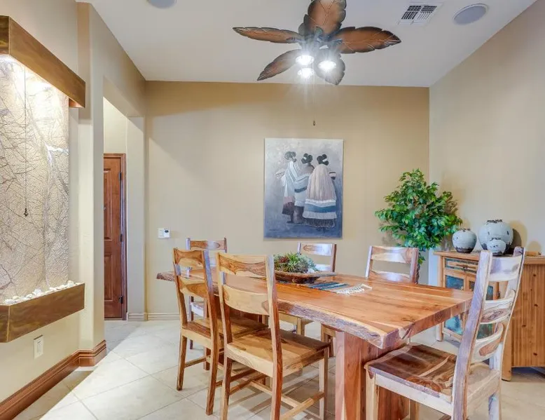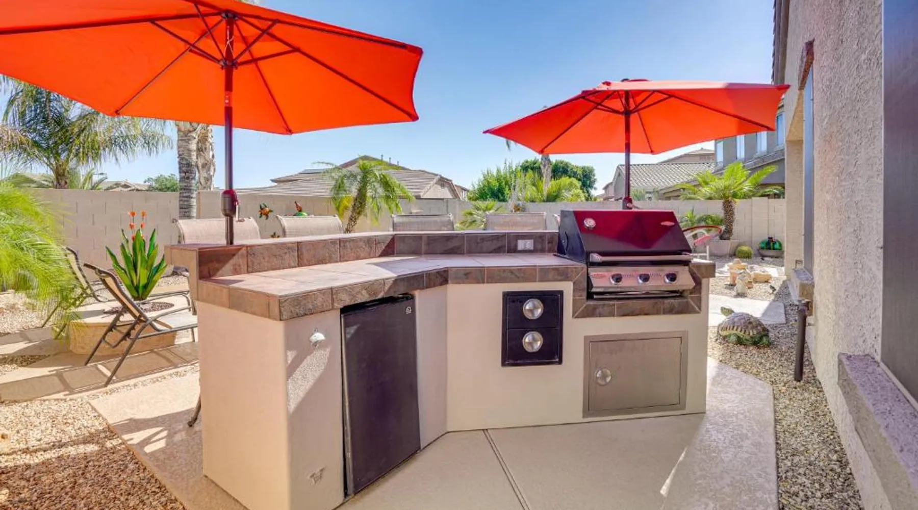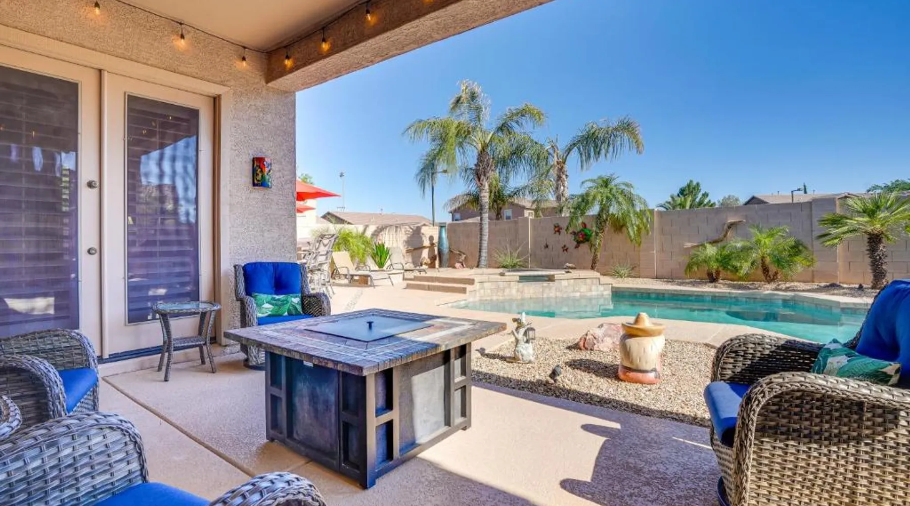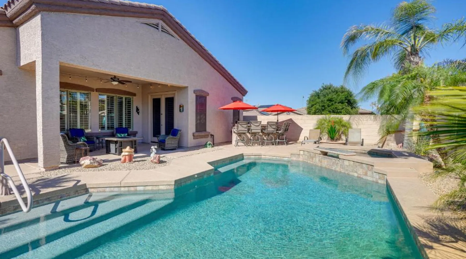 Spacious Accommodations: Walk to Parks Home with Pool in Surprise offers a spacious holiday home with three bedrooms and two bathrooms. The living room provides ample space for relaxation. Outdoor Amenities: Guests can enjoy an outdoor swimming pool and a hot tub. The property features a patio and an outdoor dining area, perfect for outdoor activities. Modern Facilities: The home includes free WiFi, air-conditioning, and a fully equipped kitchen with a coffee machine and dishwasher. Additional amenities include a washing machine, work desk, and TV. Convenient Location: Located 35 mi from Scottsdale Airport, the property is close to attractions such as State Farm Stadium (17 mi), Castles and Coasters (22 mi), and Deer Valley Rock Art Center (22 mi). Guests will have a special experience as this holiday home offers a private pool and a hot tub. Featuring a private entrance, this air-conditioned holiday home consists of 1 living room, 3 separate bedrooms and 2 bathrooms with a bath and a shower. Guests can make meals in the kitchen that is equipped with a stovetop, a refrigerator, a dishwasher and kitchenware. The spacious holiday home provides a washing machine, a coffee machine, a wardrobe, tumble dryer, as well as a flat-screen TV with cable channels. The unit offers 3 beds.