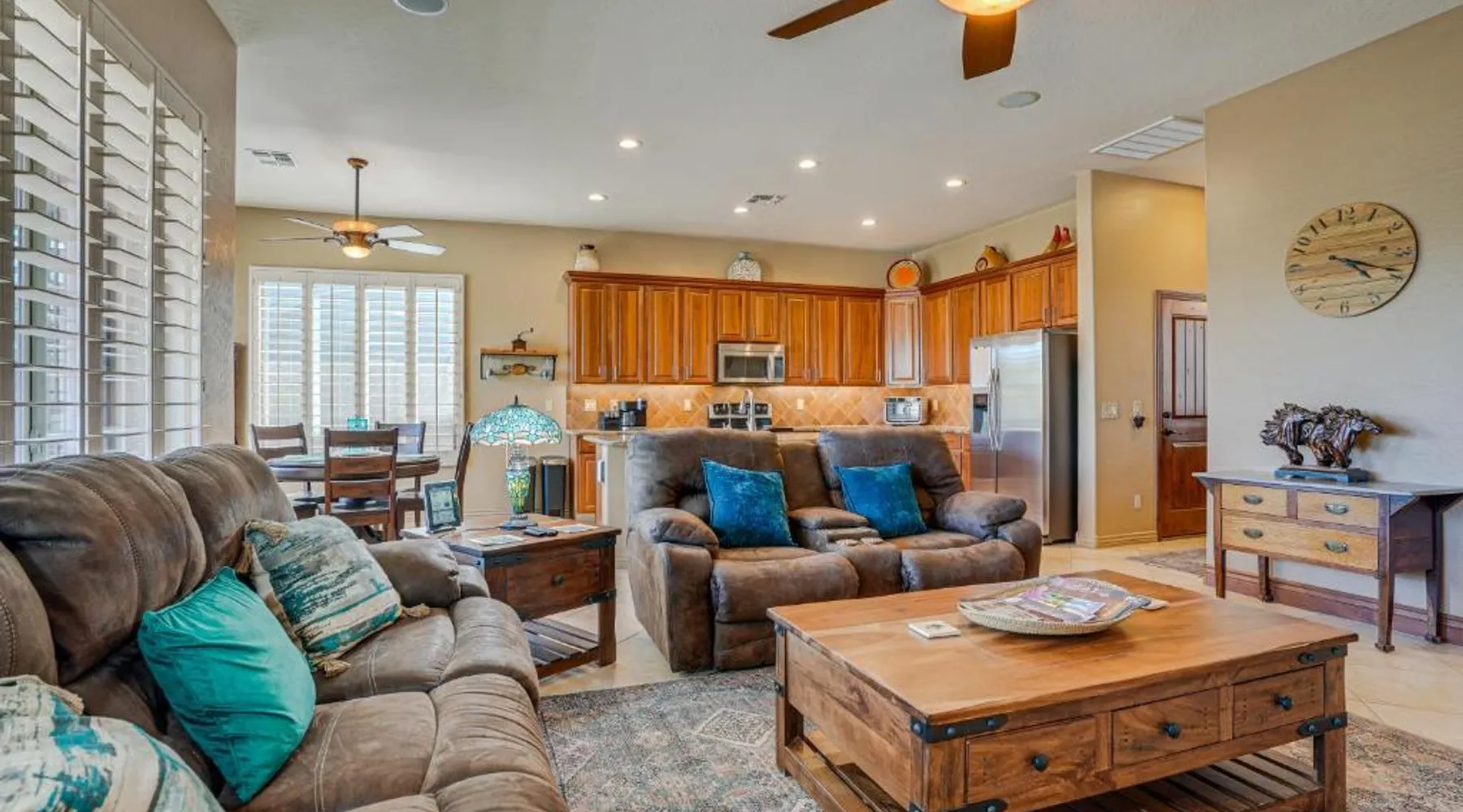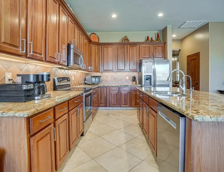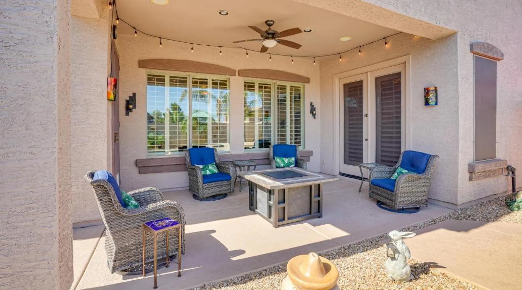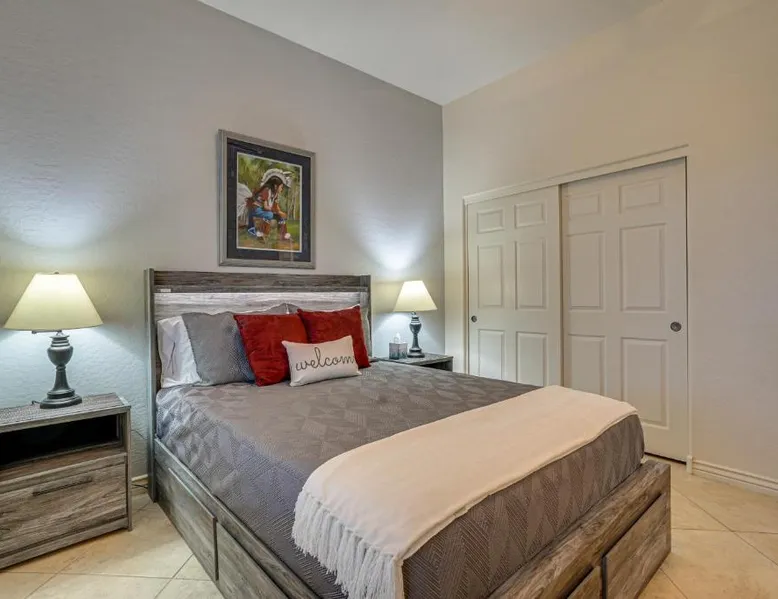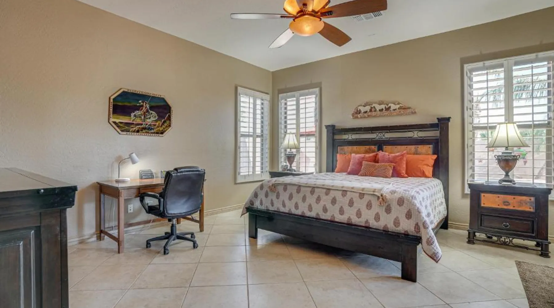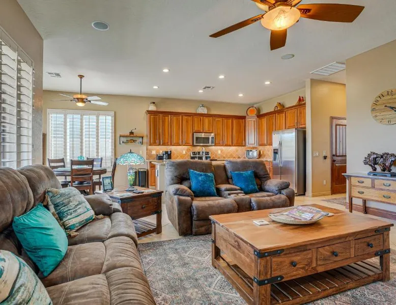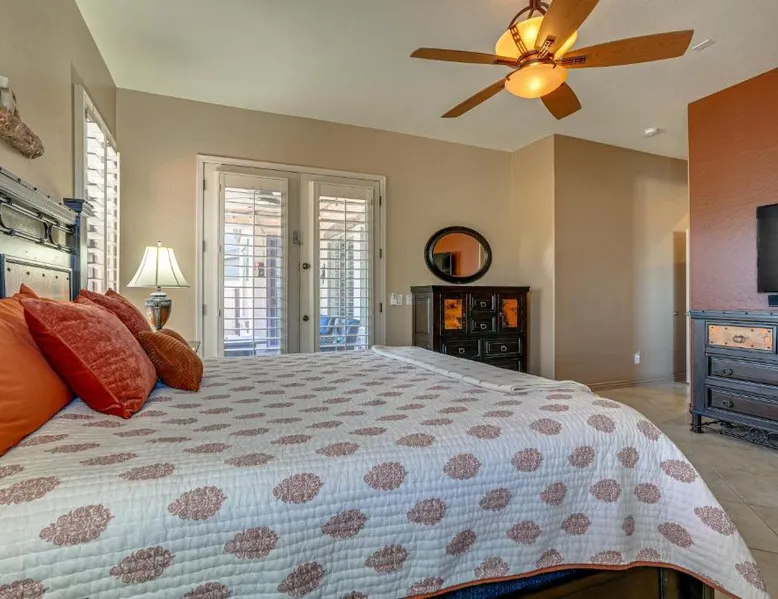 Spacious Accommodations: Walk to Parks Home with Pool in Surprise offers a spacious holiday home with three bedrooms and two bathrooms. The living room provides ample space for relaxation. Outdoor Amenities: Guests can enjoy an outdoor swimming pool and a hot tub. The property features a patio and an outdoor dining area, perfect for outdoor activities. Modern Facilities: The home includes free WiFi, air-conditioning, and a fully equipped kitchen with a coffee machine and dishwasher. Additional amenities include a washing machine, work desk, and TV. Convenient Location: Located 35 mi from Scottsdale Airport, the property is close to attractions such as State Farm Stadium (17 mi), Castles and Coasters (22 mi), and Deer Valley Rock Art Center (22 mi). Guests will have a special experience as this holiday home offers a private pool and a hot tub. Featuring a private entrance, this air-conditioned holiday home consists of 1 living room, 3 separate bedrooms and 2 bathrooms with a bath and a shower. Guests can make meals in the kitchen that is equipped with a stovetop, a refrigerator, a dishwasher and kitchenware. The spacious holiday home provides a washing machine, a coffee machine, a wardrobe, tumble dryer, as well as a flat-screen TV with cable channels. The unit offers 3 beds.