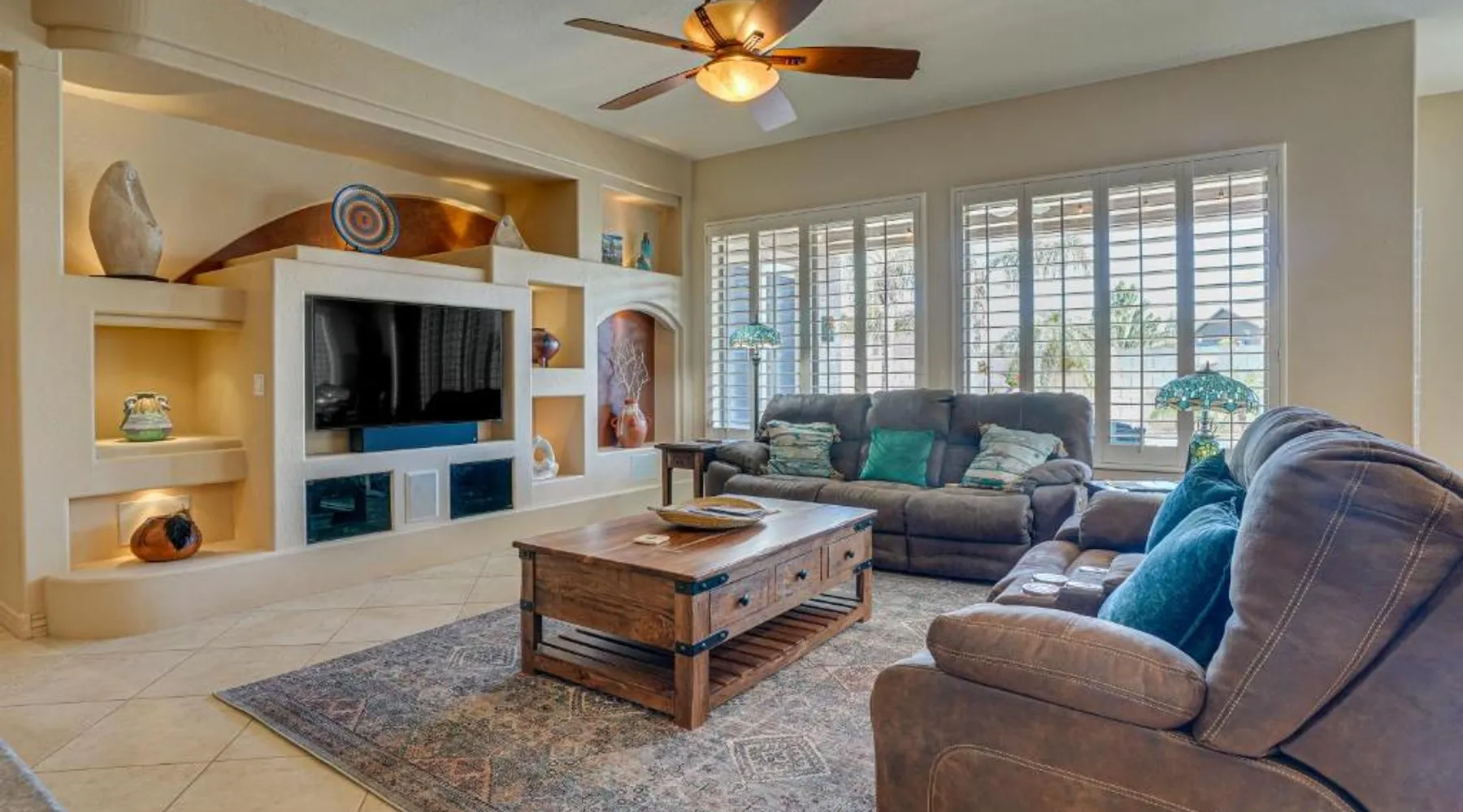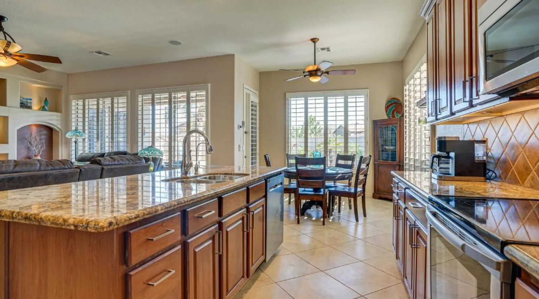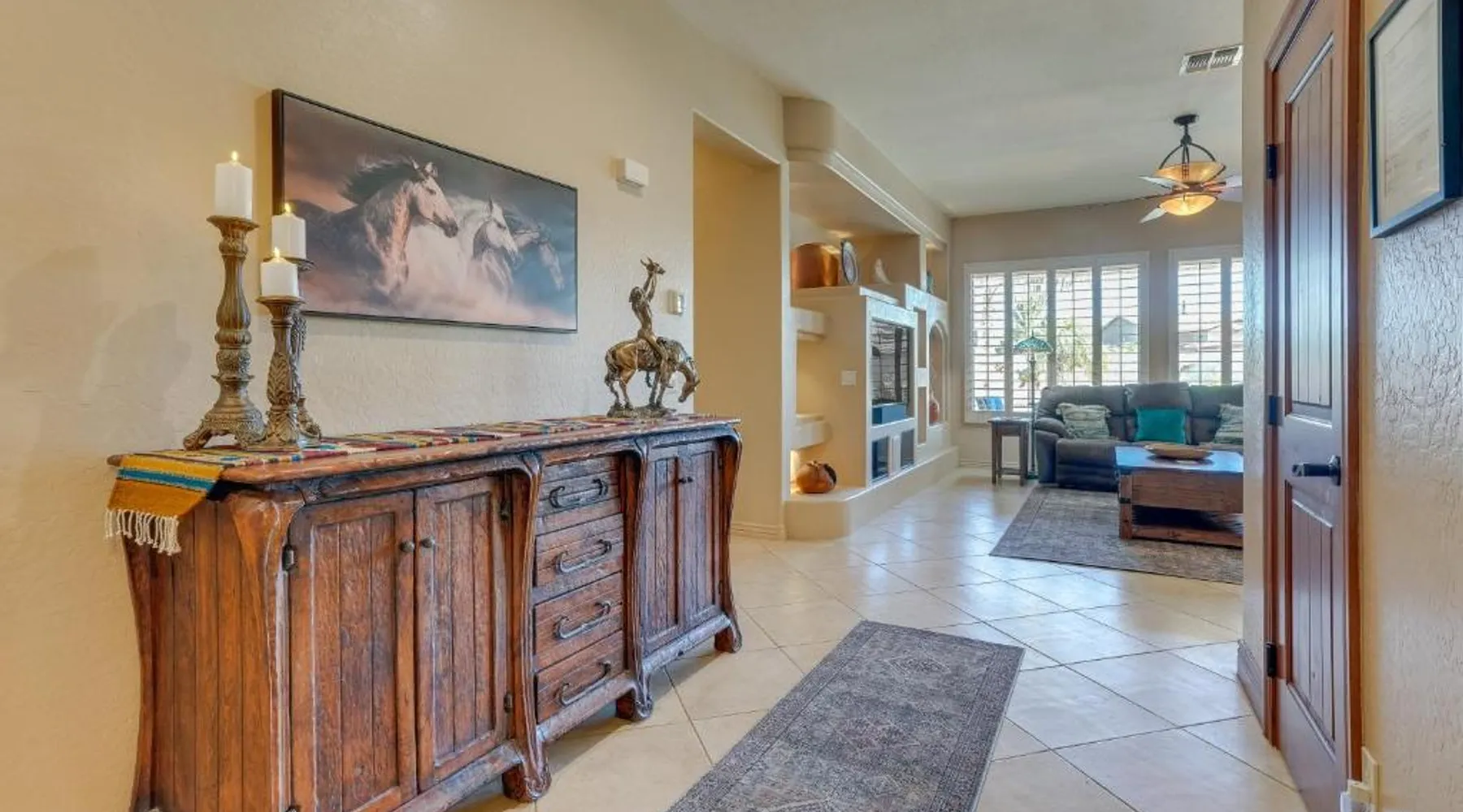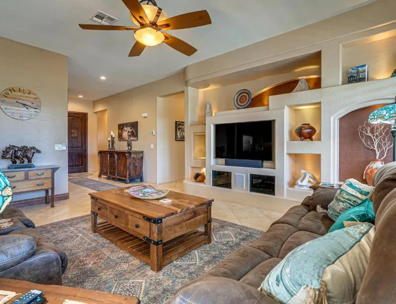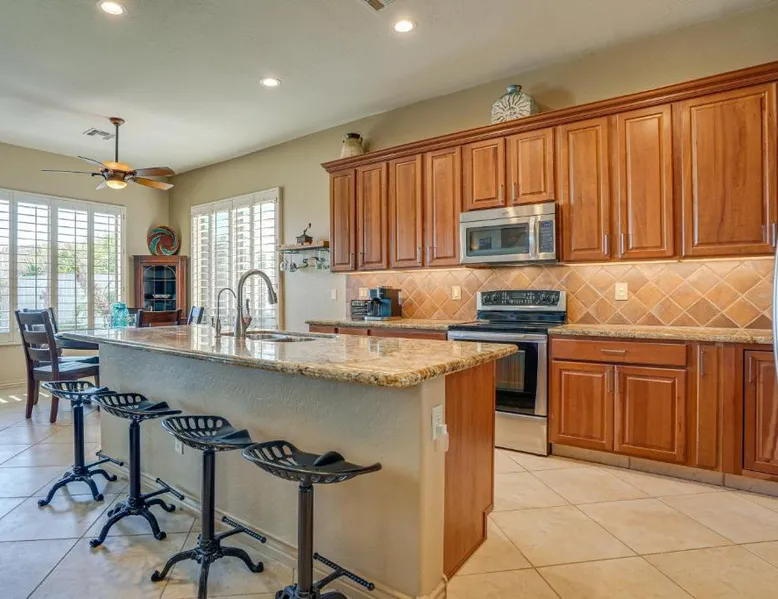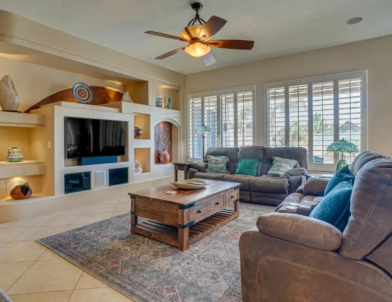 Spacious Accommodations: Walk to Parks Home with Pool in Surprise offers a spacious holiday home with three bedrooms and two bathrooms. The living room provides ample space for relaxation. Outdoor Amenities: Guests can enjoy an outdoor swimming pool and a hot tub. The property features a patio and an outdoor dining area, perfect for outdoor activities. Modern Facilities: The home includes free WiFi, air-conditioning, and a fully equipped kitchen with a coffee machine and dishwasher. Additional amenities include a washing machine, work desk, and TV. Convenient Location: Located 35 mi from Scottsdale Airport, the property is close to attractions such as State Farm Stadium (17 mi), Castles and Coasters (22 mi), and Deer Valley Rock Art Center (22 mi). Guests will have a special experience as this holiday home offers a private pool and a hot tub. Featuring a private entrance, this air-conditioned holiday home consists of 1 living room, 3 separate bedrooms and 2 bathrooms with a bath and a shower. Guests can make meals in the kitchen that is equipped with a stovetop, a refrigerator, a dishwasher and kitchenware. The spacious holiday home provides a washing machine, a coffee machine, a wardrobe, tumble dryer, as well as a flat-screen TV with cable channels. The unit offers 3 beds.