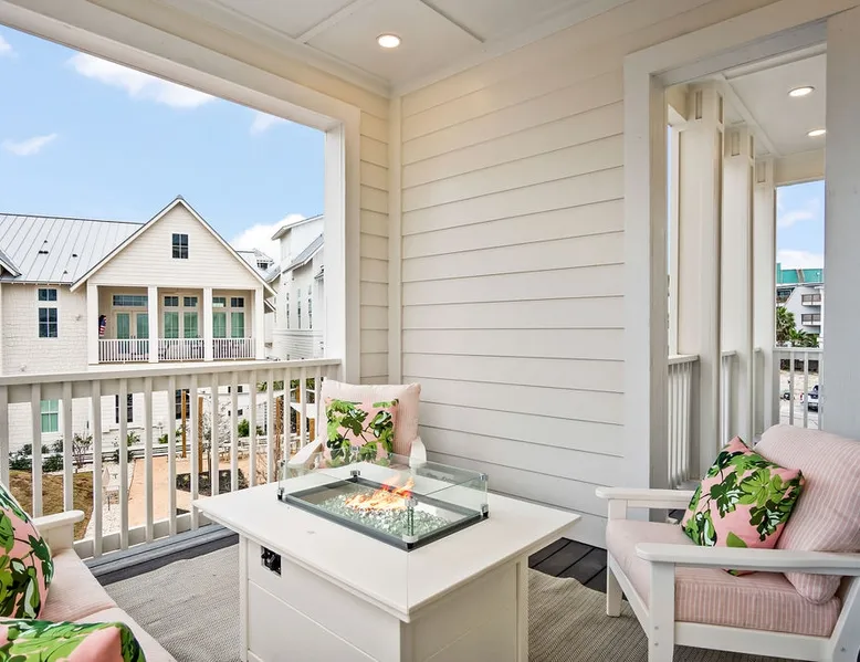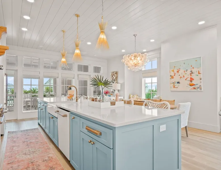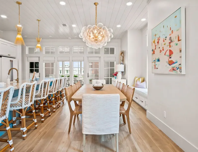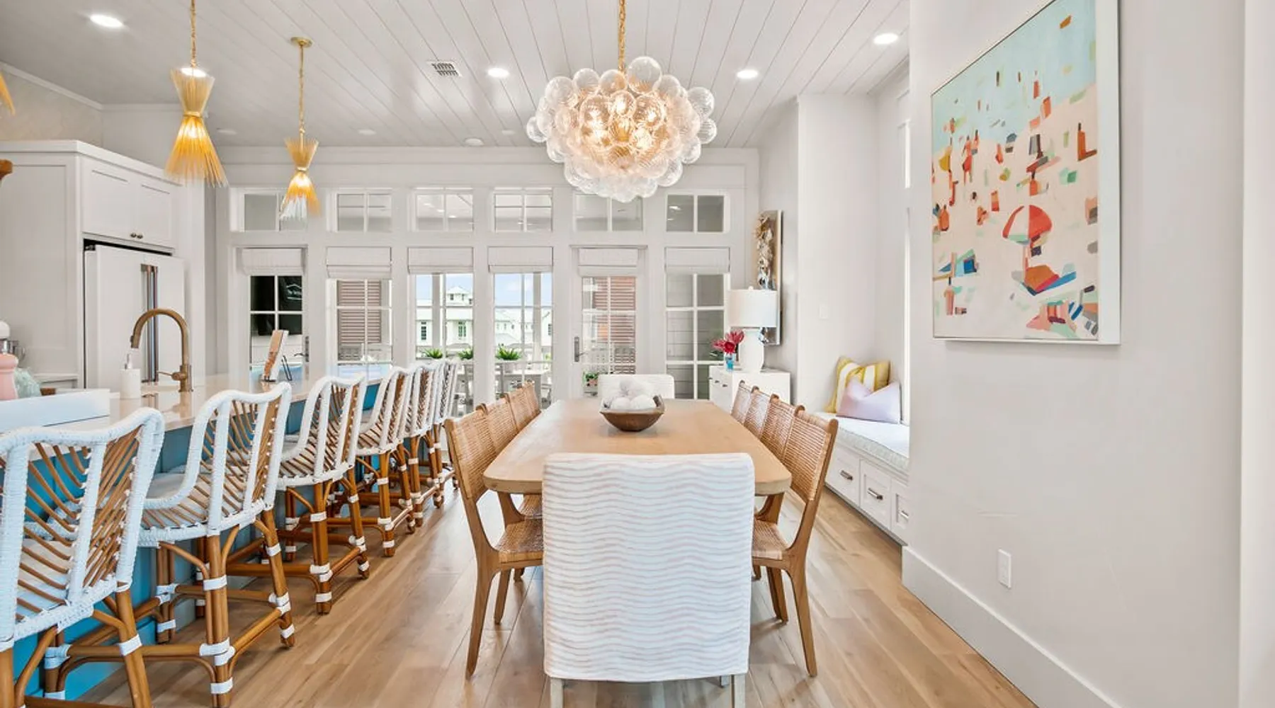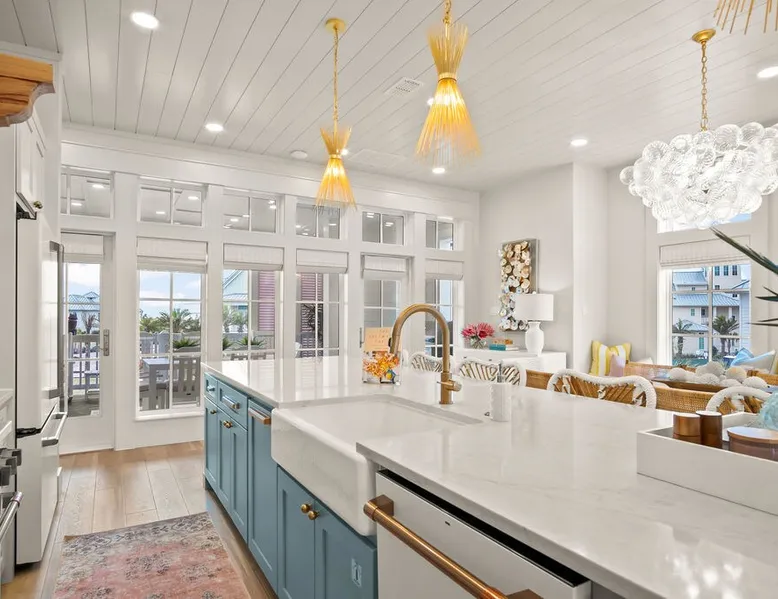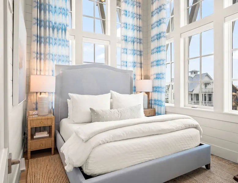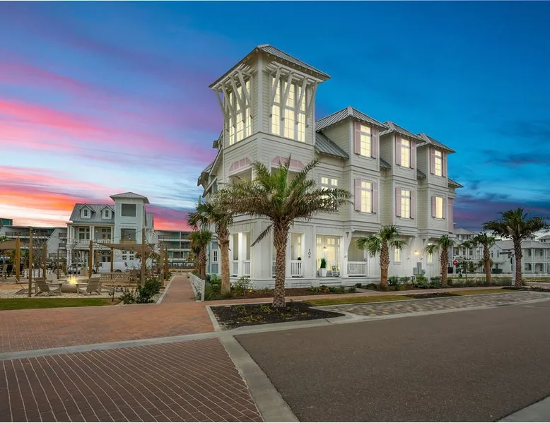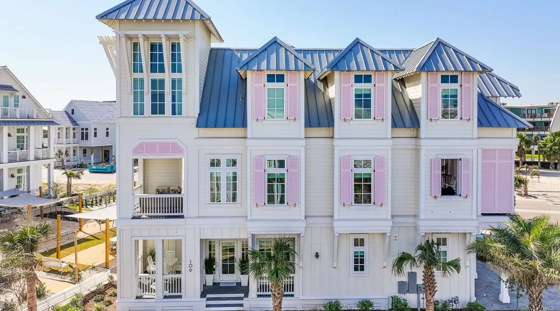 Shuttered island style defines this ethereal, three-story beach home at Cinnamon Shore South. With elevator and designer details, it’s a serene, coastal sanctuary where light floods every corner, creating a sense of warmth and openness. Overlook charming Tailwind Park and get access to 20-plus, lavish amenities, including nearby luxury pools and private beach access just one block away. The space MAIN LIVING SPACE: You’ll relax the minute you step inside this gleaming white home decked with pink shutters. Soft, neutral tones dress décor, with clean white walls and creamy linen furnishings exuding a sense of calm and elegance. Touches of ocean-inspired pinks, blues, and greens add subtle pops of color. The heart of the home is the 2nd-floor open concept living room, with sweeping views through large windows to the adjacent pocket park and coastal landscape. Lounge under 9-foot ceilings on a comfortable sectional, other plush seating, or a pair of window seats, as sunlight floods inside. A gourmet kitchen overlooks the dining area for 10, where you can host seafood suppers or epic game nights. Enjoy generous counterspace on the large island with seating for 6, along with Café Appliances and butler’s pantry w/ wet bar and wine fridge, perfect for entertaining. Prep for everyday meals and special occasions in this elegant space, while the crowd spills onto one of several covered decks. On the grilling balcony, an outdoor dining table and a row of rocking chairs have a great view of the wall-mounted TV. Lounge, dine, and toast to the coast, then light the fire pit on the front balcony for cozy nights under the stars. A downstairs den with wet bar and wicker desk tucked under the stairway accommodates smaller groups. SLEEPING QUARTERS: In a third-floor primary suite, drapes fall from the highest of ceilings to the floor, framing the king-size bed. In the luxe luxe bathroom a rich, marbleized tile surrounds the shower. Another king suite, a queen suite, and bunk for 4 with mariner style accommodate guests. A queen-size pull-out sofa sleeps two more. Every room features details that delight all with ensuite bathrooms. The bunk room’s island-chart wallpaper, private balcony, and bathroom with bench seating shower makes kids feel special too. GREAT FEATURES: Unique amenities abound! The pink vanity and designer wallpaper in a powder room, for instance. Or the artwork in the elevator that you can admire while zipping up or down to all three levels. A port-a-crib and booster seat make it easy for young families to do the beach. And tech features make it even more fun: 8 smart TVs, Sonos sound systems, and exterior speakers. While the larger car garage is not available, you have access to the secured golf cart garage for safely storing beach gear or a golf cart during your stay. At Dancing Queen, sophistication meets the sea. It’s perfect for family vacations, group getaways, or a relaxing beach retreat with all the comforts and amenities you could desire. 2 Kings, 1 Queen, 1 Twin Bunk, 2 Single Twins, 1 Queen Sleeper Sofa ***NO PETS ALLOWED*** IF A PET IS SEEN ENTERING A NON-PET FRIENDLY HOME, GUEST WILL BE CHARGED A PENALTY AND/OR EVICTED. Dancing Queen is a non-pet friendly property, if a pet is seen entering Dancing Queen the homeowner and/or Cinnamon Shore Vacation Rentals has the right to immediately evict the renter with no refunds, regardless of time of day or night. An automatic non-refundable penalty fee of $1000 will be added to the reservation, as well as any additional charges related to cleaning fees and/or damage in the home. Please review all policies at: *Please be advised there is construction beside this property. Construction is limited to normal business hours 8am-6pm Monday-Saturday. Please call the office for more information. **Driving 1.5 miles is necessary from Cinnamon Shore South to access Cinnamon Shore North's amenities. *Smart TV and Live TV capabilities available, no direct cable. STR#603251