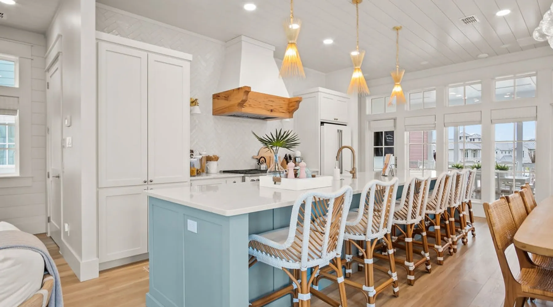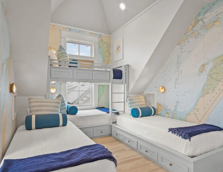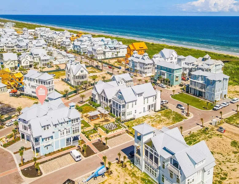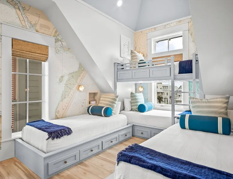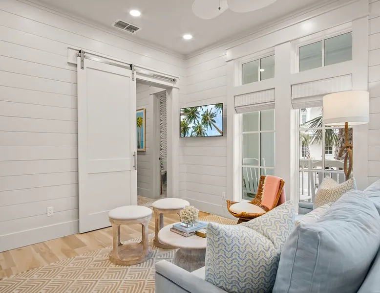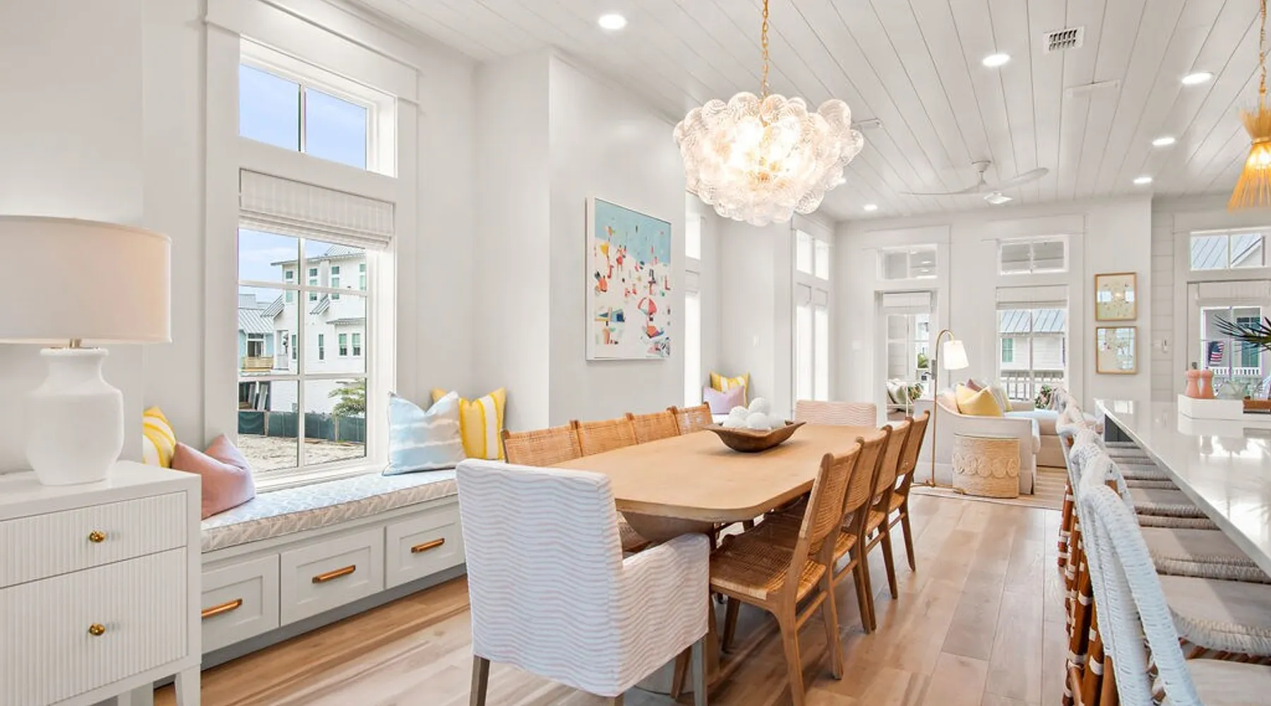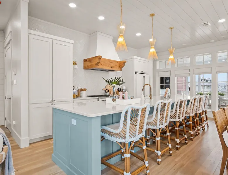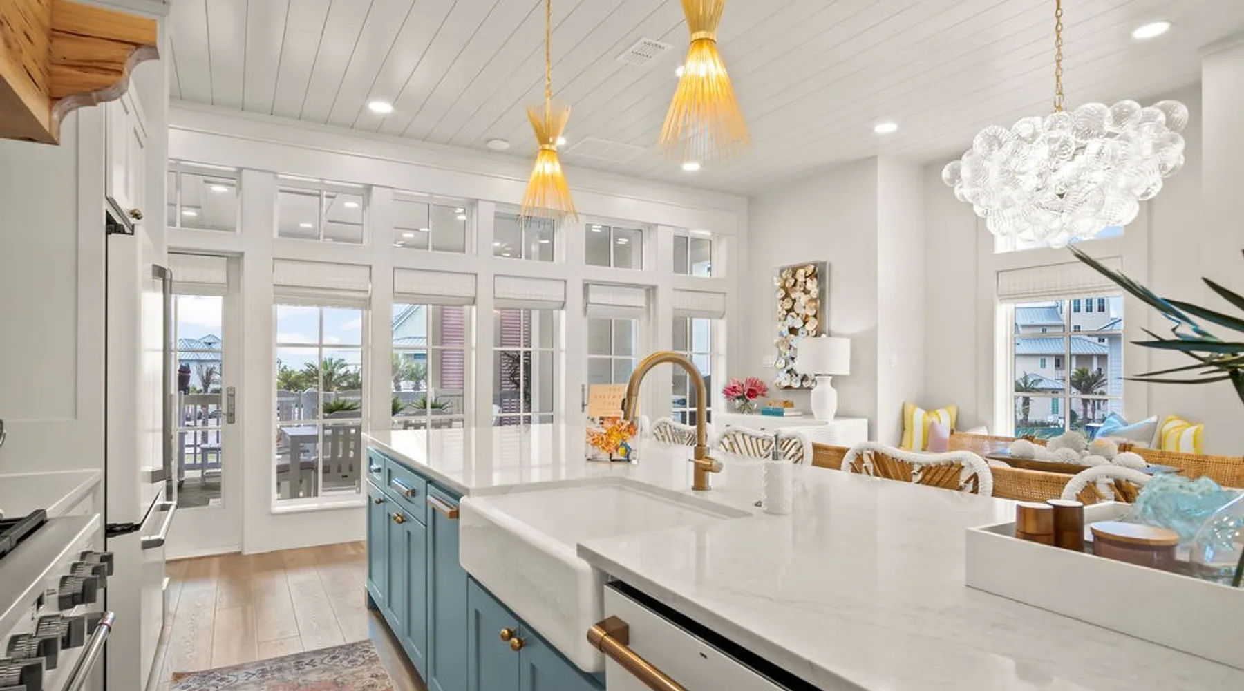 Shuttered island style defines this ethereal, three-story beach home at Cinnamon Shore South. With elevator and designer details, it’s a serene, coastal sanctuary where light floods every corner, creating a sense of warmth and openness. Overlook charming Tailwind Park and get access to 20-plus, lavish amenities, including nearby luxury pools and private beach access just one block away. The space MAIN LIVING SPACE: You’ll relax the minute you step inside this gleaming white home decked with pink shutters. Soft, neutral tones dress décor, with clean white walls and creamy linen furnishings exuding a sense of calm and elegance. Touches of ocean-inspired pinks, blues, and greens add subtle pops of color. The heart of the home is the 2nd-floor open concept living room, with sweeping views through large windows to the adjacent pocket park and coastal landscape. Lounge under 9-foot ceilings on a comfortable sectional, other plush seating, or a pair of window seats, as sunlight floods inside. A gourmet kitchen overlooks the dining area for 10, where you can host seafood suppers or epic game nights. Enjoy generous counterspace on the large island with seating for 6, along with Café Appliances and butler’s pantry w/ wet bar and wine fridge, perfect for entertaining. Prep for everyday meals and special occasions in this elegant space, while the crowd spills onto one of several covered decks. On the grilling balcony, an outdoor dining table and a row of rocking chairs have a great view of the wall-mounted TV. Lounge, dine, and toast to the coast, then light the fire pit on the front balcony for cozy nights under the stars. A downstairs den with wet bar and wicker desk tucked under the stairway accommodates smaller groups. SLEEPING QUARTERS: In a third-floor primary suite, drapes fall from the highest of ceilings to the floor, framing the king-size bed. In the luxe luxe bathroom a rich, marbleized tile surrounds the shower. Another king suite, a queen suite, and bunk for 4 with mariner style accommodate guests. A queen-size pull-out sofa sleeps two more. Every room features details that delight all with ensuite bathrooms. The bunk room’s island-chart wallpaper, private balcony, and bathroom with bench seating shower makes kids feel special too. GREAT FEATURES: Unique amenities abound! The pink vanity and designer wallpaper in a powder room, for instance. Or the artwork in the elevator that you can admire while zipping up or down to all three levels. A port-a-crib and booster seat make it easy for young families to do the beach. And tech features make it even more fun: 8 smart TVs, Sonos sound systems, and exterior speakers. While the larger car garage is not available, you have access to the secured golf cart garage for safely storing beach gear or a golf cart during your stay. At Dancing Queen, sophistication meets the sea. It’s perfect for family vacations, group getaways, or a relaxing beach retreat with all the comforts and amenities you could desire. 2 Kings, 1 Queen, 1 Twin Bunk, 2 Single Twins, 1 Queen Sleeper Sofa ***NO PETS ALLOWED*** IF A PET IS SEEN ENTERING A NON-PET FRIENDLY HOME, GUEST WILL BE CHARGED A PENALTY AND/OR EVICTED. Dancing Queen is a non-pet friendly property, if a pet is seen entering Dancing Queen the homeowner and/or Cinnamon Shore Vacation Rentals has the right to immediately evict the renter with no refunds, regardless of time of day or night. An automatic non-refundable penalty fee of $1000 will be added to the reservation, as well as any additional charges related to cleaning fees and/or damage in the home. Please review all policies at: *Please be advised there is construction beside this property. Construction is limited to normal business hours 8am-6pm Monday-Saturday. Please call the office for more information. **Driving 1.5 miles is necessary from Cinnamon Shore South to access Cinnamon Shore North's amenities. *Smart TV and Live TV capabilities available, no direct cable. STR#603251