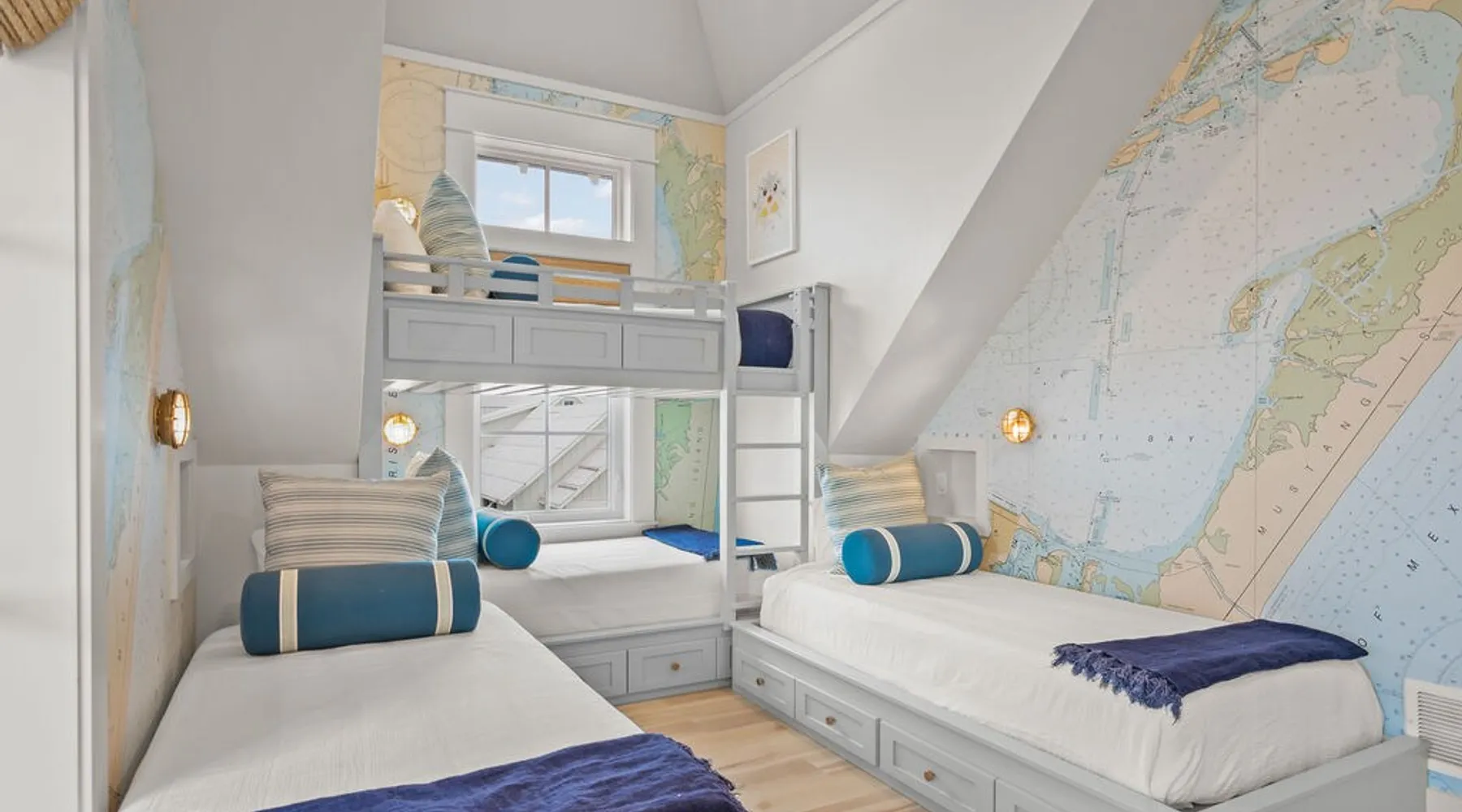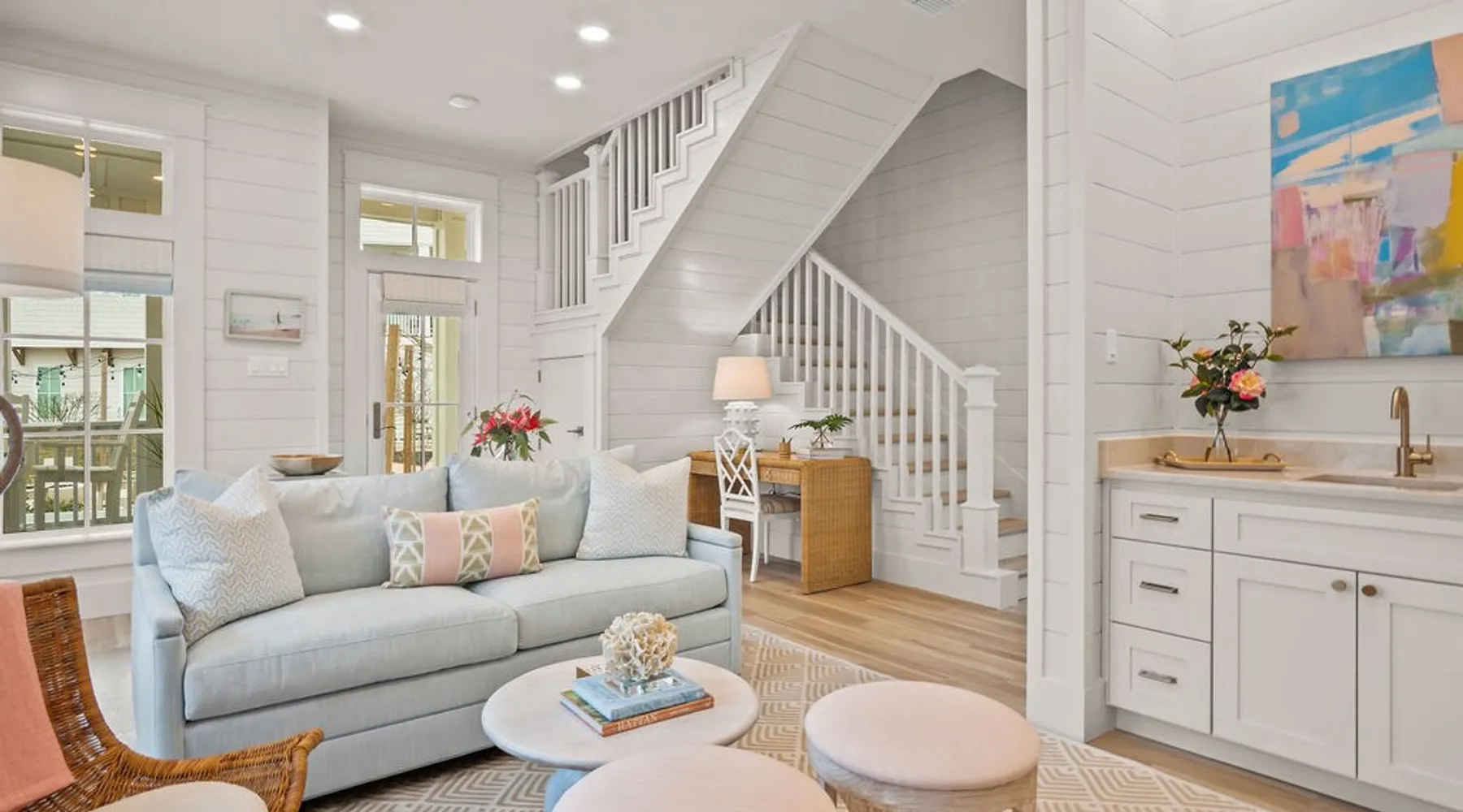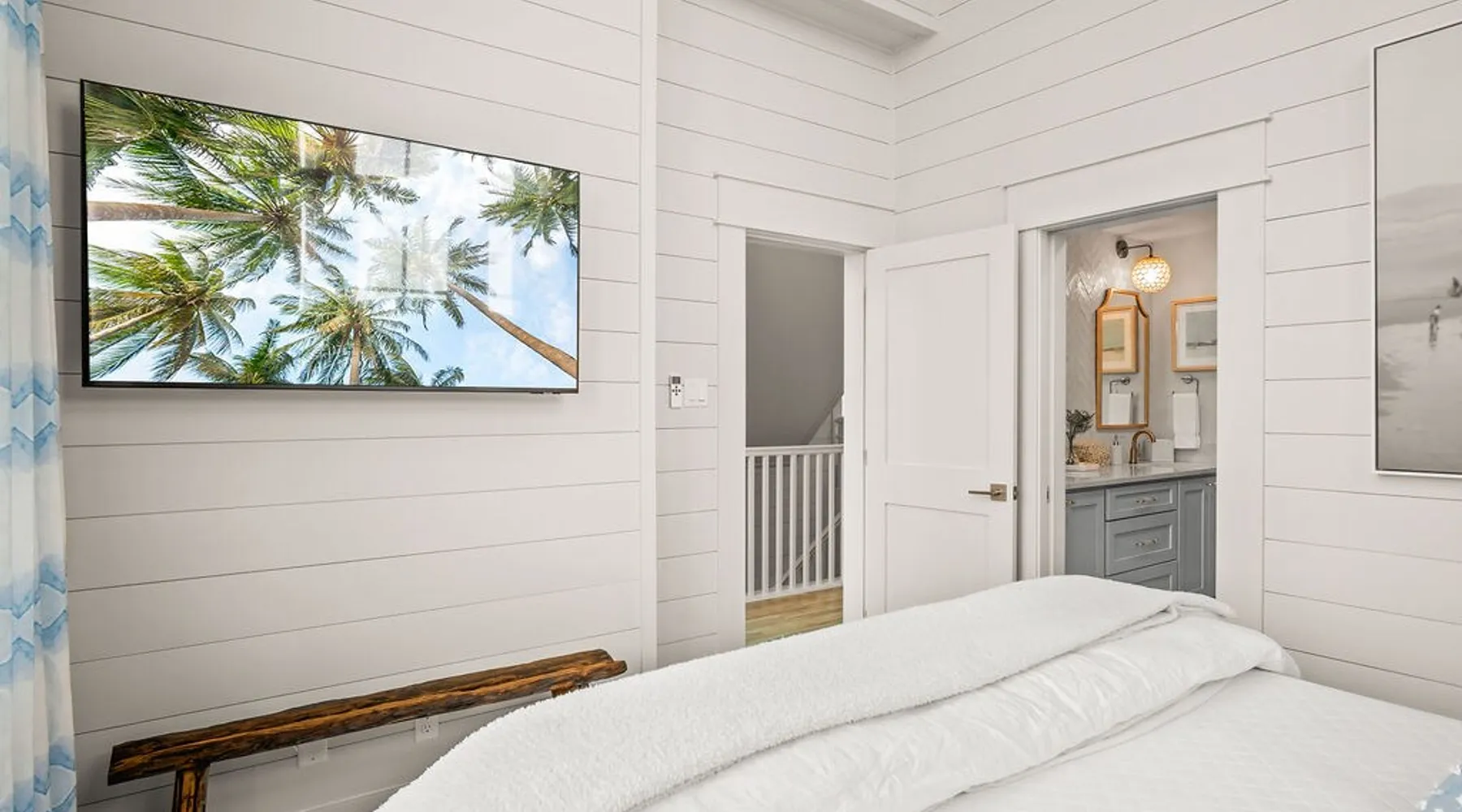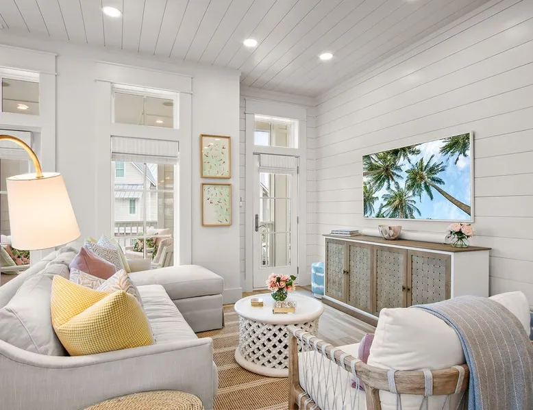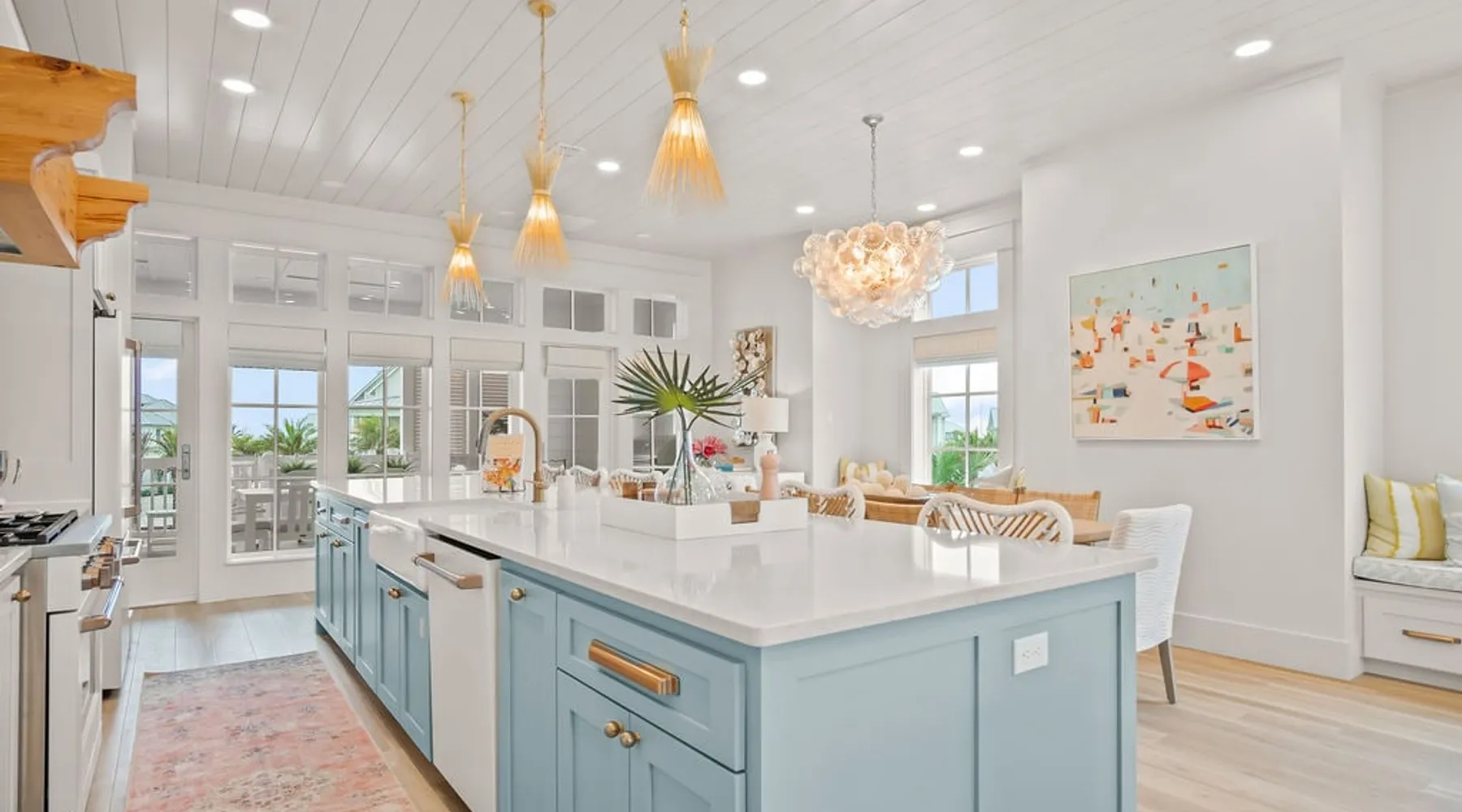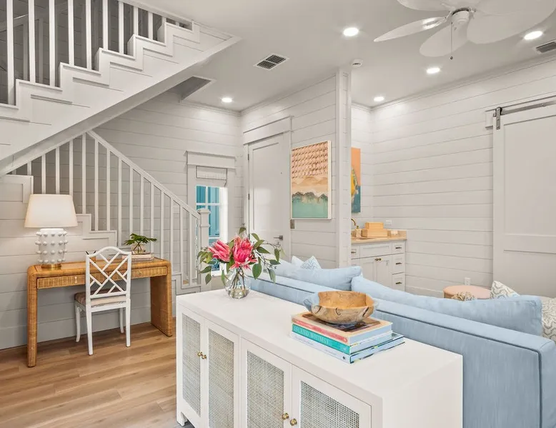 Shuttered island style defines this ethereal, three-story beach home at Cinnamon Shore South. With elevator and designer details, it’s a serene, coastal sanctuary where light floods every corner, creating a sense of warmth and openness. Overlook charming Tailwind Park and get access to 20-plus, lavish amenities, including nearby luxury pools and private beach access just one block away. The space MAIN LIVING SPACE: You’ll relax the minute you step inside this gleaming white home decked with pink shutters. Soft, neutral tones dress décor, with clean white walls and creamy linen furnishings exuding a sense of calm and elegance. Touches of ocean-inspired pinks, blues, and greens add subtle pops of color. The heart of the home is the 2nd-floor open concept living room, with sweeping views through large windows to the adjacent pocket park and coastal landscape. Lounge under 9-foot ceilings on a comfortable sectional, other plush seating, or a pair of window seats, as sunlight floods inside. A gourmet kitchen overlooks the dining area for 10, where you can host seafood suppers or epic game nights. Enjoy generous counterspace on the large island with seating for 6, along with Café Appliances and butler’s pantry w/ wet bar and wine fridge, perfect for entertaining. Prep for everyday meals and special occasions in this elegant space, while the crowd spills onto one of several covered decks. On the grilling balcony, an outdoor dining table and a row of rocking chairs have a great view of the wall-mounted TV. Lounge, dine, and toast to the coast, then light the fire pit on the front balcony for cozy nights under the stars. A downstairs den with wet bar and wicker desk tucked under the stairway accommodates smaller groups. SLEEPING QUARTERS: In a third-floor primary suite, drapes fall from the highest of ceilings to the floor, framing the king-size bed. In the luxe luxe bathroom a rich, marbleized tile surrounds the shower. Another king suite, a queen suite, and bunk for 4 with mariner style accommodate guests. A queen-size pull-out sofa sleeps two more. Every room features details that delight all with ensuite bathrooms. The bunk room’s island-chart wallpaper, private balcony, and bathroom with bench seating shower makes kids feel special too. GREAT FEATURES: Unique amenities abound! The pink vanity and designer wallpaper in a powder room, for instance. Or the artwork in the elevator that you can admire while zipping up or down to all three levels. A port-a-crib and booster seat make it easy for young families to do the beach. And tech features make it even more fun: 8 smart TVs, Sonos sound systems, and exterior speakers. While the larger car garage is not available, you have access to the secured golf cart garage for safely storing beach gear or a golf cart during your stay. At Dancing Queen, sophistication meets the sea. It’s perfect for family vacations, group getaways, or a relaxing beach retreat with all the comforts and amenities you could desire. 2 Kings, 1 Queen, 1 Twin Bunk, 2 Single Twins, 1 Queen Sleeper Sofa ***NO PETS ALLOWED*** IF A PET IS SEEN ENTERING A NON-PET FRIENDLY HOME, GUEST WILL BE CHARGED A PENALTY AND/OR EVICTED. Dancing Queen is a non-pet friendly property, if a pet is seen entering Dancing Queen the homeowner and/or Cinnamon Shore Vacation Rentals has the right to immediately evict the renter with no refunds, regardless of time of day or night. An automatic non-refundable penalty fee of $1000 will be added to the reservation, as well as any additional charges related to cleaning fees and/or damage in the home. Please review all policies at: *Please be advised there is construction beside this property. Construction is limited to normal business hours 8am-6pm Monday-Saturday. Please call the office for more information. **Driving 1.5 miles is necessary from Cinnamon Shore South to access Cinnamon Shore North's amenities. *Smart TV and Live TV capabilities available, no direct cable. STR#603251
