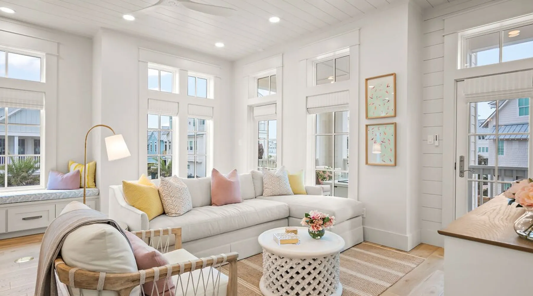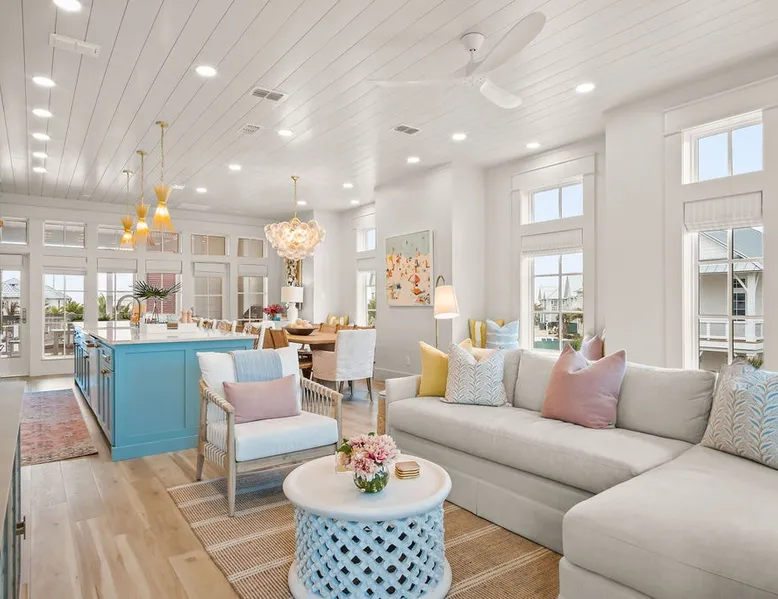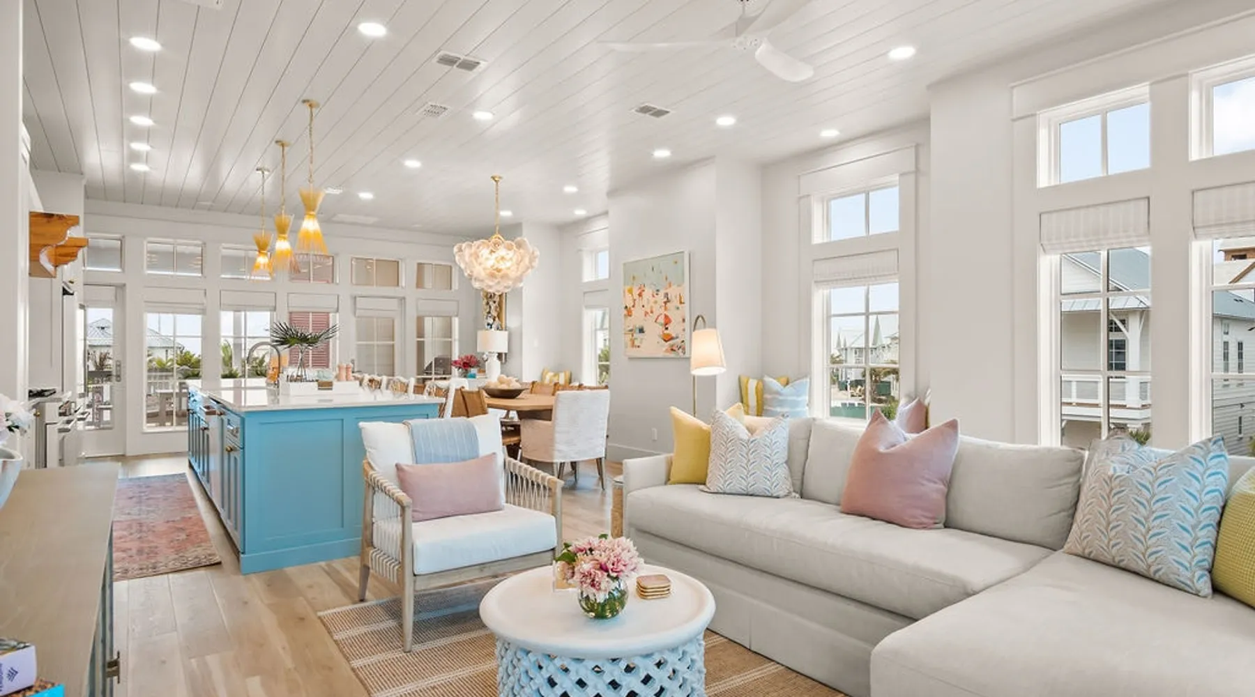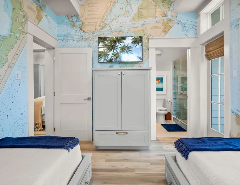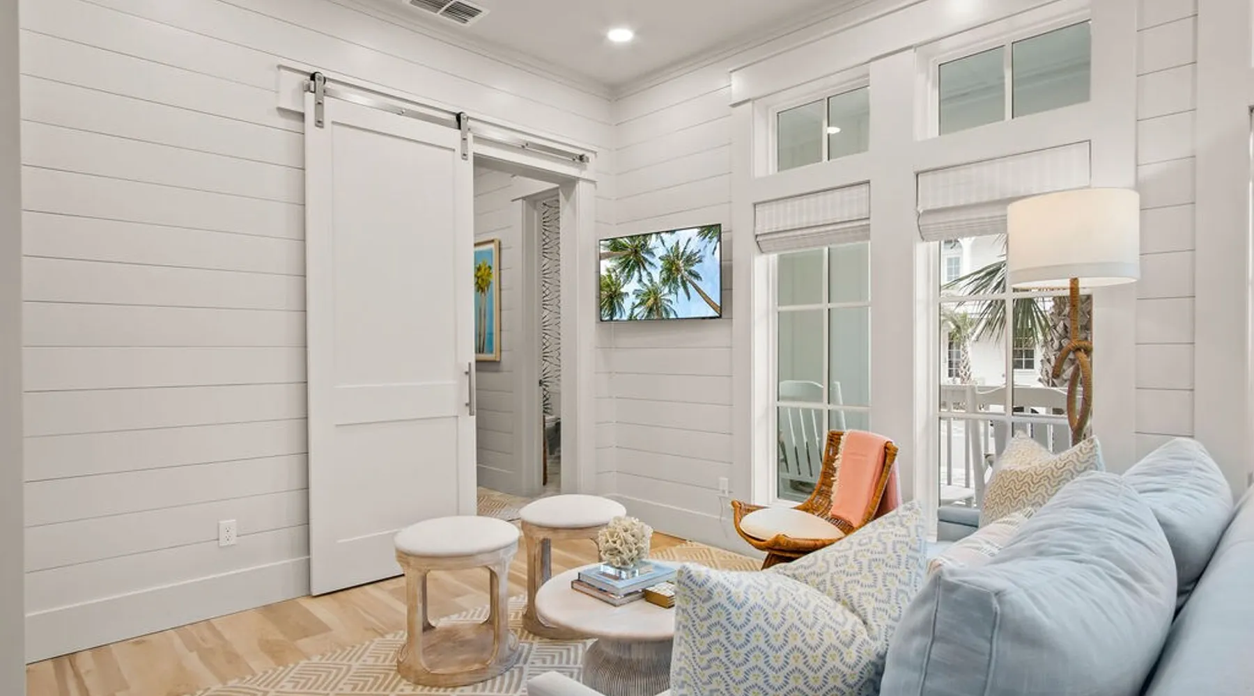 Shuttered island style defines this ethereal, three-story beach home at Cinnamon Shore South. With elevator and designer details, it’s a serene, coastal sanctuary where light floods every corner, creating a sense of warmth and openness. Overlook charming Tailwind Park and get access to 20-plus, lavish amenities, including nearby luxury pools and private beach access just one block away. The space MAIN LIVING SPACE: You’ll relax the minute you step inside this gleaming white home decked with pink shutters. Soft, neutral tones dress décor, with clean white walls and creamy linen furnishings exuding a sense of calm and elegance. Touches of ocean-inspired pinks, blues, and greens add subtle pops of color. The heart of the home is the 2nd-floor open concept living room, with sweeping views through large windows to the adjacent pocket park and coastal landscape. Lounge under 9-foot ceilings on a comfortable sectional, other plush seating, or a pair of window seats, as sunlight floods inside. A gourmet kitchen overlooks the dining area for 10, where you can host seafood suppers or epic game nights. Enjoy generous counterspace on the large island with seating for 6, along with Café Appliances and butler’s pantry w/ wet bar and wine fridge, perfect for entertaining. Prep for everyday meals and special occasions in this elegant space, while the crowd spills onto one of several covered decks. On the grilling balcony, an outdoor dining table and a row of rocking chairs have a great view of the wall-mounted TV. Lounge, dine, and toast to the coast, then light the fire pit on the front balcony for cozy nights under the stars. A downstairs den with wet bar and wicker desk tucked under the stairway accommodates smaller groups. SLEEPING QUARTERS: In a third-floor primary suite, drapes fall from the highest of ceilings to the floor, framing the king-size bed. In the luxe luxe bathroom a rich, marbleized tile surrounds the shower. Another king suite, a queen suite, and bunk for 4 with mariner style accommodate guests. A queen-size pull-out sofa sleeps two more. Every room features details that delight all with ensuite bathrooms. The bunk room’s island-chart wallpaper, private balcony, and bathroom with bench seating shower makes kids feel special too. GREAT FEATURES: Unique amenities abound! The pink vanity and designer wallpaper in a powder room, for instance. Or the artwork in the elevator that you can admire while zipping up or down to all three levels. A port-a-crib and booster seat make it easy for young families to do the beach. And tech features make it even more fun: 8 smart TVs, Sonos sound systems, and exterior speakers. While the larger car garage is not available, you have access to the secured golf cart garage for safely storing beach gear or a golf cart during your stay. At Dancing Queen, sophistication meets the sea. It’s perfect for family vacations, group getaways, or a relaxing beach retreat with all the comforts and amenities you could desire. 2 Kings, 1 Queen, 1 Twin Bunk, 2 Single Twins, 1 Queen Sleeper Sofa ***NO PETS ALLOWED*** IF A PET IS SEEN ENTERING A NON-PET FRIENDLY HOME, GUEST WILL BE CHARGED A PENALTY AND/OR EVICTED. Dancing Queen is a non-pet friendly property, if a pet is seen entering Dancing Queen the homeowner and/or Cinnamon Shore Vacation Rentals has the right to immediately evict the renter with no refunds, regardless of time of day or night. An automatic non-refundable penalty fee of $1000 will be added to the reservation, as well as any additional charges related to cleaning fees and/or damage in the home. Please review all policies at: *Please be advised there is construction beside this property. Construction is limited to normal business hours 8am-6pm Monday-Saturday. Please call the office for more information. **Driving 1.5 miles is necessary from Cinnamon Shore South to access Cinnamon Shore North's amenities. *Smart TV and Live TV capabilities available, no direct cable. STR#603251