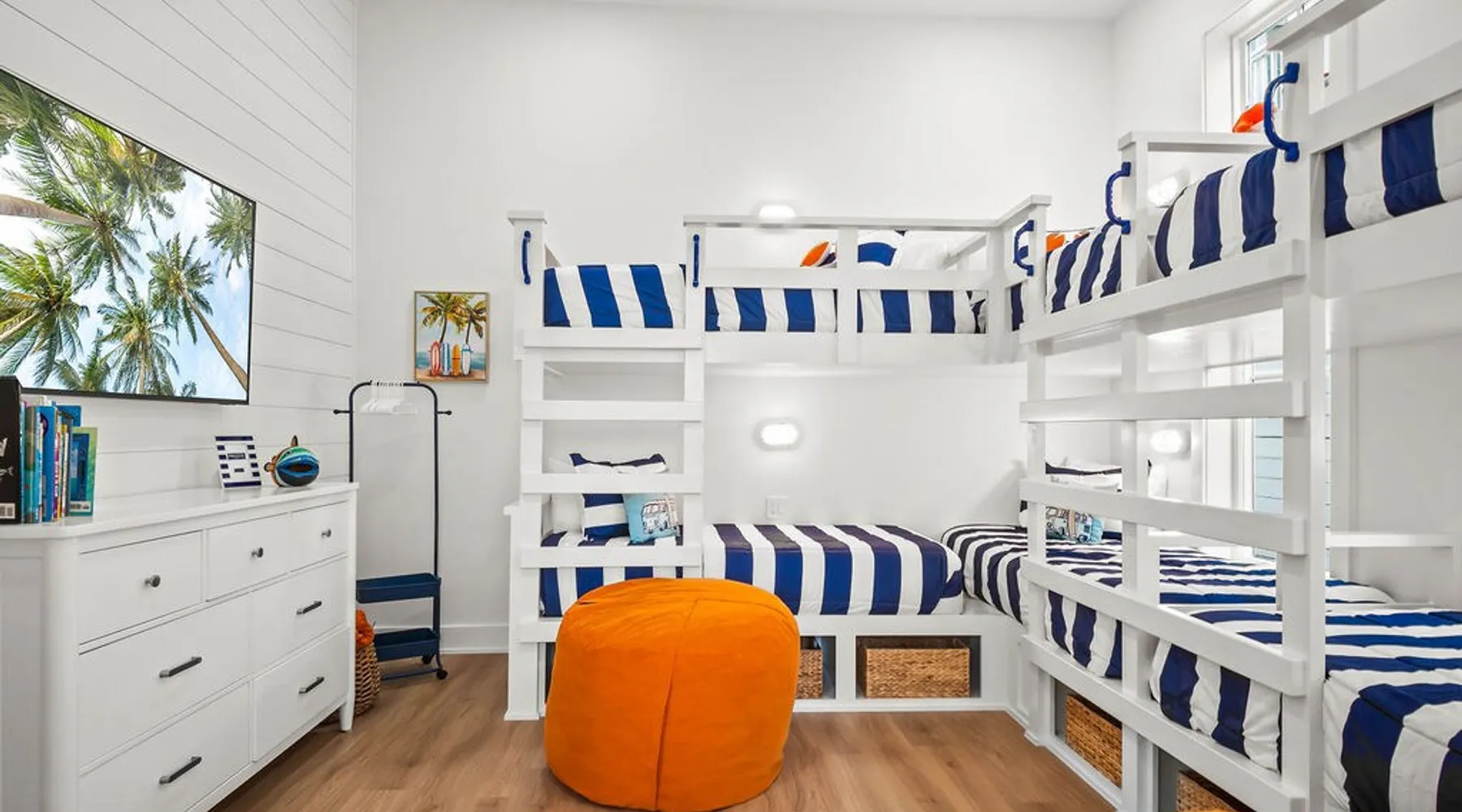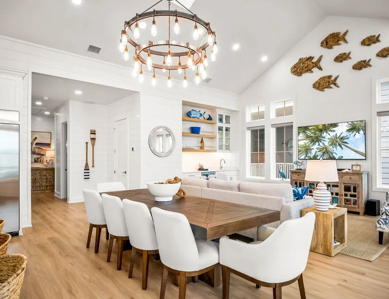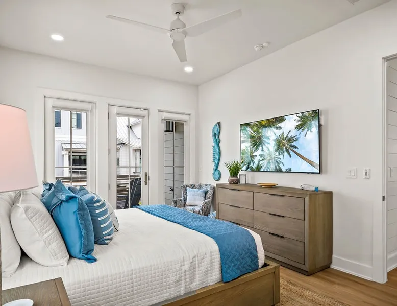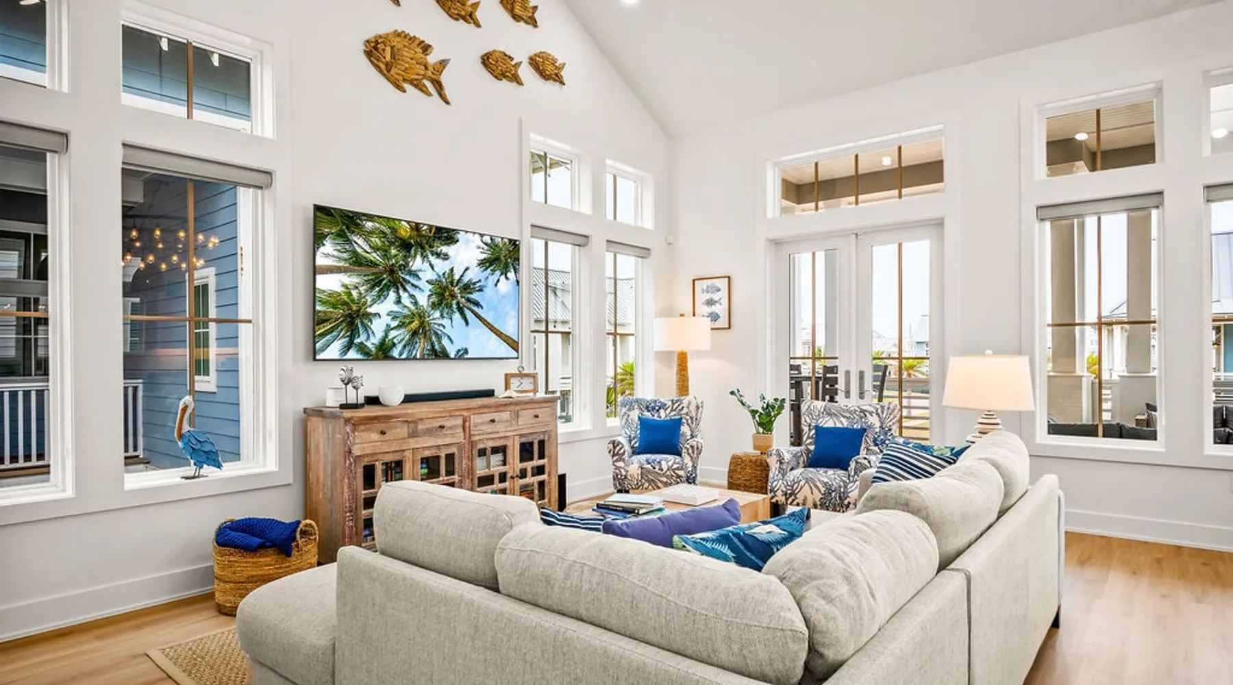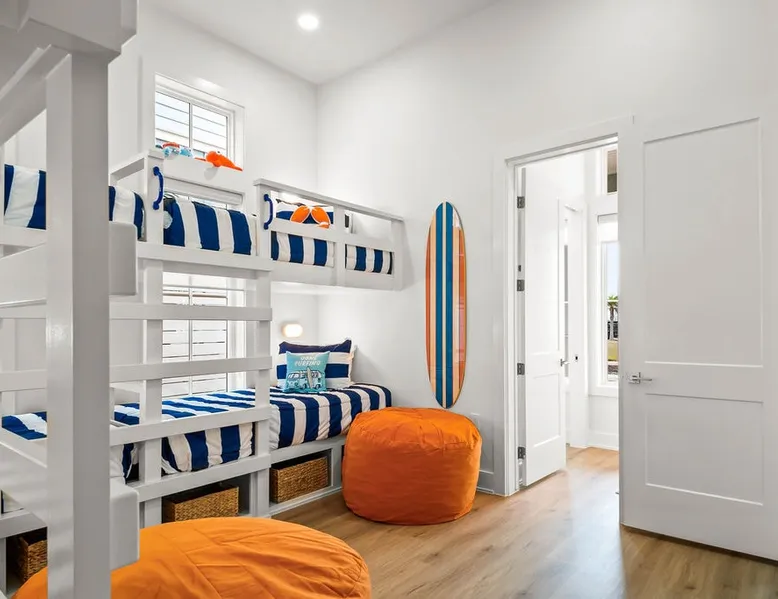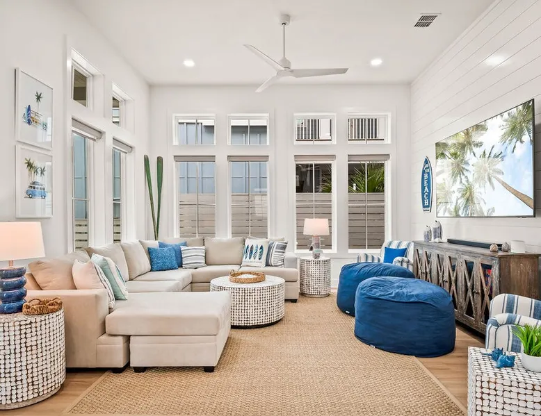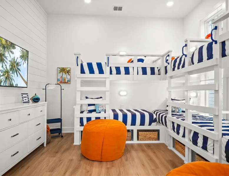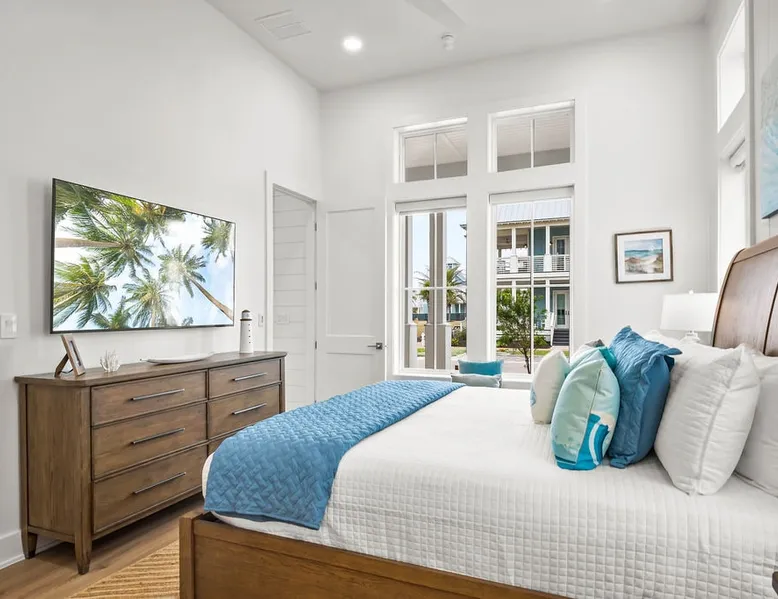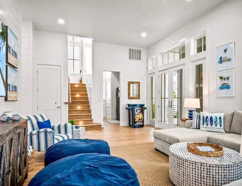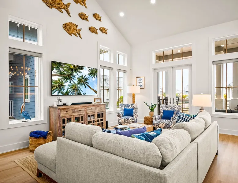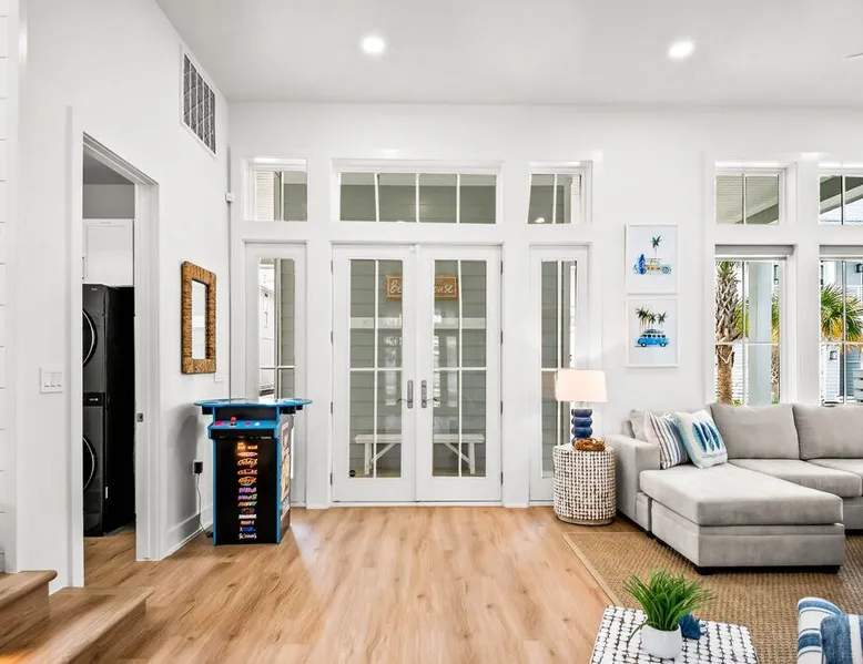 Welcome to Pelican Place, a coastal retreat designed for effortless relaxation and family fun! This spacious, light-filled home is just a short stroll from the beach and perfectly positioned overlooking a scenic park. With designer interiors, multiple king suites, and a game room that keeps the whole family entertained, this four-bedroom, four-and-a-half-bath getaway is where comfort meets coastal charm. The space Vaulted ceilings and a stunning cupola in the great room invite natural light into every corner, while expansive decks provide the perfect place to unwind and take in the view. Thoughtfully designed with families in mind, Pelican Place offers special amenities for guests of all ages—from arcade games and board games to baby gear and a wet bar. AMENITIES: At ‘South,’ enjoy resort-style pools that include the Cabana Pool with infinity edge, hammocks, and views of South Town Lake; the new Splish Splash Family Pool with splash pad; and intimate Neighborly Square Pool. Parks offer green space: Tailwind Park, South Shore Park, and others; a boardwalk around South Town Lake & Leisure Lake; a community pier and fishing pavilions, and a playscape. You also can access amenities at Cinnamon Shore North: pools, lakes, fitness center, on-site restaurants, and Town Center fun. MAIN LIVING SPACE: The open-concept living area is made for gathering. Vaulted ceilings with a cupola draw sunlight throughout the day, creating a warm and welcoming space. Designer couches, accent chairs, and a 75" smart TV with Bluetooth soundbar create a cozy den for evenings in, while the gourmet kitchen will thrill the chef in your group. Outfitted with JennAir appliances, a large range, an oversized island with seating for five, and specialty features like a microwave drawer, beverage fridge, and even a margarita machine, the kitchen is as functional as it is stylish. The dining area seats ten and flows seamlessly into the living space. Step out onto the deck directly from the living room to enjoy fresh air and views of the park. SLEEPING QUARTERS: Four beautifully appointed bedrooms offer private ensuites, luxury linens, and high-end hybrid mattresses. Three of the bedrooms feature king beds, including a master with a natural wood four-poster bed and a walk-in closet. A large bunk room includes six twin beds—ideal for kids or teens. The game room provides an additional sleeping option with a queen sleeper sofa. Two of the bedrooms offer direct access to shared or private balconies, creating personal retreats within the home. GREAT FEATURES: The fun continues in the game room, complete with an 85" smart TV, arcade machine, board games, puzzles, and toys. The home includes baby-friendly amenities such as three high chairs, three pack ‘n plays, and beach towels, along with entertainment extras like a Pac Man arcade game, Bluetooth soundbars, turkey cooker, and Weber grill. Smart TVs are located in every bedroom, while the main living room and game room are equipped with enhanced sound systems for an immersive experience. With its elegant yet casual design, family-focused features, and unbeatable location, Pelican Place is a dream destination. Book your coastal escape today and make lasting memories just steps from the sand. ***NO PETS ALLOWED*** IF A PET IS SEEN ENTERING A NON-PET FRIENDLY HOME, GUEST WILL BE CHARGED A PENALTY AND/OR EVICTED. Pelican Place is a non-pet friendly property, if a pet is seen entering Pelican Place the homeowner and/or Cinnamon Shore Vacation Rentals has the right to immediately evict the renter with no refunds, regardless of time of day or night. An automatic non-refundable penalty fee of $1000 will be added to the reservation, as well as any additional charges related to cleaning fees and/or damage in the home. Please review all policies at: **Driving 1.5 miles is necessary from Cinnamon Shore South to access Cinnamon Shore North's amenities. *Smart TV and Live TV capabilities available, no direct cable. STRR#597728