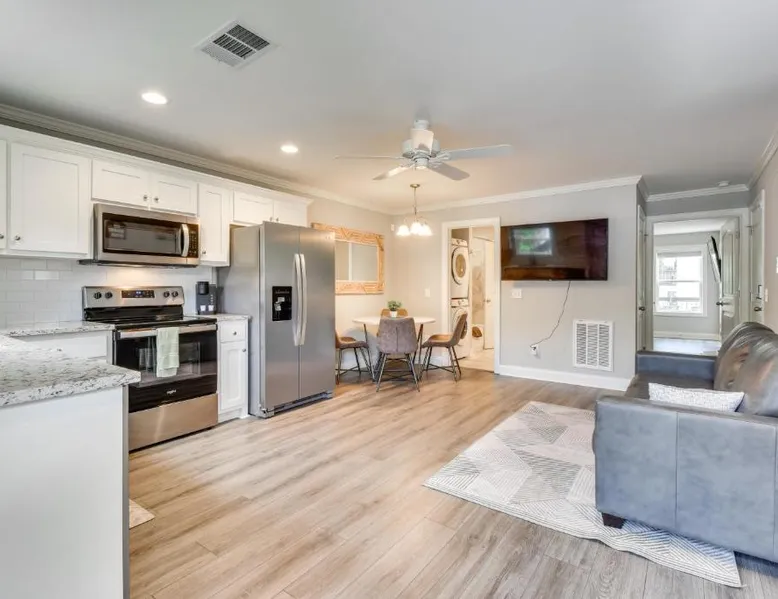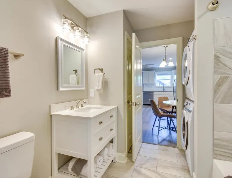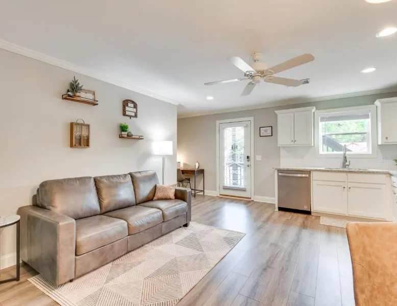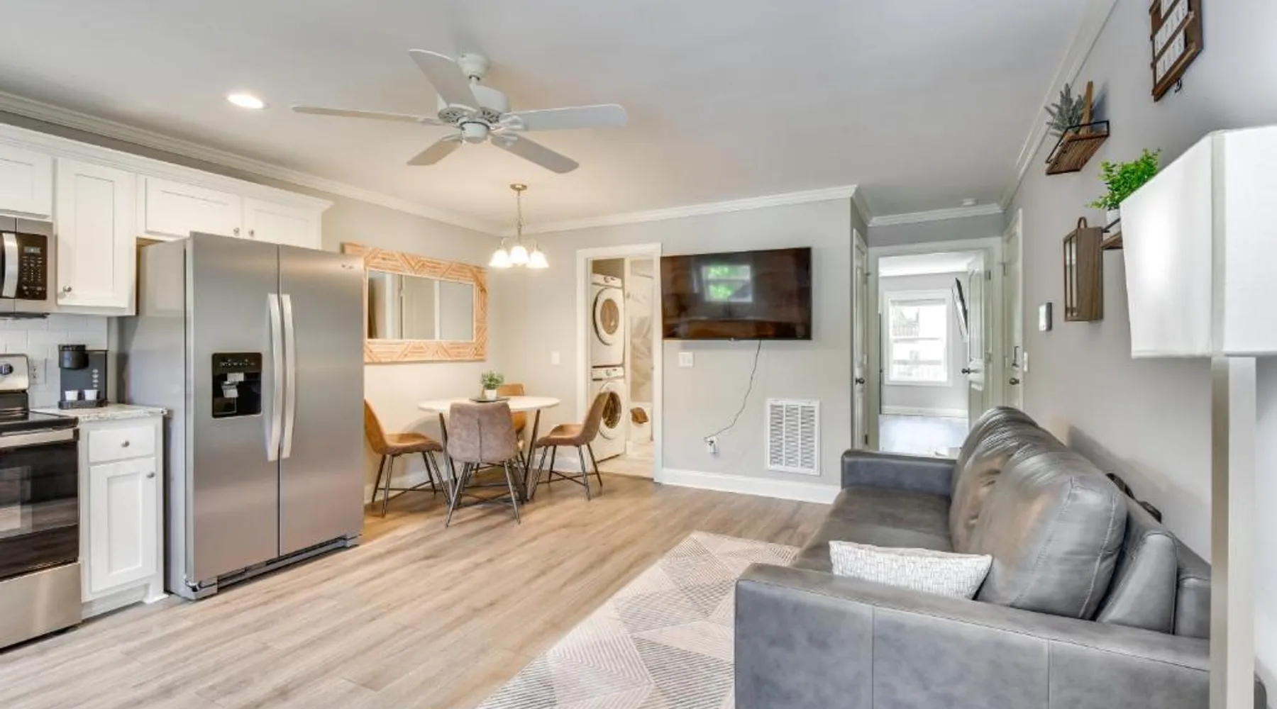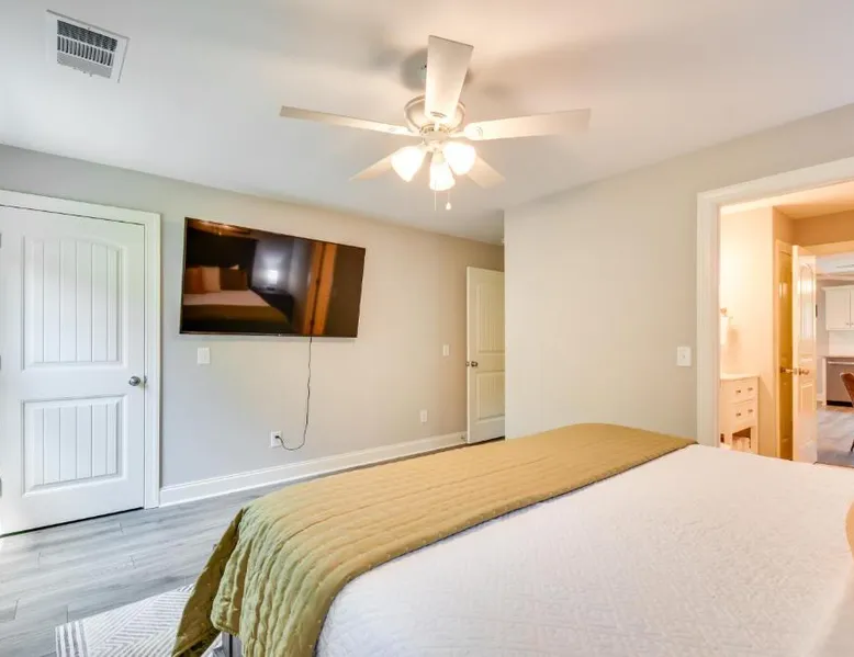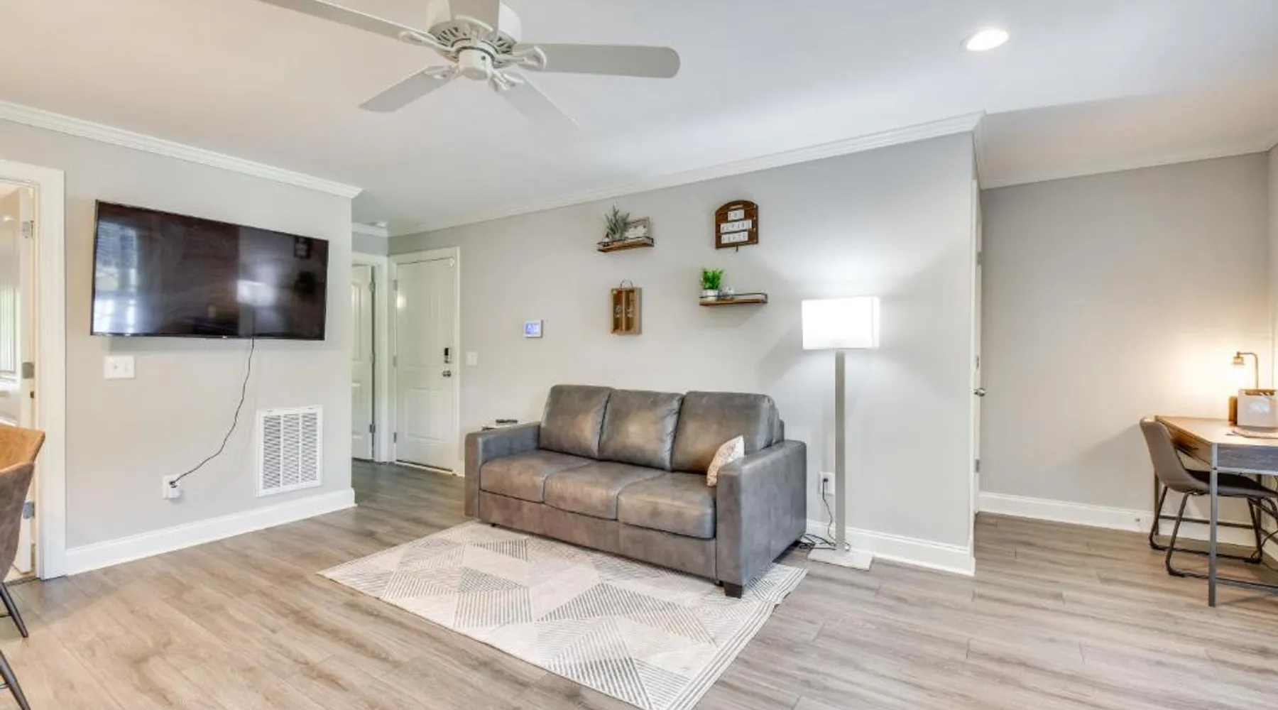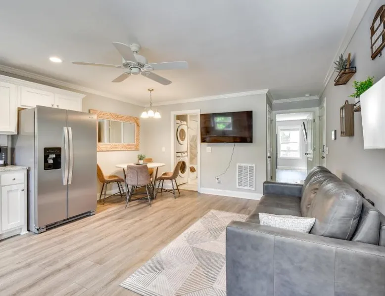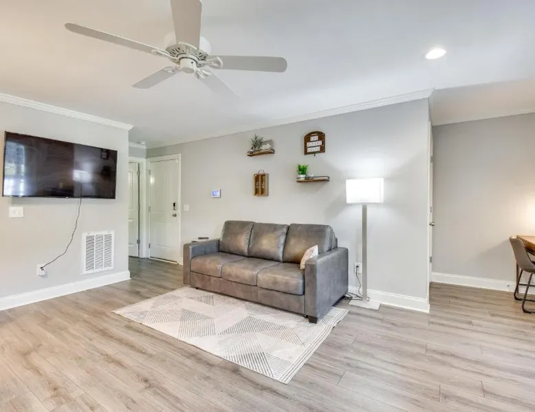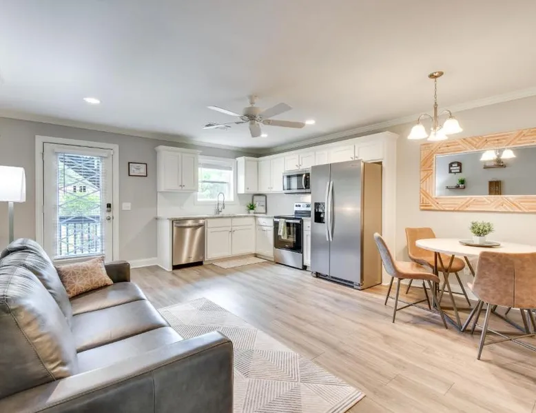 Spacious Accommodations: Walk to Main St and River Downtown Helen Condo in Helen offers a spacious apartment with one bedroom and a living room. The property includes a balcony, air-conditioning, and a fully equipped kitchen with modern appliances. Modern Amenities: Guests enjoy free WiFi, a washing machine, and a work desk. The apartment features a dining table, refrigerator, microwave, dishwasher, oven, and stovetop. Additional amenities include a hairdryer, coffee machine, TV, and free toiletries. Prime Location: Located 94 mi from Hartsfield–Jackson Atlanta International Airport, the property is a 3-minute walk from Helen Festhalle. Nearby attractions include Anna Ruby Falls (8.1 mi), Smithgall Woods (4.3 mi), Andrews Cove (6.2 mi), and Raven Cliffs Falls (6.8 mi). Boasting a private entrance, this air-conditioned apartment comes with 1 living room, 1 separate bedroom and 1 bathroom with a bath and a shower. Meals can be prepared in the well-fitted kitchen, which features a stovetop, a refrigerator, a dishwasher and kitchenware. The spacious apartment features a washing machine, a coffee machine, tumble dryer, heating and a TV. The unit has 2 beds.