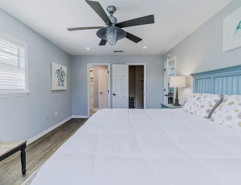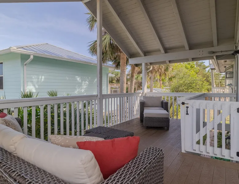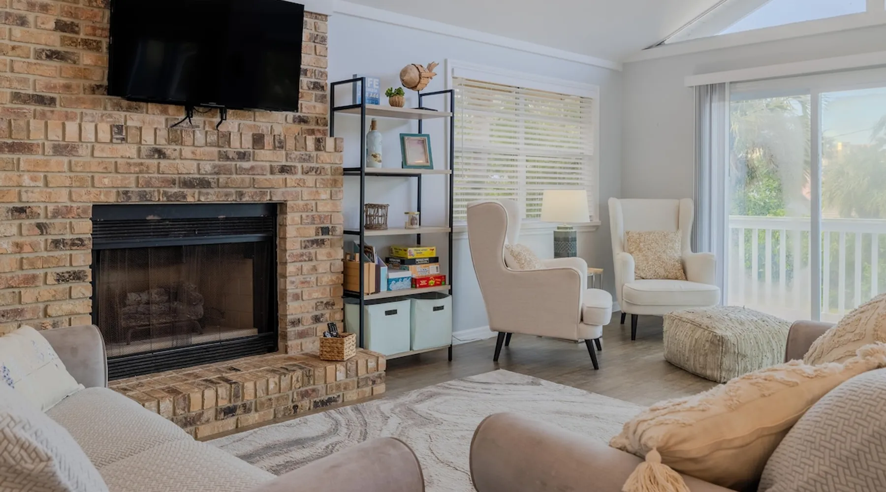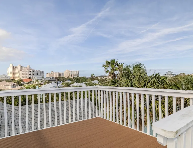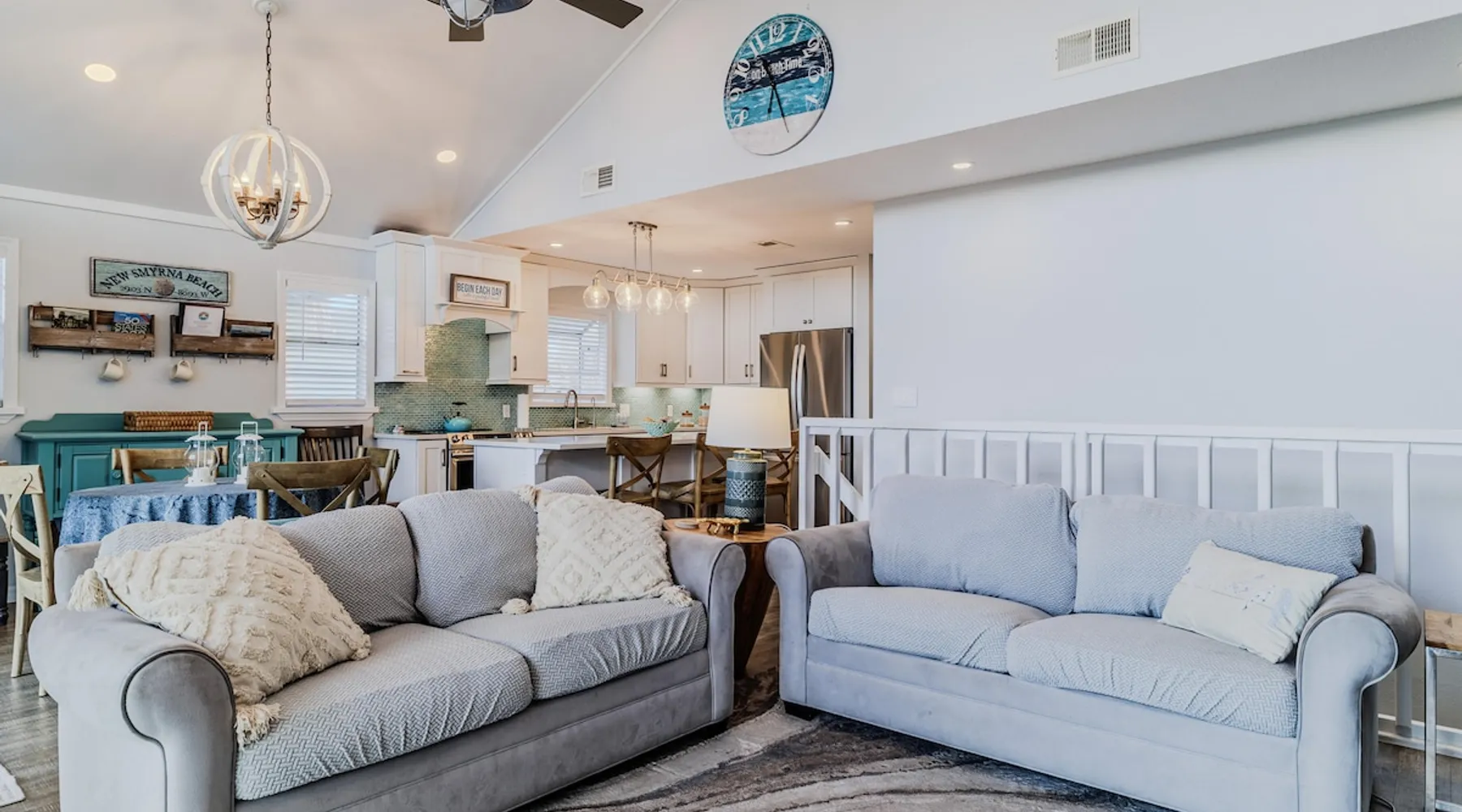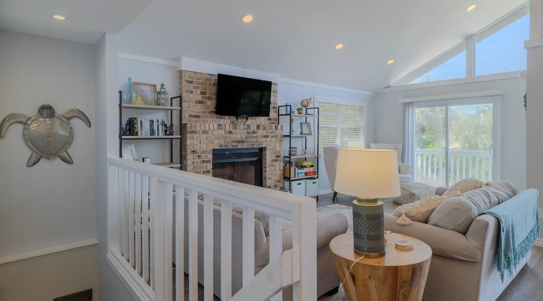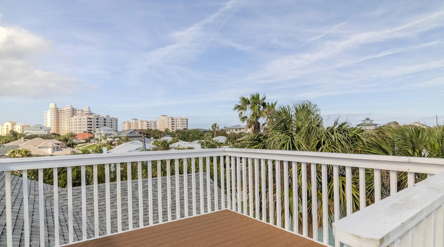 Coastal Oasis | 4 bed 3 bath home Steps to the Ocean The space Welcome to your coastal oasis in North Beach, New Smyrna—a stylish two-story retreat just steps from the ocean. This beautifully appointed home features four spacious bedrooms, three modern baths, and a charming wraparound balcony with a crows nest for breathtaking views. Inside, you’ll be greeted by elegant flooring and an open, airy layout that captures a coastal chic vibe. The large, light-filled kitchen boasts a sizable breakfast bar that seats four, perfect for casual dining or entertaining friends. Adjacent to the kitchen, a separate dining area comfortably accommodates extra guests for memorable dinners. Relax in the inviting living room, complete with a cozy brick fireplace, a large-screen TV, and a quaint nook area ideal for savoring your morning coffee. This beautifully designed vacation home offers four comfortable bedrooms, providing plenty of space for everyone to unwind. The master suite serves as a private retreat with a king-size bed, a dedicated work desk, and its own private balcony access—perfect for enjoying peaceful coastal views from the crows nest. The en-suite bath adds a touch of luxury to your stay offering its own spa-inspired bathroom, complete with a walk-in shower, a soaking tub, and dual vanity sinks. While the second bedroom boasts a convenient trundle that transforms into two twins. The third bedroom offers a cozy king bed, and the fourth includes a versatile trundle that expands to a queen. Whether you’re relaxing after a day of adventure or gathering for a memorable getaway, this home has the perfect blend of comfort and convenience for your stay! This home also features an oversized garage, a spacious fenced backyard for outdoor enjoyment, and a separate laundry room for your convenience. For added fun and easy exploration of the area, a golf cart is available for rent during your stay. Please note that the golf cart rental requires an additional fee, along with a signed rental agreement and waivers. Pets welcome with appropriate pet fee! Experience the best of coastal living and live like a local in this North Beach gem. Book your stay today and start making unforgettable memories by the sea!