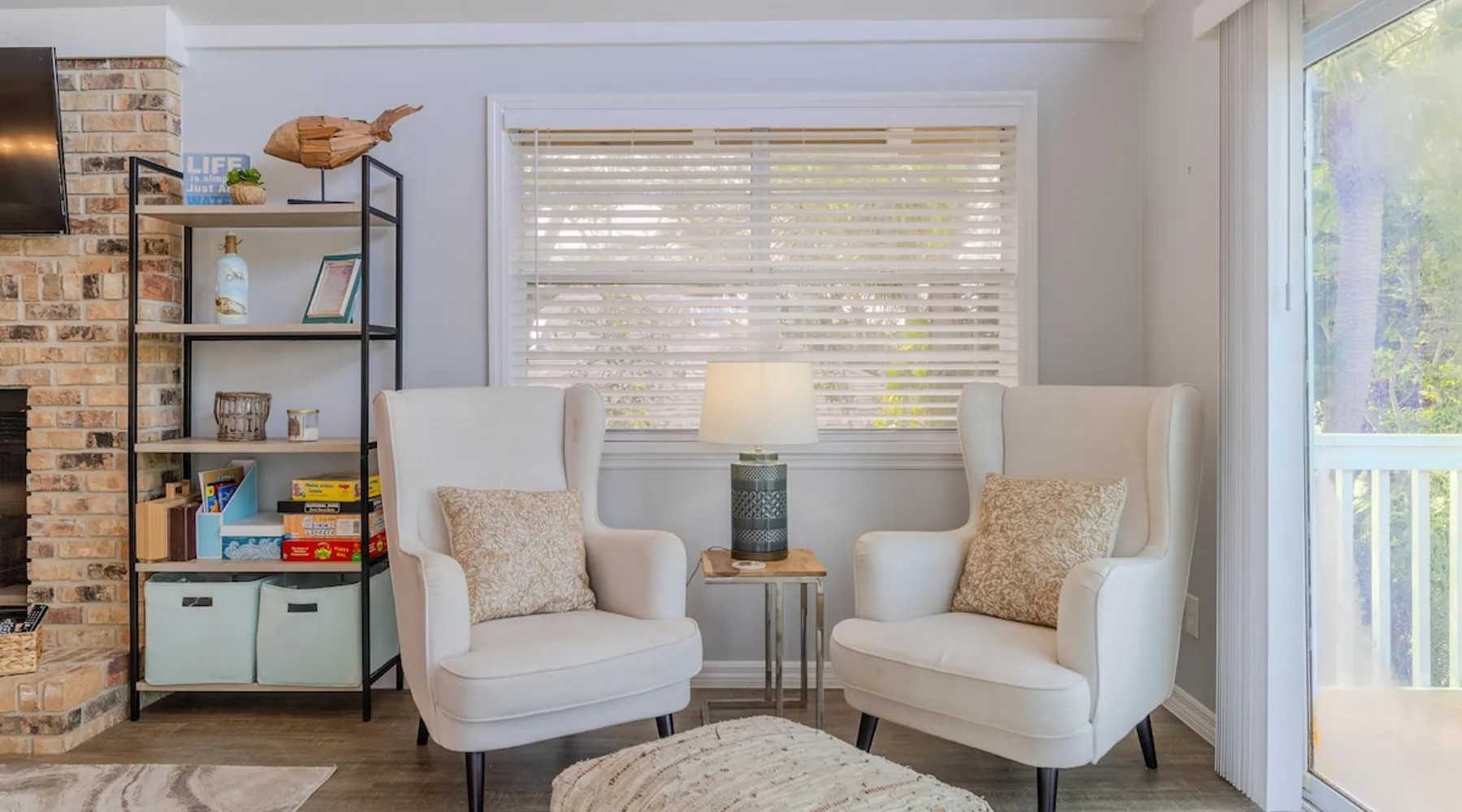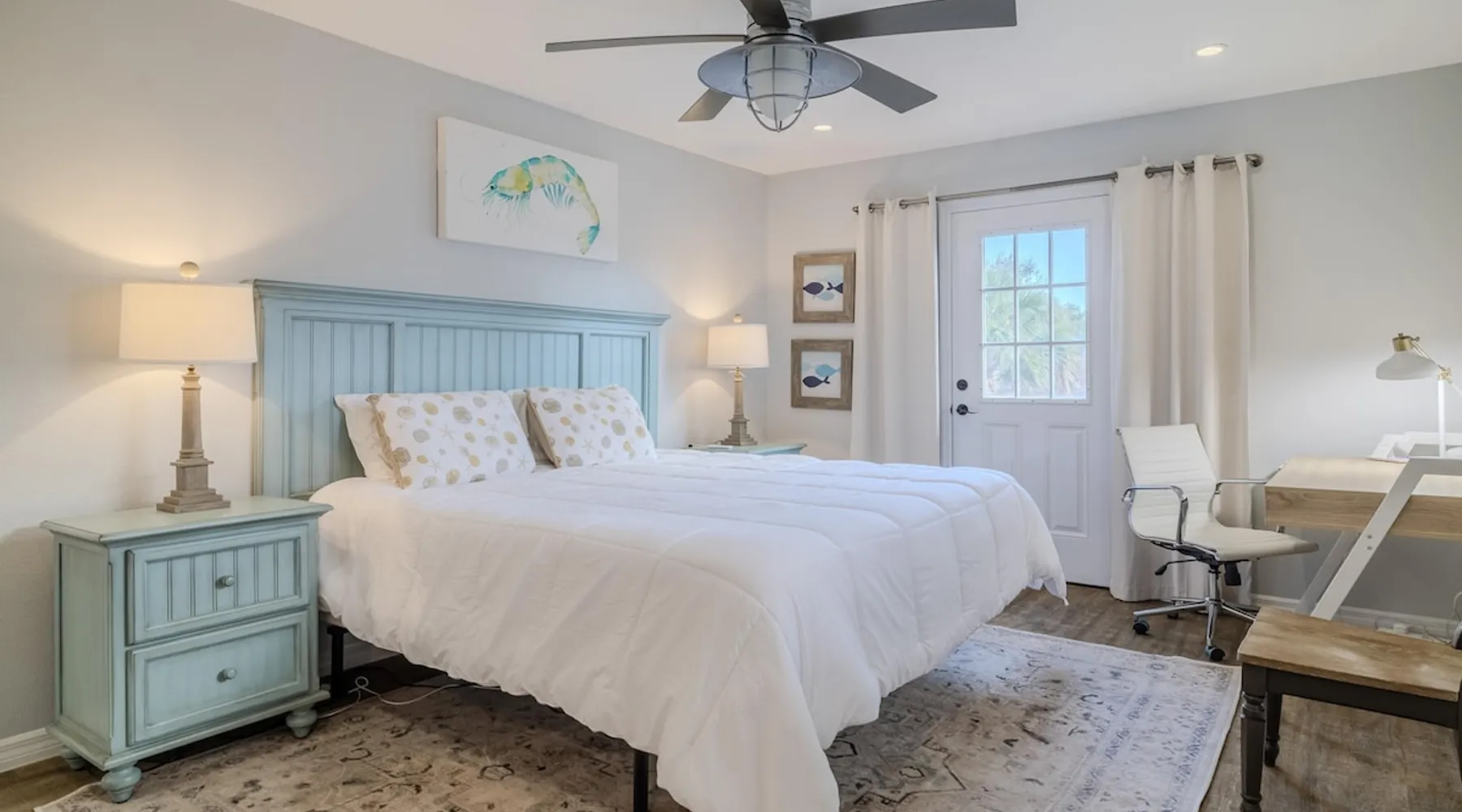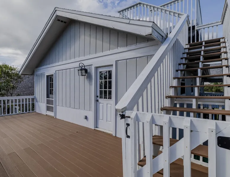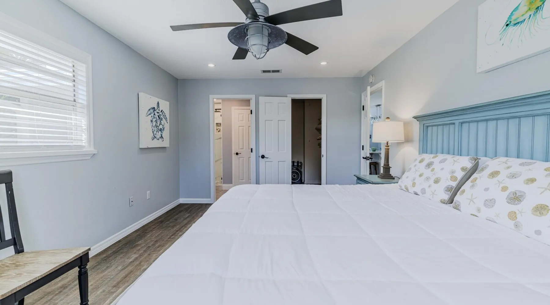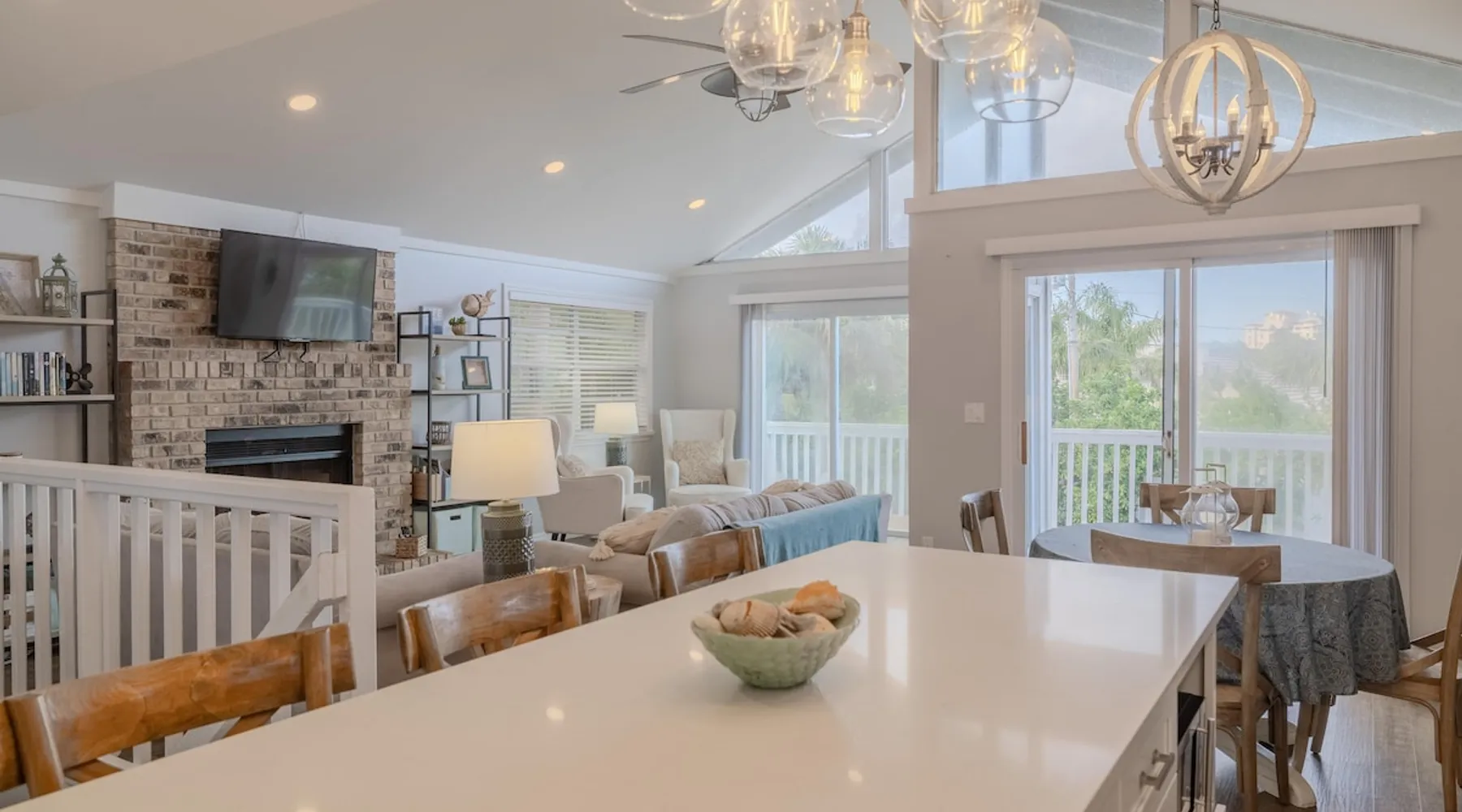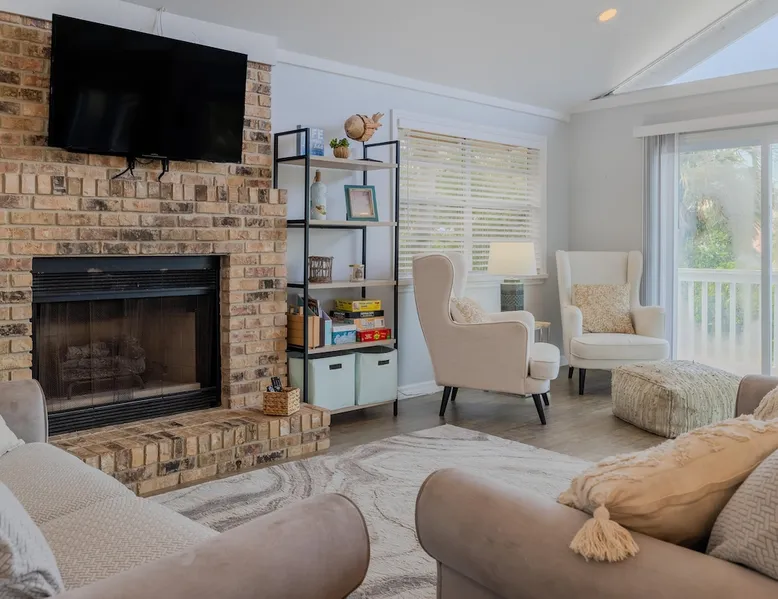 Coastal Oasis | 4 bed 3 bath home Steps to the Ocean The space Welcome to your coastal oasis in North Beach, New Smyrna—a stylish two-story retreat just steps from the ocean. This beautifully appointed home features four spacious bedrooms, three modern baths, and a charming wraparound balcony with a crows nest for breathtaking views. Inside, you’ll be greeted by elegant flooring and an open, airy layout that captures a coastal chic vibe. The large, light-filled kitchen boasts a sizable breakfast bar that seats four, perfect for casual dining or entertaining friends. Adjacent to the kitchen, a separate dining area comfortably accommodates extra guests for memorable dinners. Relax in the inviting living room, complete with a cozy brick fireplace, a large-screen TV, and a quaint nook area ideal for savoring your morning coffee. This beautifully designed vacation home offers four comfortable bedrooms, providing plenty of space for everyone to unwind. The master suite serves as a private retreat with a king-size bed, a dedicated work desk, and its own private balcony access—perfect for enjoying peaceful coastal views from the crows nest. The en-suite bath adds a touch of luxury to your stay offering its own spa-inspired bathroom, complete with a walk-in shower, a soaking tub, and dual vanity sinks. While the second bedroom boasts a convenient trundle that transforms into two twins. The third bedroom offers a cozy king bed, and the fourth includes a versatile trundle that expands to a queen. Whether you’re relaxing after a day of adventure or gathering for a memorable getaway, this home has the perfect blend of comfort and convenience for your stay! This home also features an oversized garage, a spacious fenced backyard for outdoor enjoyment, and a separate laundry room for your convenience. For added fun and easy exploration of the area, a golf cart is available for rent during your stay. Please note that the golf cart rental requires an additional fee, along with a signed rental agreement and waivers. Pets welcome with appropriate pet fee! Experience the best of coastal living and live like a local in this North Beach gem. Book your stay today and start making unforgettable memories by the sea!