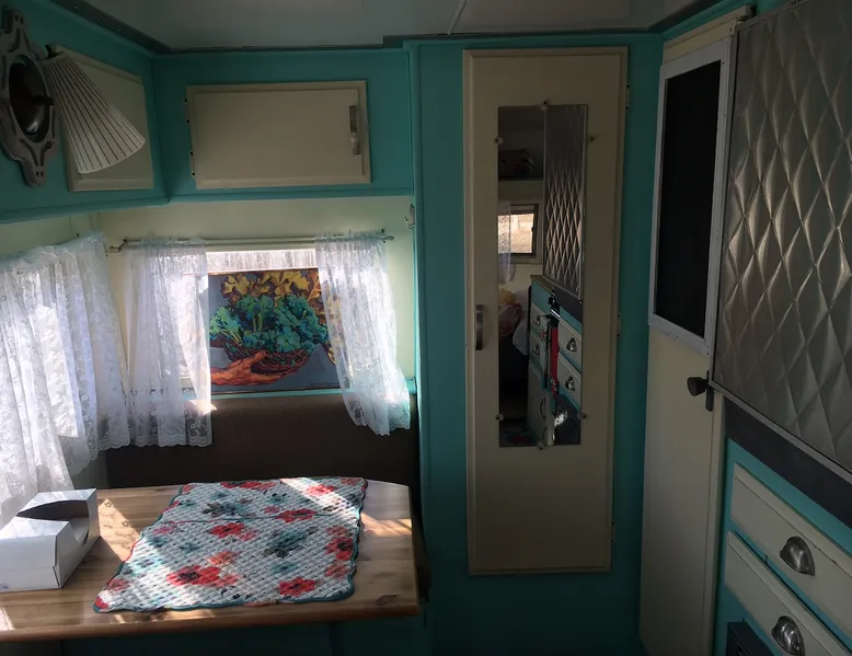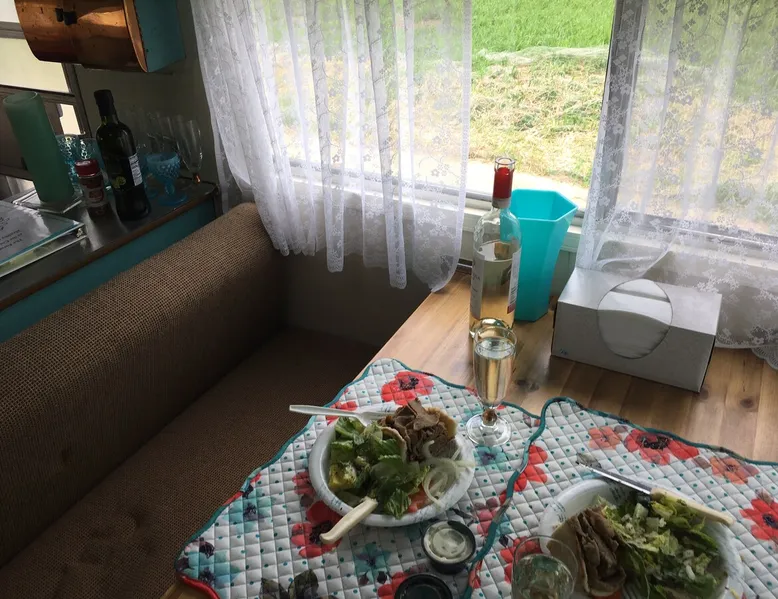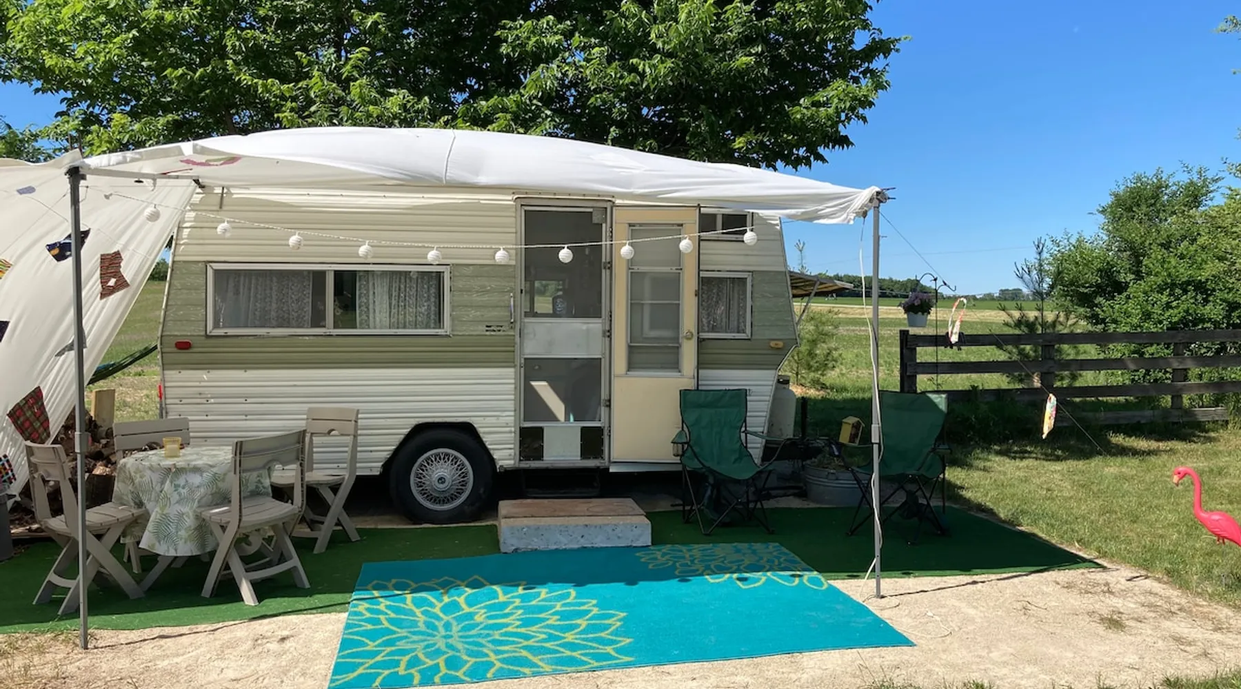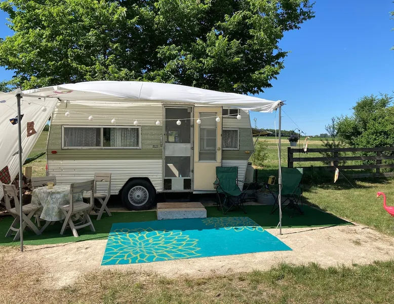 This 1972 Komforter Camper sits on the north side of our farm and is located in the middle of our 10 acres . The camper has its own entrance off Prairie Rd on a small lane called Happy Lane. It's a private oasis with bon fire area ( wood provided) and vintage games for a relaxing getaway. The space The camper does not have electricity but we have puck lights and vintage lanterns . We set up a microwave and coffee maker in the nearby barn . You can run an extension cord out to charge phones and power an electric cooler . You'll have a wonderful view of both the sunrise and sunset over the hay field and soybean field. The garden shed near the camper is available space for gatherings for wet weekends. Guest access Happy Camper has a small bathroom with stool, mirror and sink. Guests can use the farmhouse bathroom for showering. We plan to offer two bikes in the near future for guests.